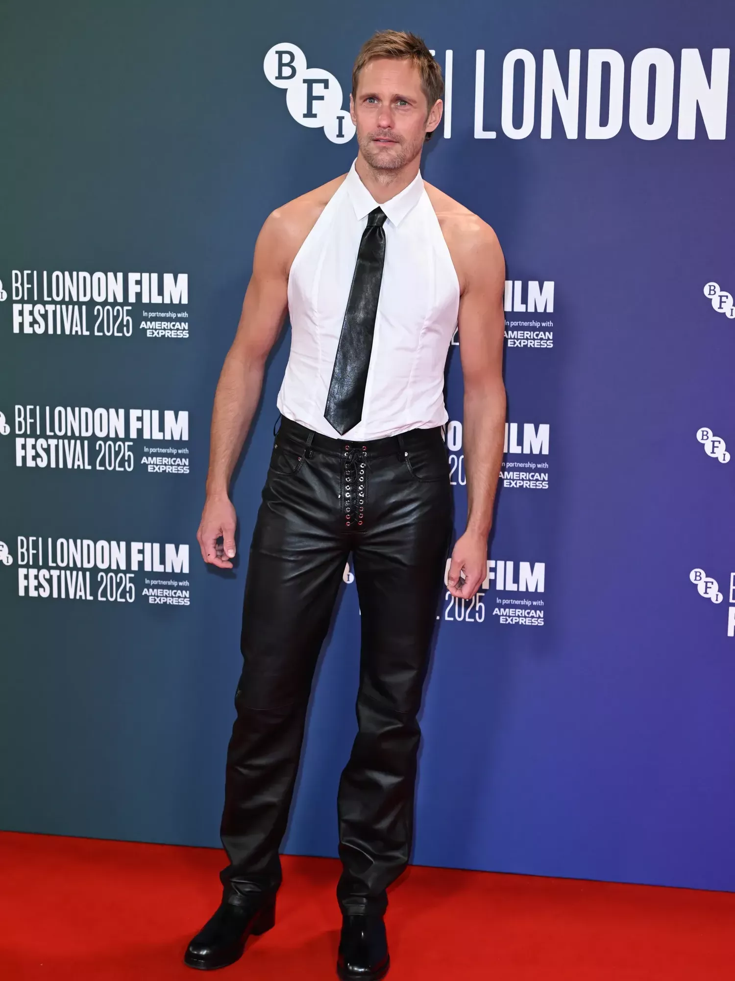While promoting his BDSM biker movie Pillion, the Swedish actor and his stylist, Harry Lambert, had a lot of fun with his more provocative and playful sartorial sensibilities. At the BFI London Film Festival, he took the leather daddy look up a notch, wearing a full look from Ludovic de Saint Sernin’s fall 2025 collection; a white, backless halterneck shirt with a skinny leather tie, with tight, lace-up leather pants, and chunky, round-toe Jimmy Choo boots. At Cannes Film Festival, he brought his kinky boots and a naughty, boot-licking, graphic vintage t-shirt. On British daytime television show Lorraine, he wore cheeky short-shorts and socks from S.S. Daly, doing a little twirl and a curtsey. It looks like this vibe is only set to continue, and thank god—some fun and freakdom amid the Old Hollywood style and same-y full looks is much-needed.