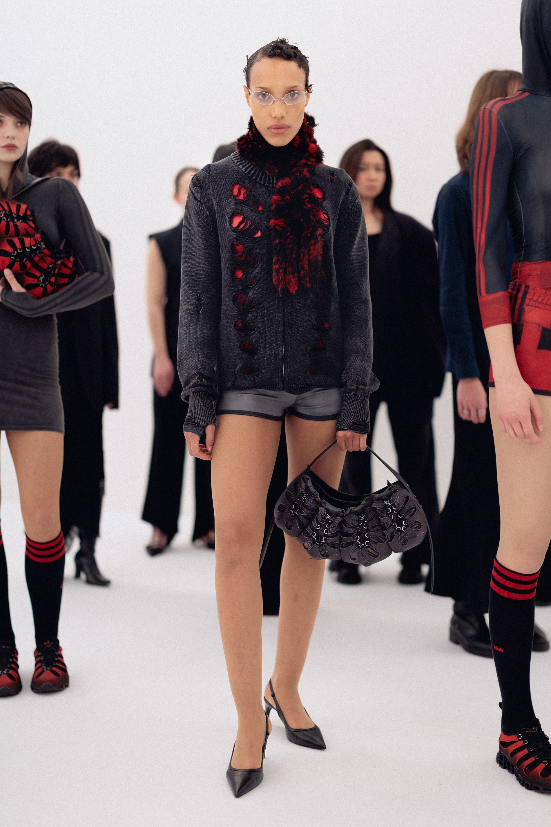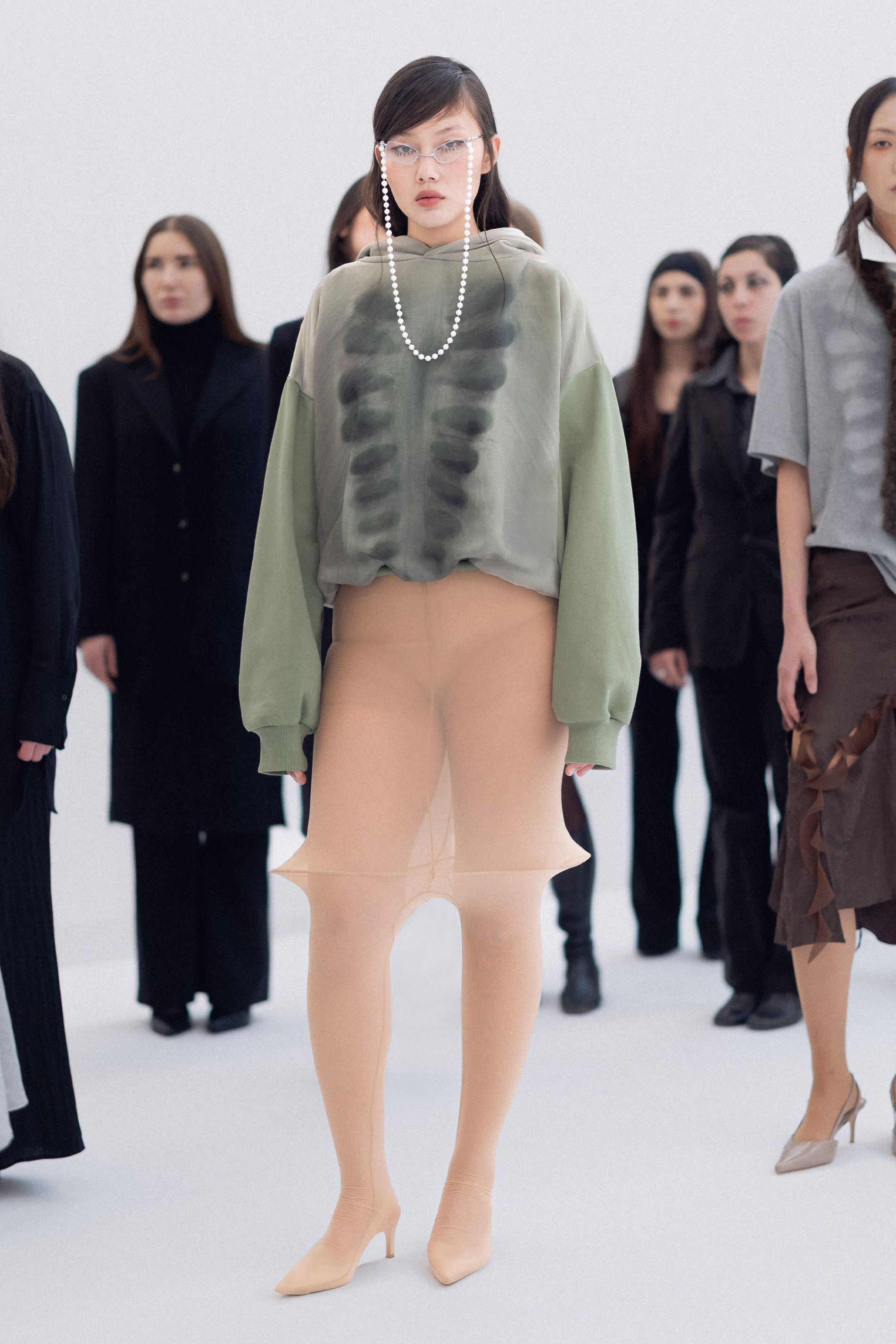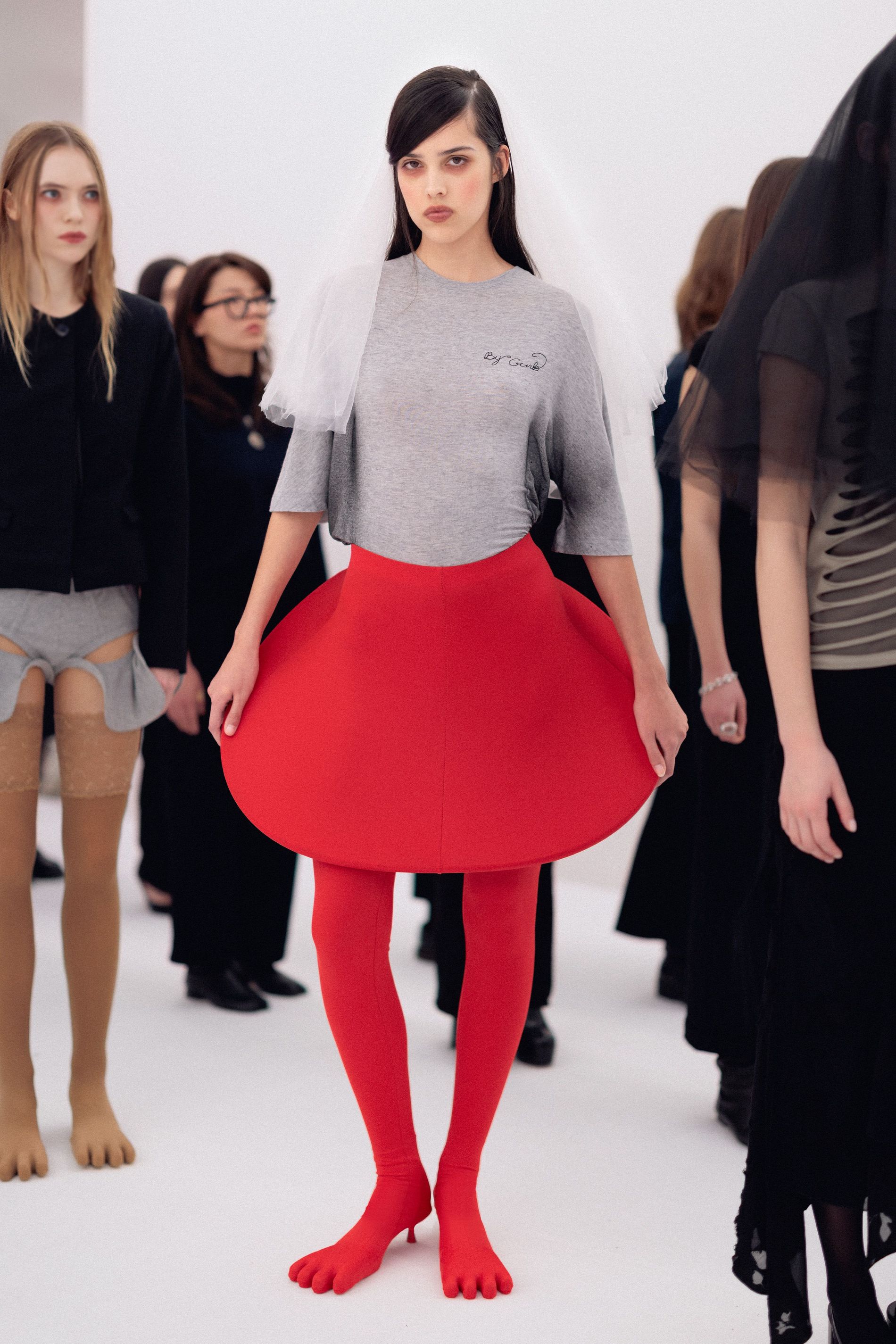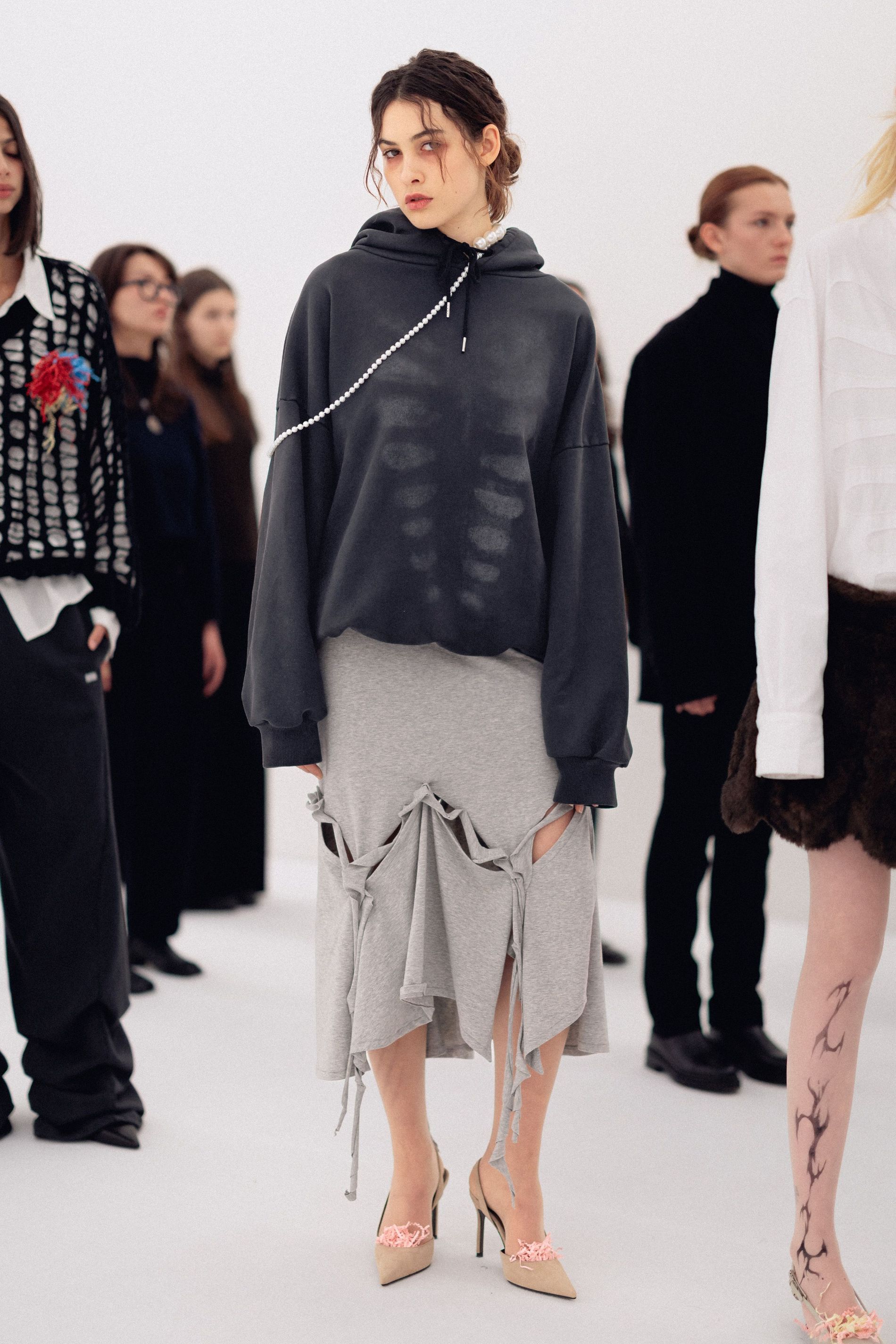 There were plenty of AVAVAV signatures on offer, too. Ribcage slices adorn t-shirt dresses, sweatpants pool around stilettos in oversized ruffles and, yes, the finger shoes extend into stockings. Unmissable looks that beg to be gazed at.