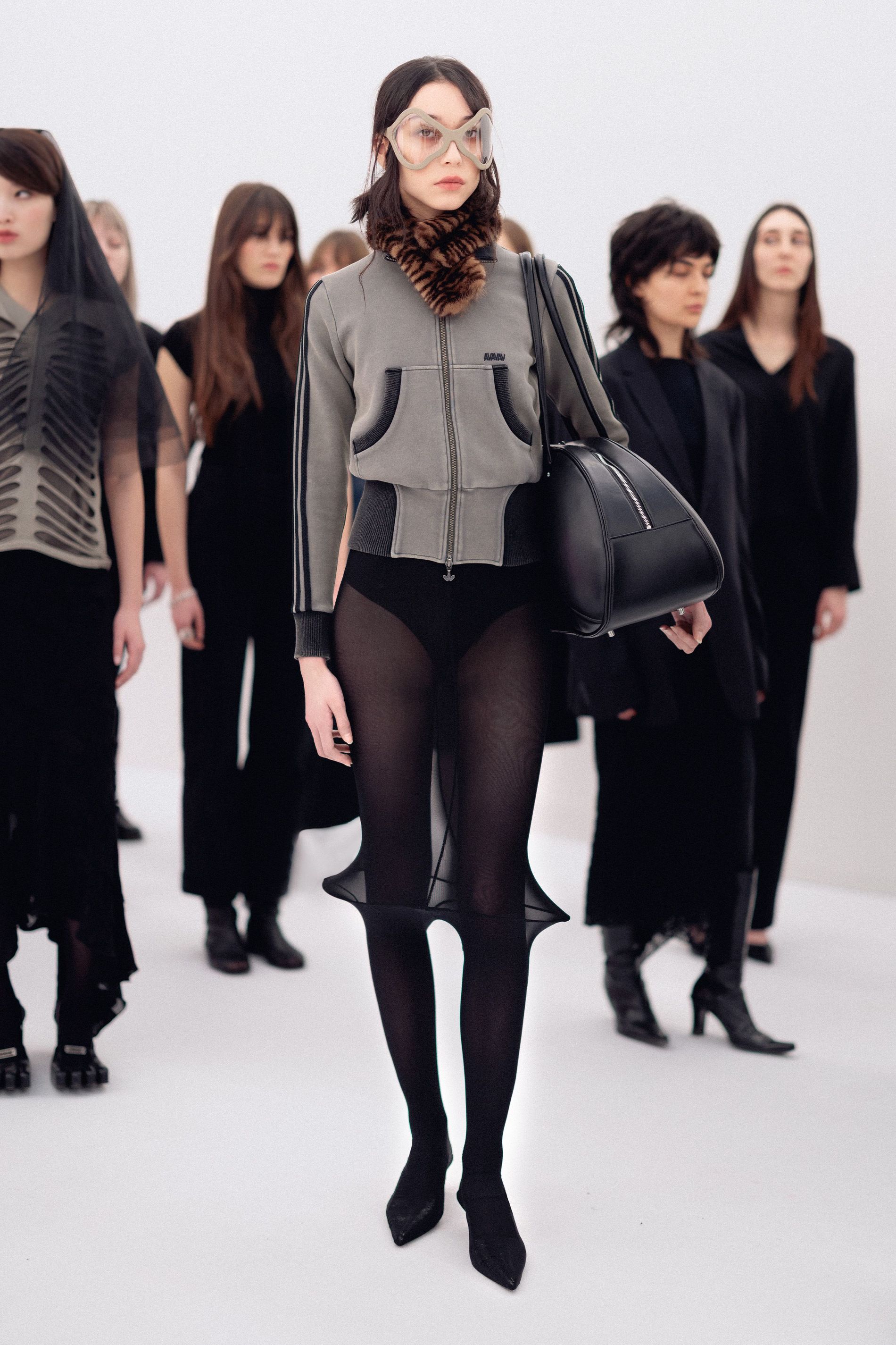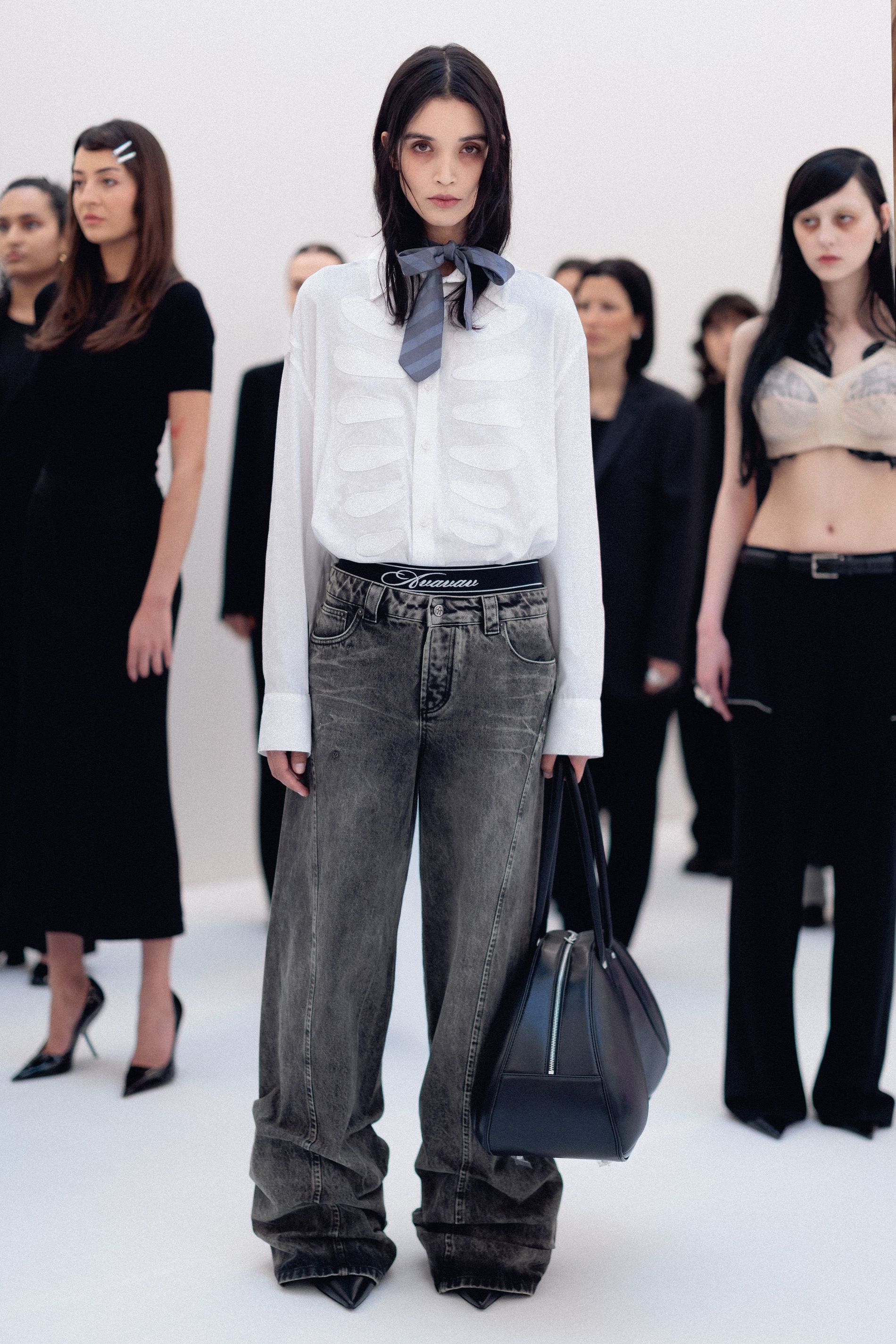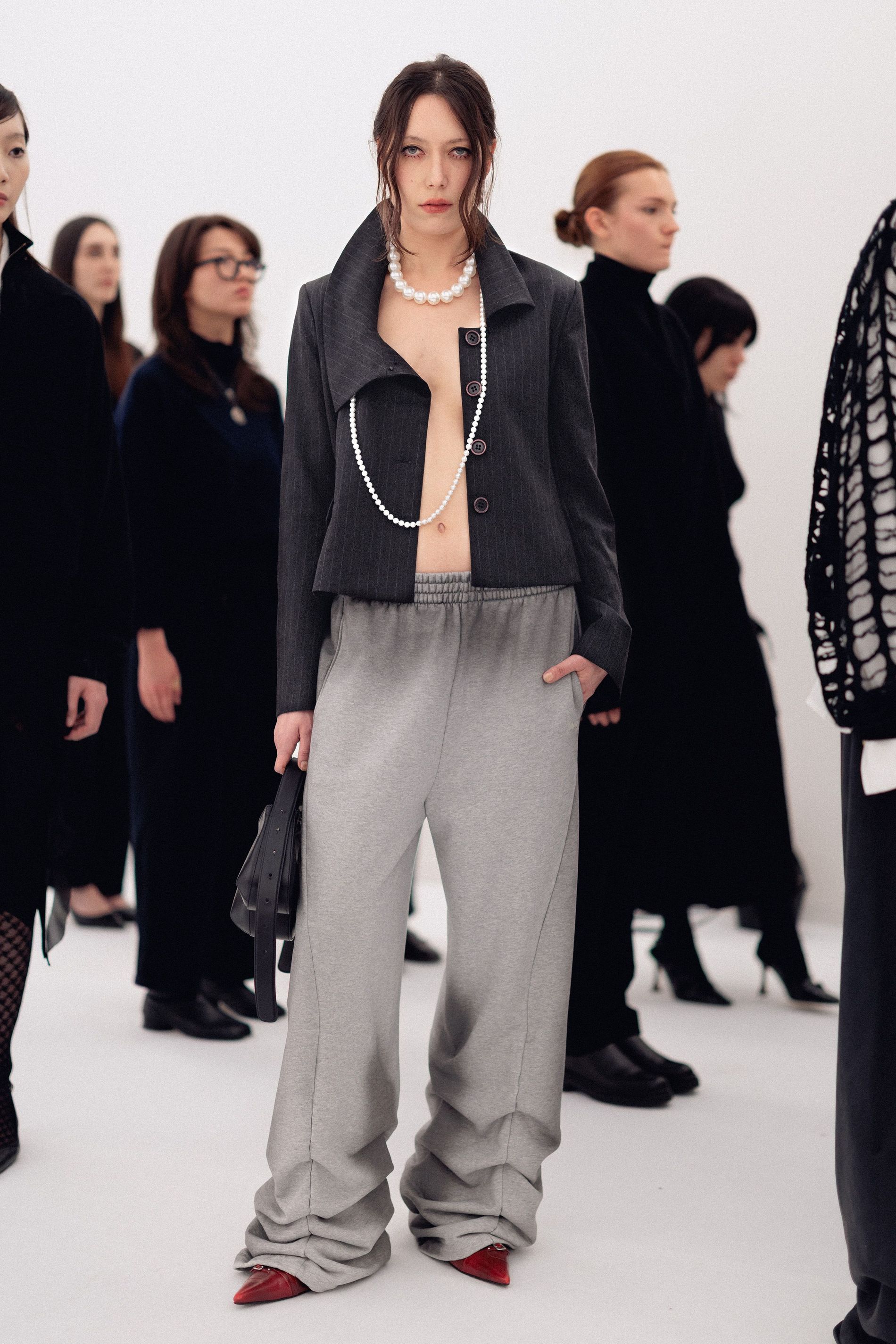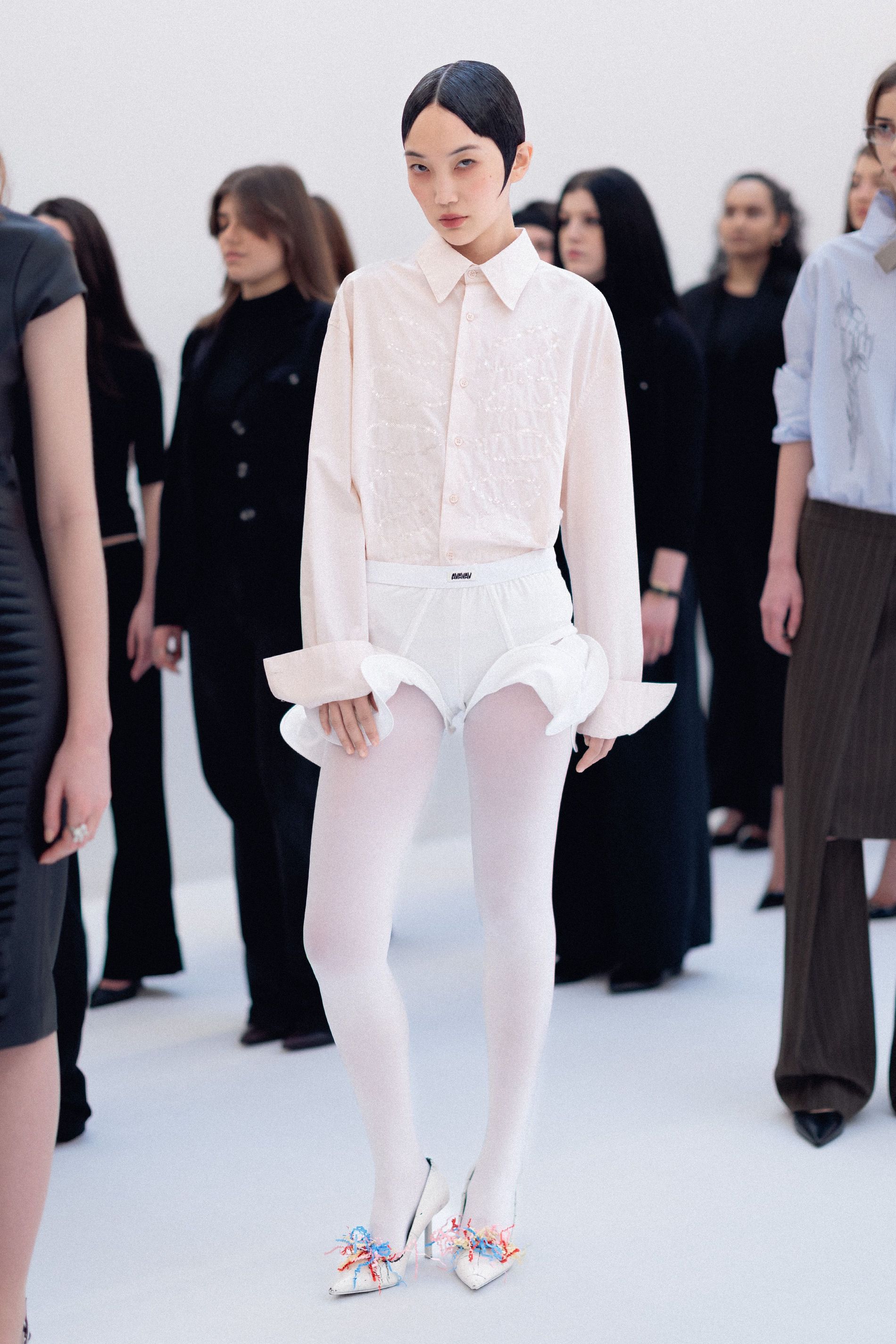There were plenty of AVAVAV signatures on offer, too. Ribcage slices adorn t-shirt dresses, sweatpants pool around stilettos in oversized ruffles and, yes, the finger shoes extend into stockings. Unmissable looks that beg to be gazed at.