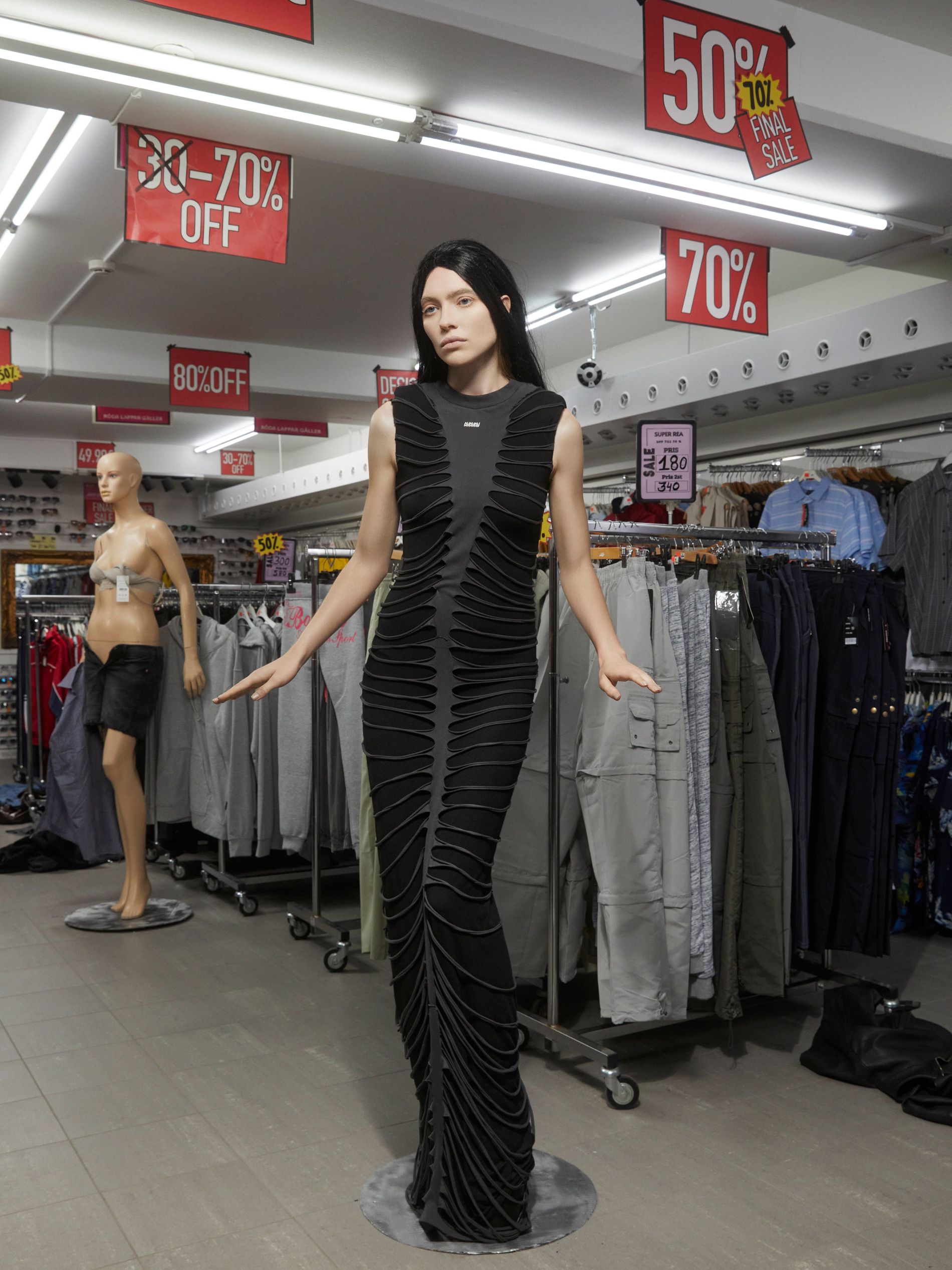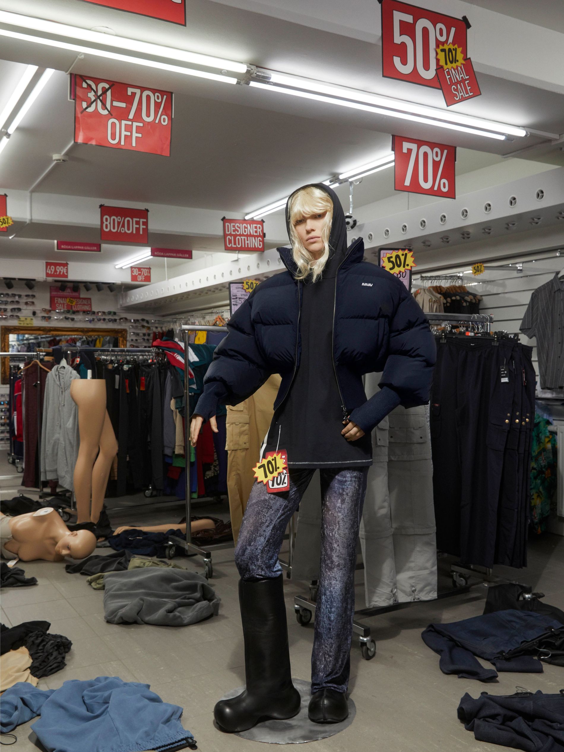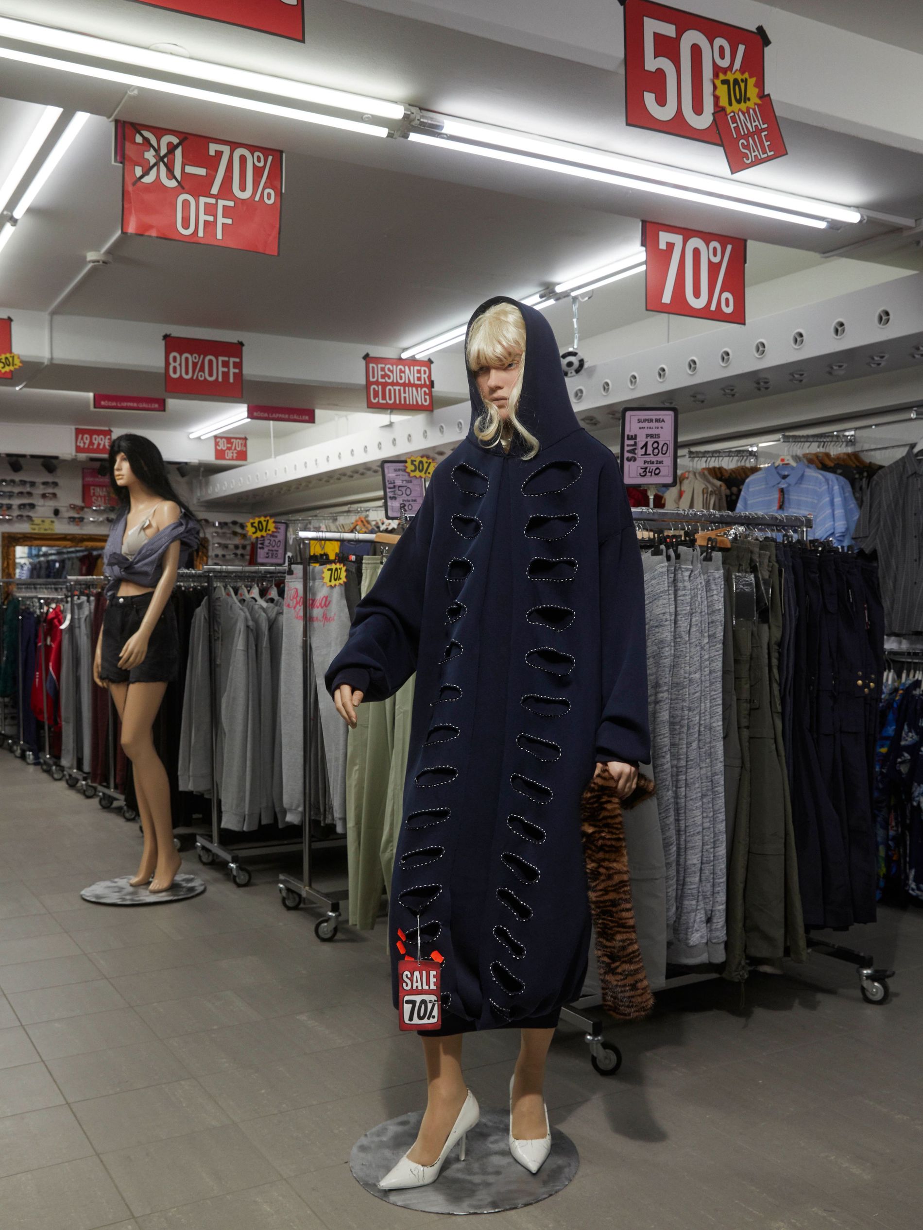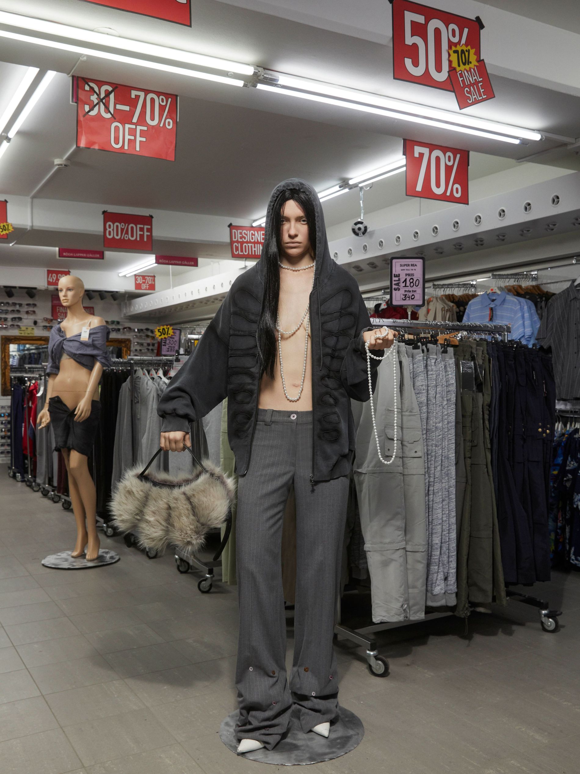 To visualise this cosmic fashion joke, Karlsson placed her SS26 collection on models imagined as low-budget mannequins (flammable wigs included), set amidst one of the industry’s least glamorous locales, the outlet store. One of the pleasures of producing a lookbook rather than a fashion show was the ability to meticulously curate every element of the image, from the slashed signage to the garments strewn across the space to the models’ uncanny poses. “We had all of the poses prepared beforehand,” notes Karlsson. “It was so important – even where their eyes stare.”