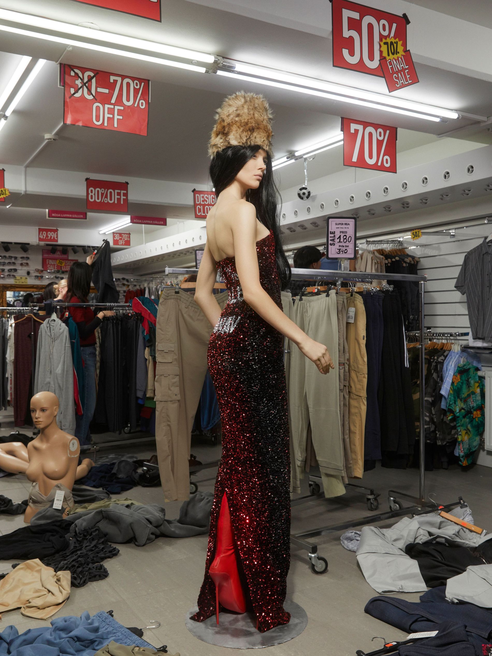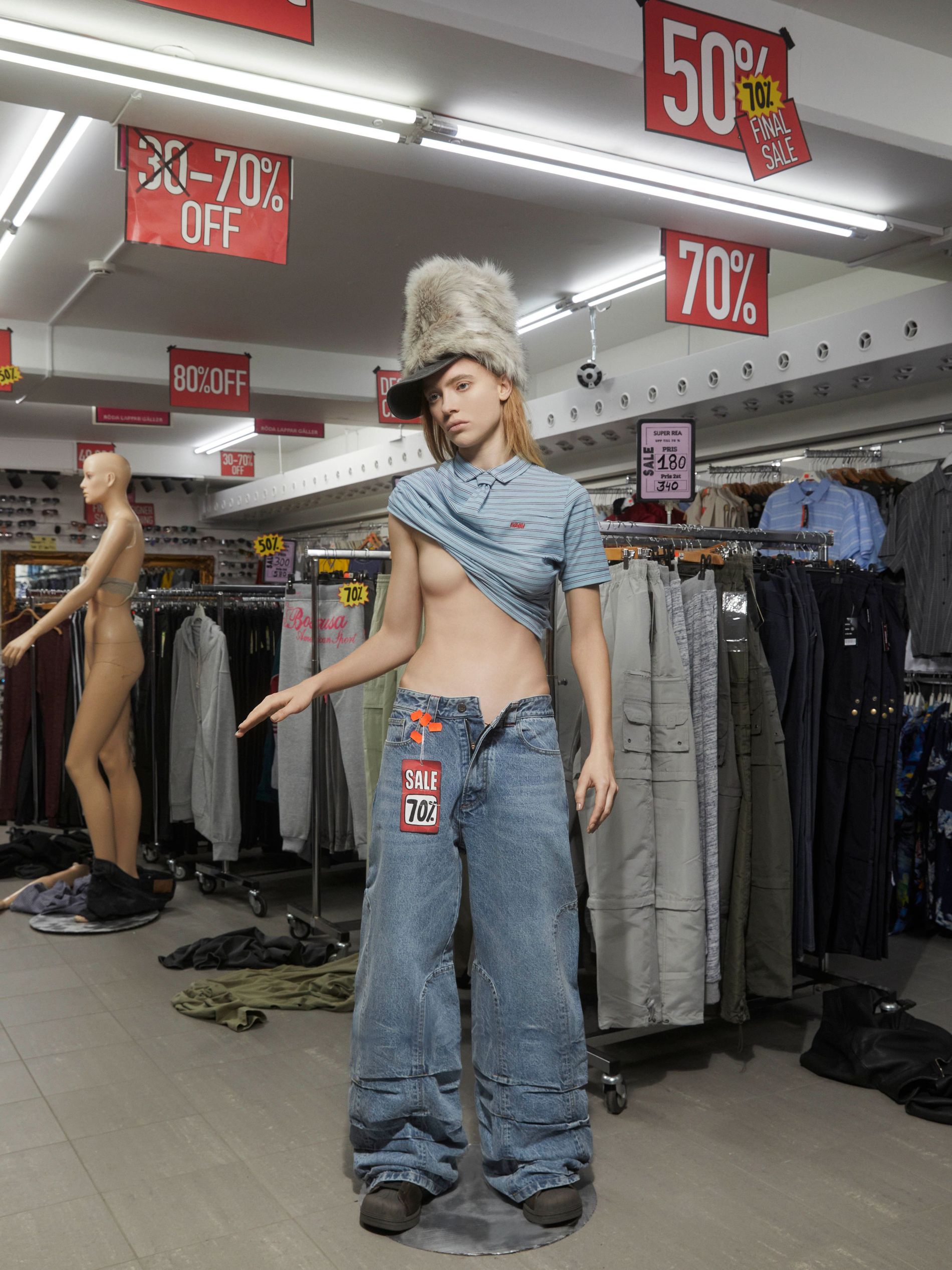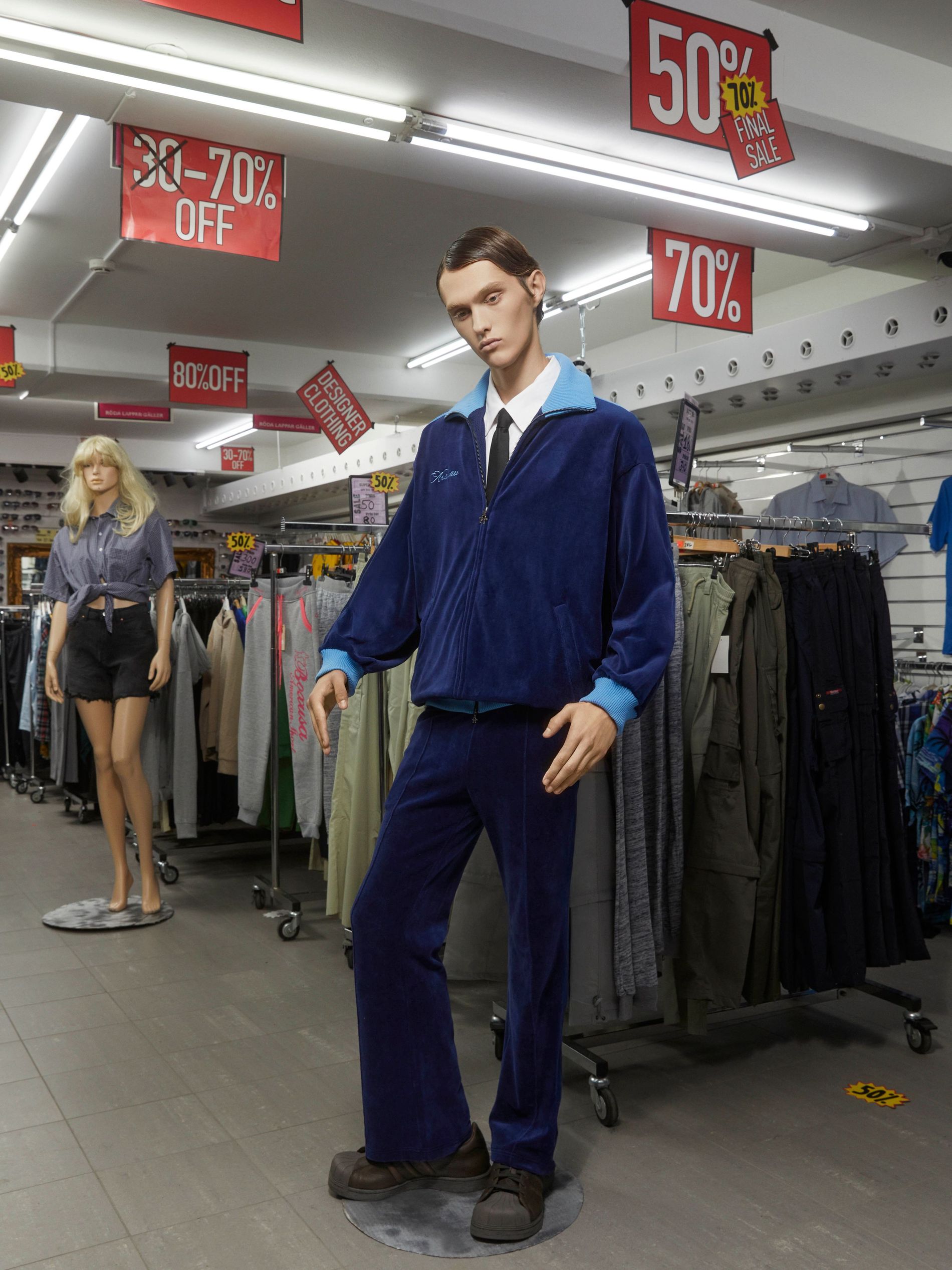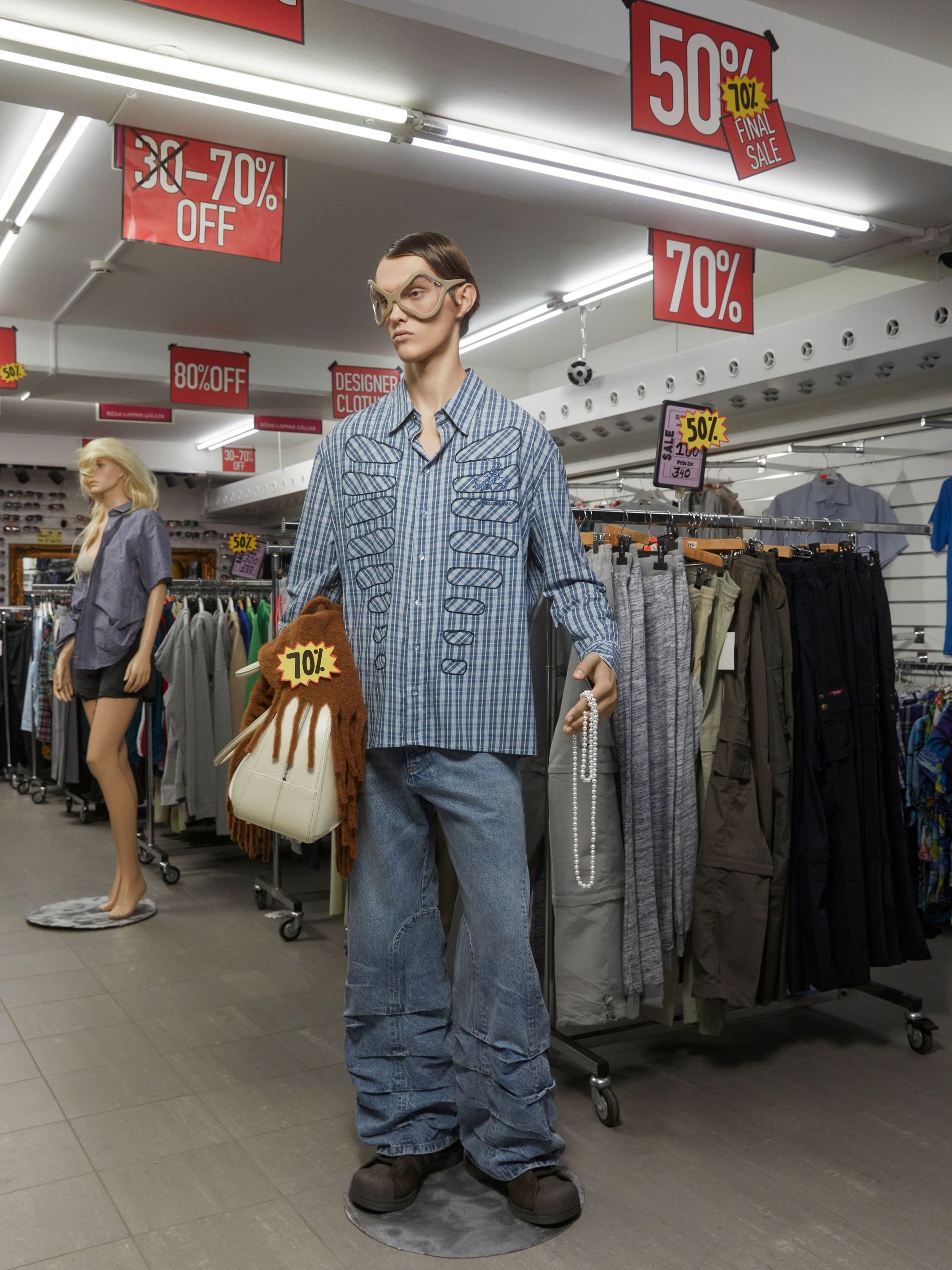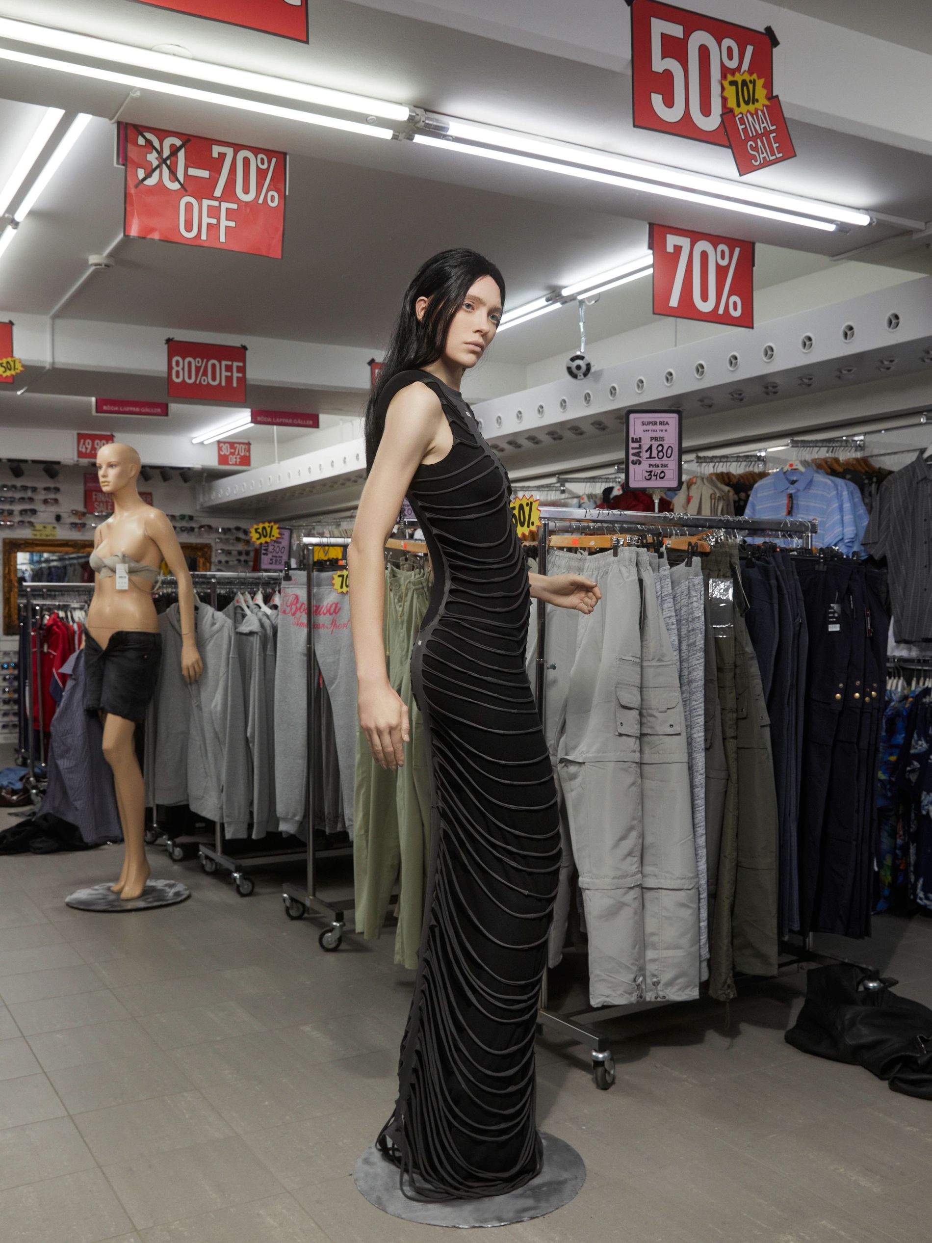To visualise this cosmic fashion joke, Karlsson placed her SS26 collection on models imagined as low-budget mannequins (flammable wigs included), set amidst one of the industry’s least glamorous locales, the outlet store. One of the pleasures of producing a lookbook rather than a fashion show was the ability to meticulously curate every element of the image, from the slashed signage to the garments strewn across the space to the models’ uncanny poses. “We had all of the poses prepared beforehand,” notes Karlsson. “It was so important – even where their eyes stare.”