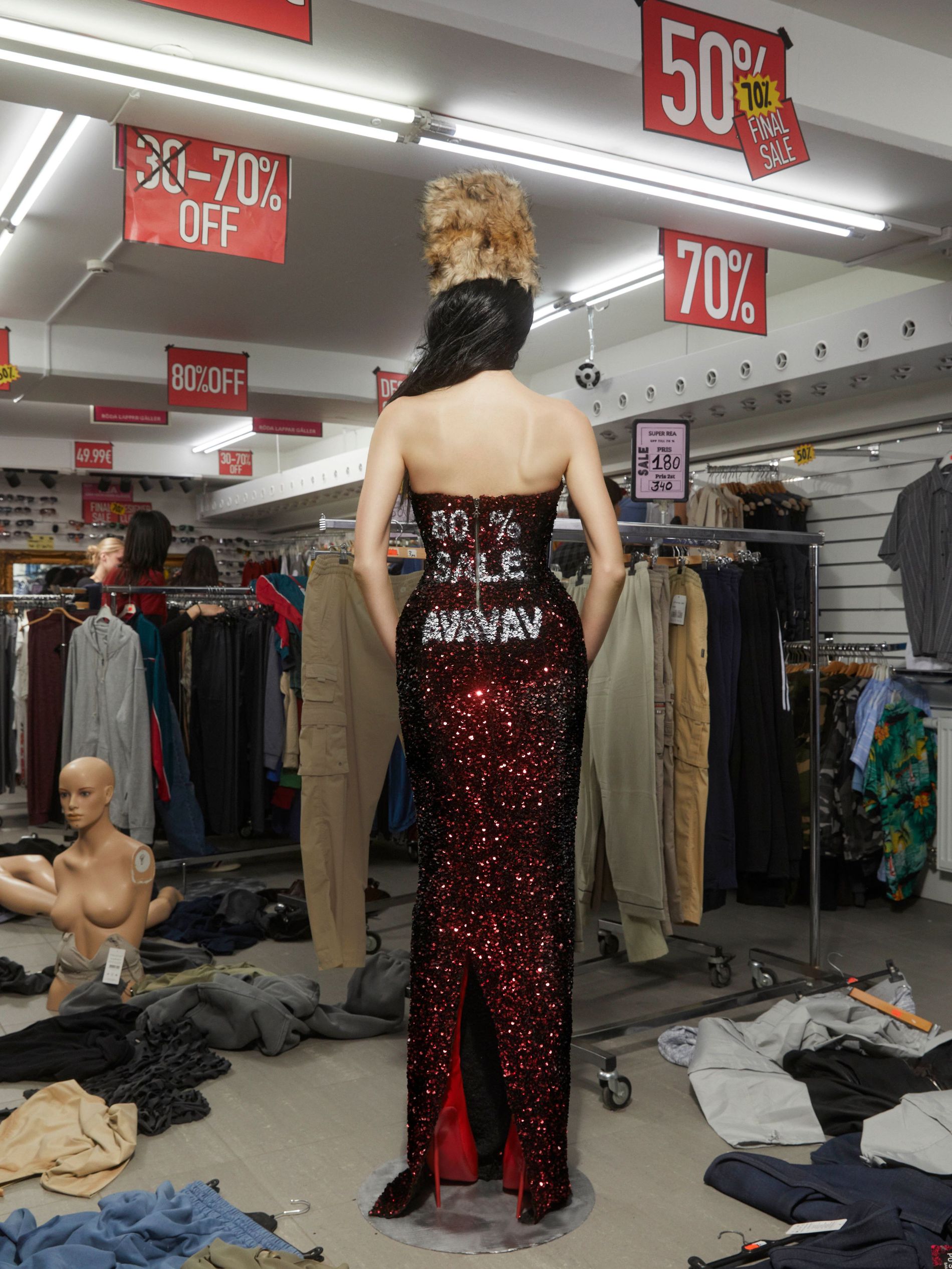 As for the clothes, Karlsson continues to explore the visual language AVAVAV has established over the past few seasons. The slashed rib-cage like expression – a brand signature introduced for SS25 – reappears on hoodies, a floor-sweeping maxi tank dress and spray painted on crafty crochet shirts. The smocked trouser, another brand signature, is exaggerated to new proportions, with denim and relaxed slacks pooling on the laminated floor. There are fresh silhouettes, too, most notably a heather grey sweatshirt dress, with puffed sleeves and a structured circle skirt, held in place with stiff boning. “That’s one of my favourites,” notes Karlsson. But the standout is surely that gala-ready glittering red sequin gown, carefully tailored to exaggerate the mannequin’s curves. On the back, the punchline: 80% Sale.