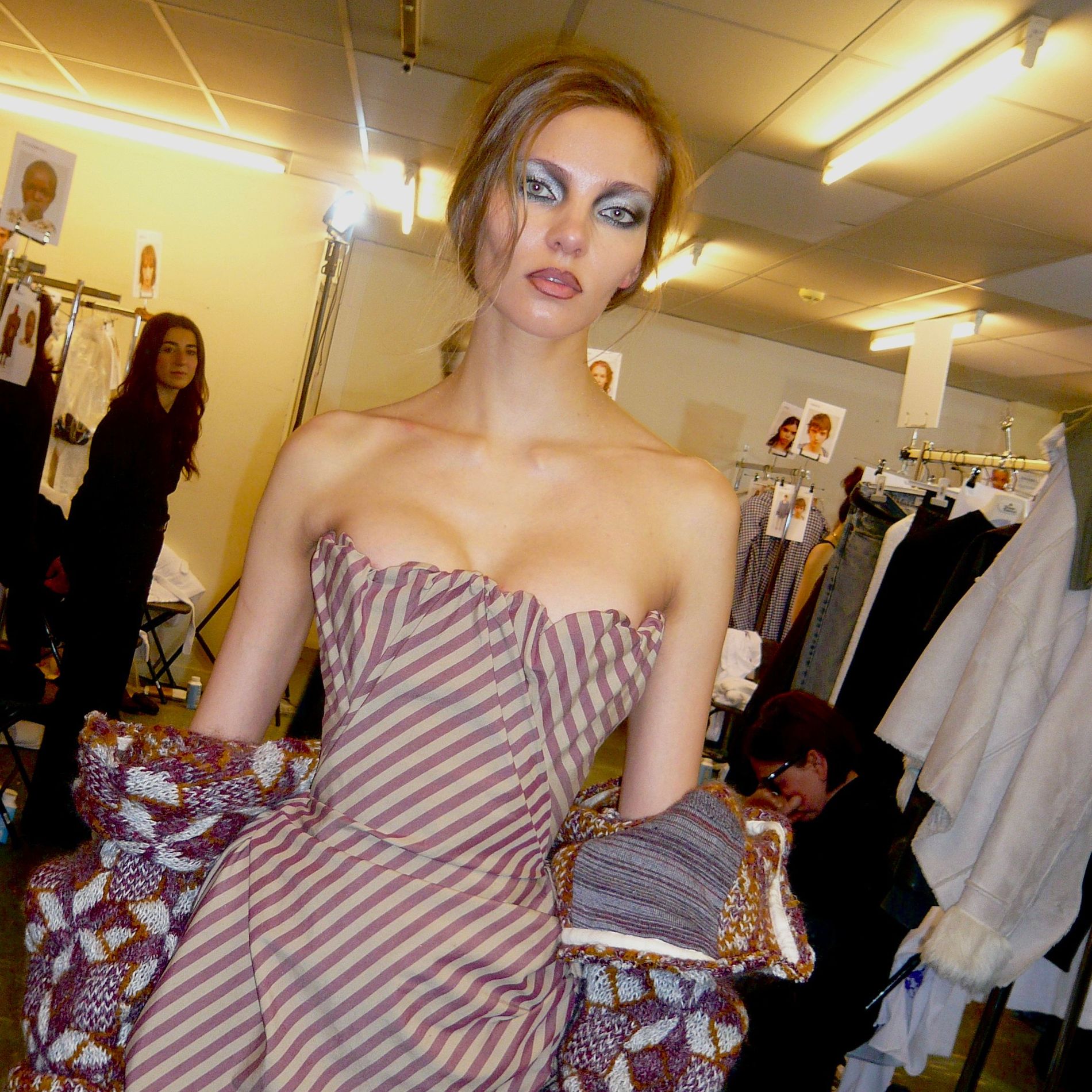 “The main inspiration from Andreas and Sabina was the glamour of Romy Schneider,” says Sällström. “As soon as we started testing these looks they quickly evolved into a Westwoodified version of her.” That “Westwoodified” instinct was the key. Rather than treating glamour as something pristine, Sällström gave it a looser hand. Silver and gold lids caught the light with almost metallic force, while elsewhere matte smoky eyes felt sketchier, sexier and more lived-in. Smudged cherry lips, flashes of glitter and the odd deliberately imperfect edge kept the looks from becoming too reverent. The result had the ease of something half-undone, which is to say exactly right for a house that has never had much patience for overworked prettiness.