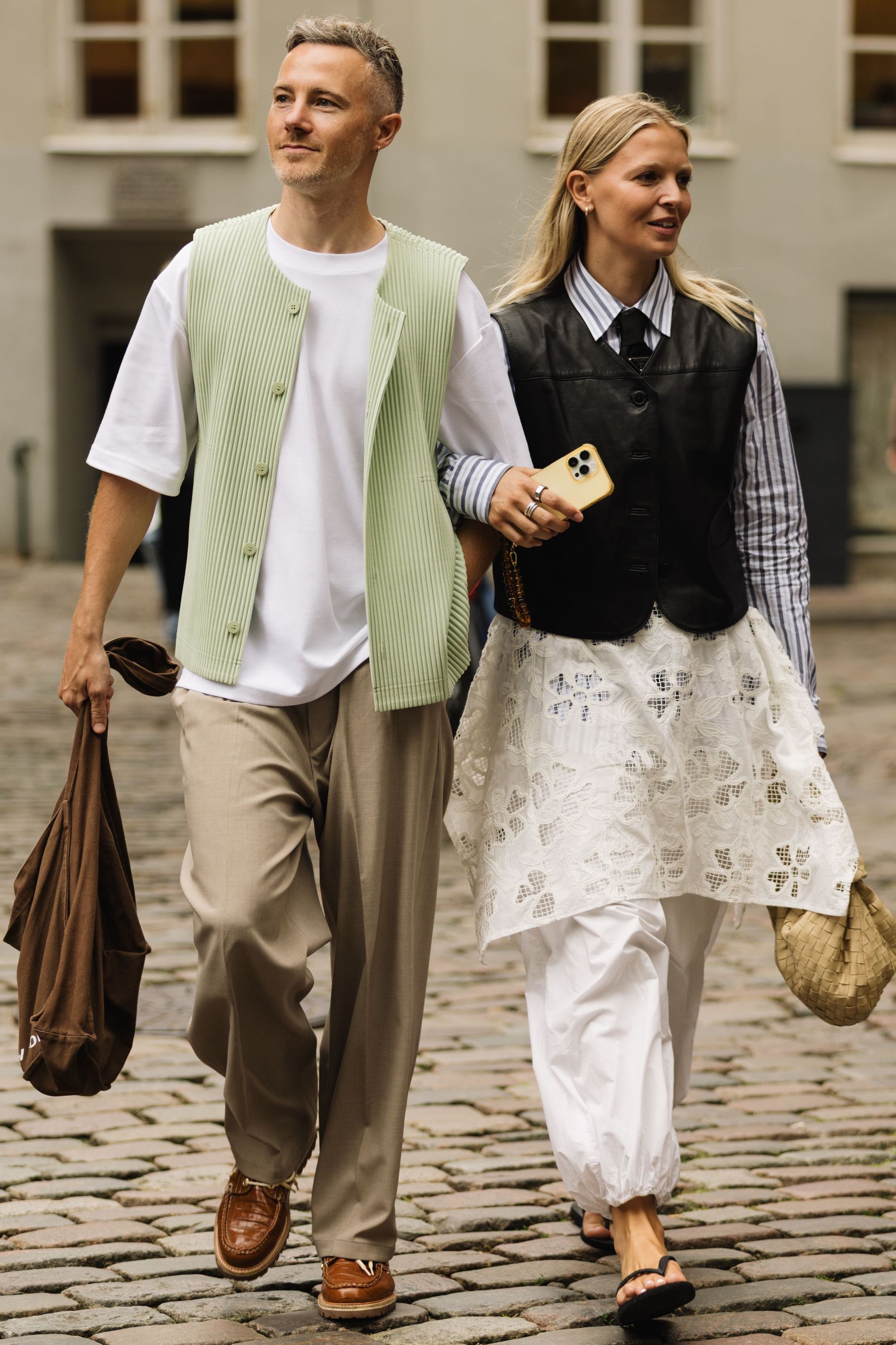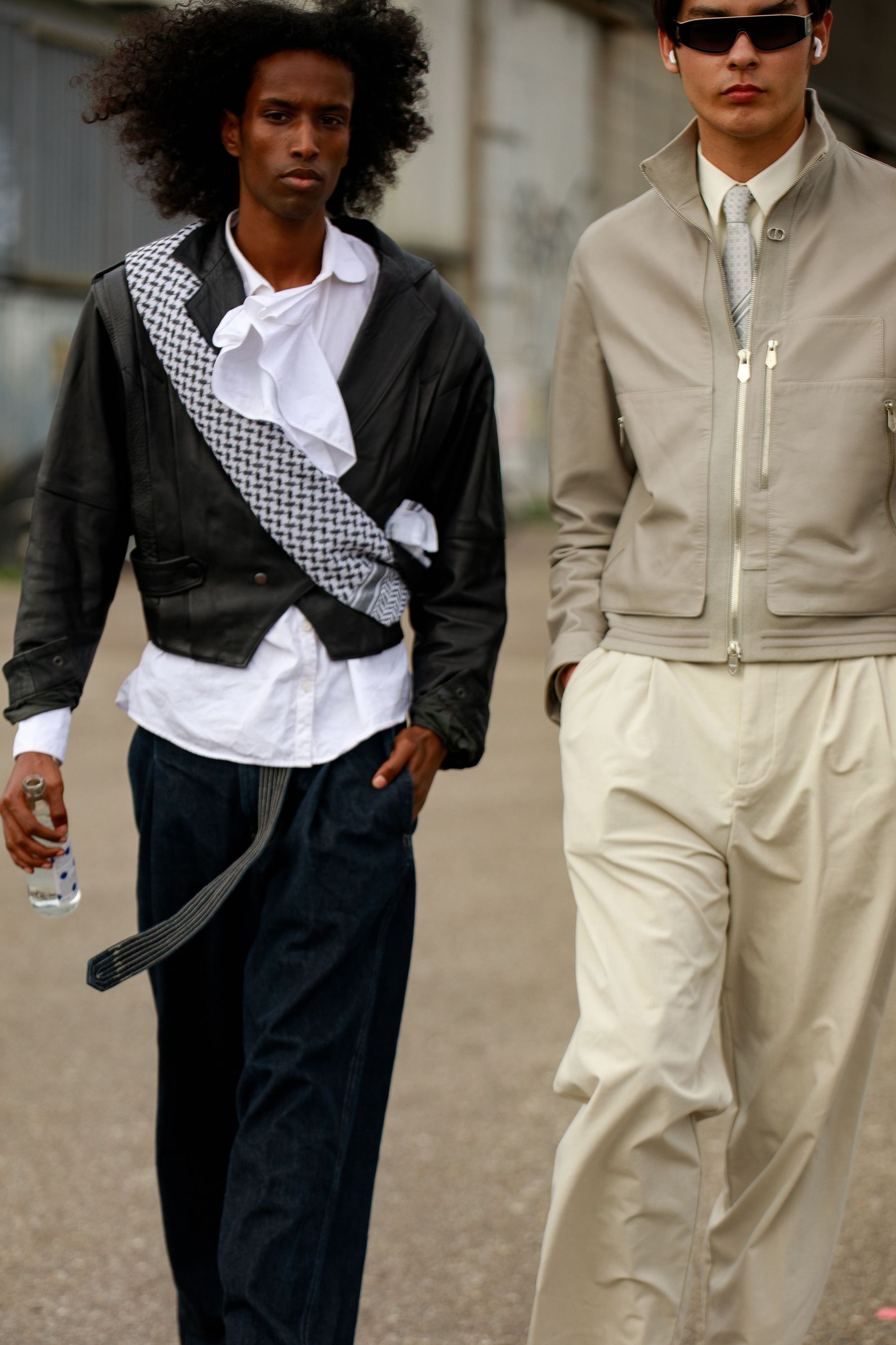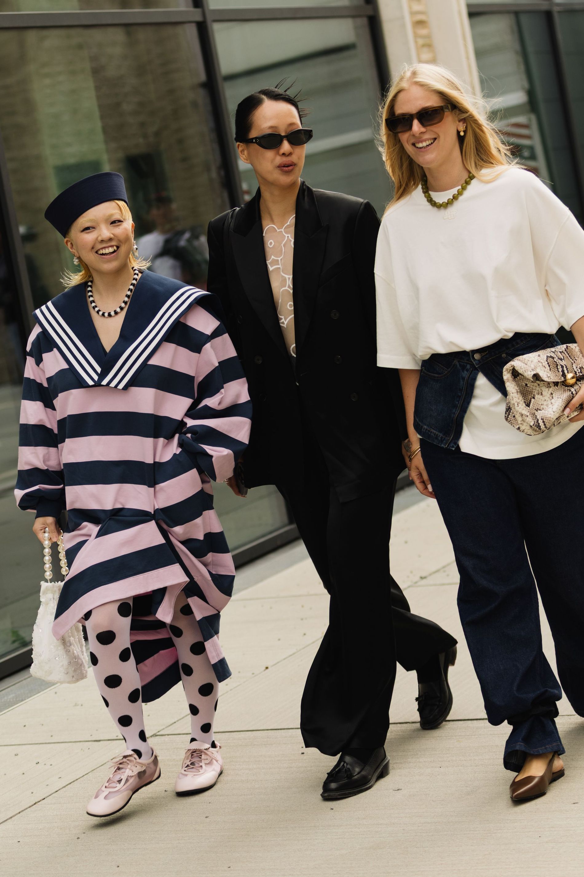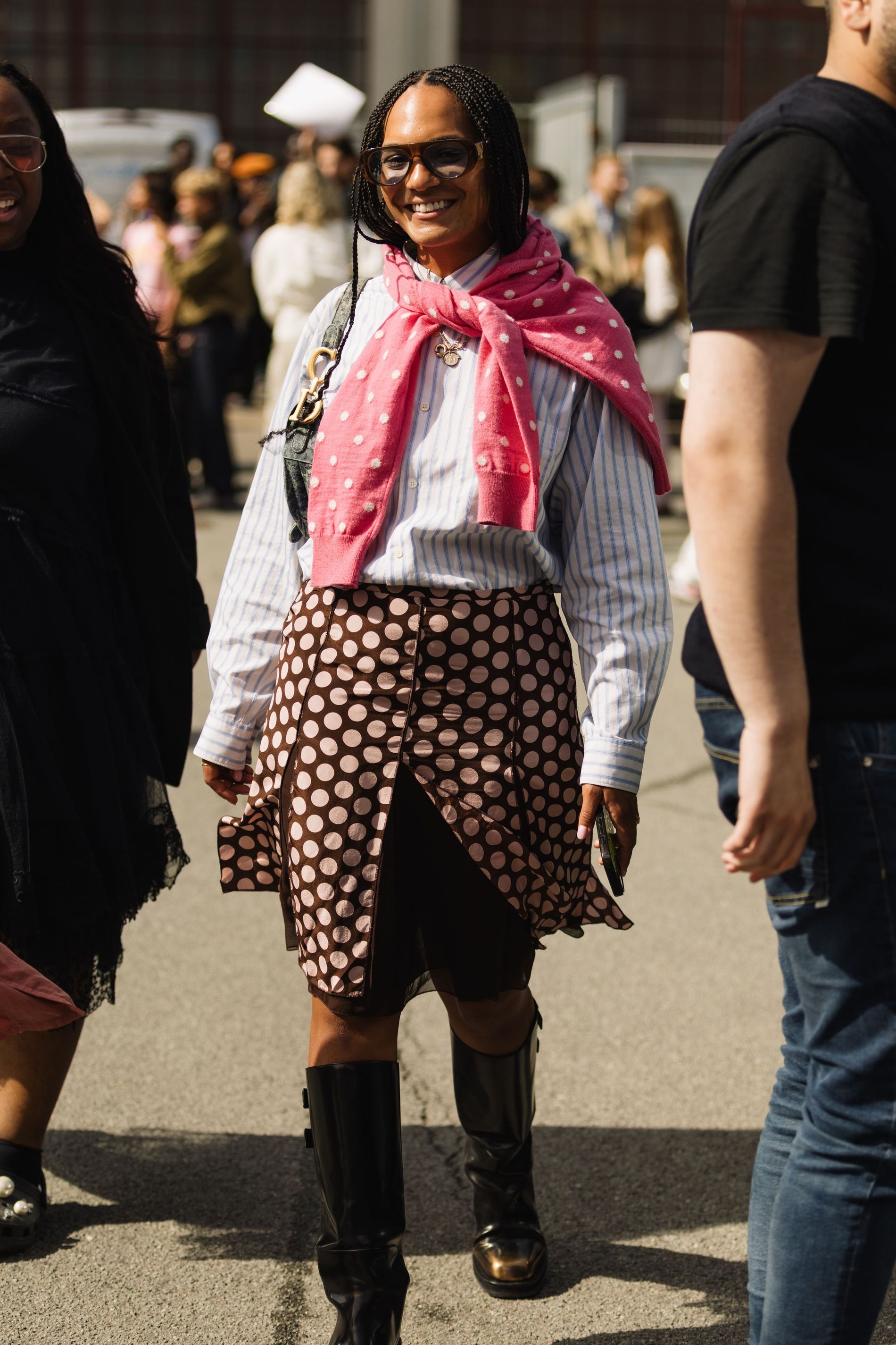 One print was impossible to ignore: polka dots. Whether blown-up and bold or barely-there delicate, dots are punctuating everthing: skirts, shirts, bags, even socks. This season, contrasts are doing the heavy lifting. Utilitarian cargos meet sheer tanks. Slouchy tailoring is softened with pastel lace. Soccer jerseys and denim jorts are still in rotation, but they’re styled with bowler bags and Fendi baguettes slung over the shoulder. Masculine vests and ties are layered with feminine flourishes – belt chains, bows, and yes, more polka dots. Leopard has also snuck its way into the mix, a wink amidst the neutrals.