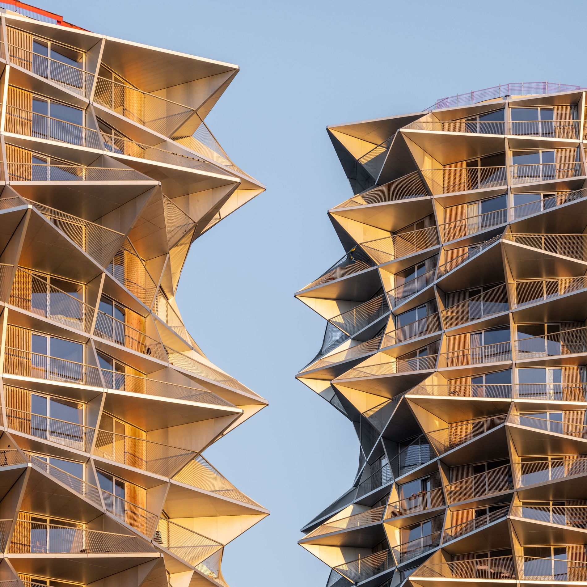 Density with character defines Kaktus Towers, a pair of twisting, prismatic towers tied together at the base rise from a raised public park in Copenhagen. Clad in faceted panels, the towers shift from matte to glinting as the sun moves, creating a dynamic presence on the skyline. Each apartment sits on a rotating floor plate, offering unique views across the city and a sense of individuality within the dense urban fabric.