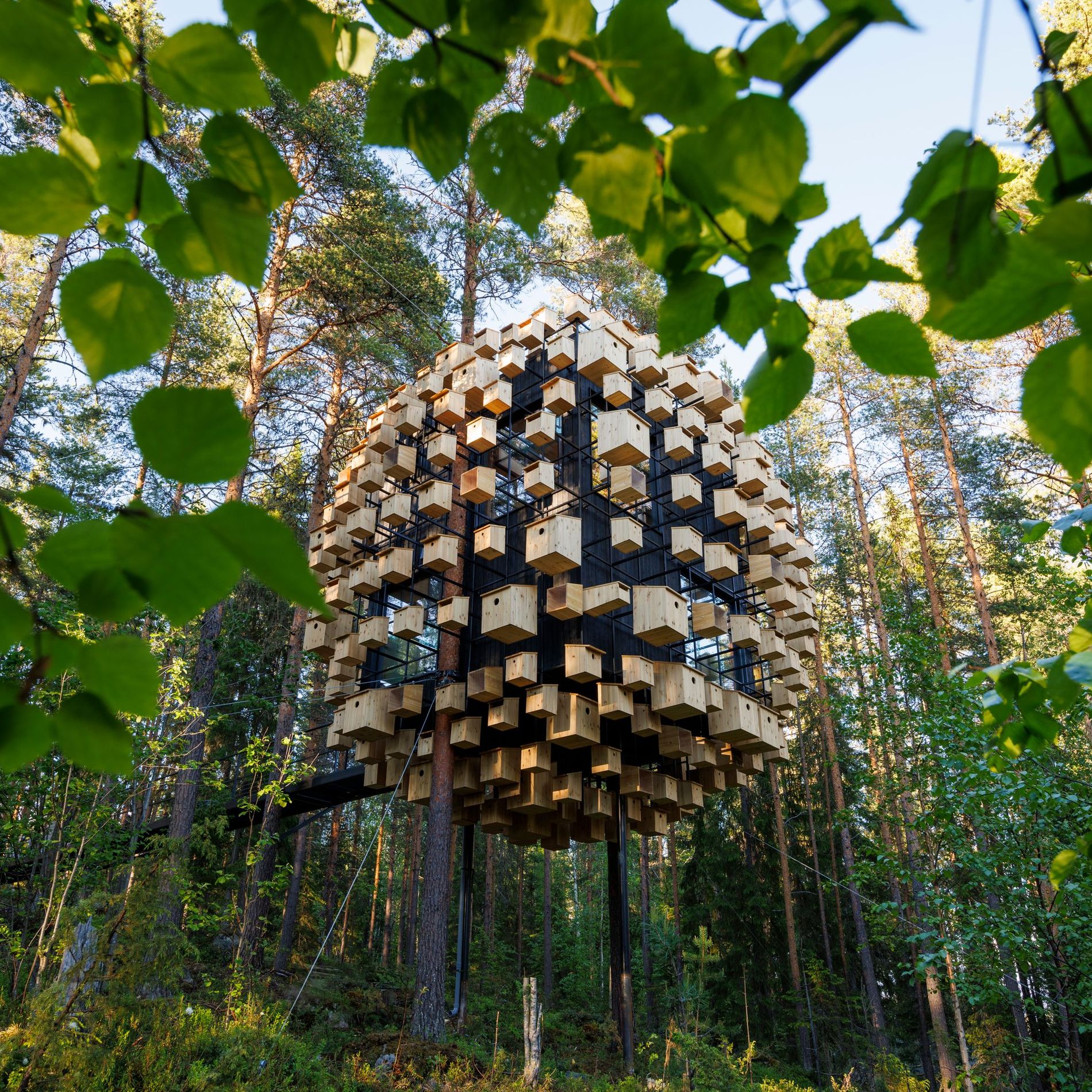 Conceived as part of Tree Hotel's collection of fantasy cabins, Biosphere by BIG proposes hospitality that extends to the forest itself. Suspended among the pines, a mirrored cube is wrapped in a lattice of birdhouses that transforms the façade into a living habitat. Visitors reach the cabin via a slender bridge, crossing from forest floor to canopy in a single quiet movement.