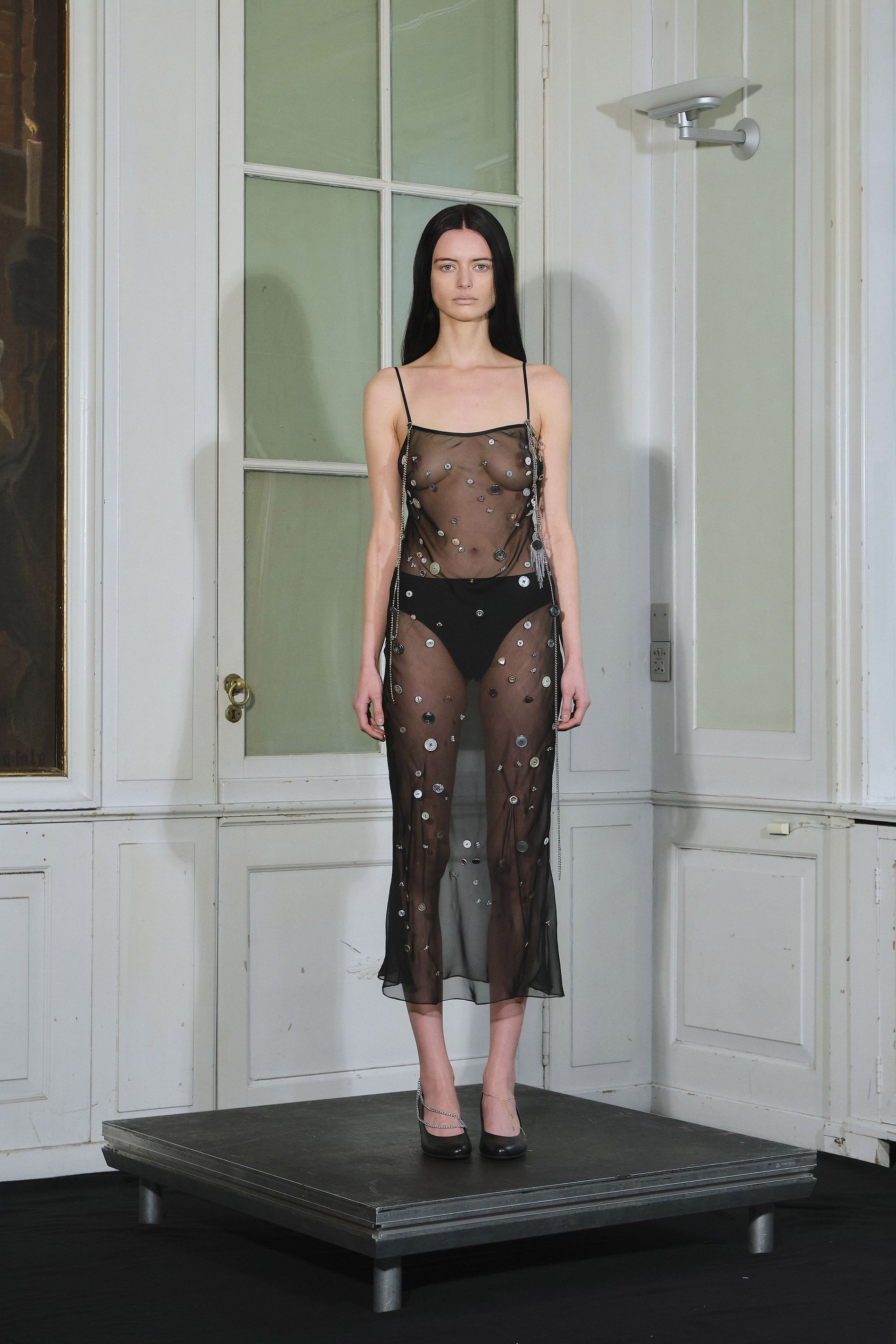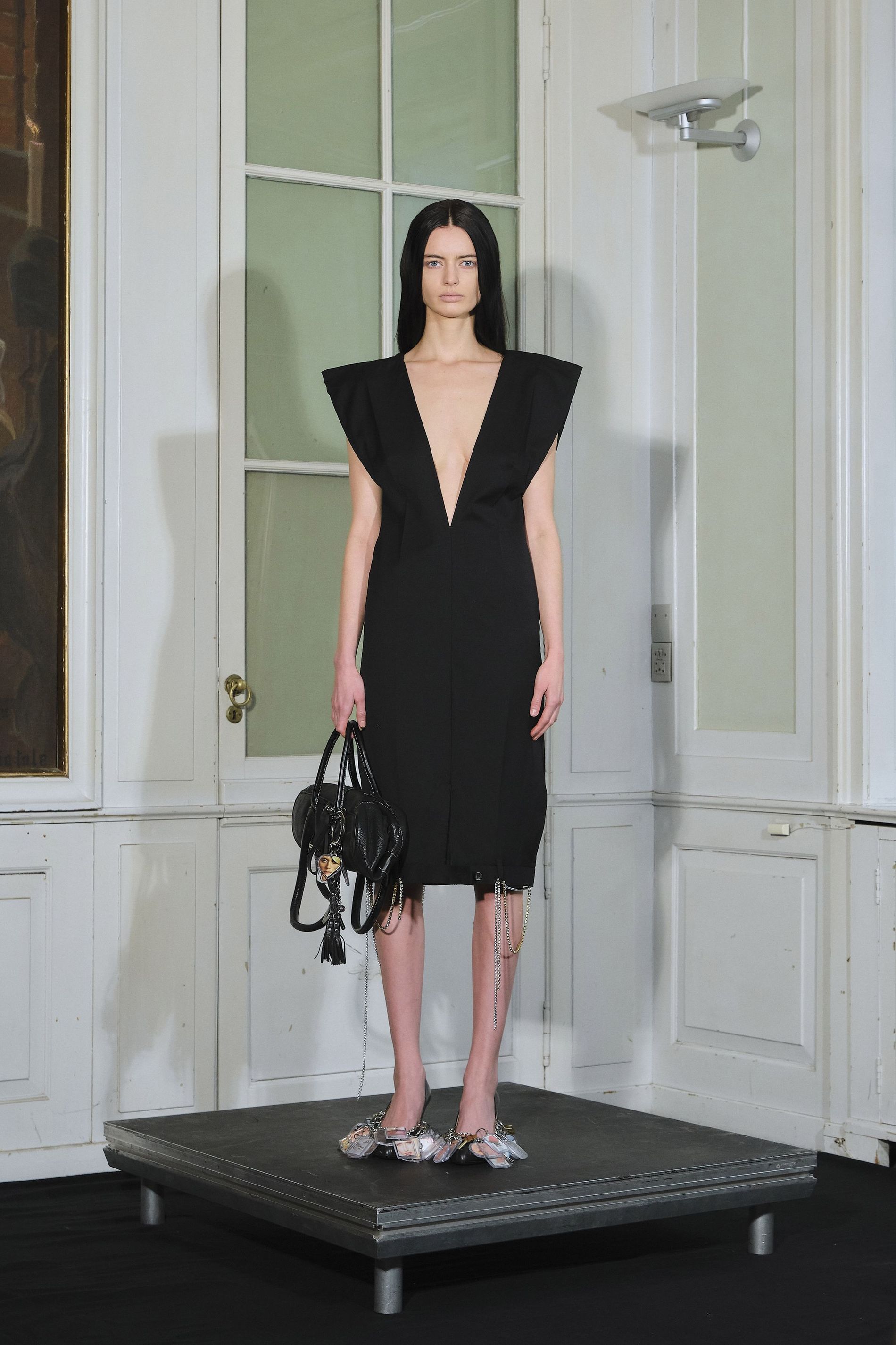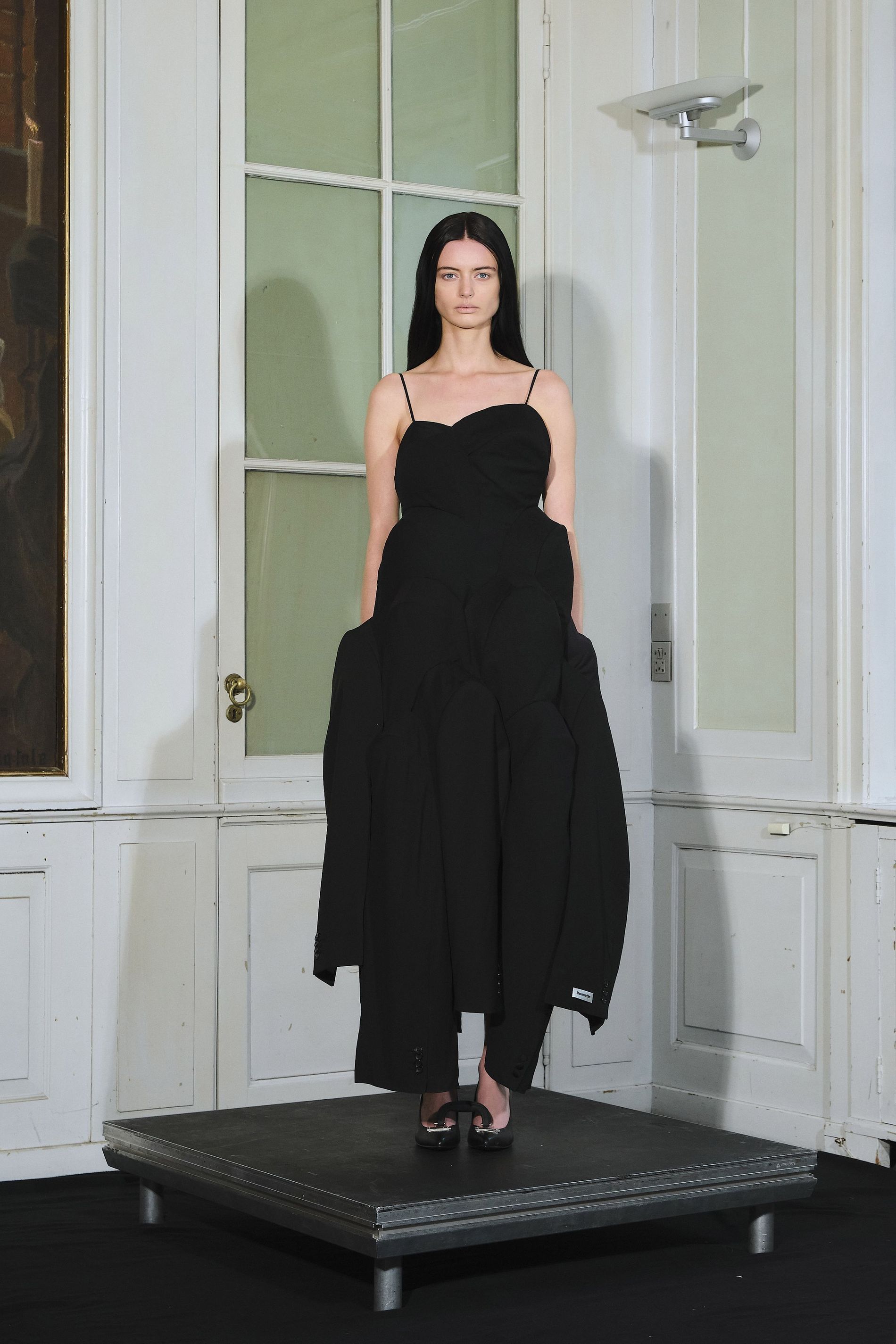 While last season’s runway show skewed more accessible – particularly the introduction of silk and jersey slip dresses – AW24 takes a higher-concept approach, focusing on ambitious showpieces that reflect Myntekær and Maja Hansen’s technical chops (after all, they are alumni of Cecilie Bahnsen and Maison Margiela, respectively). “Last season we missed a little bit of the abstract showpieces,” says Myntekær. Even the environment itself, an eccentric living room populated with vintage velvet furnishings and dramatic sculptures, lies in stark contrast to last season’s white box show space.