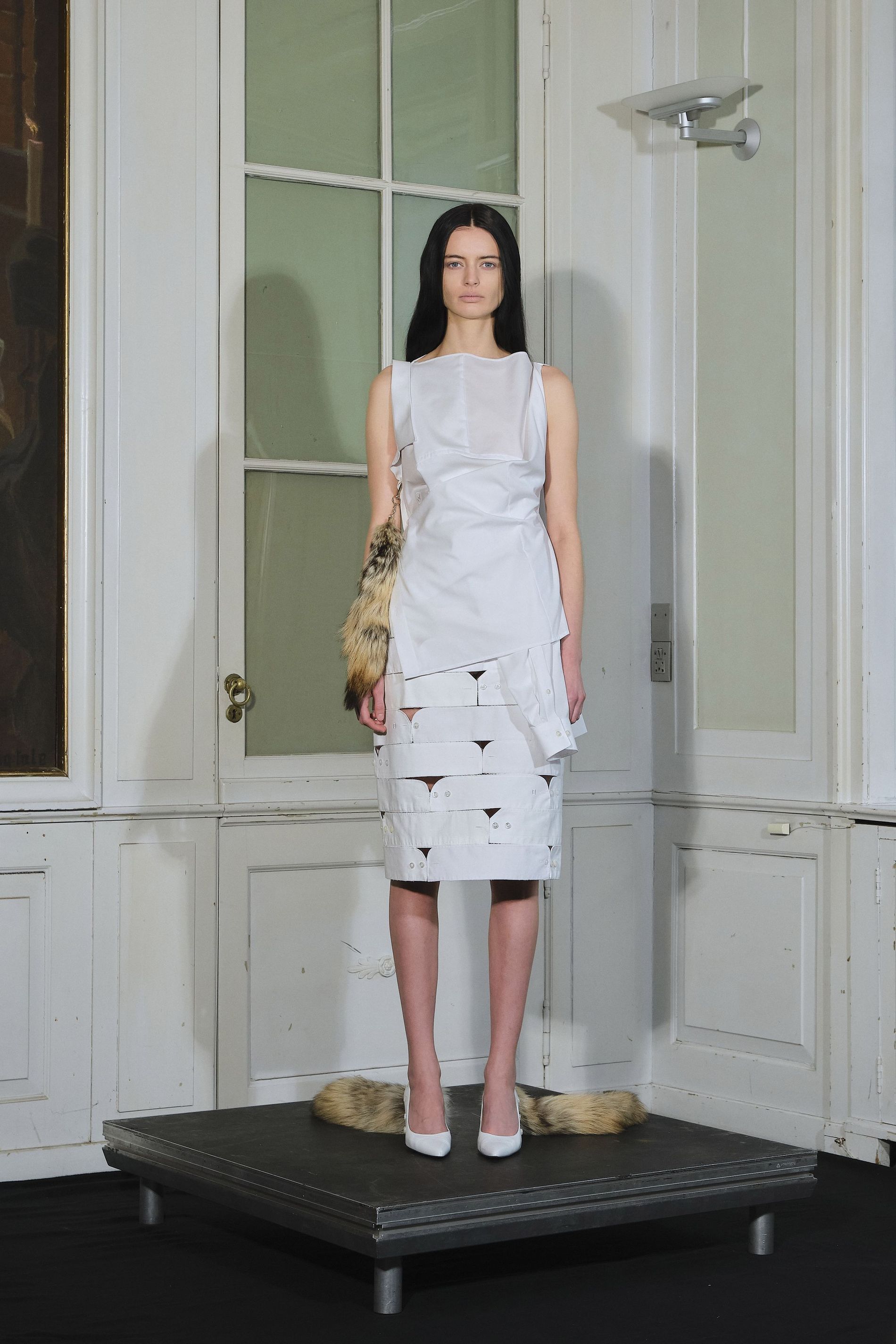 As for the garments, the element of deconstruction is more apparent than ever before. Shirts have multiple collars, a dress is made from an assemblage of white tank tops – a mirror of the repetition favoured by surrealists like René Magritte and Max Ernst. Elsewhere, an ambitious gown made entirely of shirt cuffs hugs model’s form. The jingle jangle of pumps adorned with vintage keychains punctuates the soft sound of a live flute and piano.
