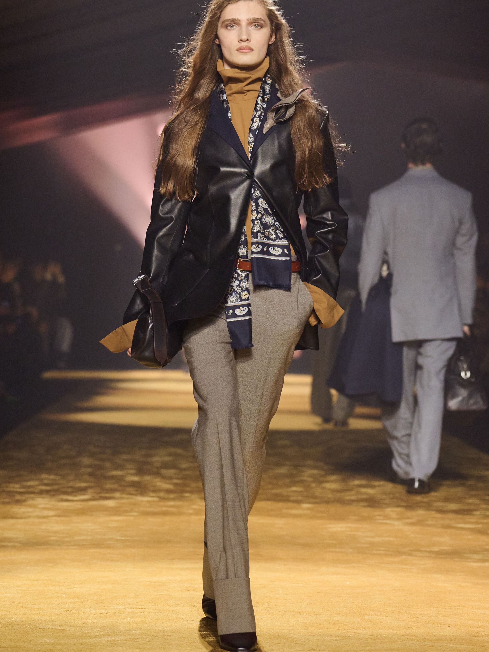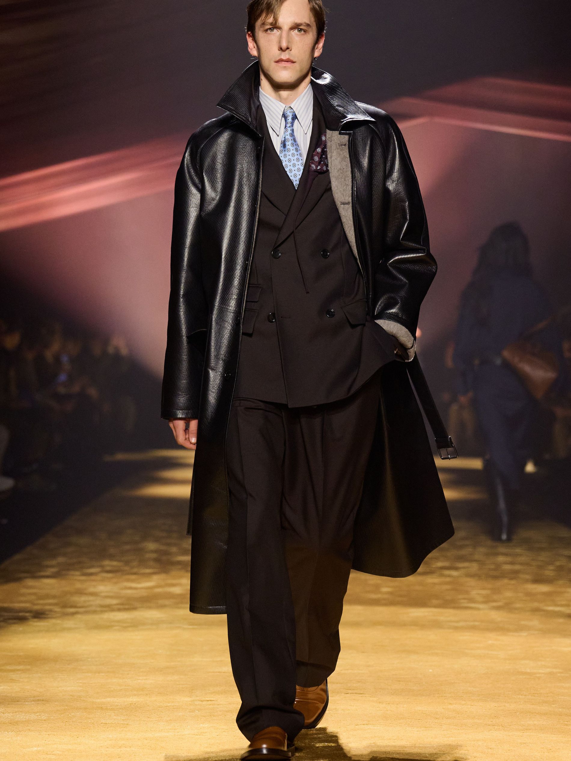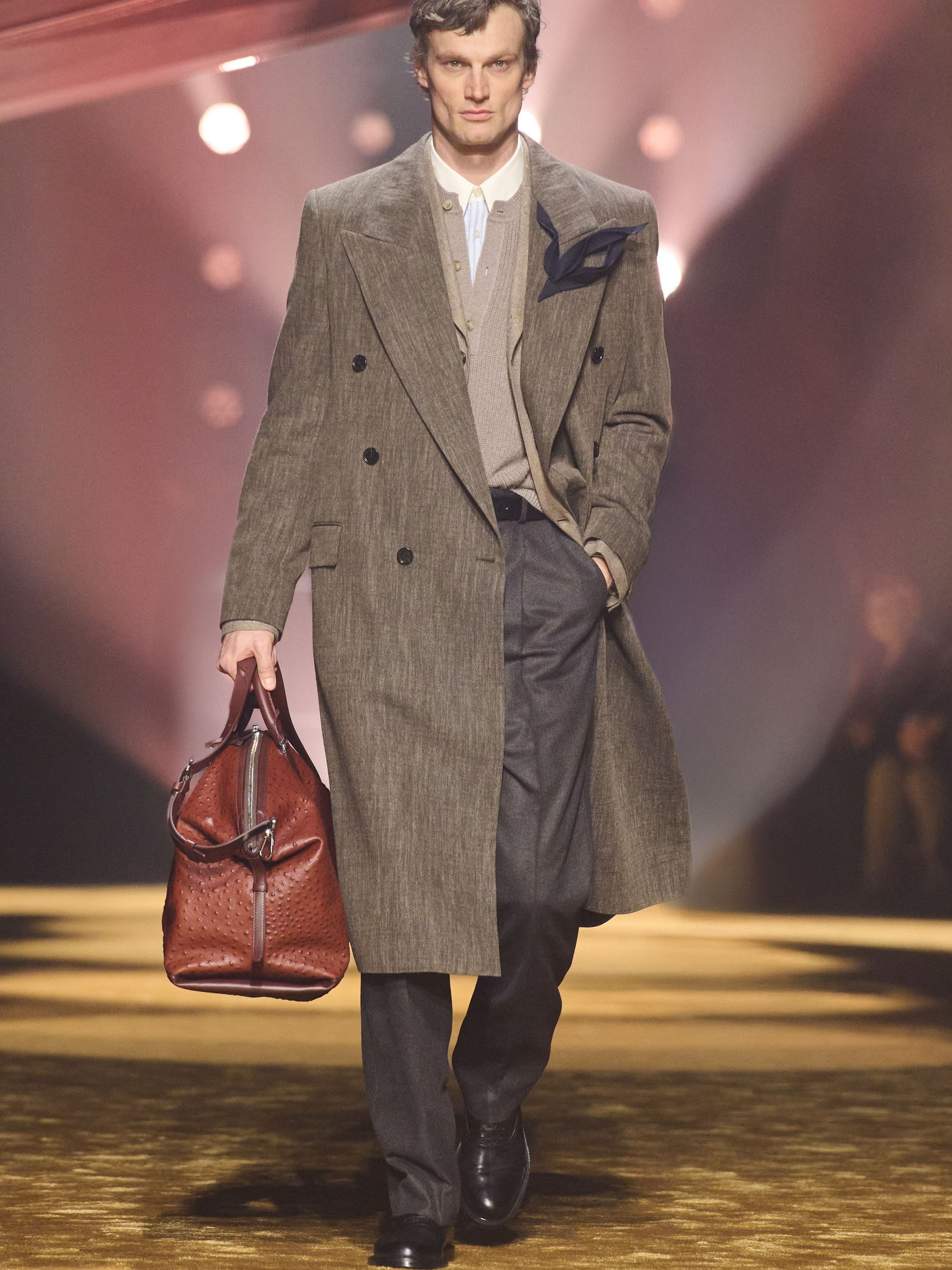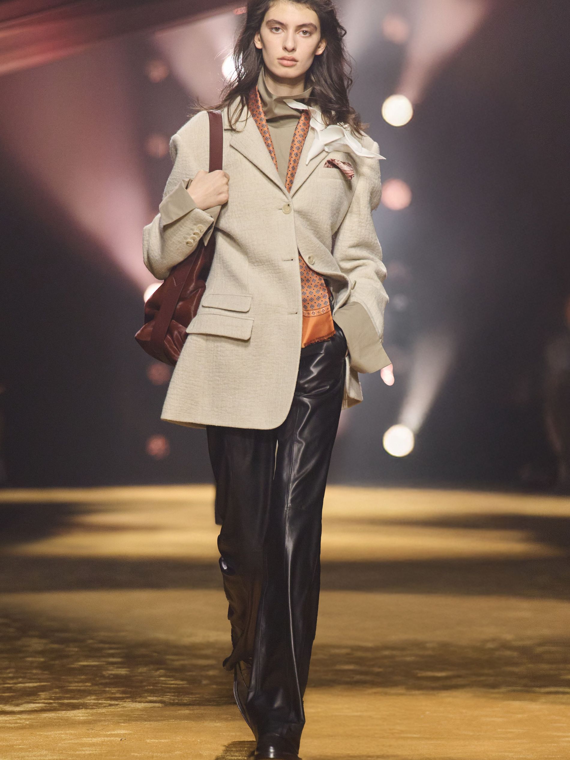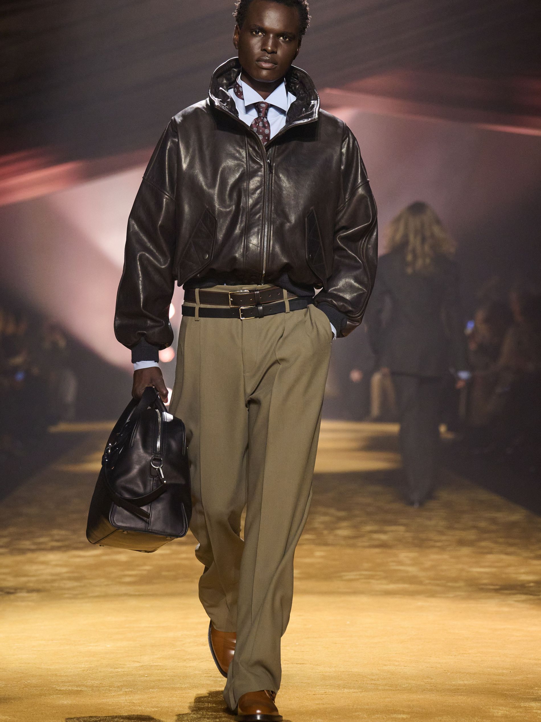 Within this palpable mood, the spine of the show was tailoring. “In tailoring – whether a three-button single-breasted suit, a perfectly tailored coat, a crisp shirt, or the most elegant silk neckwear – the message on the runway is clear: it’s even more powerful when you make it your own,” said Falcioni. There were boxy three-button suits with a ’90s sobriety, double-breasted numbers cut broad through the shoulder with a subtle power surge, and trim sack shapes that felt lifted from an executive floor circa 1988 and reissued for now. “One of our key ambitions was to position tailoring within a more lifestyle-driven context, moving away from traditional office attire and aligning it with hybrid situations.” Trousers were tucked into hybrid boot-loafers – “whose silhouettes are derived from an archival men’s loafer” – and leather blousons were cinched into double-belted waists.