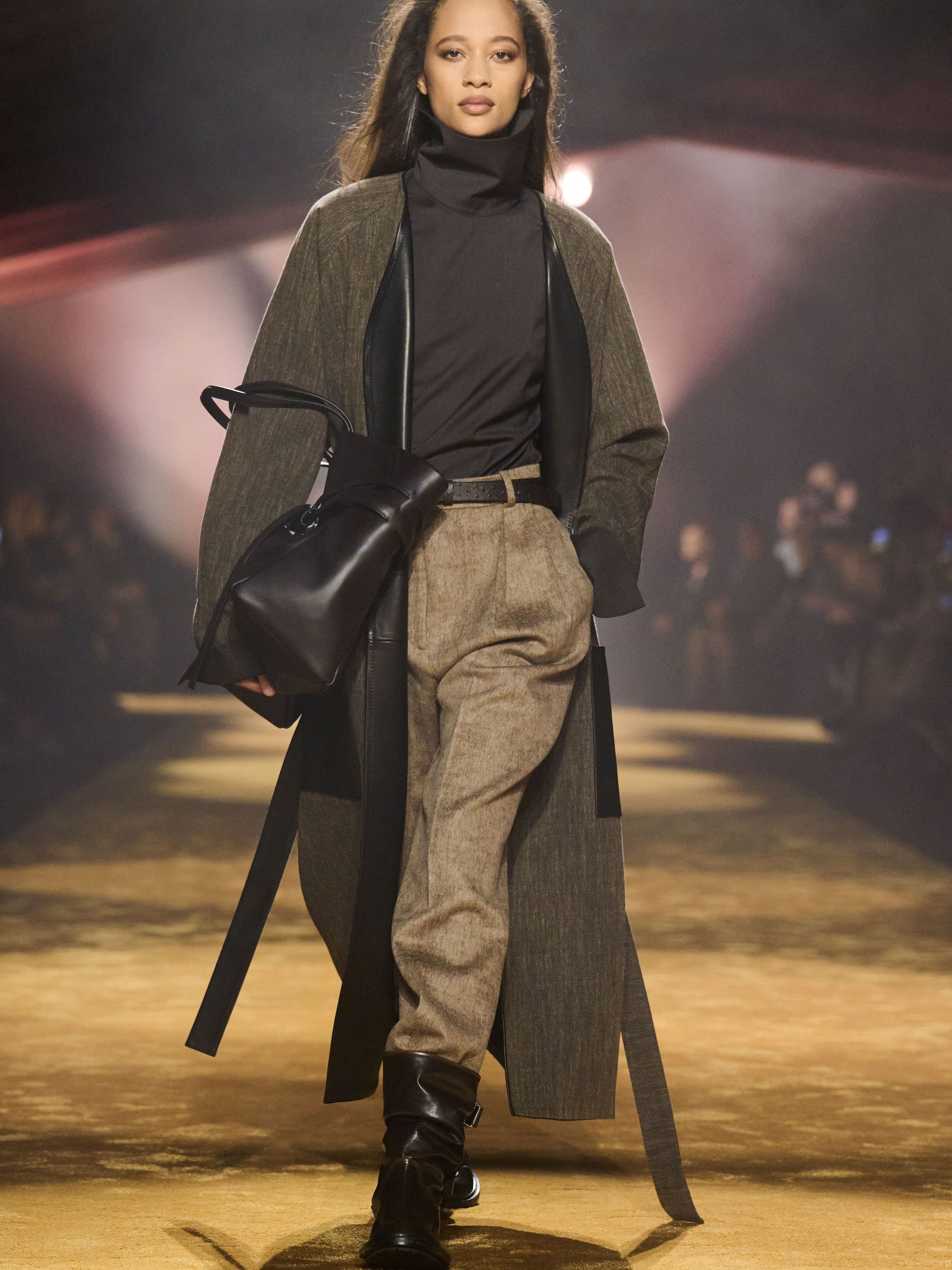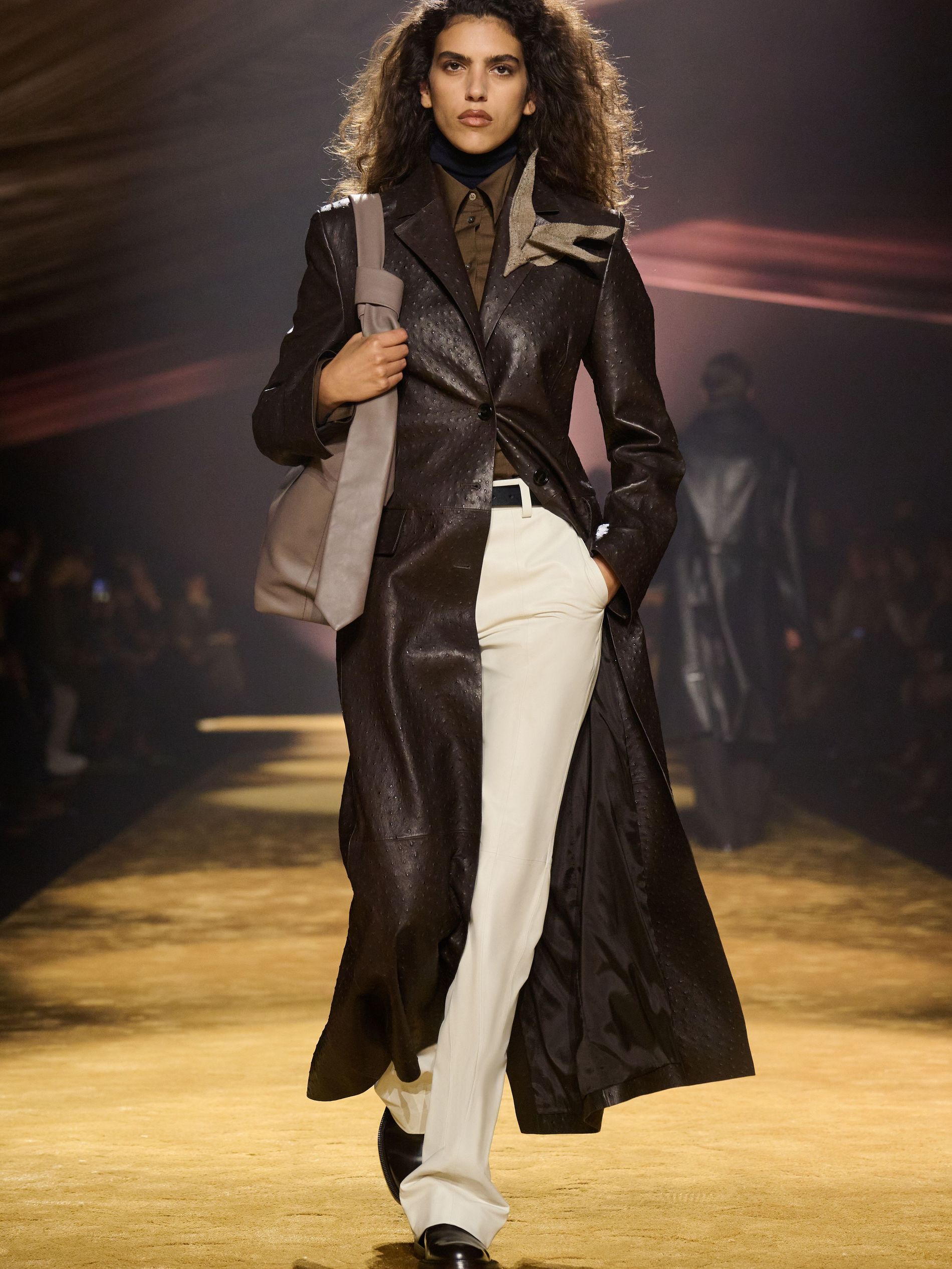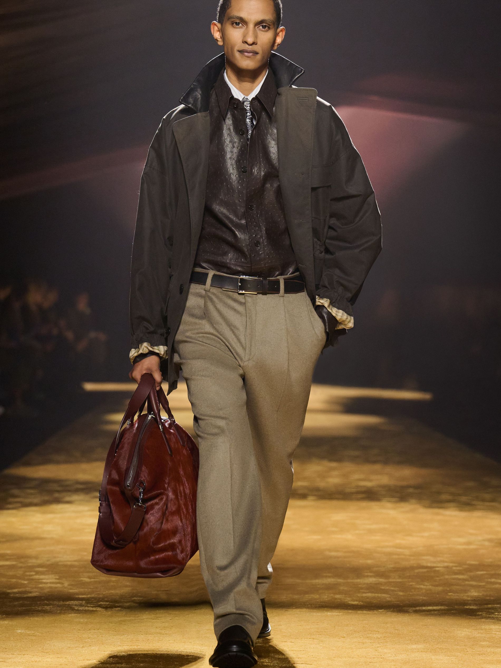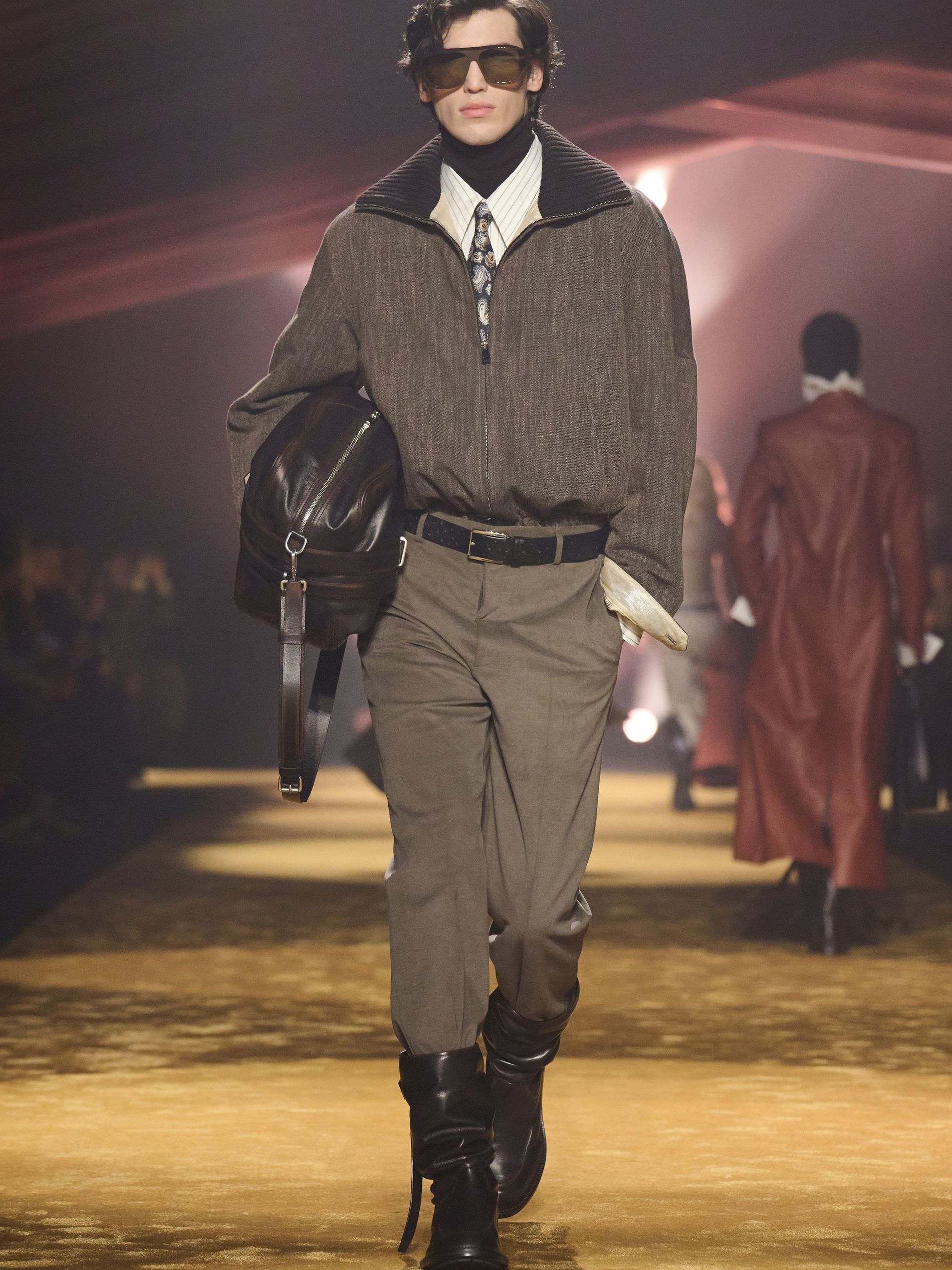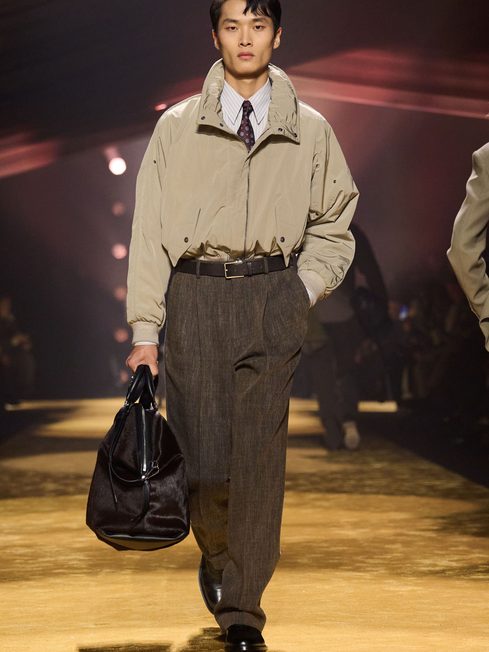 Within this palpable mood, the spine of the show was tailoring. “In tailoring – whether a three-button single-breasted suit, a perfectly tailored coat, a crisp shirt, or the most elegant silk neckwear – the message on the runway is clear: it’s even more powerful when you make it your own,” said Falcioni. There were boxy three-button suits with a ’90s sobriety, double-breasted numbers cut broad through the shoulder with a subtle power surge, and trim sack shapes that felt lifted from an executive floor circa 1988 and reissued for now. “One of our key ambitions was to position tailoring within a more lifestyle-driven context, moving away from traditional office attire and aligning it with hybrid situations.” Trousers were tucked into hybrid boot-loafers – “whose silhouettes are derived from an archival men’s loafer” – and leather blousons were cinched into double-belted waists.