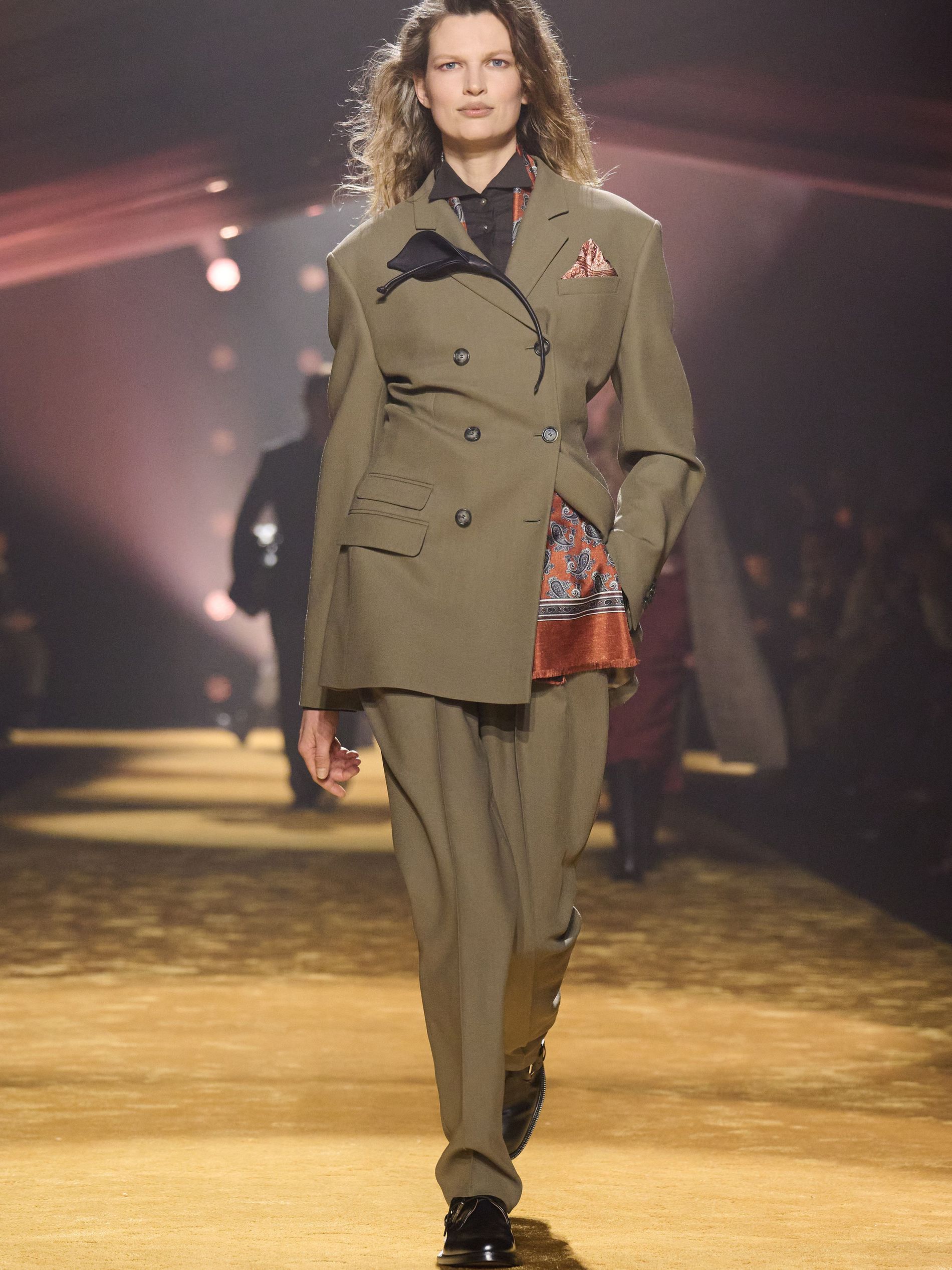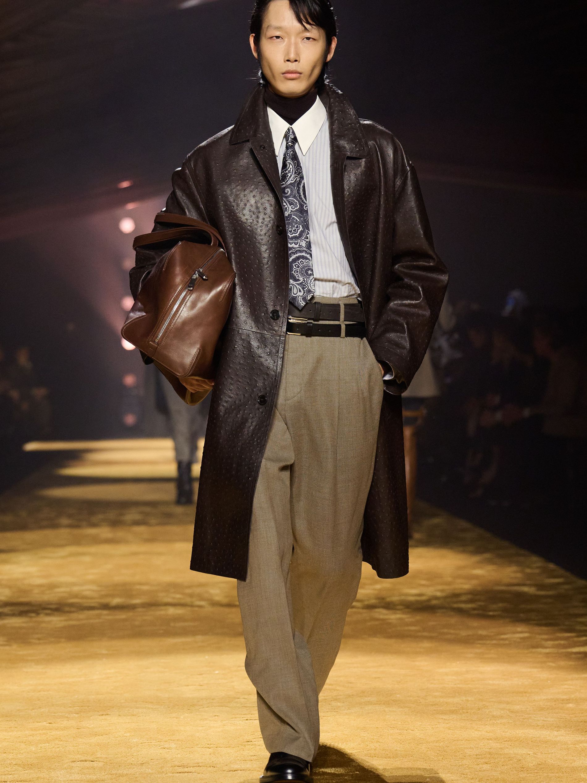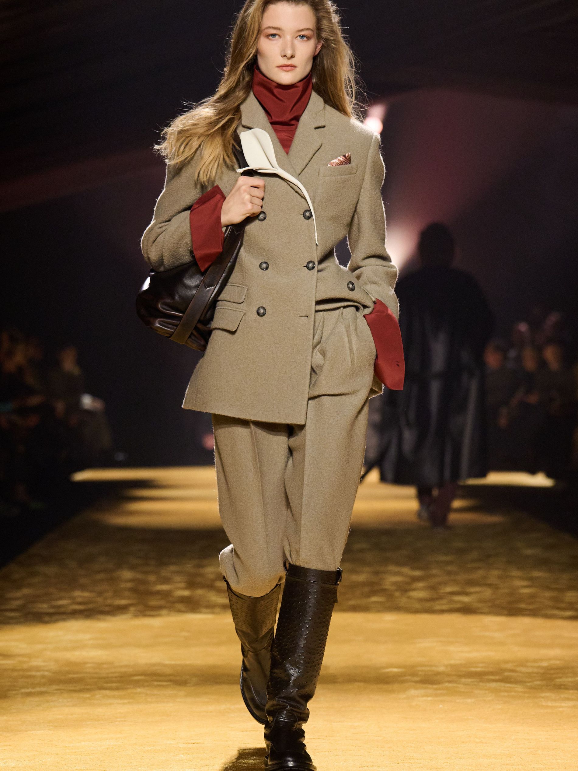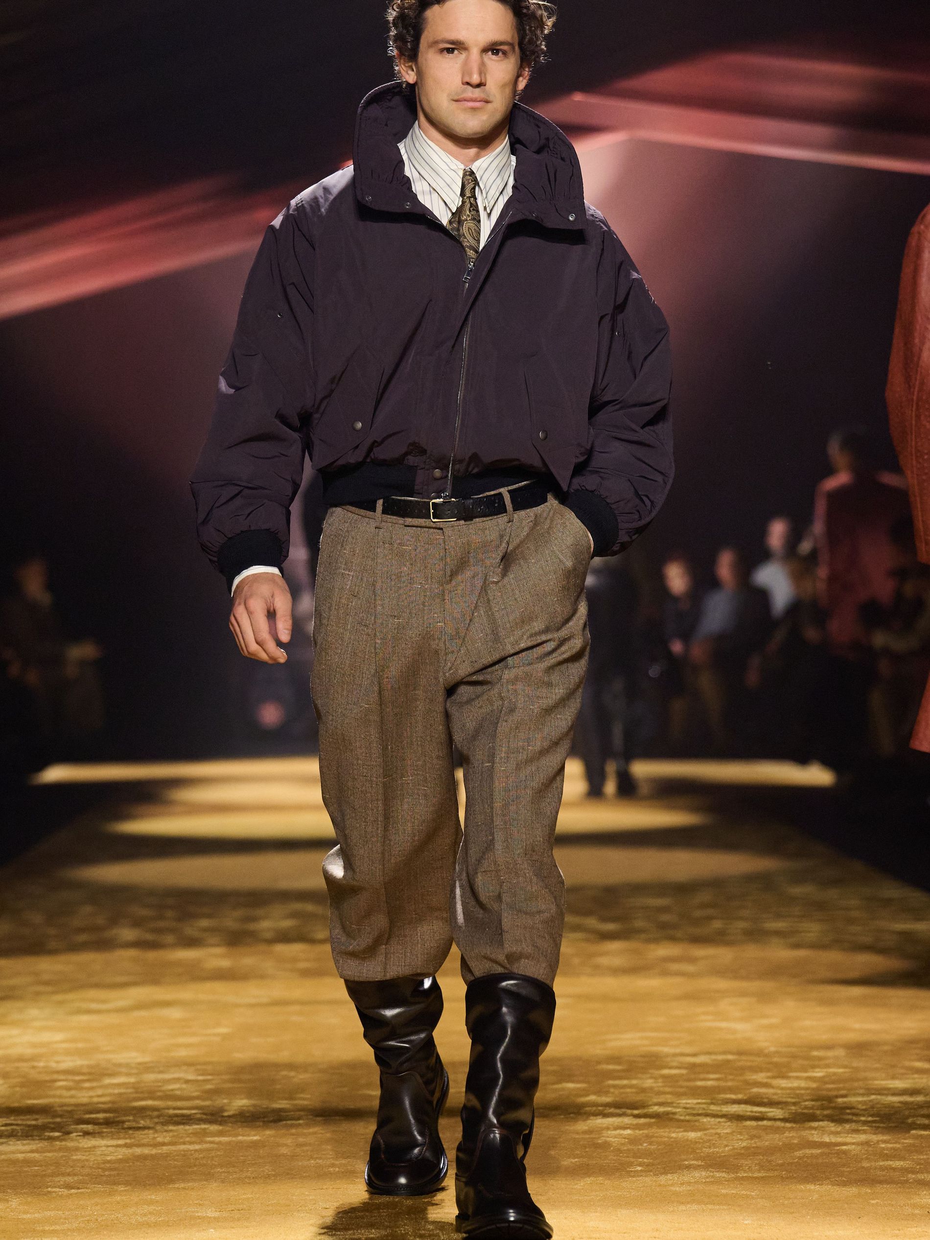 Within this palpable mood, the spine of the show was tailoring. “In tailoring – whether a three-button single-breasted suit, a perfectly tailored coat, a crisp shirt, or the most elegant silk neckwear – the message on the runway is clear: it’s even more powerful when you make it your own,” said Falcioni. There were boxy three-button suits with a ’90s sobriety, double-breasted numbers cut broad through the shoulder with a subtle power surge, and trim sack shapes that felt lifted from an executive floor circa 1988 and reissued for now. “One of our key ambitions was to position tailoring within a more lifestyle-driven context, moving away from traditional office attire and aligning it with hybrid situations.” Trousers were tucked into hybrid boot-loafers – “whose silhouettes are derived from an archival men’s loafer” – and leather blousons were cinched into double-belted waists.