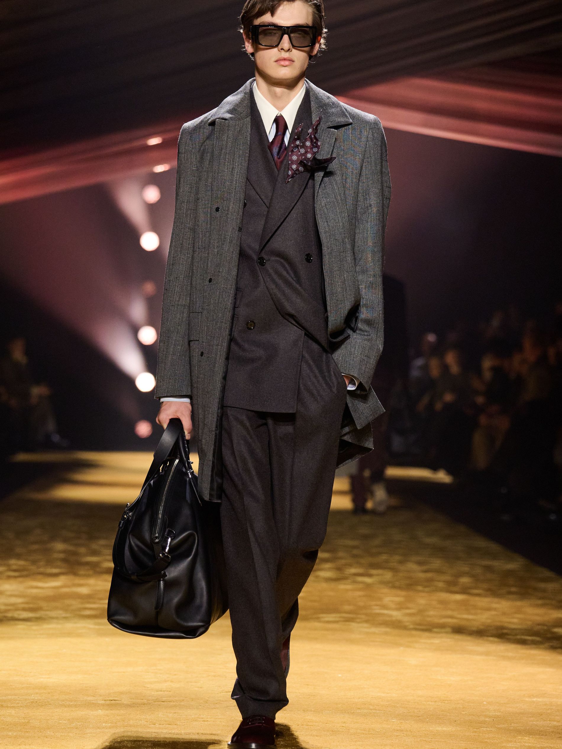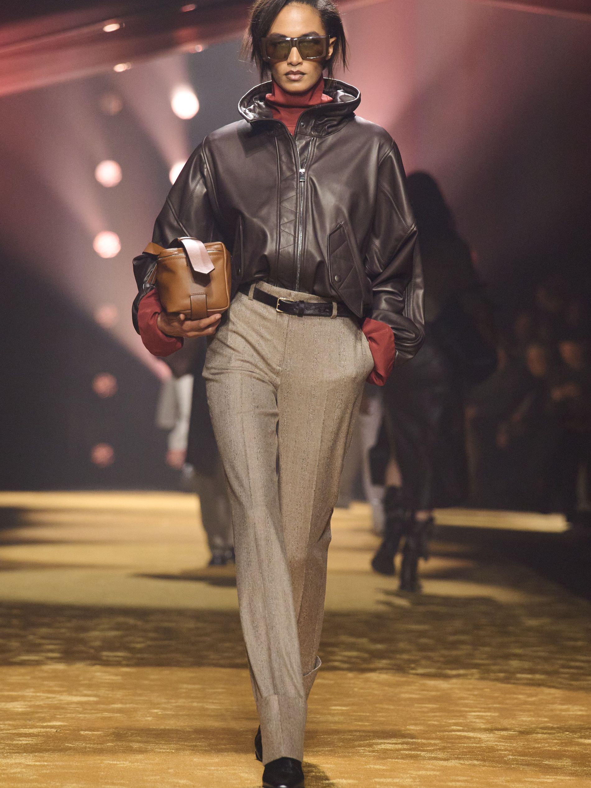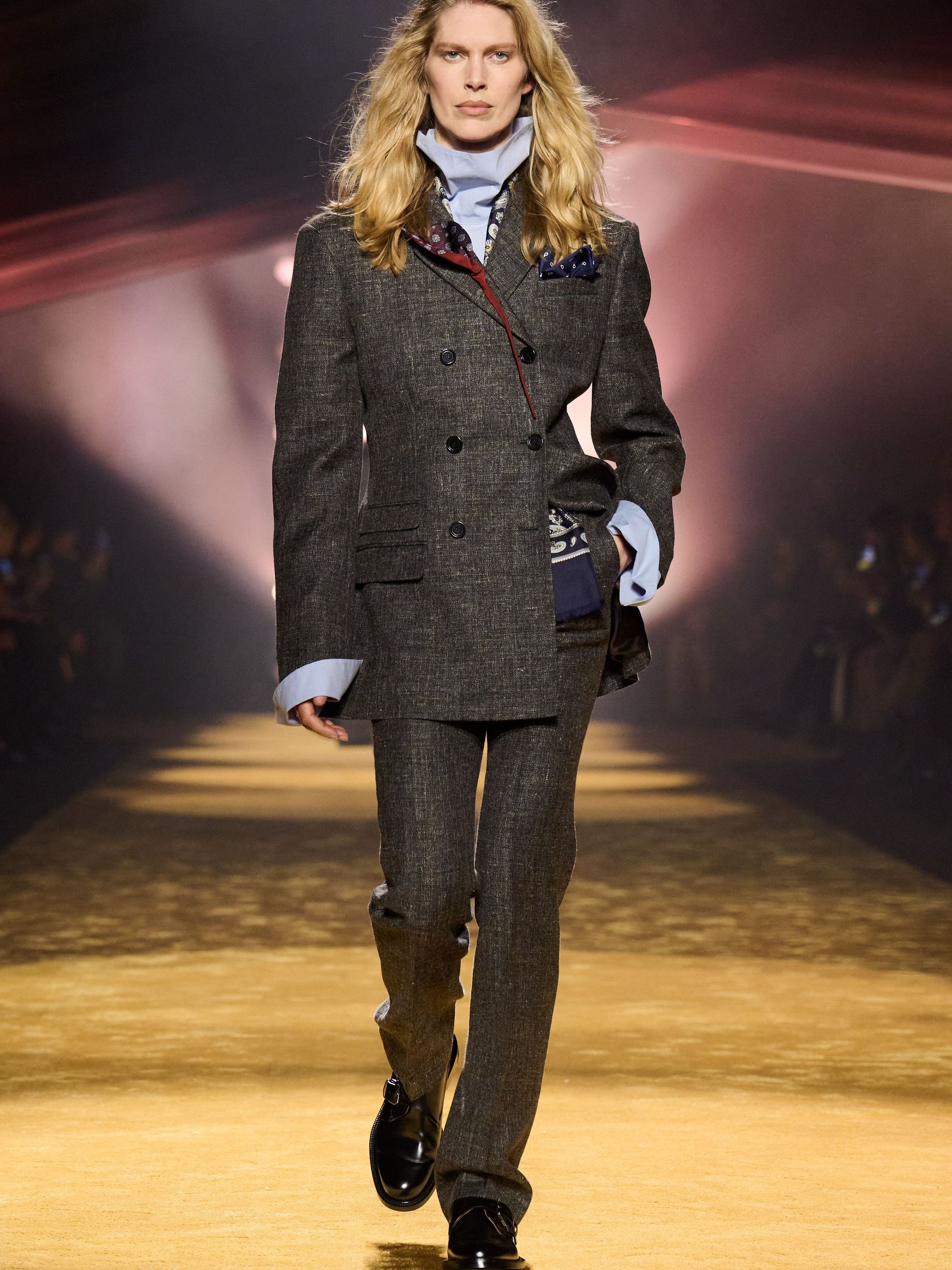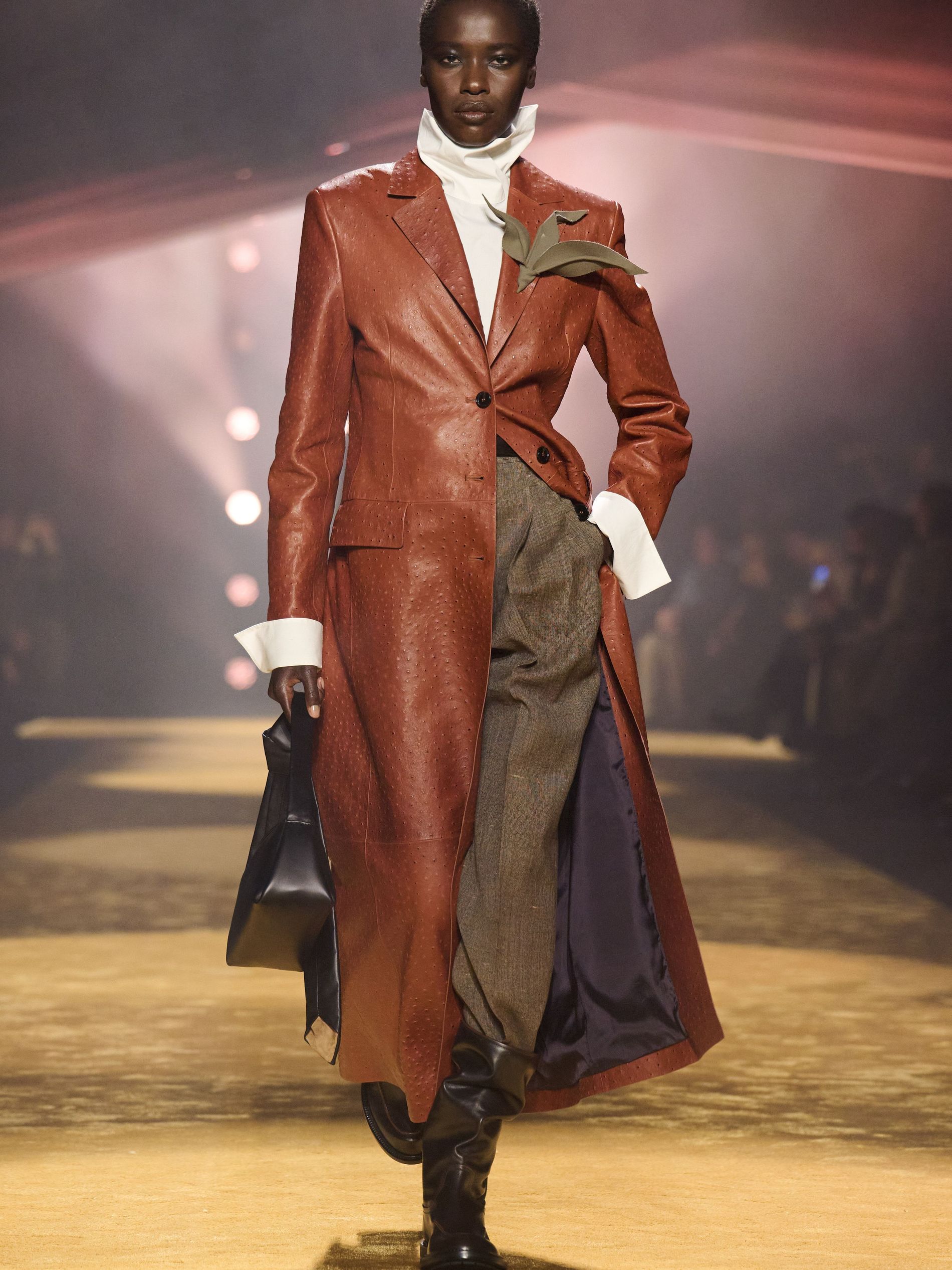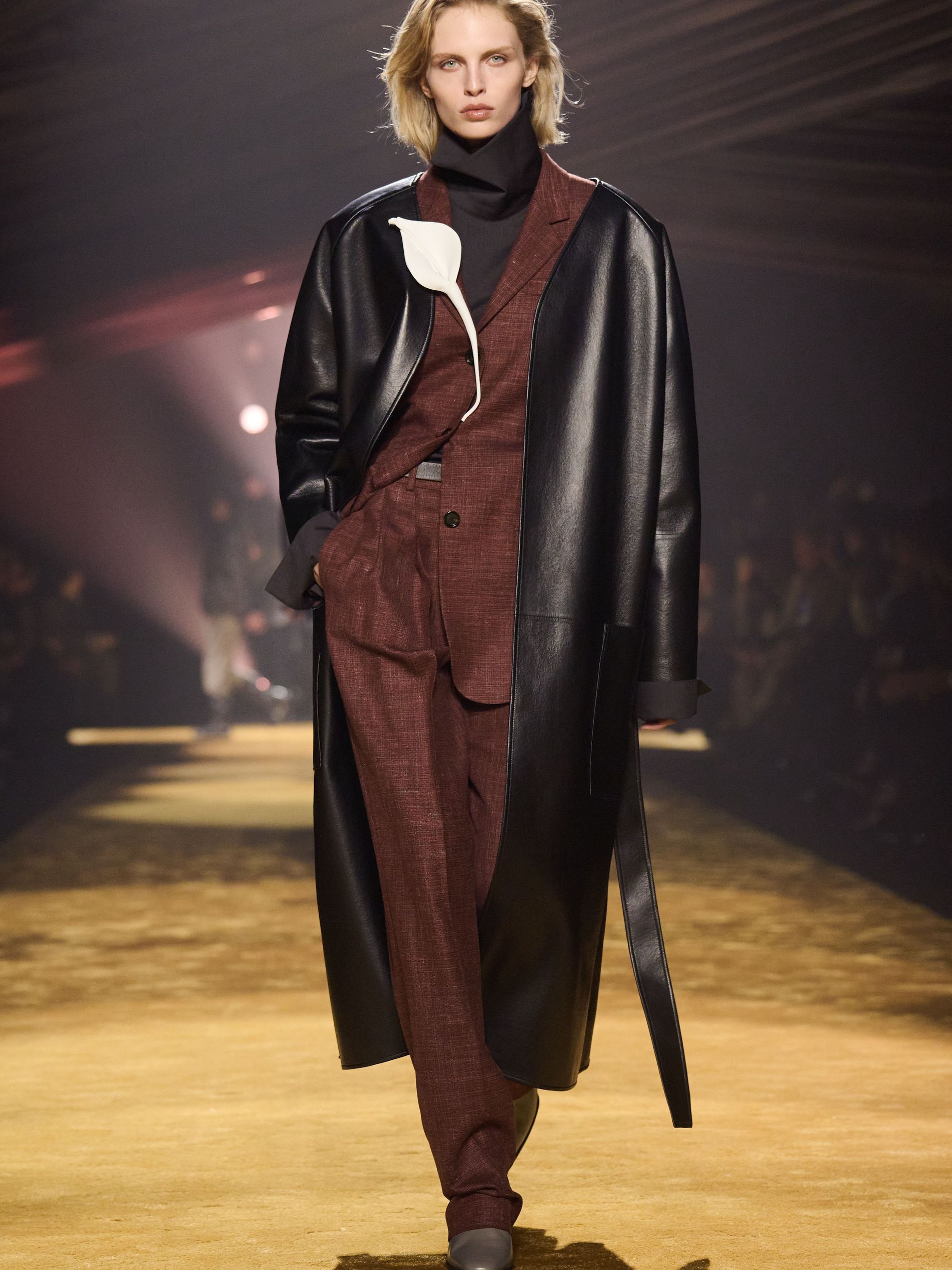 Within this palpable mood, the spine of the show was tailoring. “In tailoring – whether a three-button single-breasted suit, a perfectly tailored coat, a crisp shirt, or the most elegant silk neckwear – the message on the runway is clear: it’s even more powerful when you make it your own,” said Falcioni. There were boxy three-button suits with a ’90s sobriety, double-breasted numbers cut broad through the shoulder with a subtle power surge, and trim sack shapes that felt lifted from an executive floor circa 1988 and reissued for now. “One of our key ambitions was to position tailoring within a more lifestyle-driven context, moving away from traditional office attire and aligning it with hybrid situations.” Trousers were tucked into hybrid boot-loafers – “whose silhouettes are derived from an archival men’s loafer” – and leather blousons were cinched into double-belted waists.