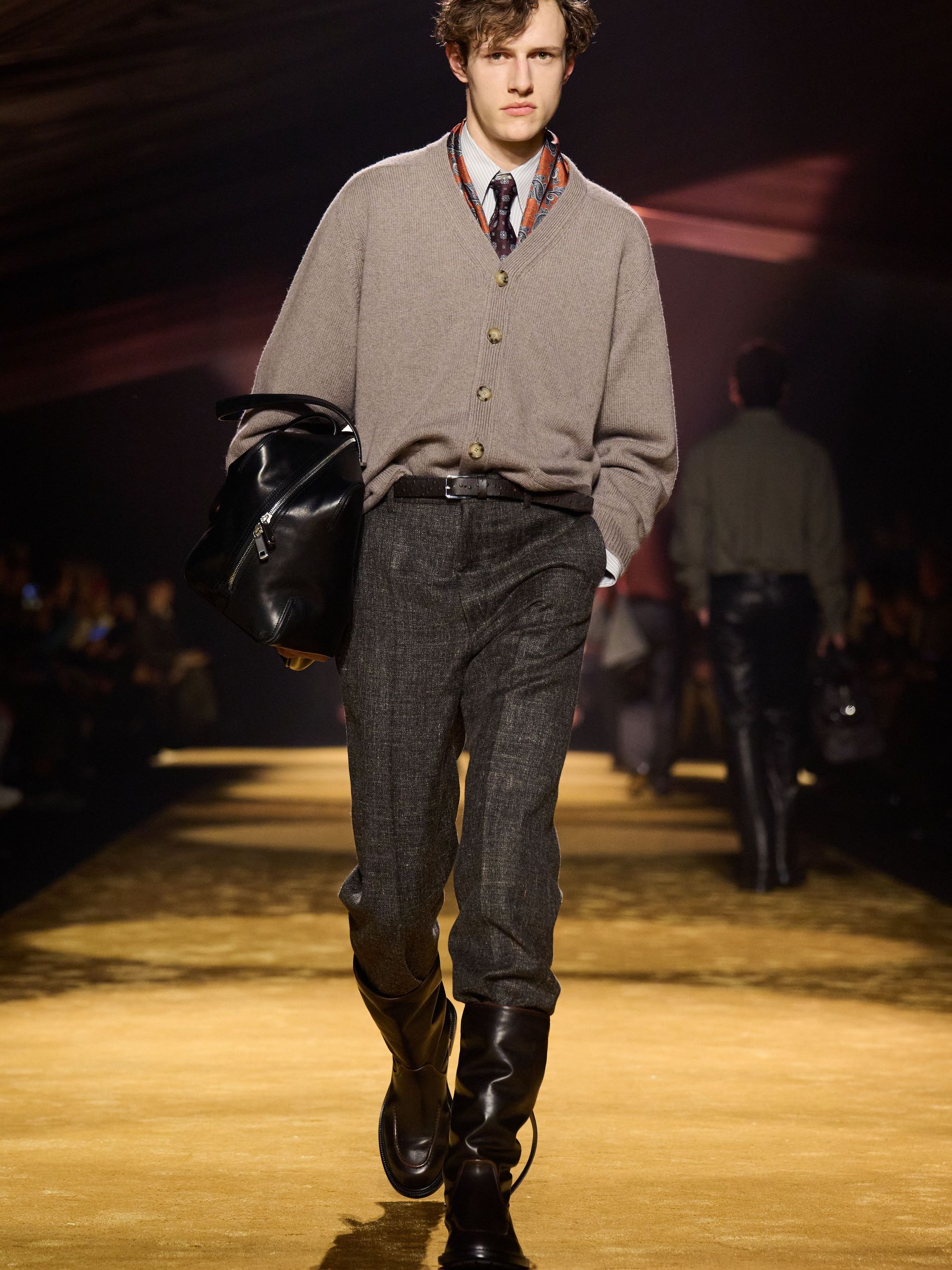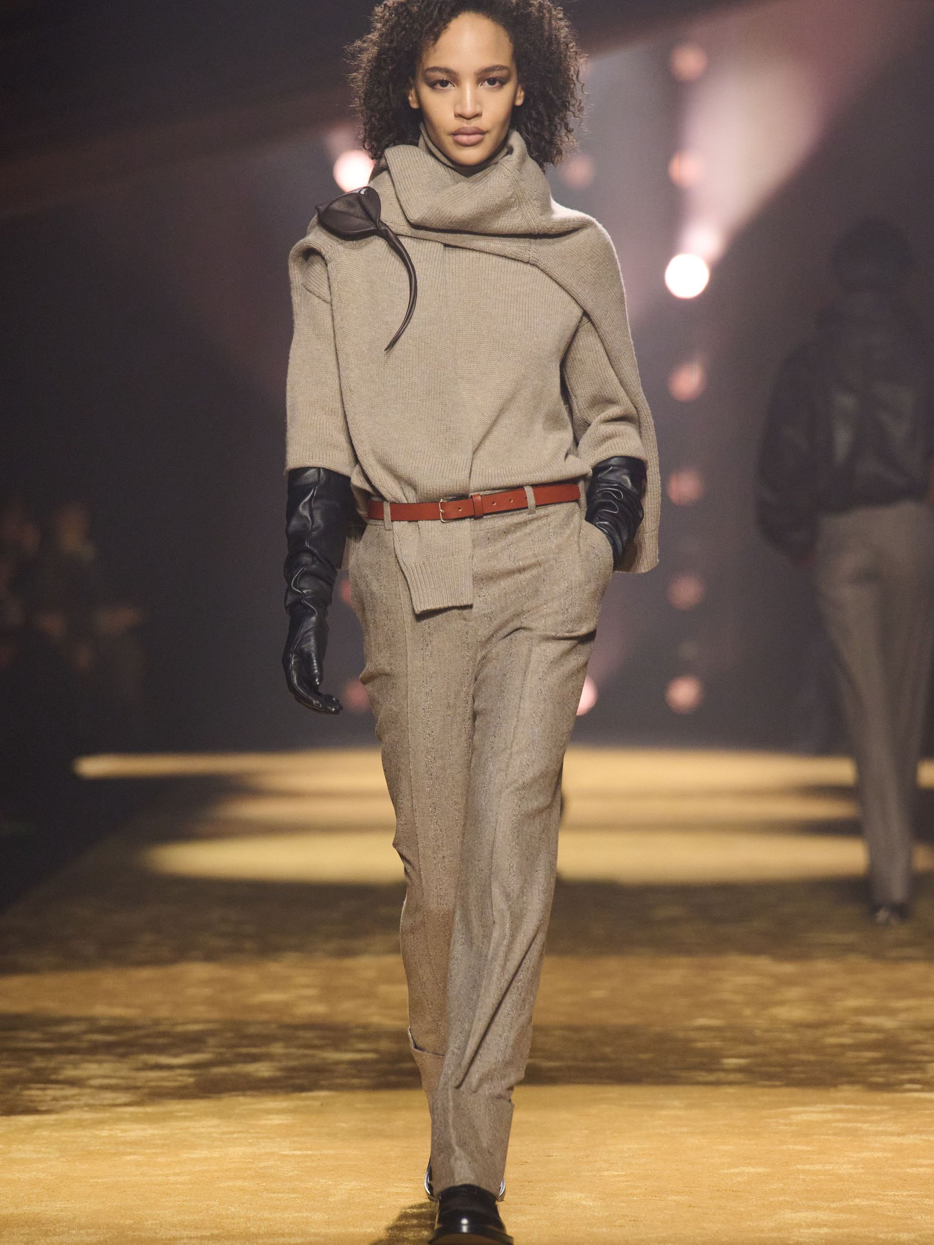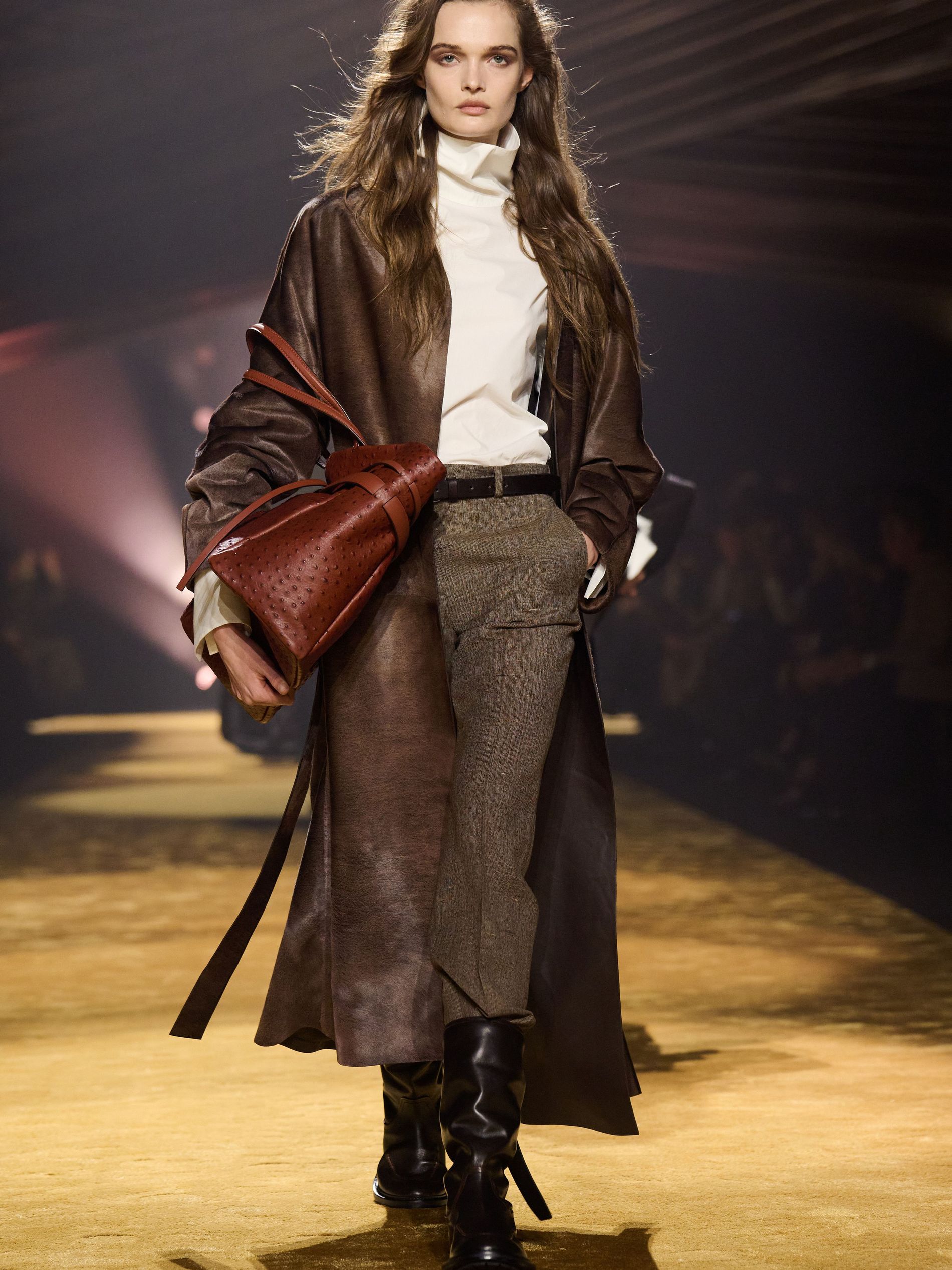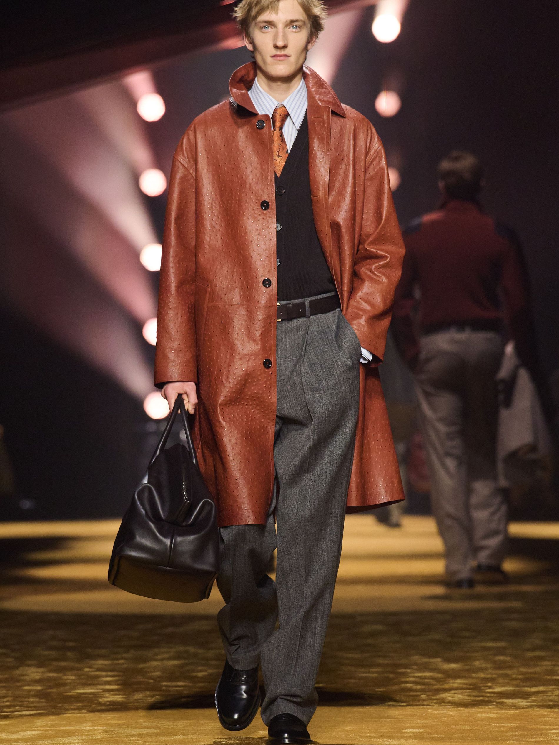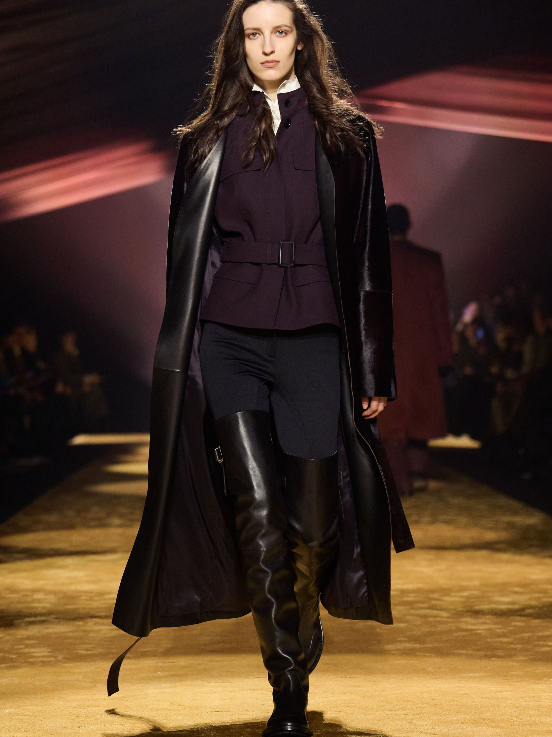 Within this palpable mood, the spine of the show was tailoring. “In tailoring – whether a three-button single-breasted suit, a perfectly tailored coat, a crisp shirt, or the most elegant silk neckwear – the message on the runway is clear: it’s even more powerful when you make it your own,” said Falcioni. There were boxy three-button suits with a ’90s sobriety, double-breasted numbers cut broad through the shoulder with a subtle power surge, and trim sack shapes that felt lifted from an executive floor circa 1988 and reissued for now. “One of our key ambitions was to position tailoring within a more lifestyle-driven context, moving away from traditional office attire and aligning it with hybrid situations.” Trousers were tucked into hybrid boot-loafers – “whose silhouettes are derived from an archival men’s loafer” – and leather blousons were cinched into double-belted waists.