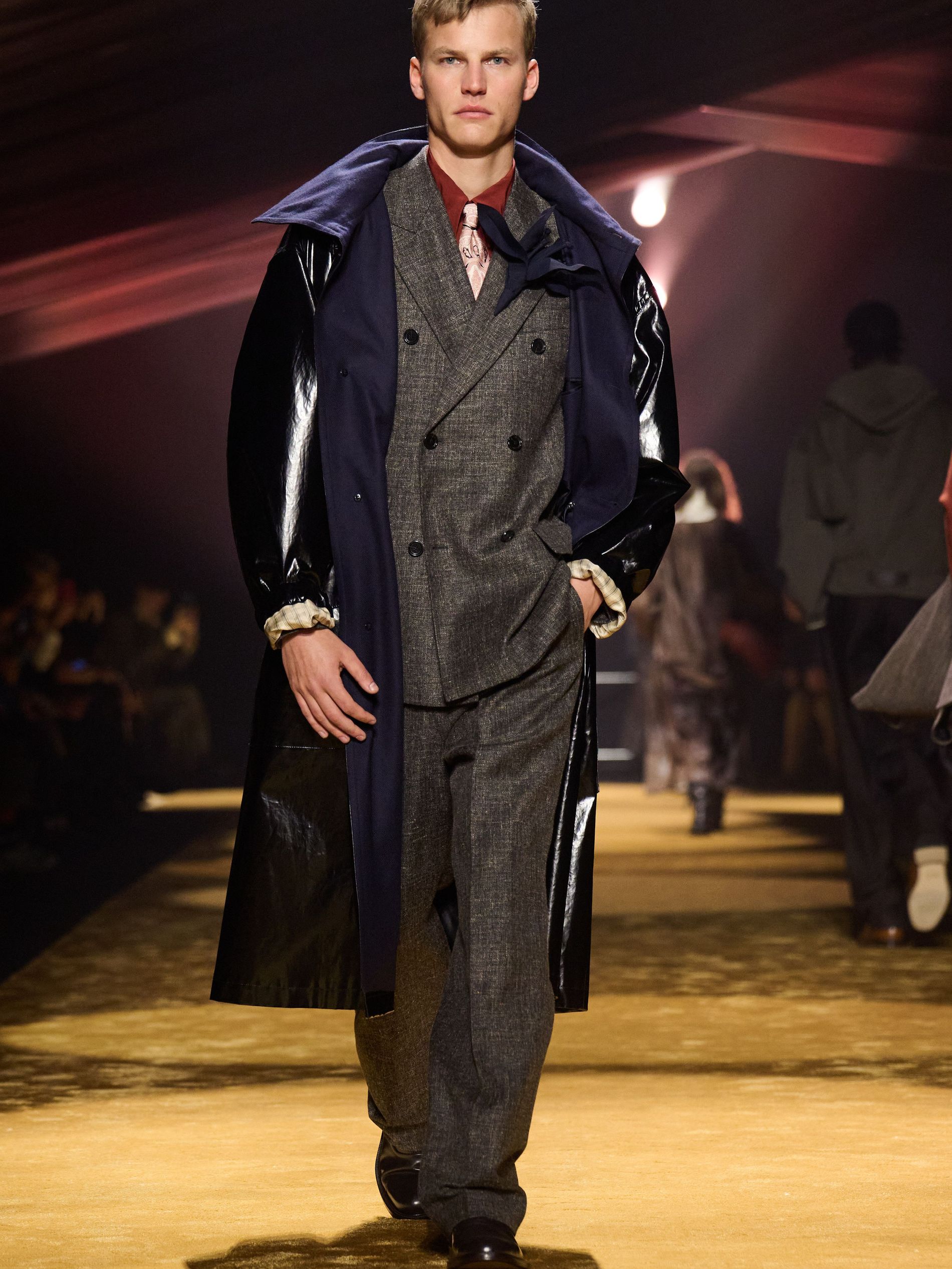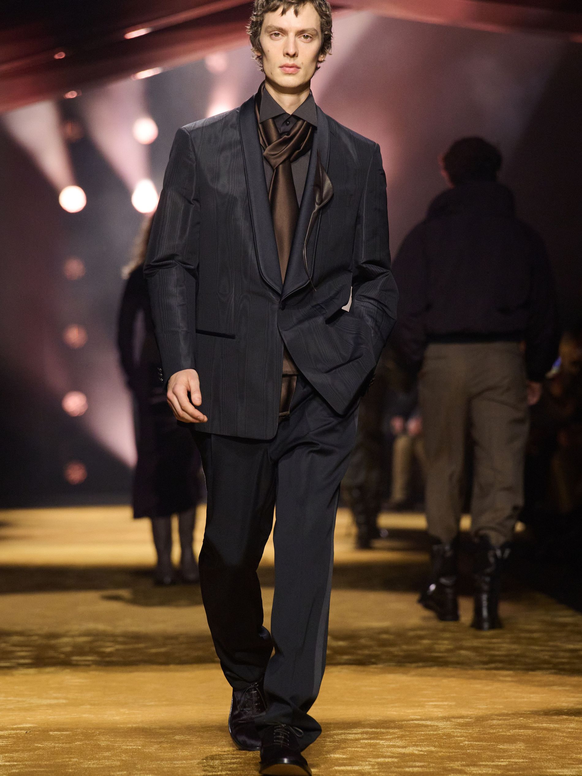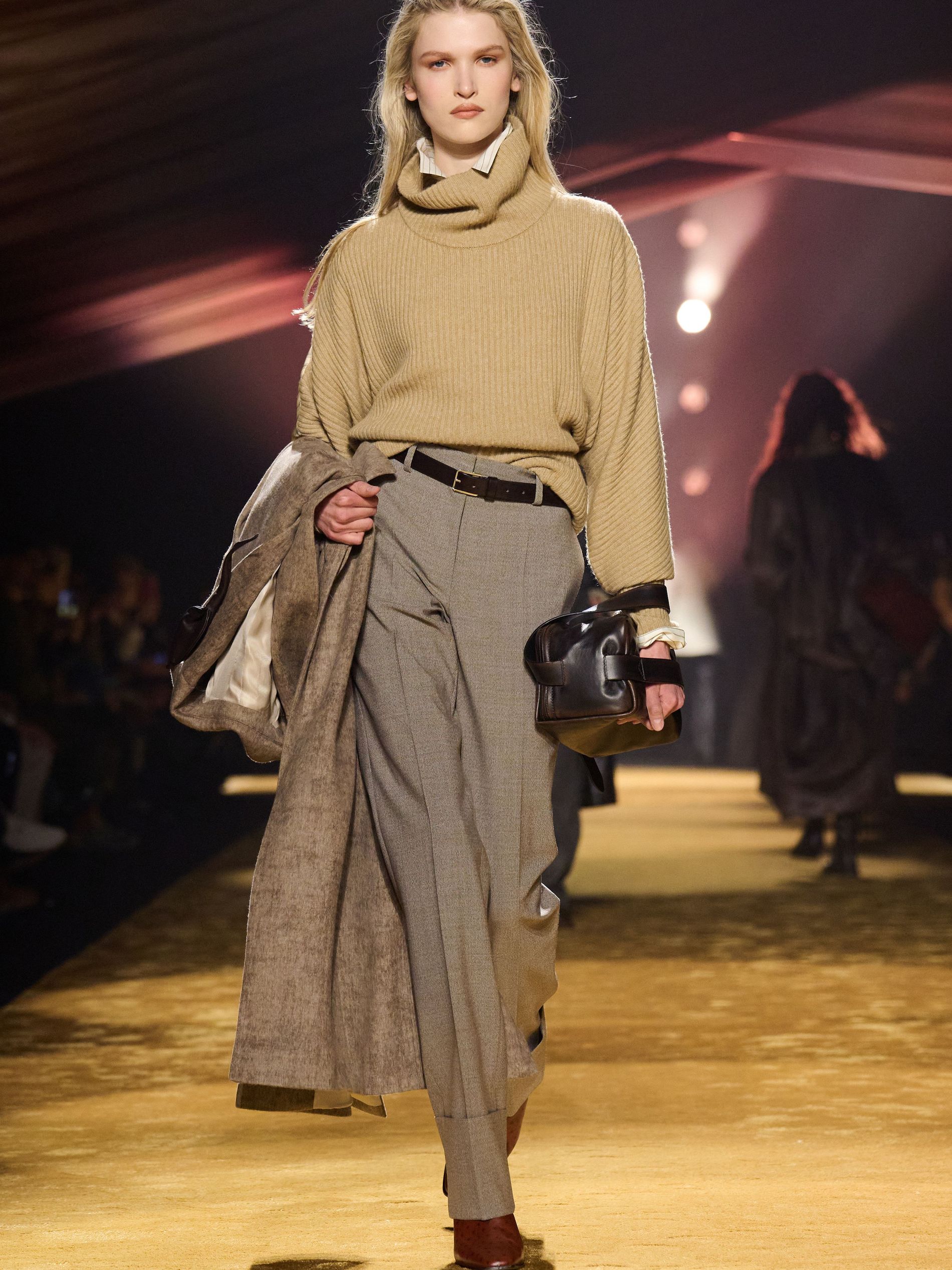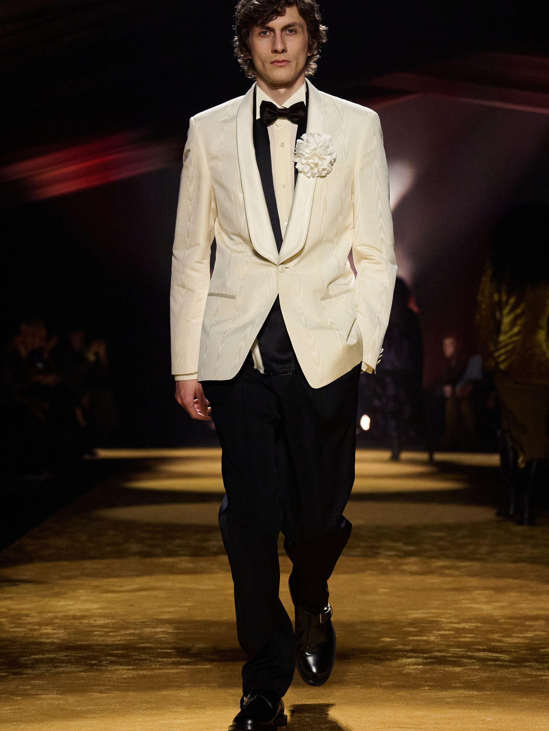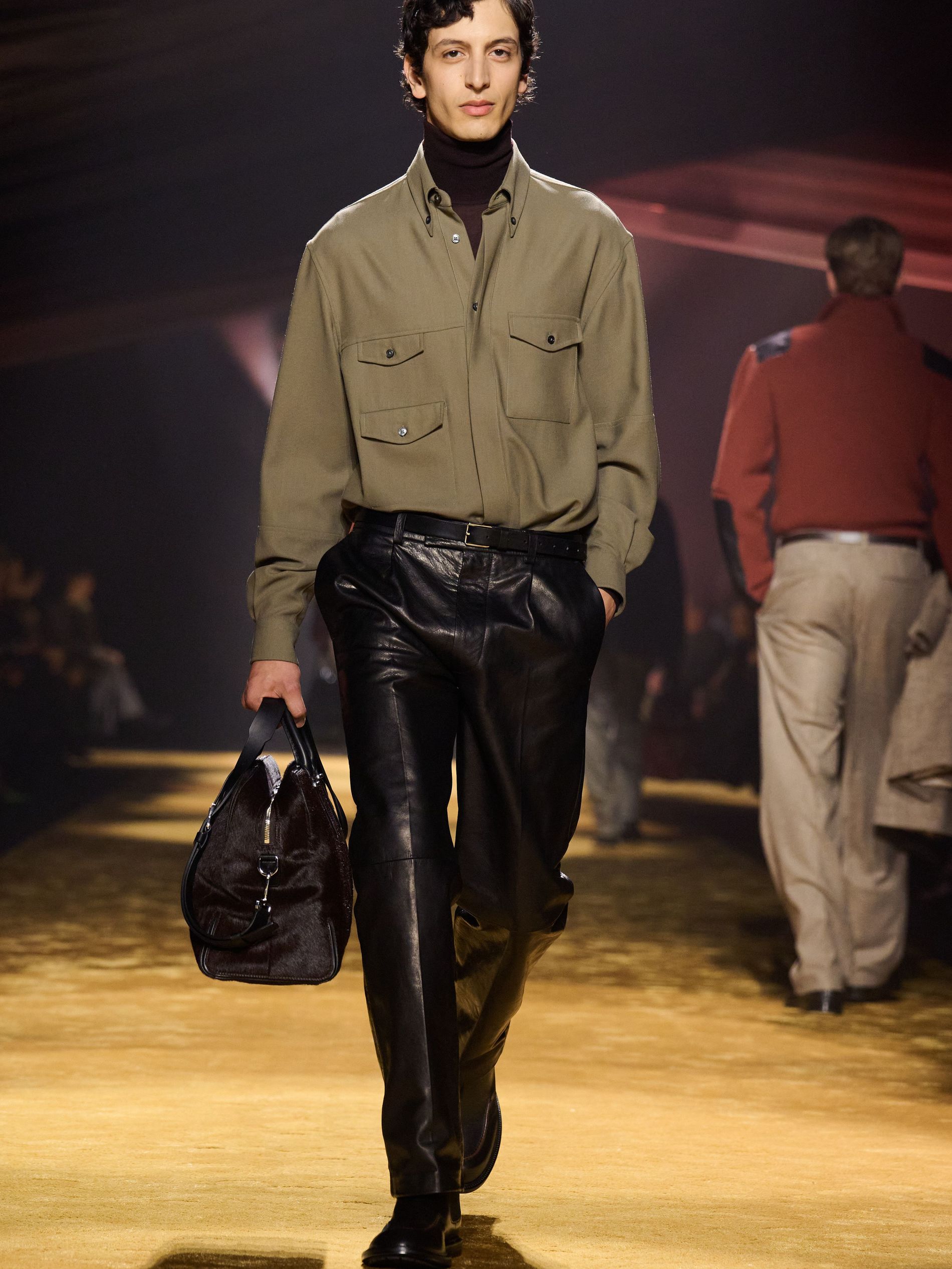Within this palpable mood, the spine of the show was tailoring. “In tailoring – whether a three-button single-breasted suit, a perfectly tailored coat, a crisp shirt, or the most elegant silk neckwear – the message on the runway is clear: it’s even more powerful when you make it your own,” said Falcioni. There were boxy three-button suits with a ’90s sobriety, double-breasted numbers cut broad through the shoulder with a subtle power surge, and trim sack shapes that felt lifted from an executive floor circa 1988 and reissued for now. “One of our key ambitions was to position tailoring within a more lifestyle-driven context, moving away from traditional office attire and aligning it with hybrid situations.” Trousers were tucked into hybrid boot-loafers – “whose silhouettes are derived from an archival men’s loafer” – and leather blousons were cinched into double-belted waists.