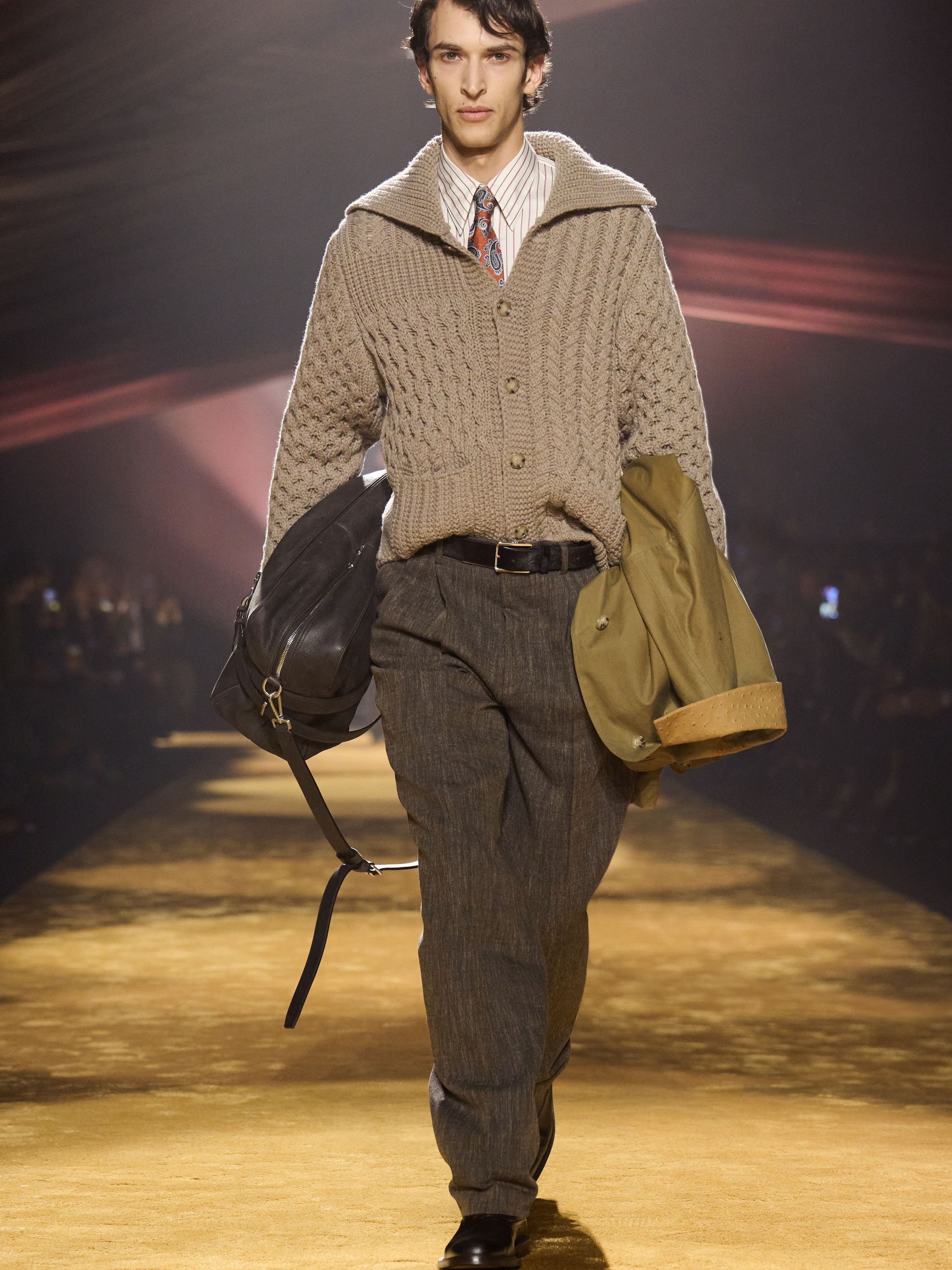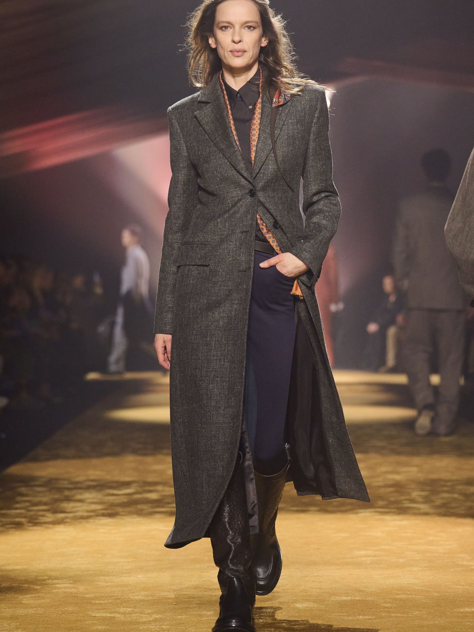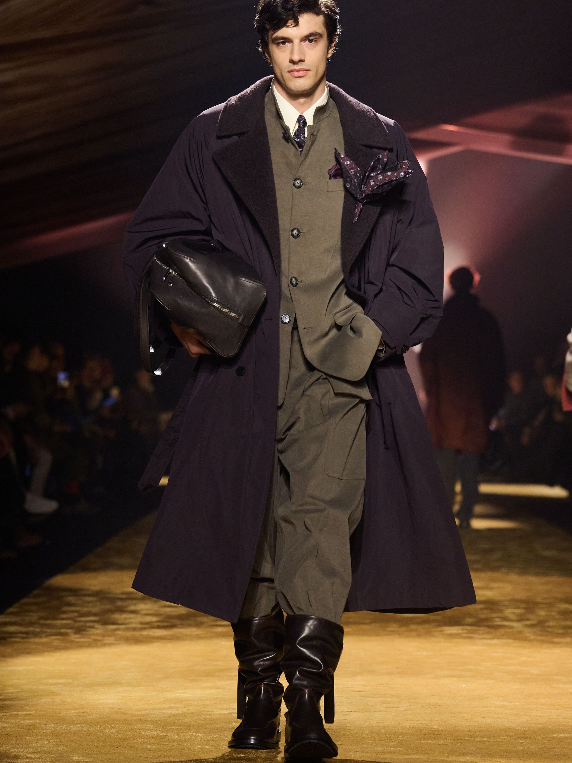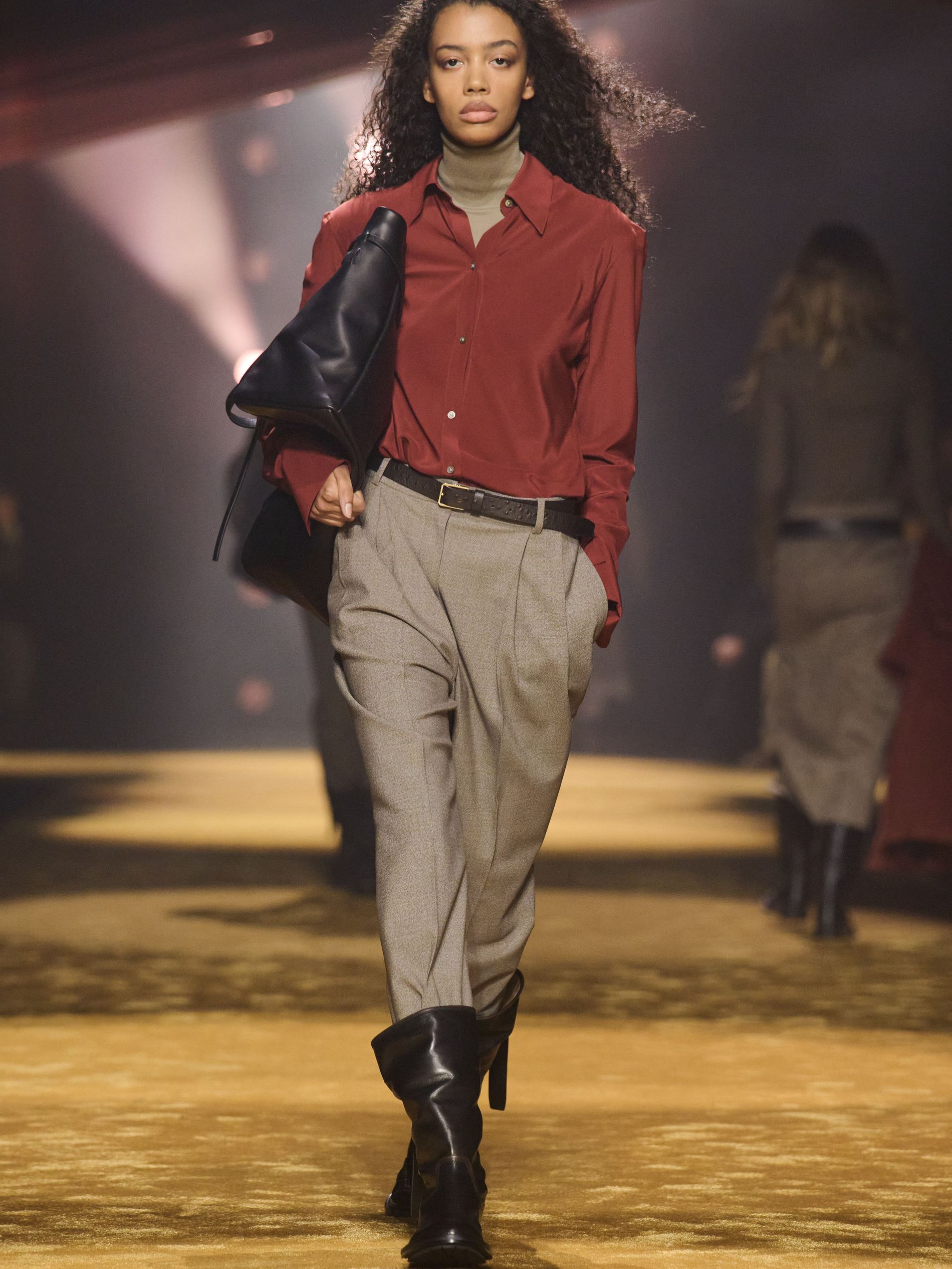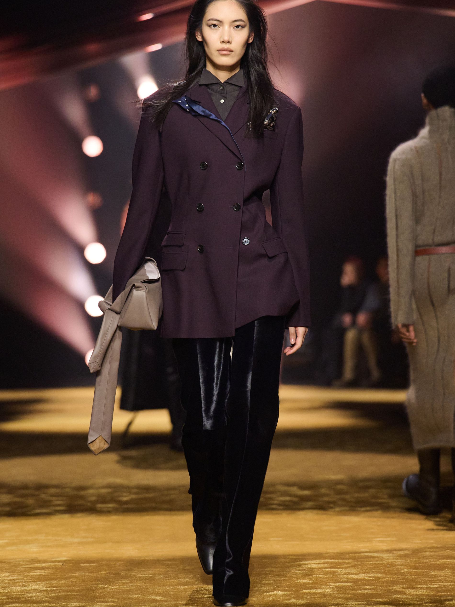 Within this palpable mood, the spine of the show was tailoring. “In tailoring – whether a three-button single-breasted suit, a perfectly tailored coat, a crisp shirt, or the most elegant silk neckwear – the message on the runway is clear: it’s even more powerful when you make it your own,” said Falcioni. There were boxy three-button suits with a ’90s sobriety, double-breasted numbers cut broad through the shoulder with a subtle power surge, and trim sack shapes that felt lifted from an executive floor circa 1988 and reissued for now. “One of our key ambitions was to position tailoring within a more lifestyle-driven context, moving away from traditional office attire and aligning it with hybrid situations.” Trousers were tucked into hybrid boot-loafers – “whose silhouettes are derived from an archival men’s loafer” – and leather blousons were cinched into double-belted waists.