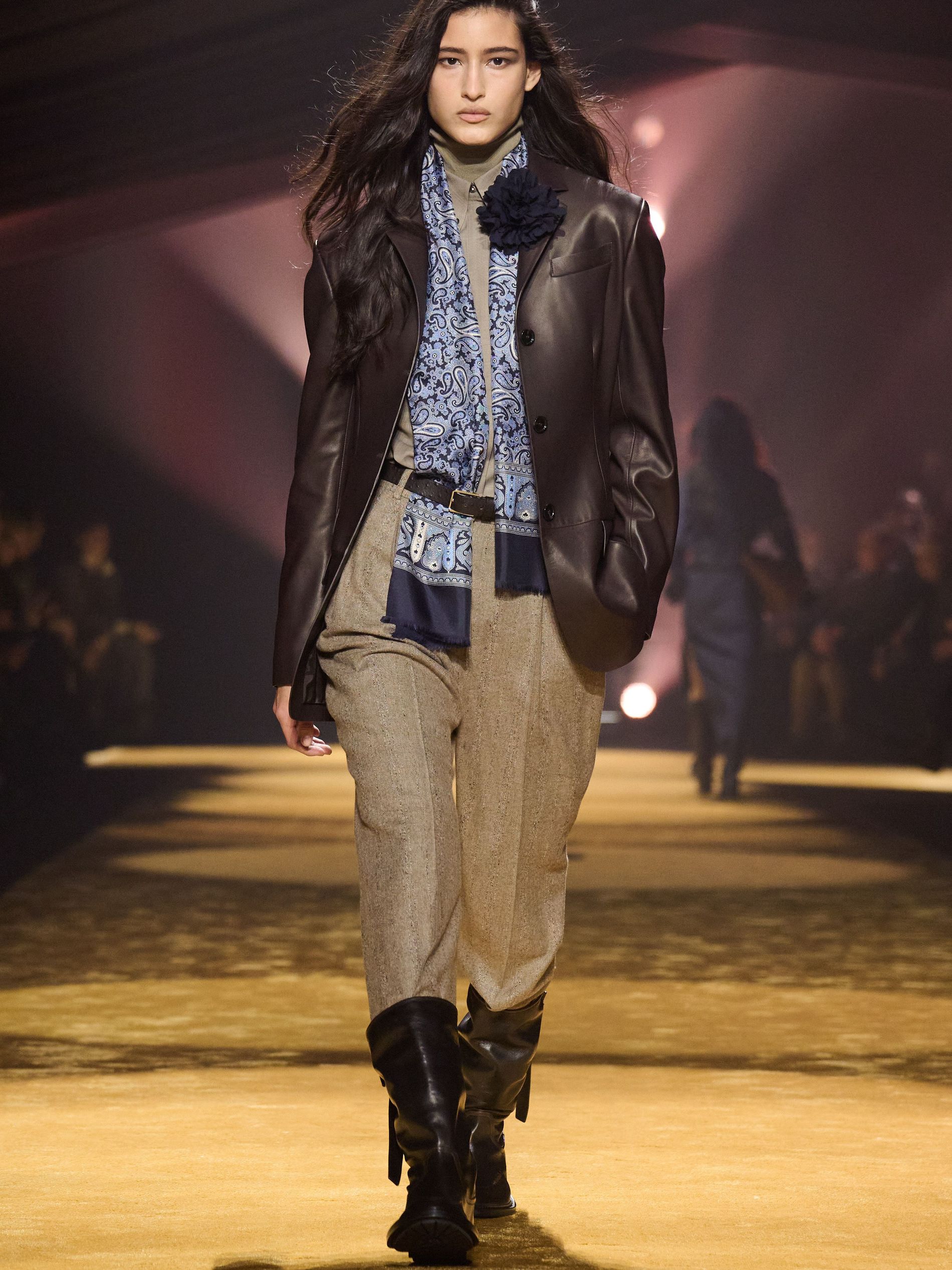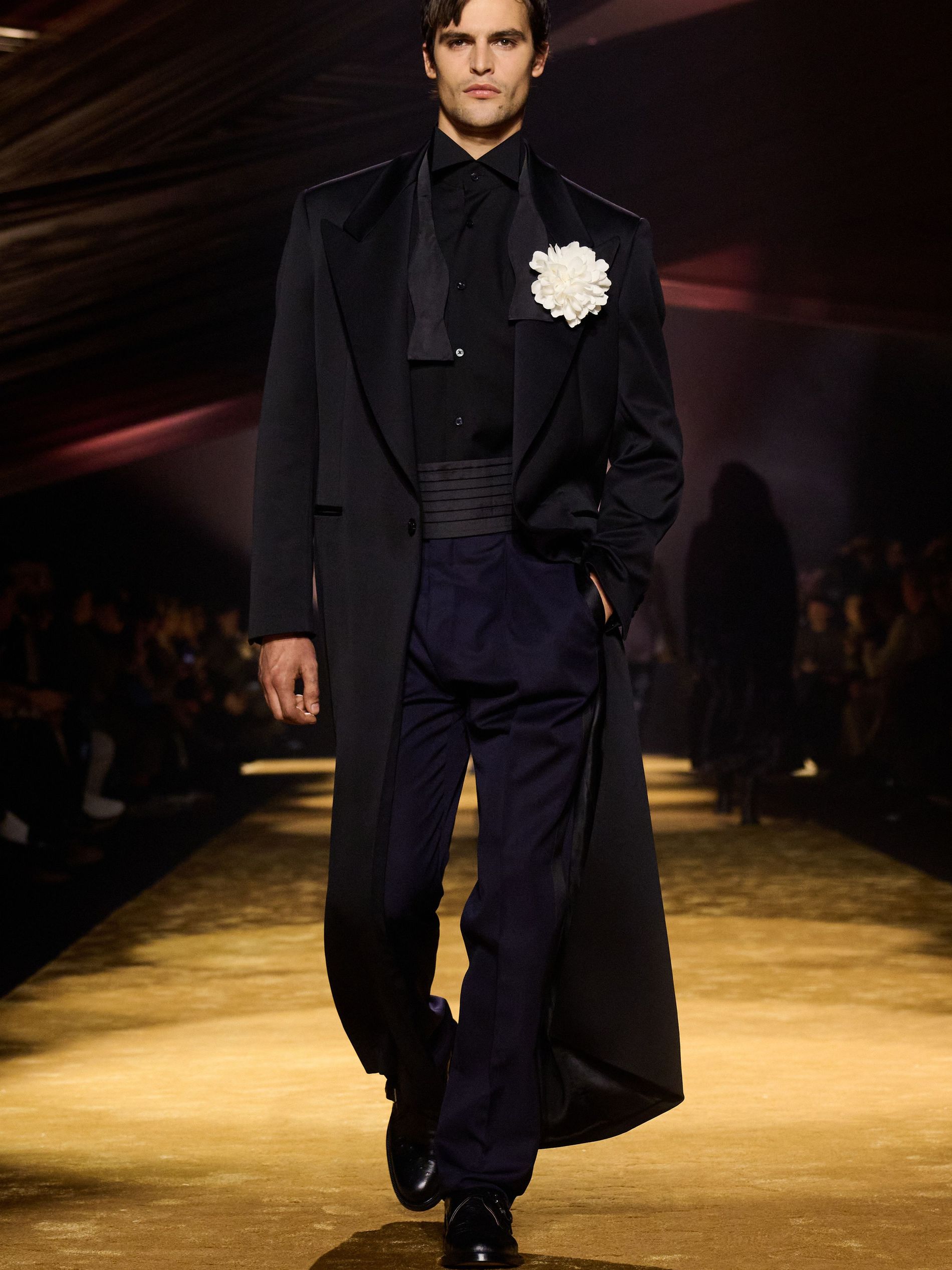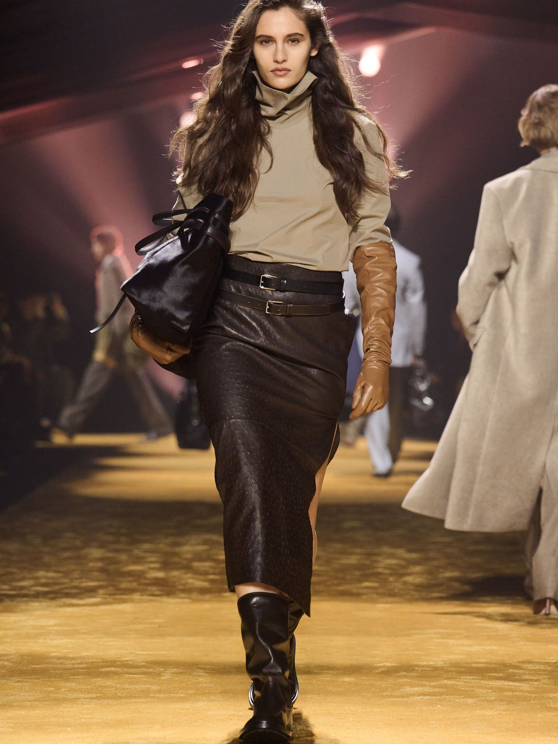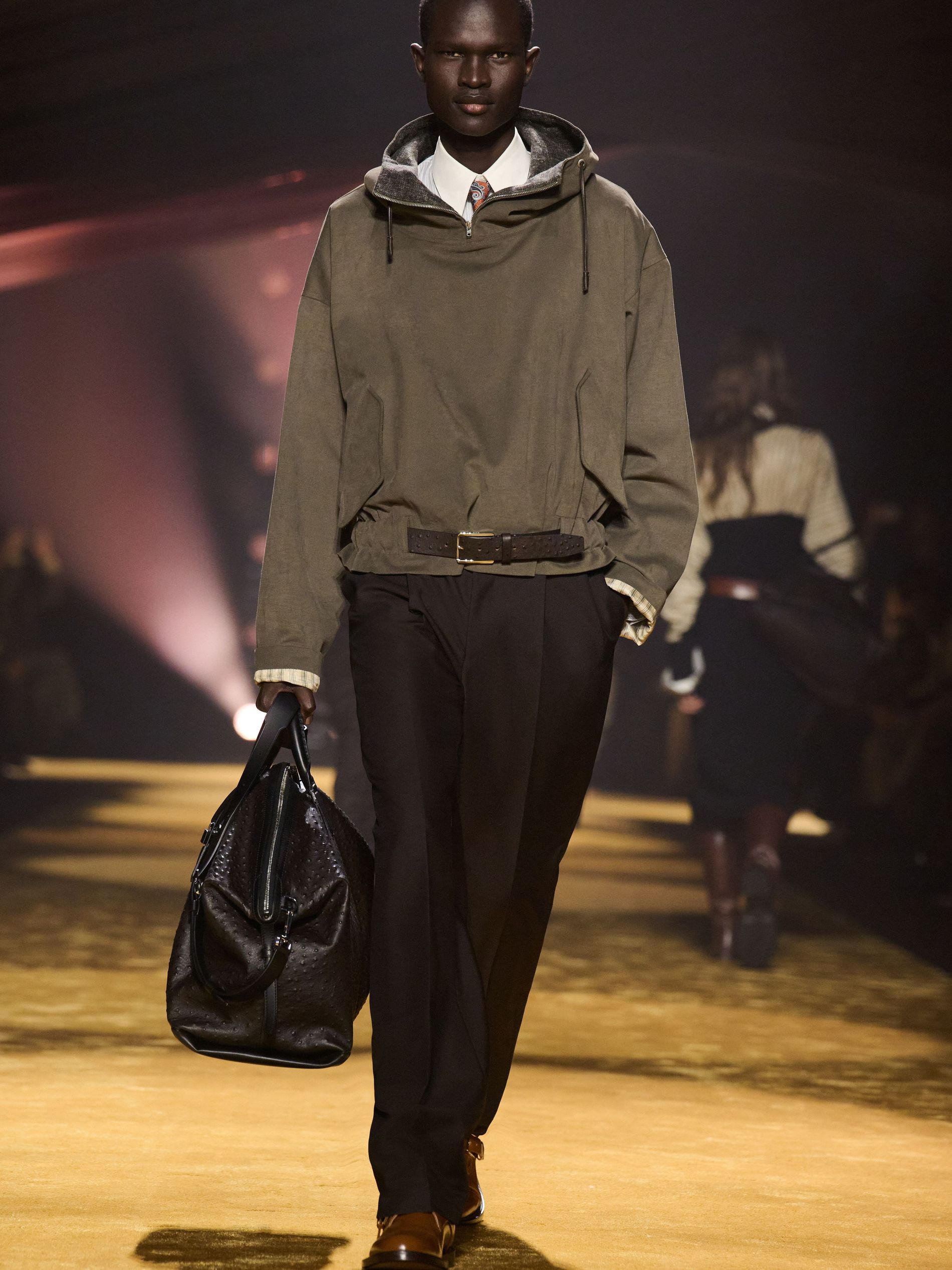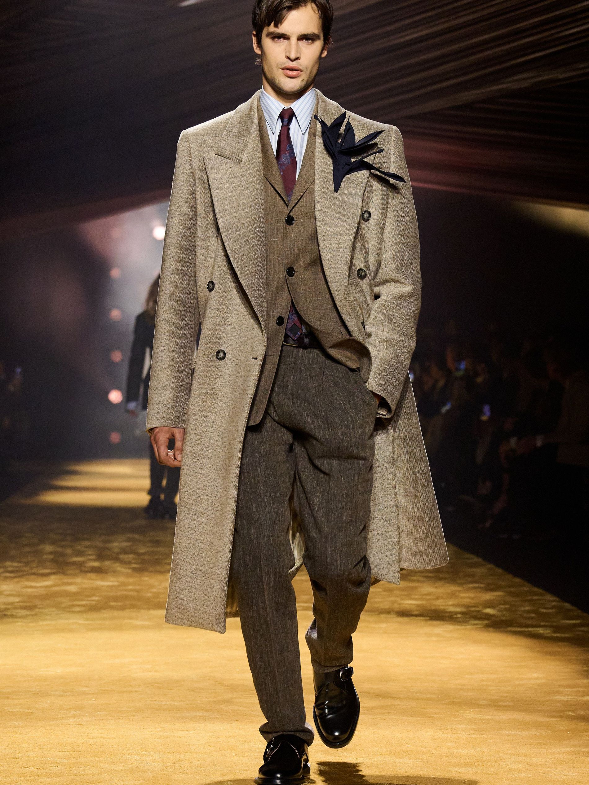Within this palpable mood, the spine of the show was tailoring. “In tailoring – whether a three-button single-breasted suit, a perfectly tailored coat, a crisp shirt, or the most elegant silk neckwear – the message on the runway is clear: it’s even more powerful when you make it your own,” said Falcioni. There were boxy three-button suits with a ’90s sobriety, double-breasted numbers cut broad through the shoulder with a subtle power surge, and trim sack shapes that felt lifted from an executive floor circa 1988 and reissued for now. “One of our key ambitions was to position tailoring within a more lifestyle-driven context, moving away from traditional office attire and aligning it with hybrid situations.” Trousers were tucked into hybrid boot-loafers – “whose silhouettes are derived from an archival men’s loafer” – and leather blousons were cinched into double-belted waists.