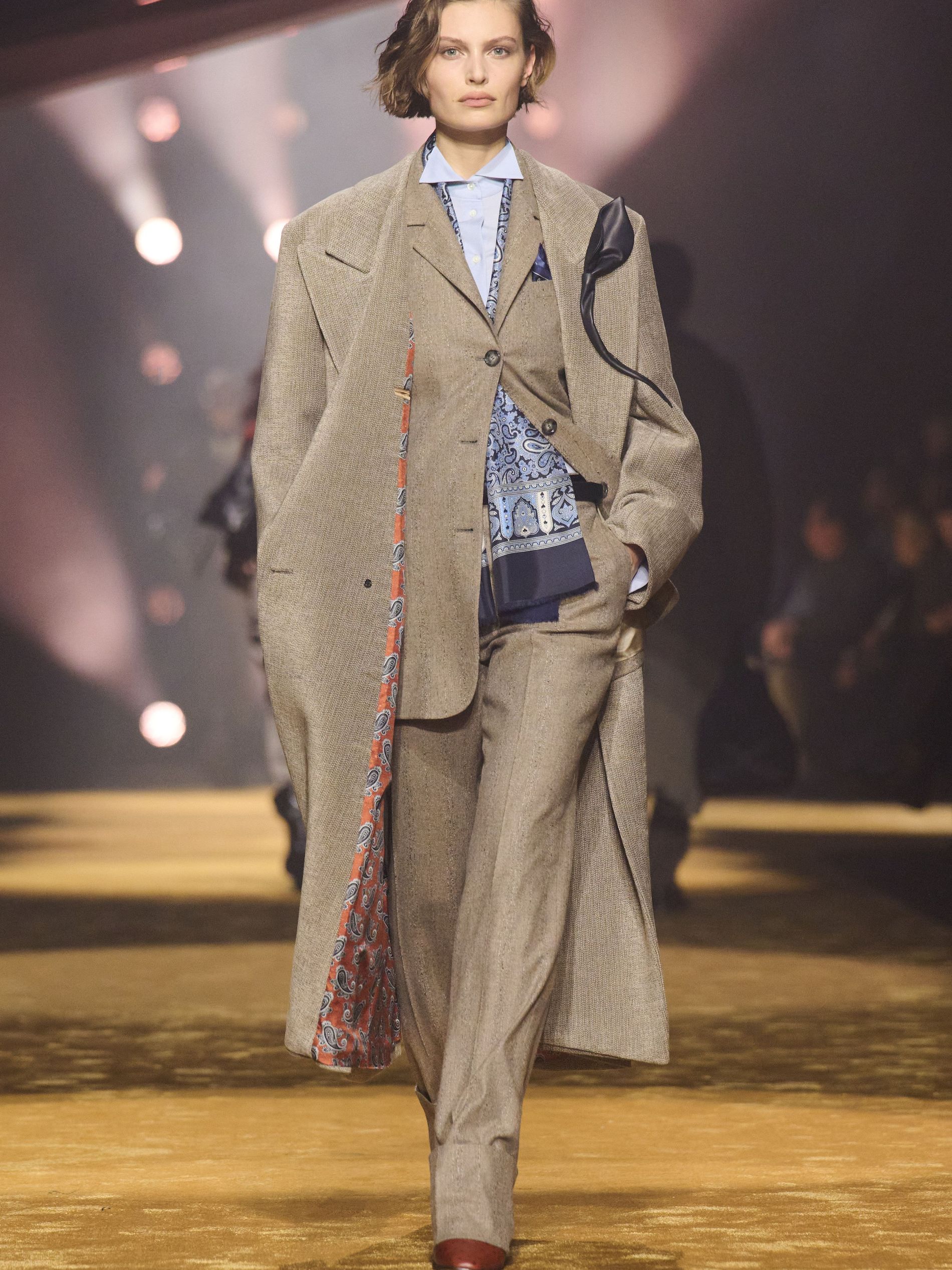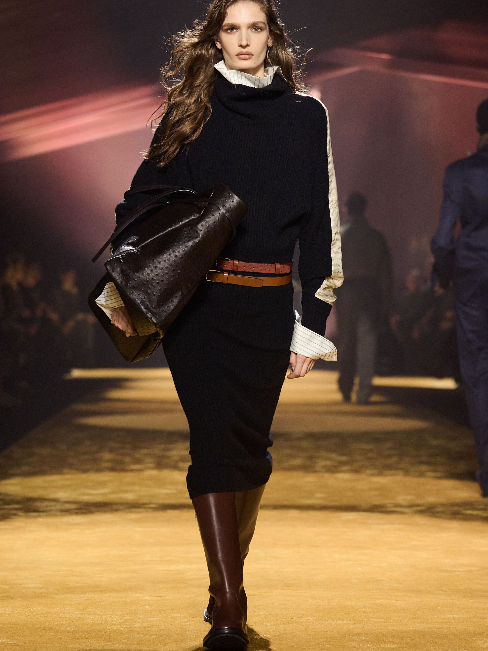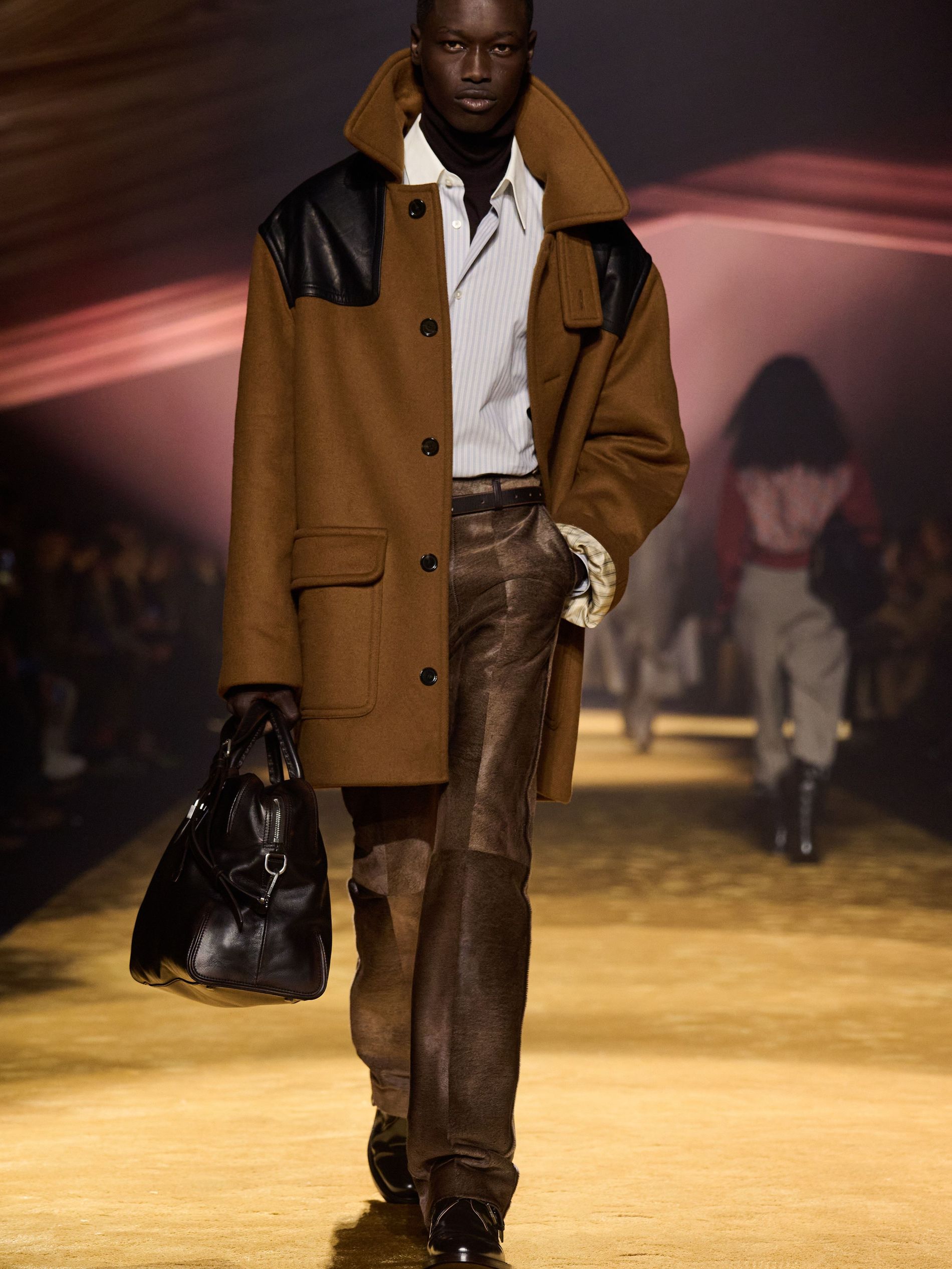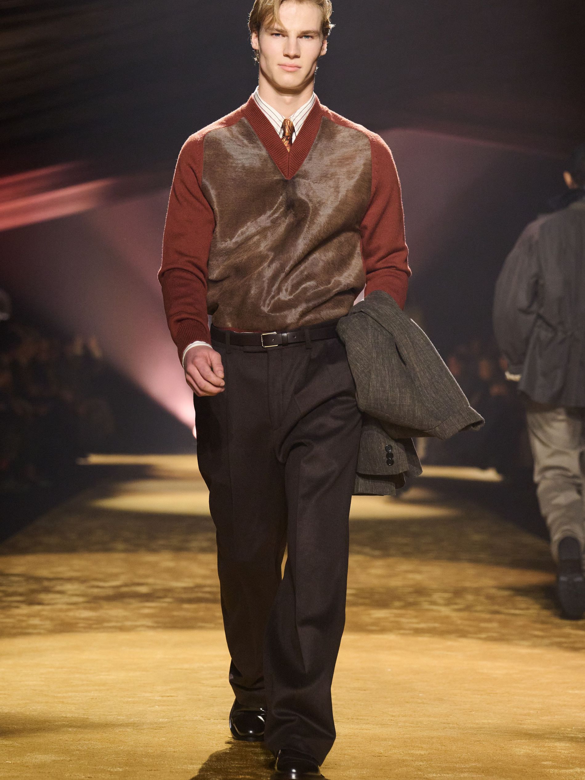 Within this palpable mood, the spine of the show was tailoring. “In tailoring – whether a three-button single-breasted suit, a perfectly tailored coat, a crisp shirt, or the most elegant silk neckwear – the message on the runway is clear: it’s even more powerful when you make it your own,” said Falcioni. There were boxy three-button suits with a ’90s sobriety, double-breasted numbers cut broad through the shoulder with a subtle power surge, and trim sack shapes that felt lifted from an executive floor circa 1988 and reissued for now. “One of our key ambitions was to position tailoring within a more lifestyle-driven context, moving away from traditional office attire and aligning it with hybrid situations.” Trousers were tucked into hybrid boot-loafers – “whose silhouettes are derived from an archival men’s loafer” – and leather blousons were cinched into double-belted waists.