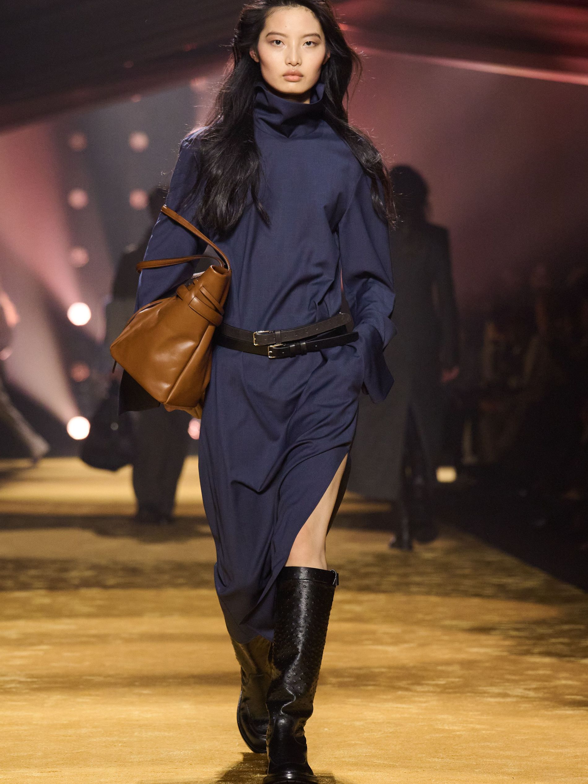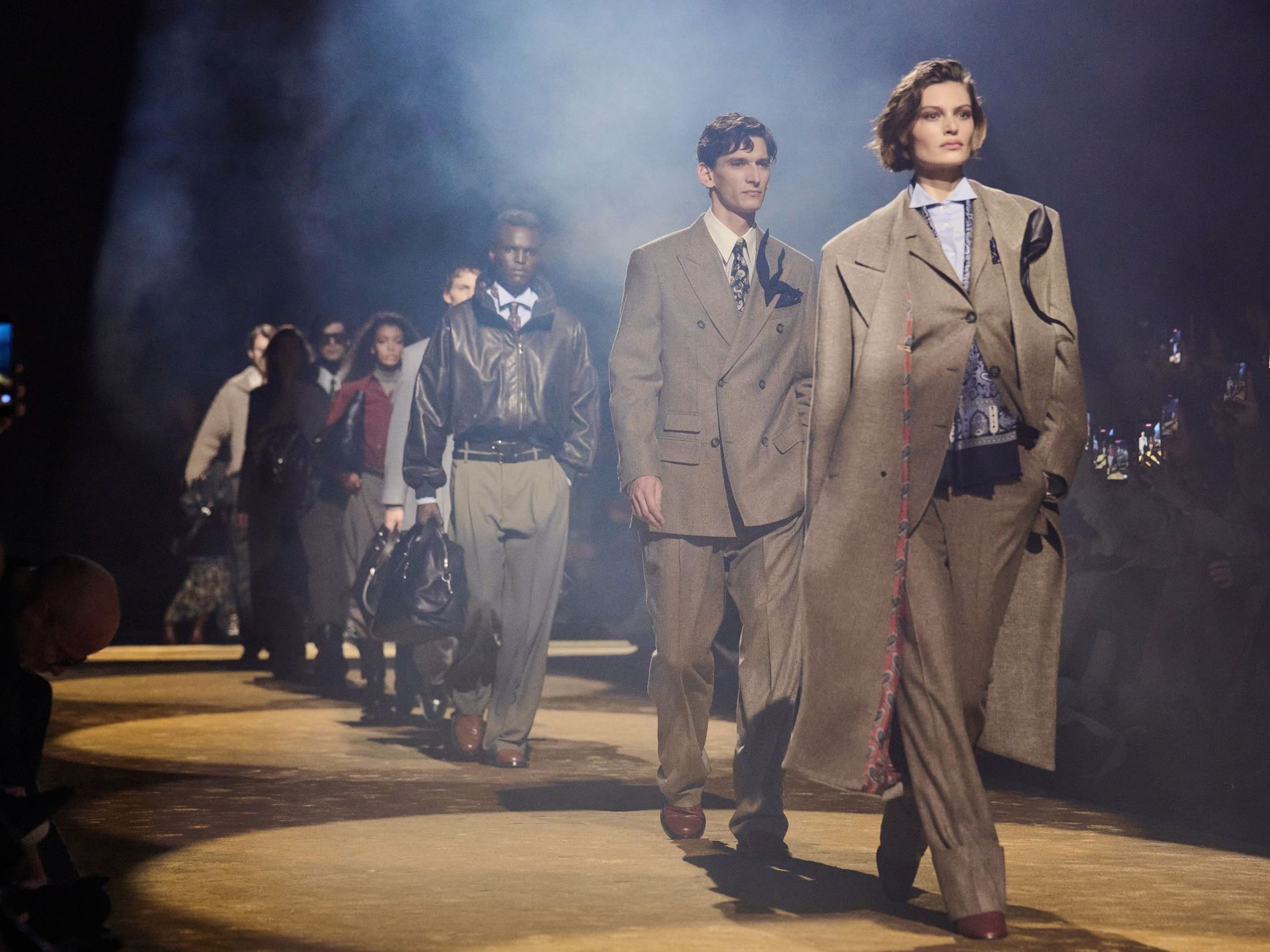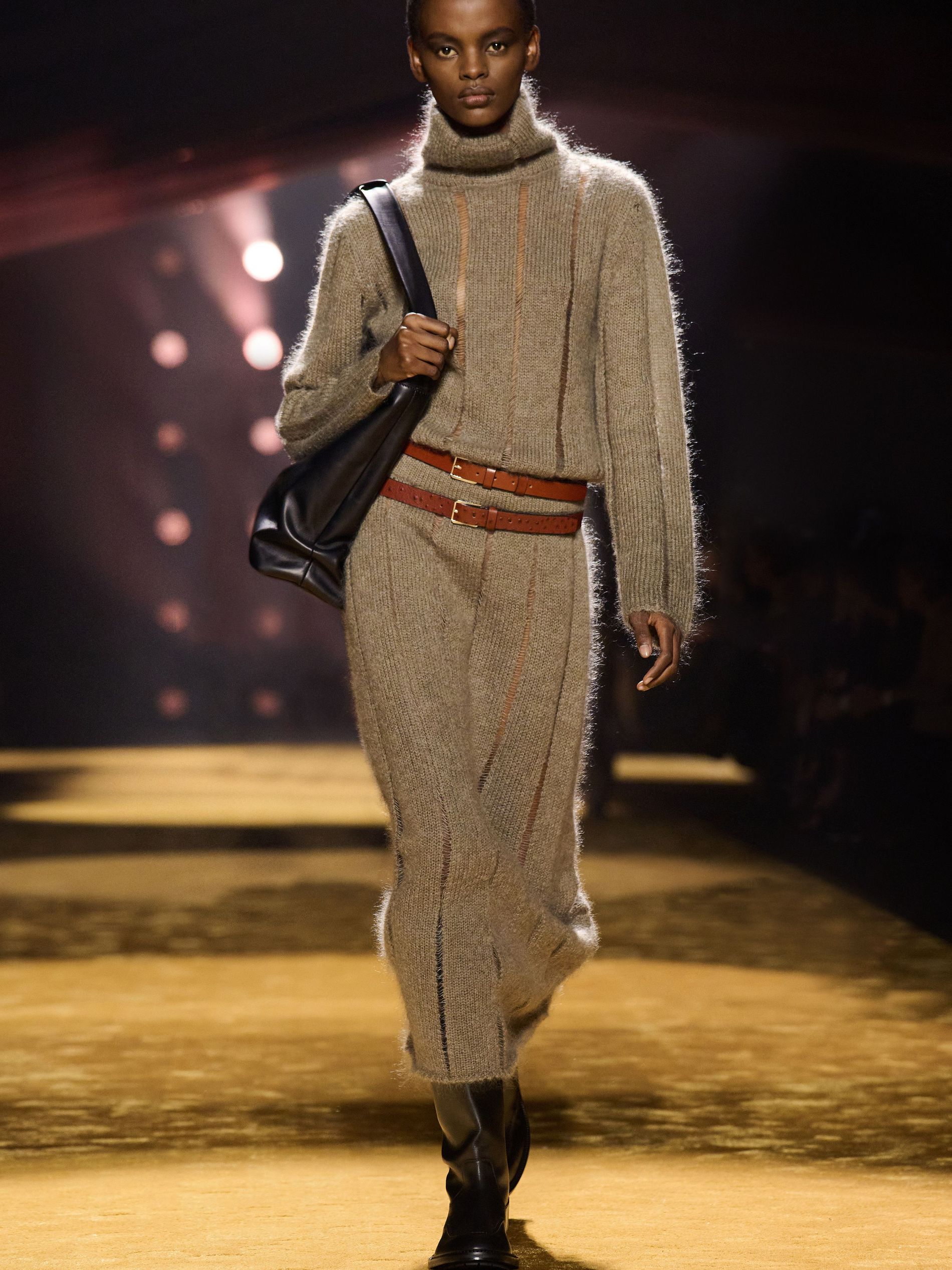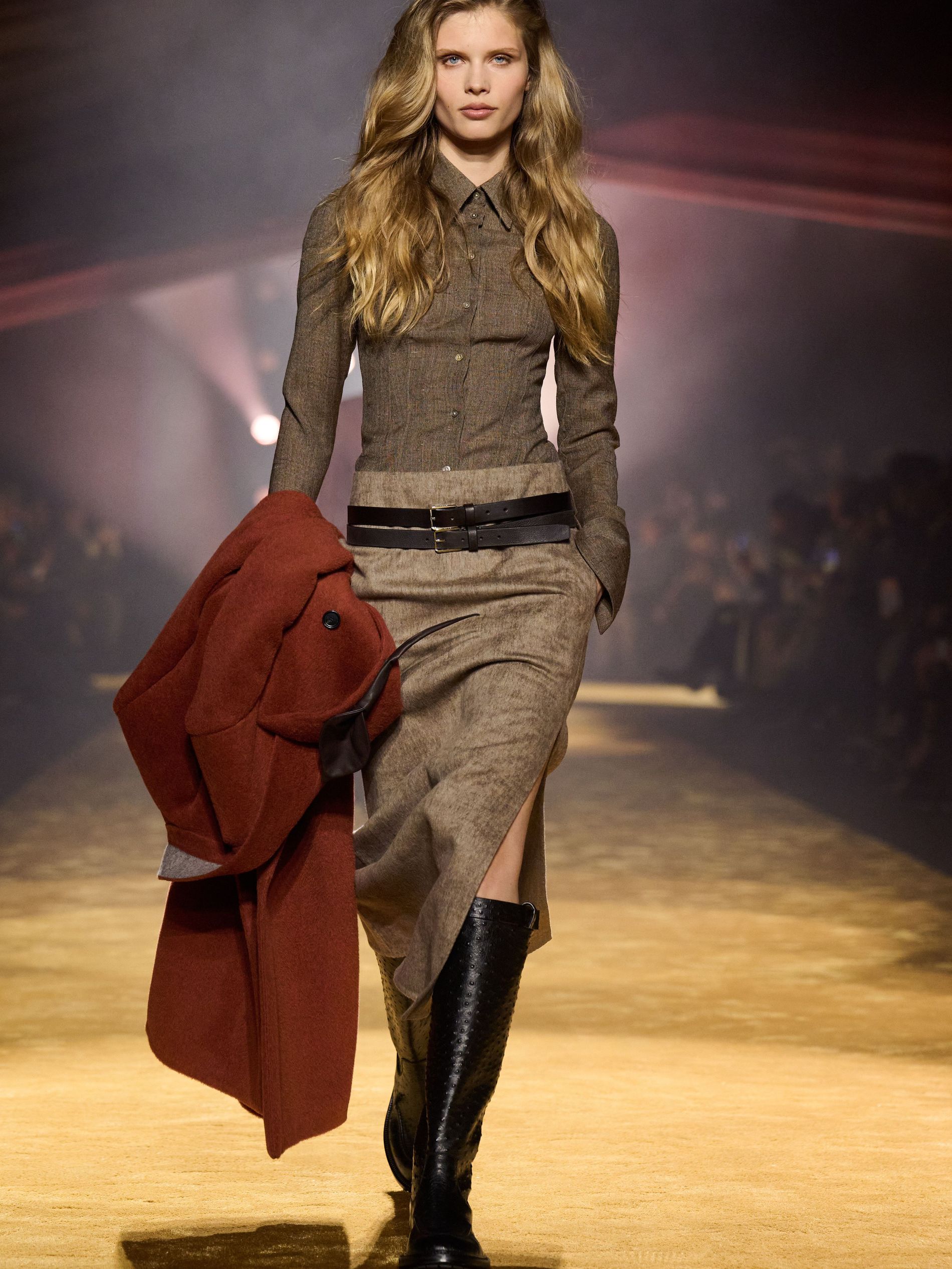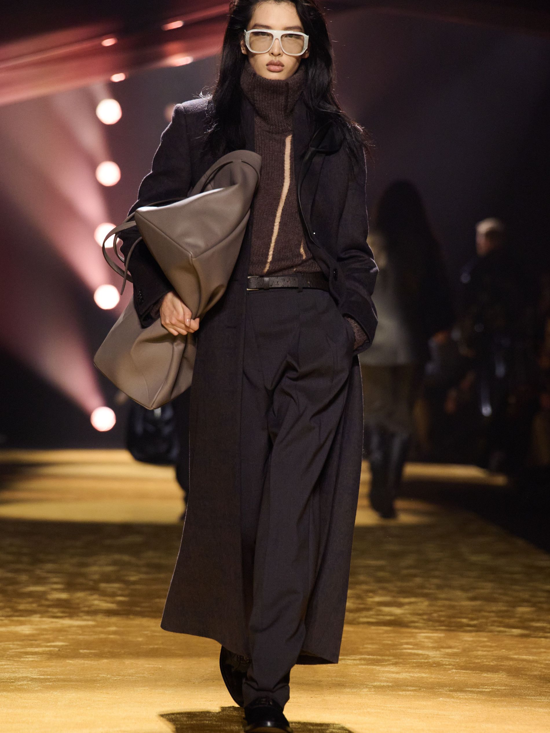 Within this palpable mood, the spine of the show was tailoring. “In tailoring – whether a three-button single-breasted suit, a perfectly tailored coat, a crisp shirt, or the most elegant silk neckwear – the message on the runway is clear: it’s even more powerful when you make it your own,” said Falcioni. There were boxy three-button suits with a ’90s sobriety, double-breasted numbers cut broad through the shoulder with a subtle power surge, and trim sack shapes that felt lifted from an executive floor circa 1988 and reissued for now. “One of our key ambitions was to position tailoring within a more lifestyle-driven context, moving away from traditional office attire and aligning it with hybrid situations.” Trousers were tucked into hybrid boot-loafers – “whose silhouettes are derived from an archival men’s loafer” – and leather blousons were cinched into double-belted waists.