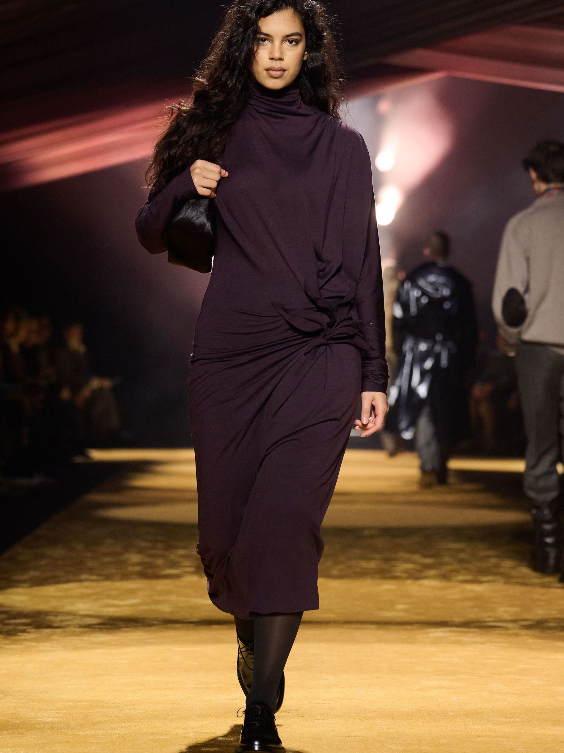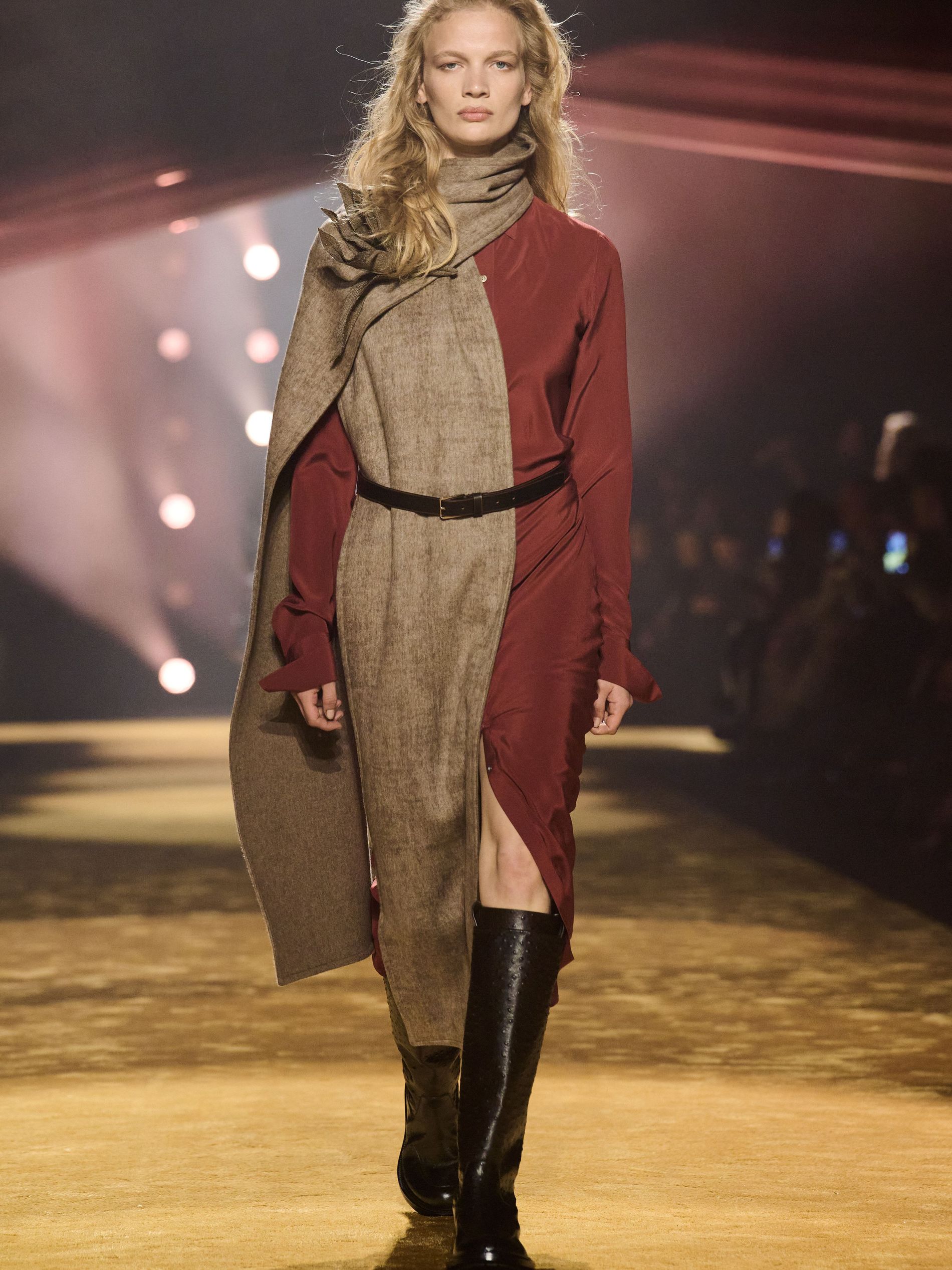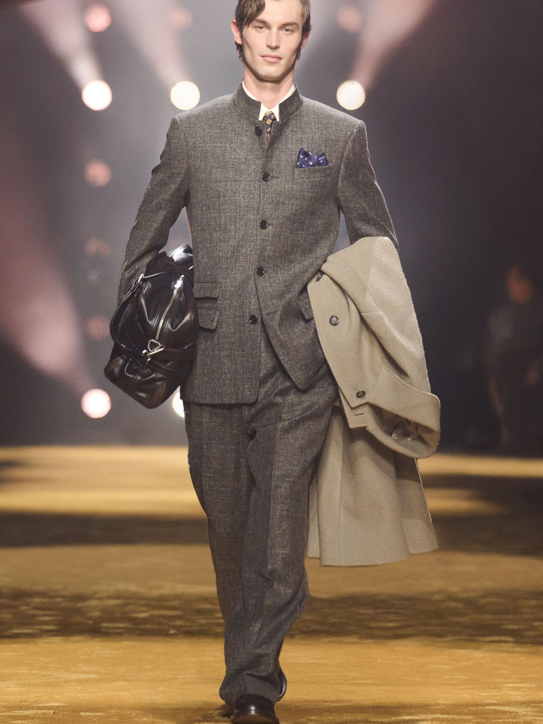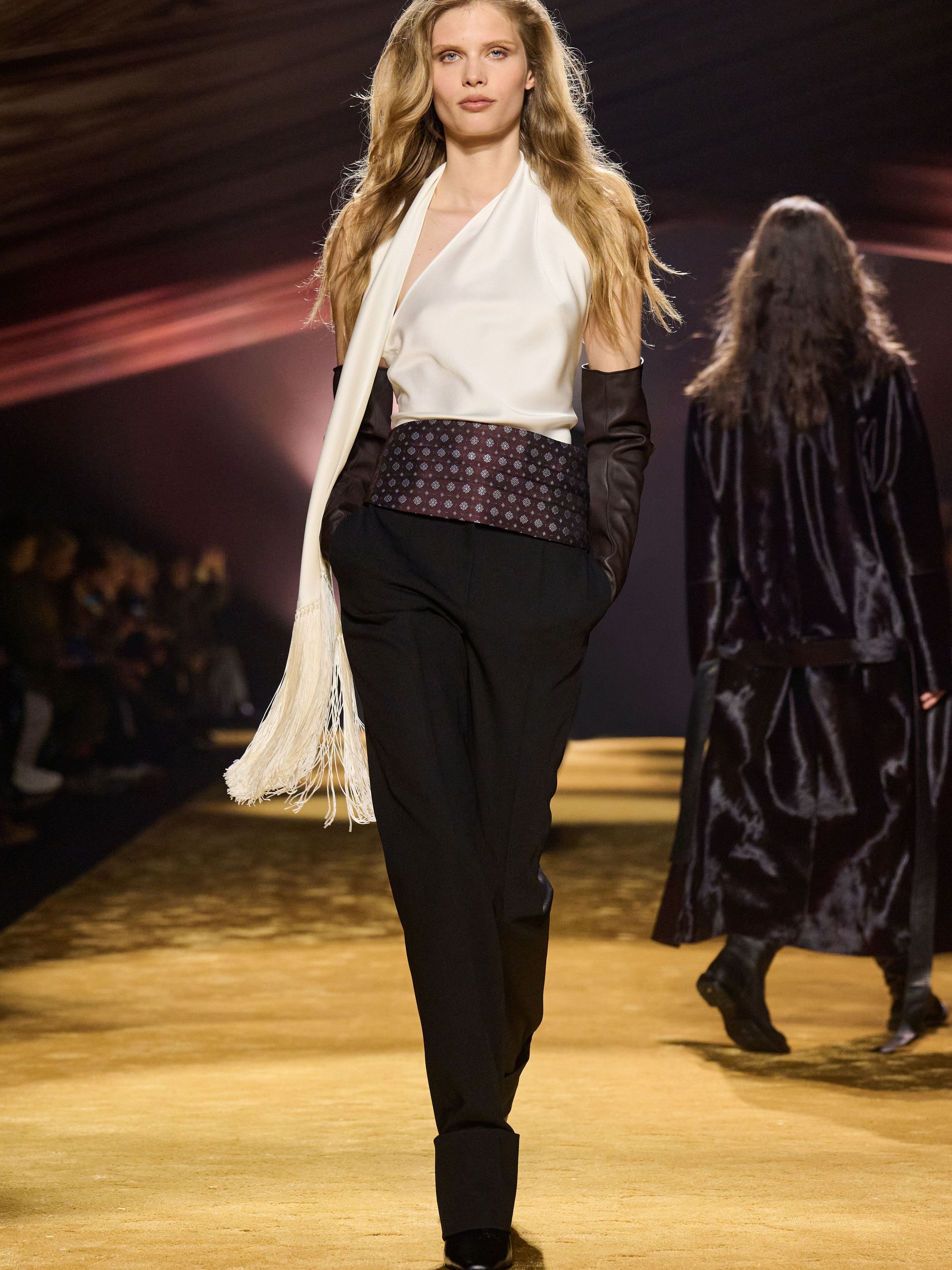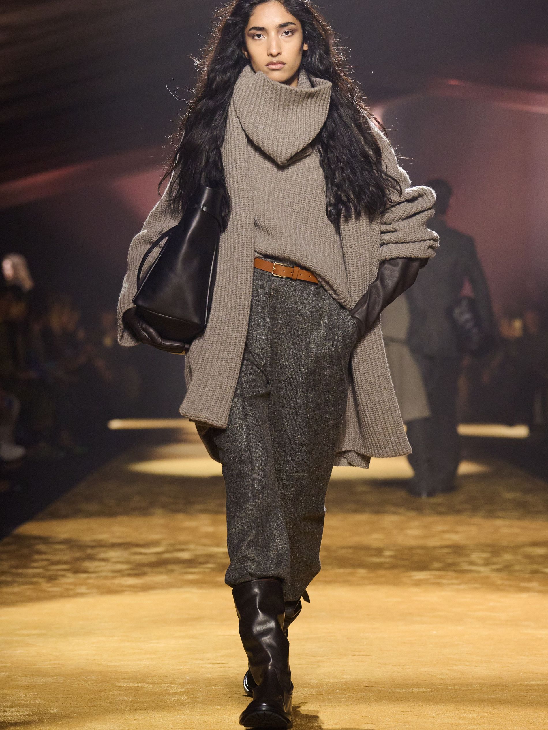Within this palpable mood, the spine of the show was tailoring. “In tailoring – whether a three-button single-breasted suit, a perfectly tailored coat, a crisp shirt, or the most elegant silk neckwear – the message on the runway is clear: it’s even more powerful when you make it your own,” said Falcioni. There were boxy three-button suits with a ’90s sobriety, double-breasted numbers cut broad through the shoulder with a subtle power surge, and trim sack shapes that felt lifted from an executive floor circa 1988 and reissued for now. “One of our key ambitions was to position tailoring within a more lifestyle-driven context, moving away from traditional office attire and aligning it with hybrid situations.” Trousers were tucked into hybrid boot-loafers – “whose silhouettes are derived from an archival men’s loafer” – and leather blousons were cinched into double-belted waists.