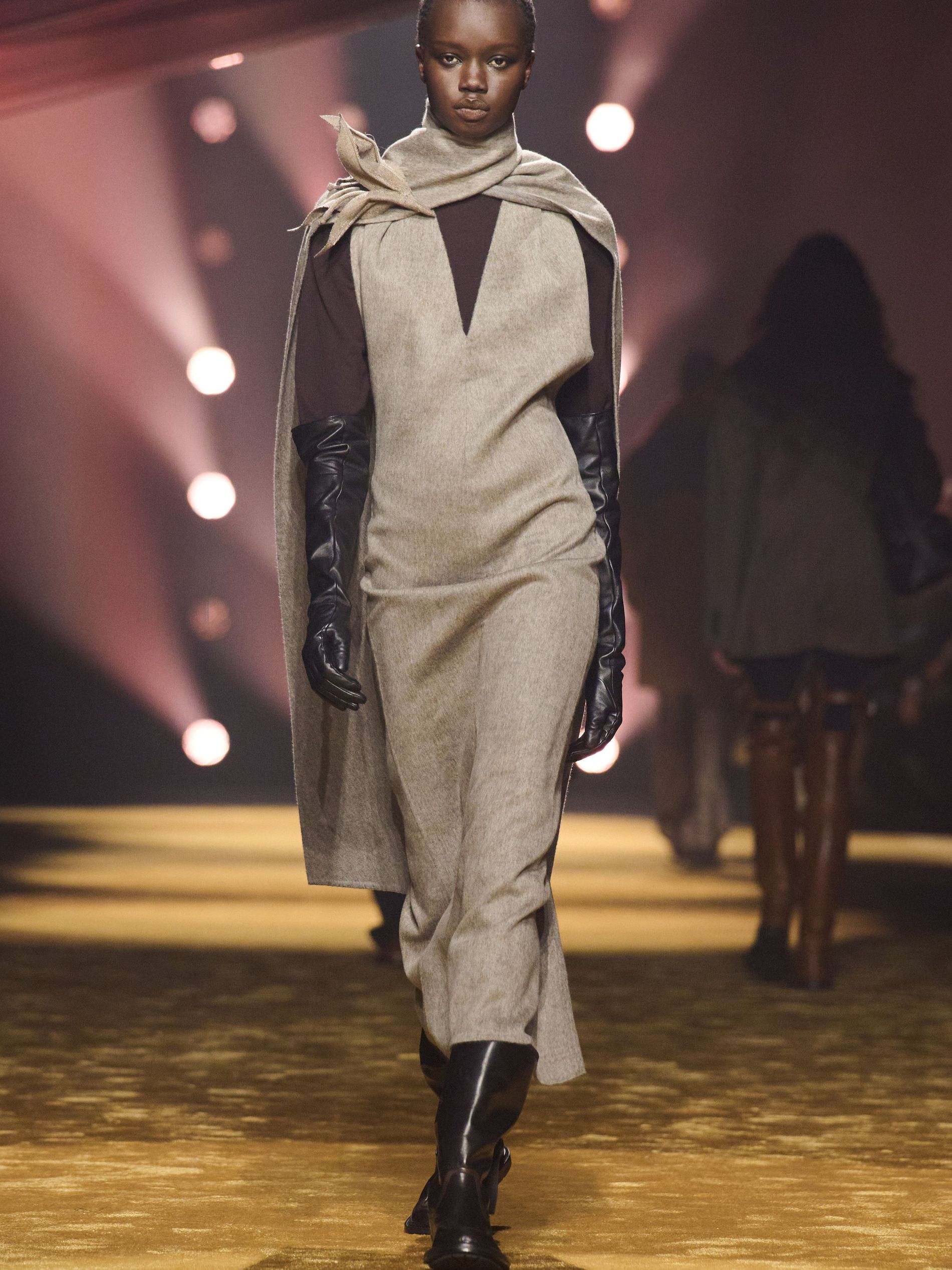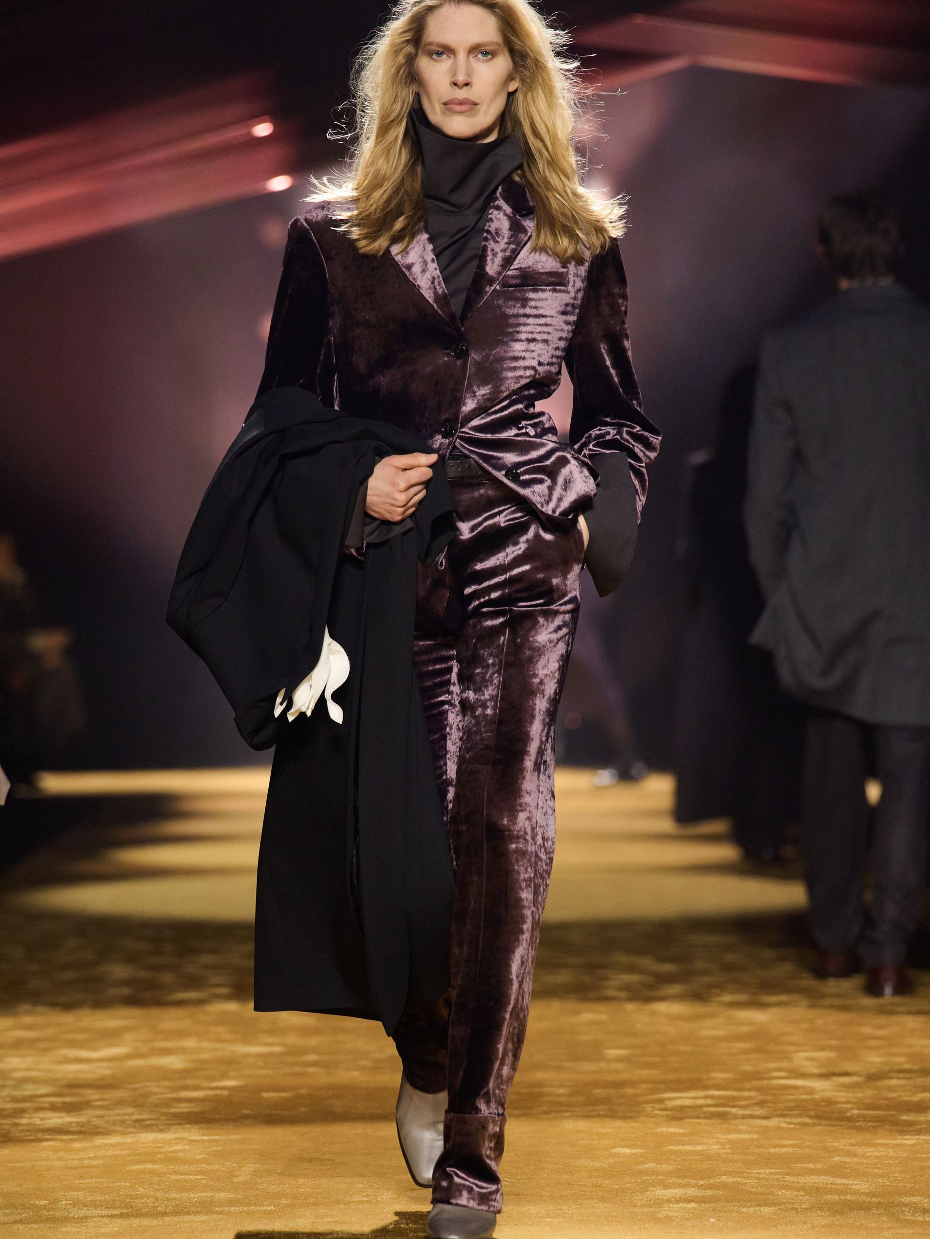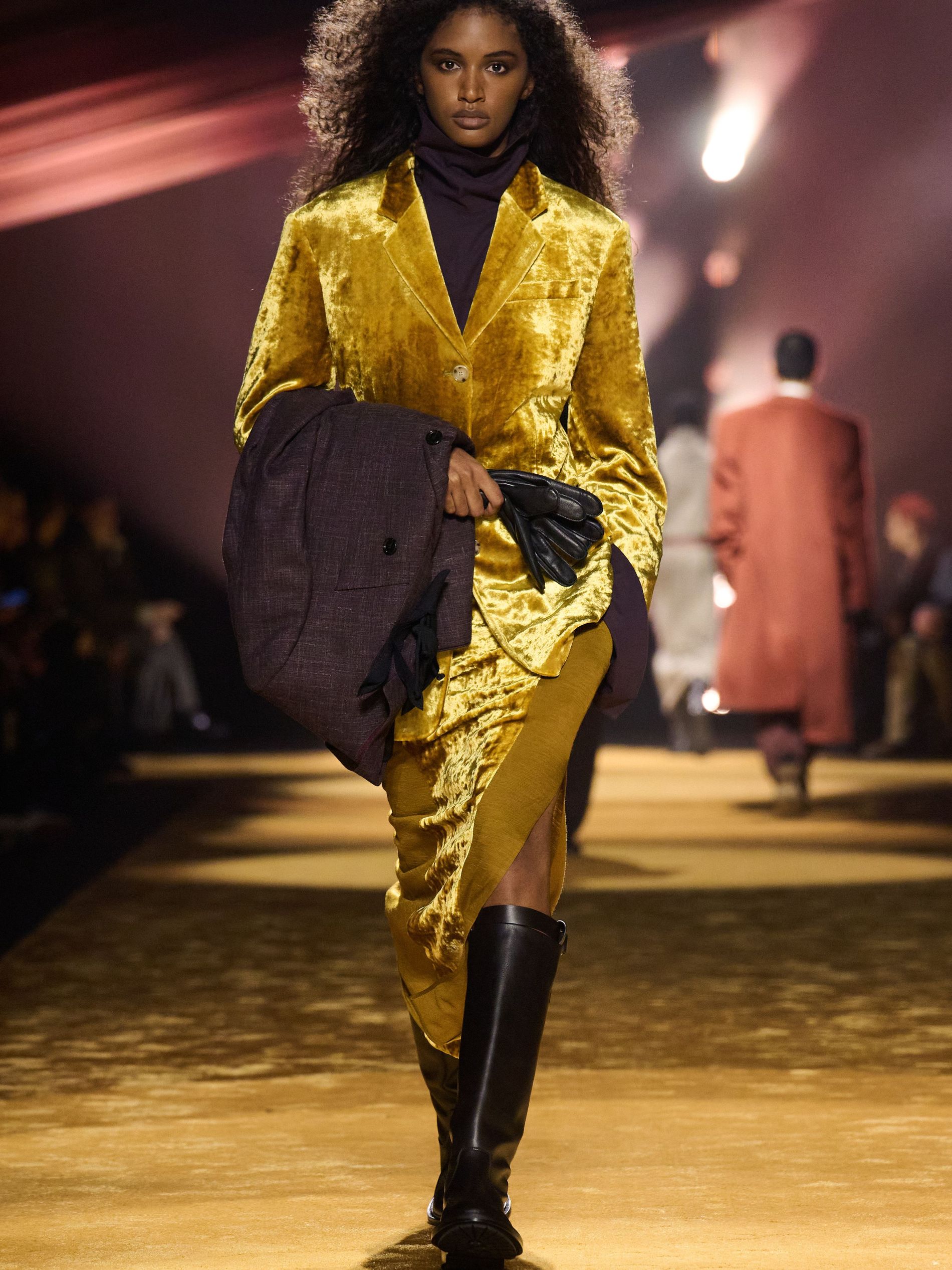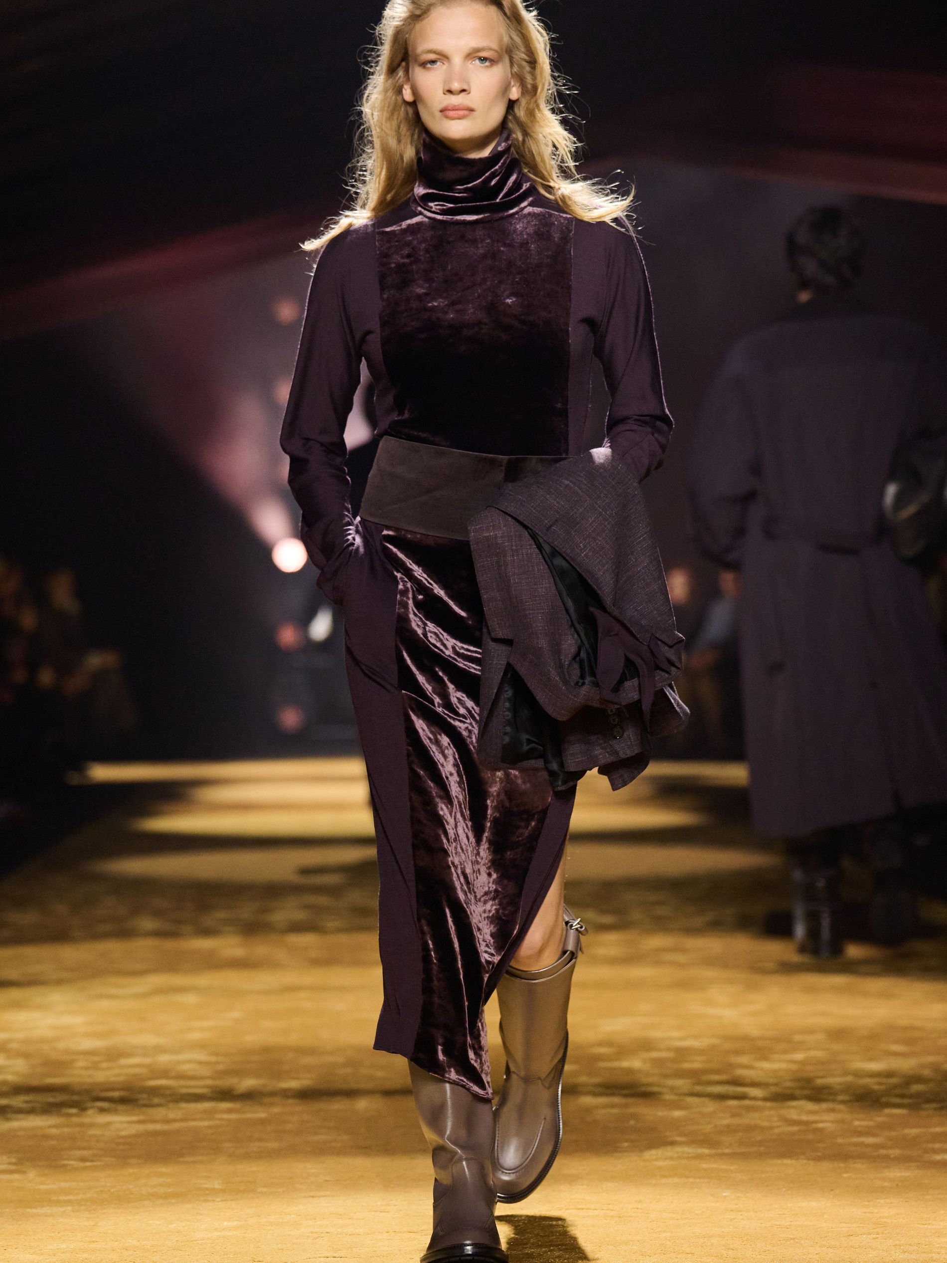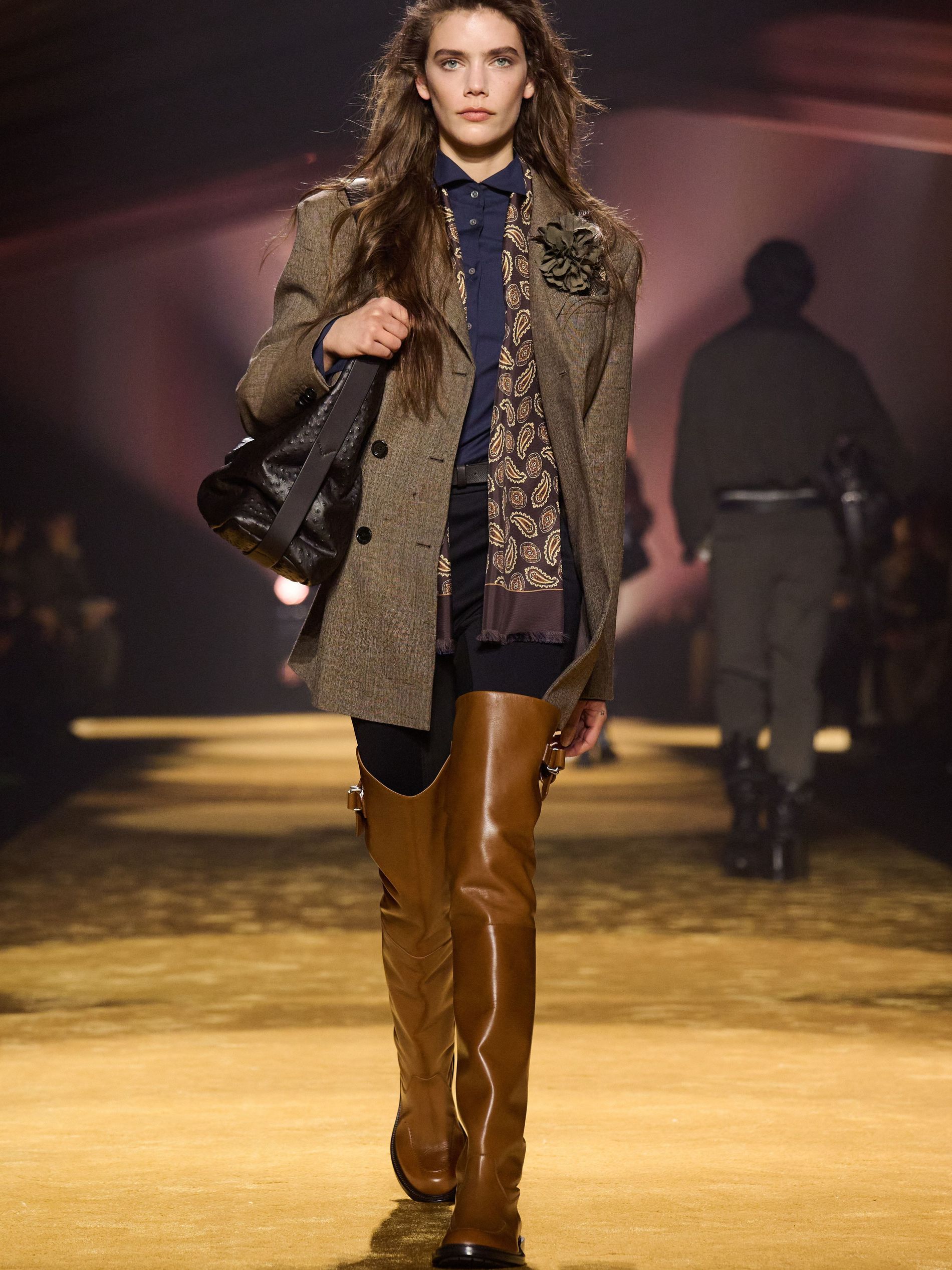 Falcioni set this tailoring against outdoors and equestrian inflections. “As just one example of this approach, we styled some suits with equestrian-inspired boots,” he noted. Tyrolean jackets stripped of fuss, windcheaters spliced into the sartorial mix, shoulder-patched knits that nodded to country pursuits without lapsing into costume. “Texture – and the art of manipulating fabrics to create something unexpected – was key.” Leather, “which has become a pillar in the BOSS wardrobe in recent seasons,” played an important role, appearing in sturdy finishes with a soft hand feel, in ostrich-effect leather, and ponyhair-effect leather. “By experimenting with this material, we see it featured throughout the collection in different iterations.” Even knitwear was taken in a new direction, “introducing a sharper edge through unique knitting techniques that echoed the same bigger, bolder attitude seen across the collection.” Womenswear largely borrowed the masculine template – suiting softened with cowl-neck knits and cotton tops instead of shirts – before loosening into velvet toward the close, plush and decadent.