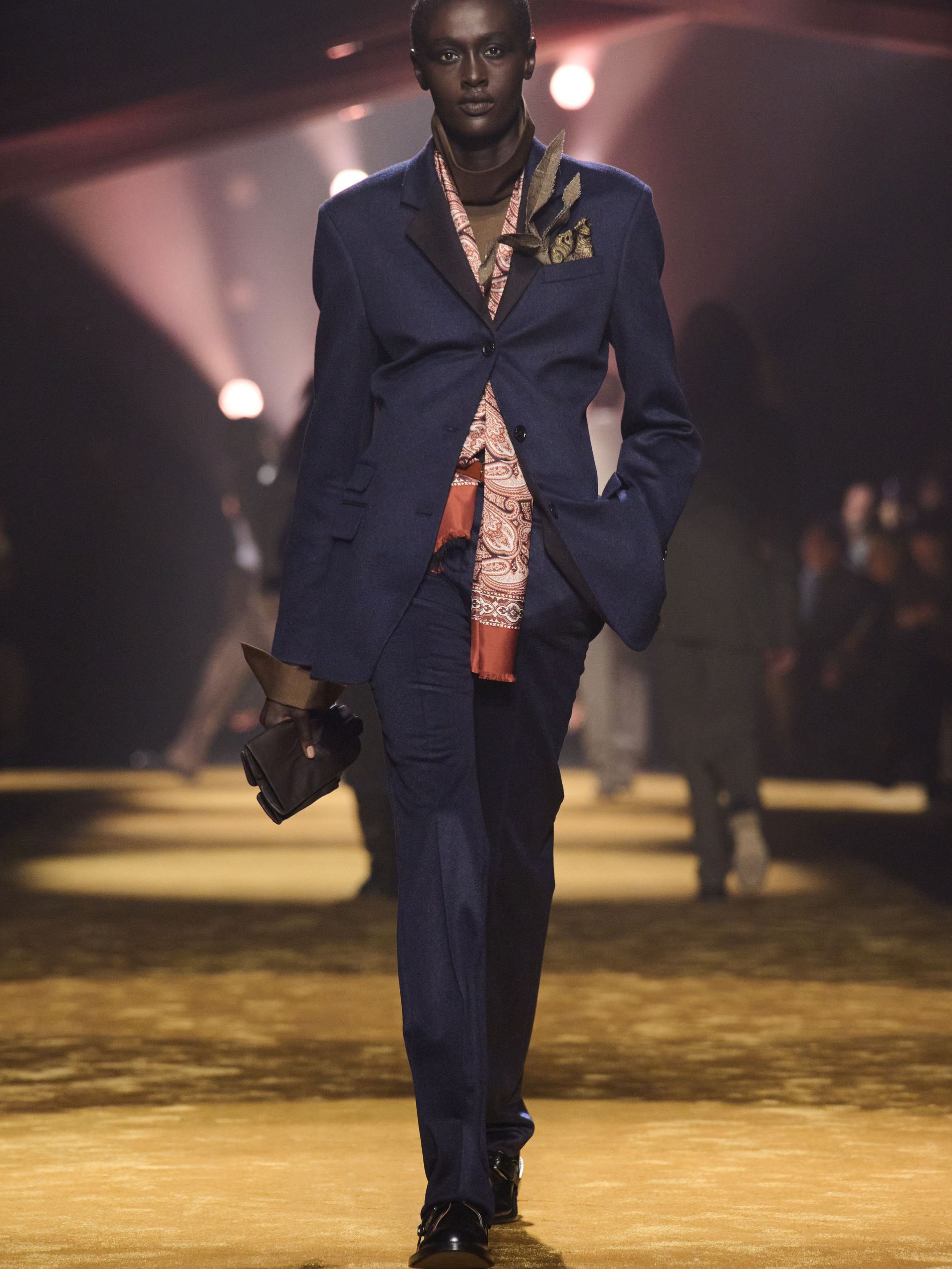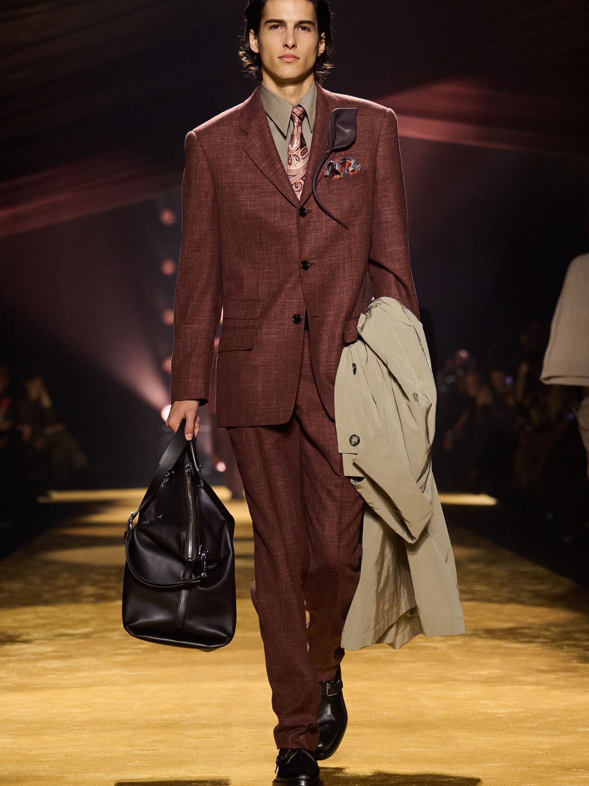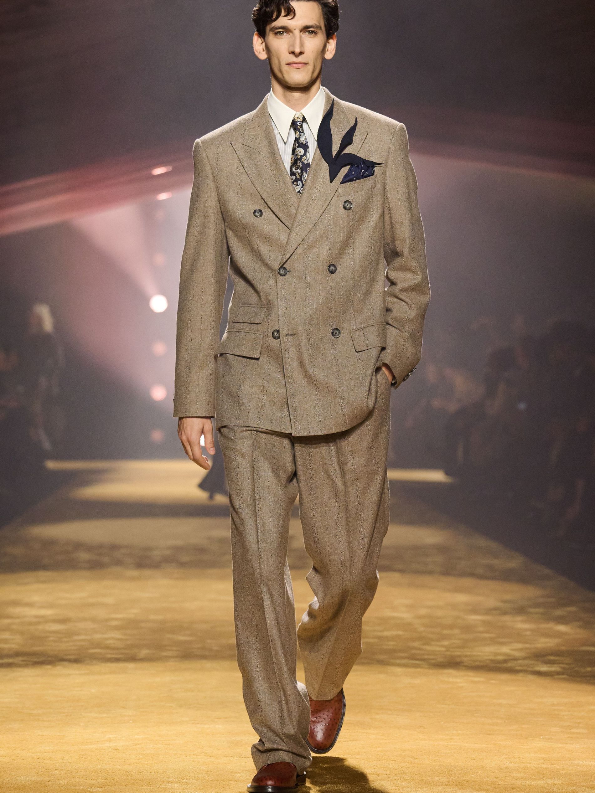 The detailing was where the collection sharpened. Falcioni tracked down historic suppliers to reproduce archive-pattern paisley silks for ties, linings and pocket squares – the very “sartorial success symbols” he set out to reinterpret – then disrupted their propriety, splicing them into the backs of knits, slicing them across sleeves, inserting them where tradition would never have allowed. Striped sleeve linings escaped their hidden function; scraps of leather embossed to mimic ostrich or brushed like pony were repurposed into small, almost fussy boutonnieres. “The colour palette followed the best expression of the materials’ texture,” he added, citing ink black, midnight navy, smoky gray, olive, russet brown, warm terracotta and golden ochre. “We wanted to offer an uplifting point of view: sophisticated, elevated, positive, and full of BOSS confidence.”