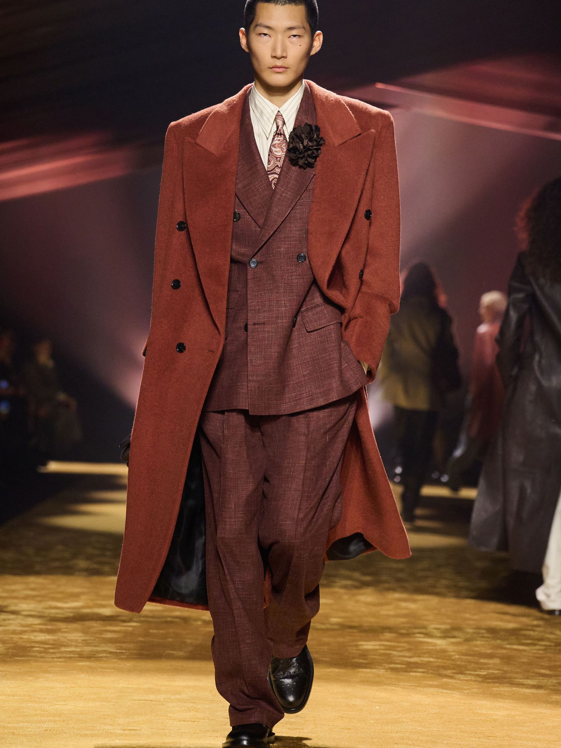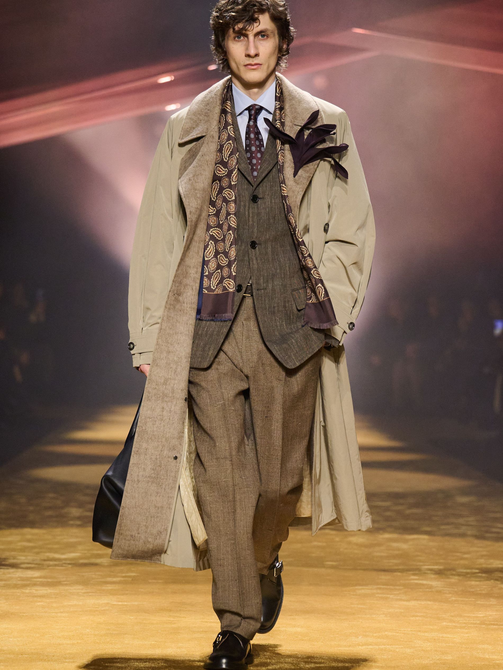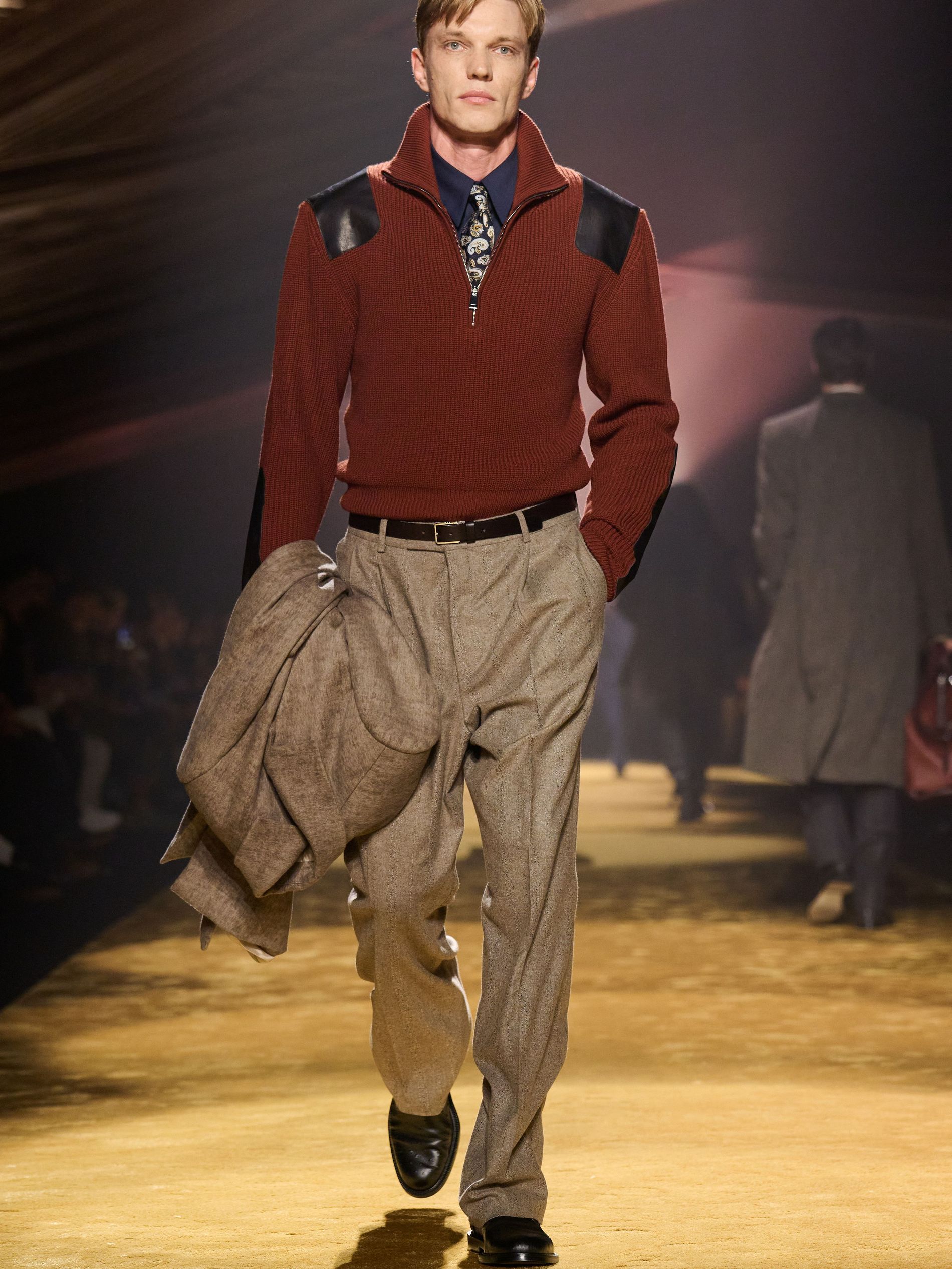 The detailing was where the collection sharpened. Falcioni tracked down historic suppliers to reproduce archive-pattern paisley silks for ties, linings and pocket squares – the very “sartorial success symbols” he set out to reinterpret – then disrupted their propriety, splicing them into the backs of knits, slicing them across sleeves, inserting them where tradition would never have allowed. Striped sleeve linings escaped their hidden function; scraps of leather embossed to mimic ostrich or brushed like pony were repurposed into small, almost fussy boutonnieres. “The colour palette followed the best expression of the materials’ texture,” he added, citing ink black, midnight navy, smoky gray, olive, russet brown, warm terracotta and golden ochre. “We wanted to offer an uplifting point of view: sophisticated, elevated, positive, and full of BOSS confidence.”