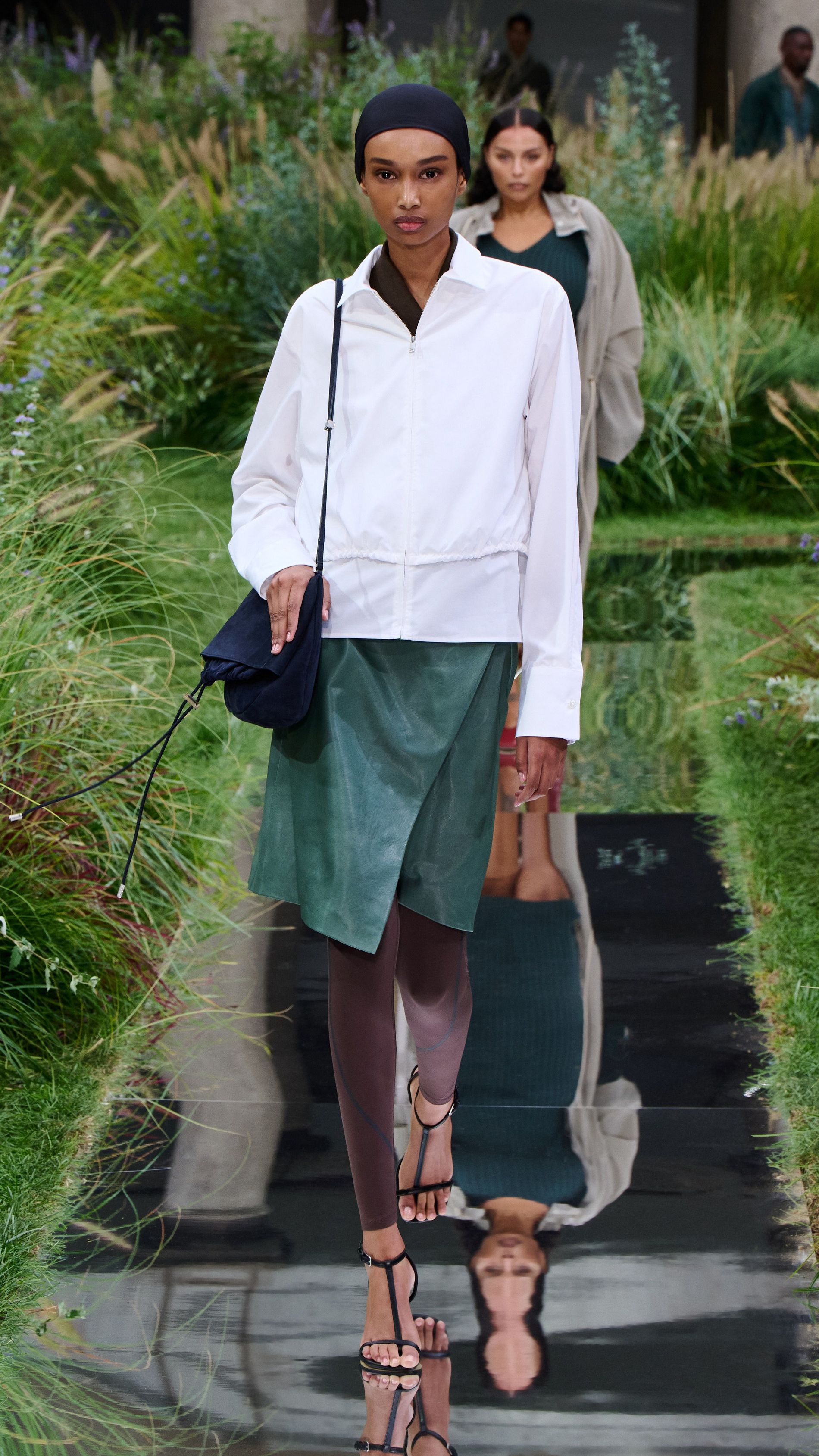 Staged at the Palazzo del Senato in Milan, the clocked-out runway looks deconstructed a more formal dress code. Models walked the winding mirrored catwalk surrounded by lush greenery wearing reinvented suits. The "epitome" of BOSS's tailoring heritage, according to Falcioni, it has a "softer approach, where the silhouette is dictated by the wearer’s body, leaving more room for freedom and expression of individuality.”