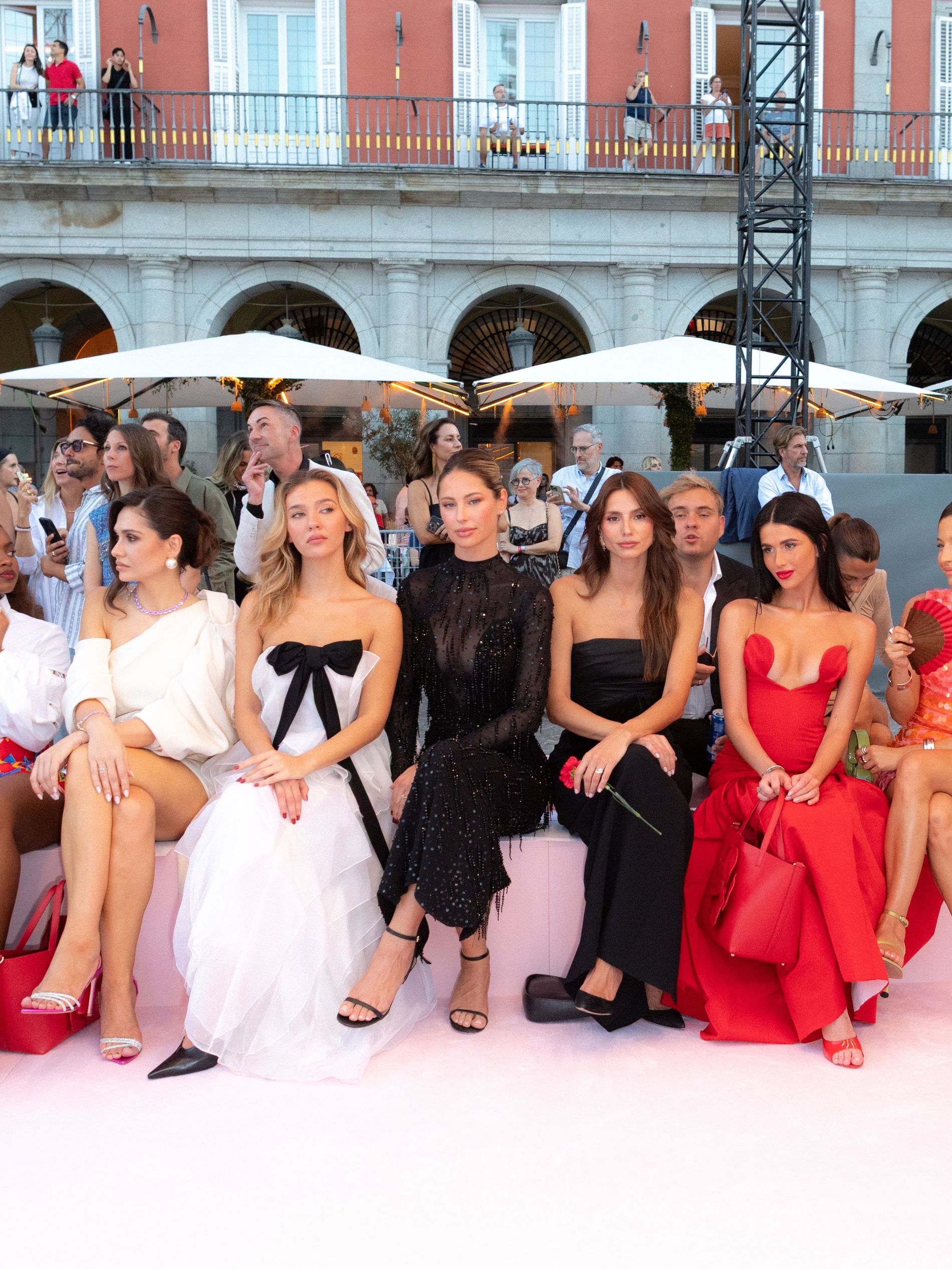 The following day offered a different kind of immersion: the Good Girl fragrance suite, a plush oasis perfumed with notes of jasmine, sandalwood and orange blossom. Here, surrounded by the signature stiletto-shaped bottles and engless blooms, Mathilde rediscovered one of Herrera’s most beloved icons. “When I wear Good Girl by Carolina Herrera, I feel confident and ready to take it on,” she said, spritzing the scent before heading to Plaza Mayor, invite in hand for the landmark spring/summer '26 show. En route, heels clicking across the cobblestones, La Bomba – Carolina Herrera’s newly launched fragrance – shimmered from every corner of the city. Its butterfly-wing motif lit up digital billboards, boutique windows and café awnings, the campaign’s vivid pink glow reflecting off surrounding stone.