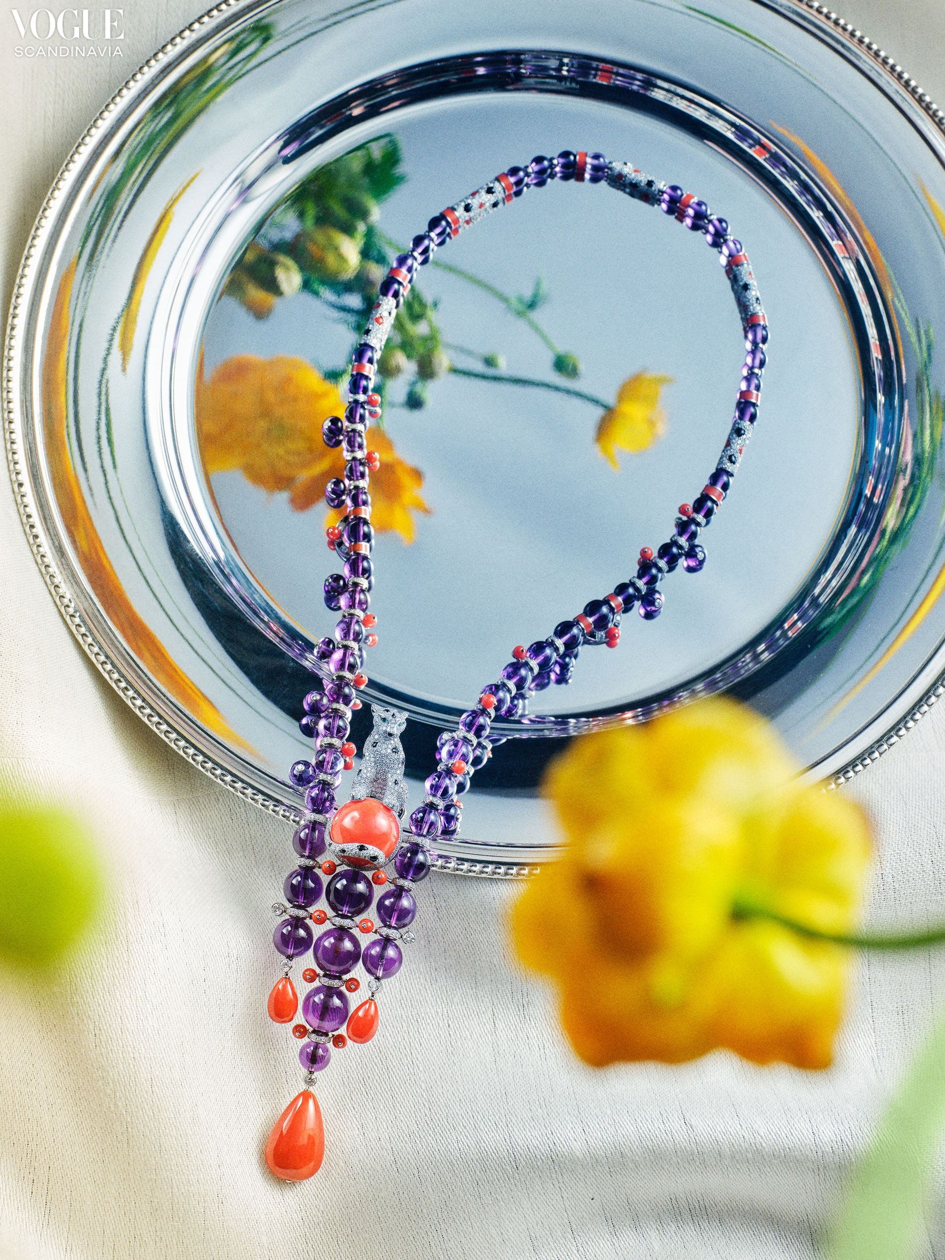 ‘Panthère Orbitale’ En Équilibre by Cartier necklace set with a 20.61-ct pear-shaped coral drop, a 17.79-ct cabochon-cut coral, amethysts, emeralds, onyx and dias. Photo: Martin Vallin