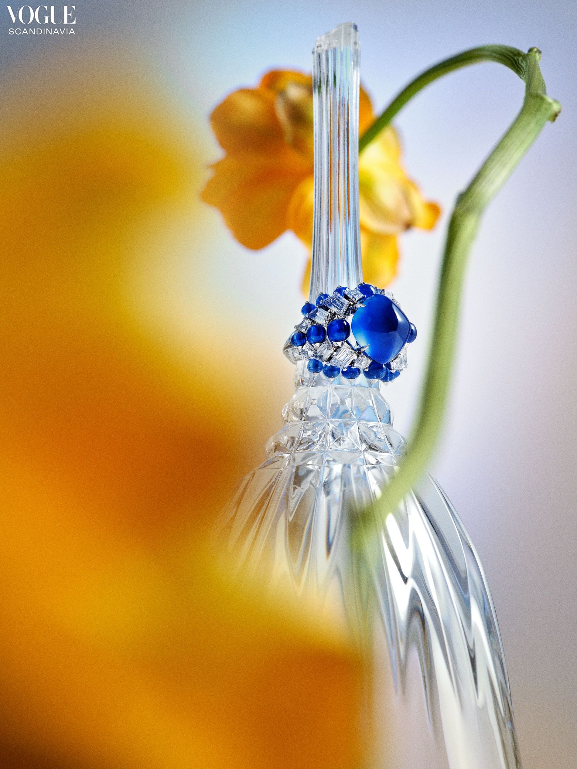 ‘Azulejo’ ring En Équilibre by Cartier in 18k white gold set with a 15.35-ct sugarloaf sapphire, diamonds and a series of sapphire beads. Photo: Martin Vallin