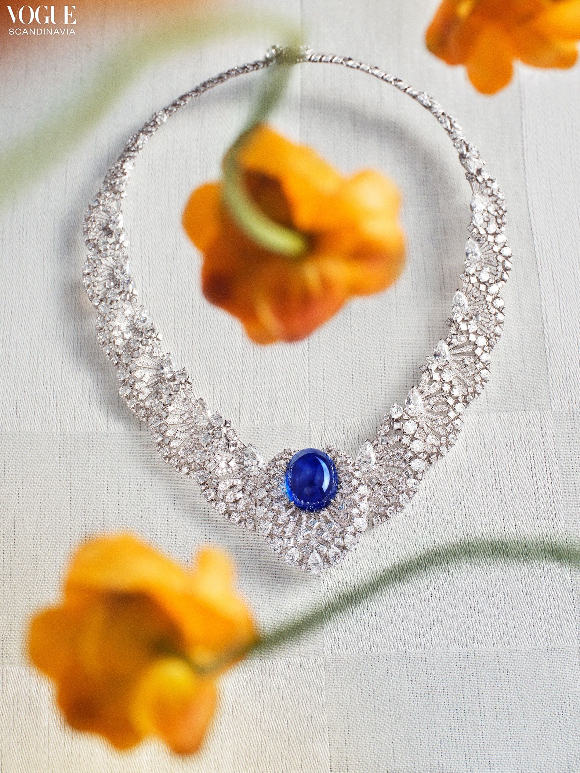 Pavocelle’ En Équilibre by Cartier necklace in 18k white gold set with one 58.08-ct cabochon-cut sapphire, one 1.03-ct D IF pear-shaped diamond and assembling diamonds. . Photo: Martin Vallin
