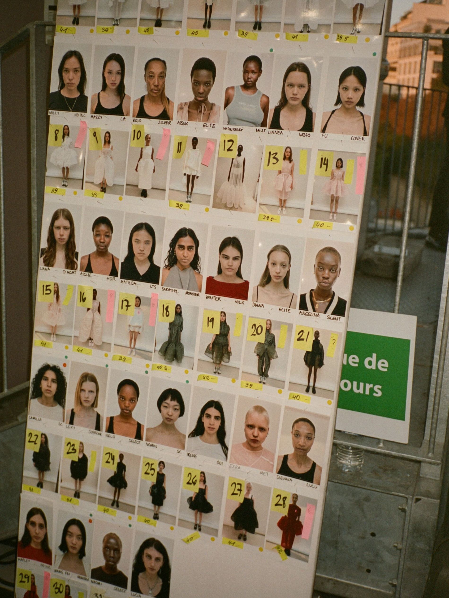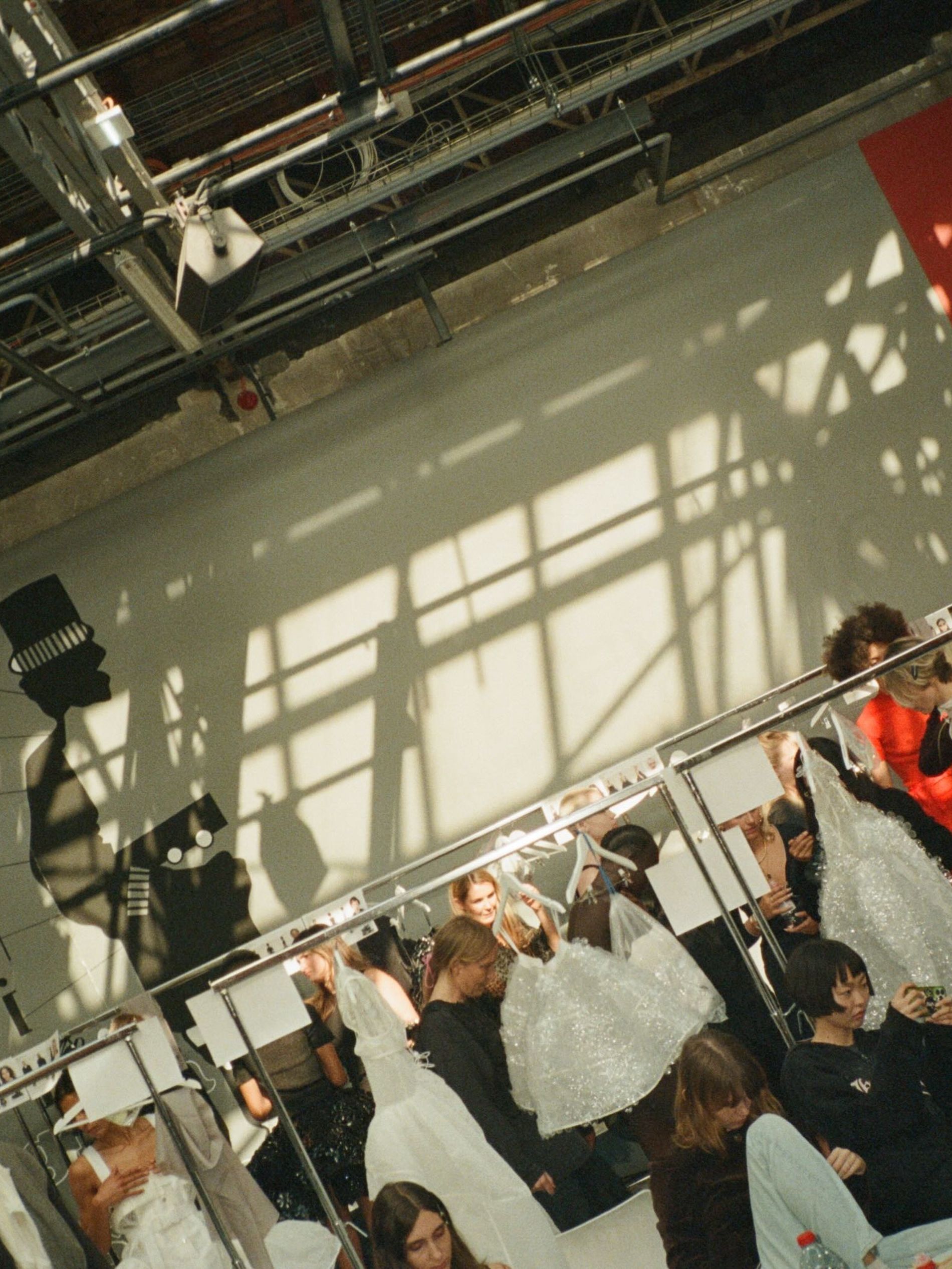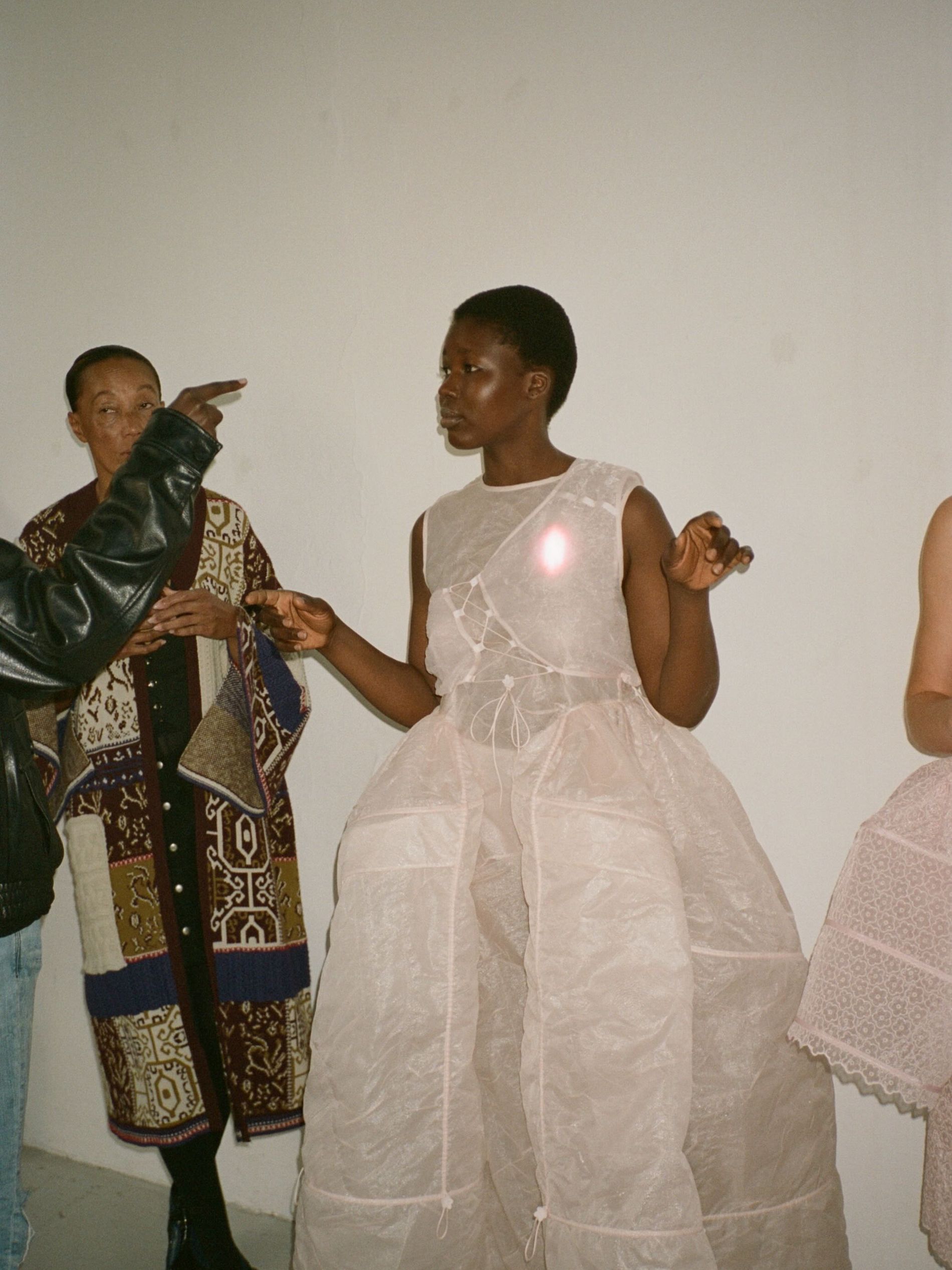 Hair was prepped with Oribe products to build a base of subtle hold and shine, then refined using the Dyson Supersonic R. “It’s like a Swiss army knife of hair tools,” Mahony noted. The result? Soft ponytails, airy volume, and flyaways left to catch the light filtering through the fractured glass ceiling above the Palais de Tokyo. For makeup, artist Mel Arter crafted one distinct, unusually striking detail: tiny LED lights beneath the eyes with the battery pack tucked into the hair. The futuristic effect was a visual echo of the hearts beating beneath Bahnsen’s fabrics on the runway.