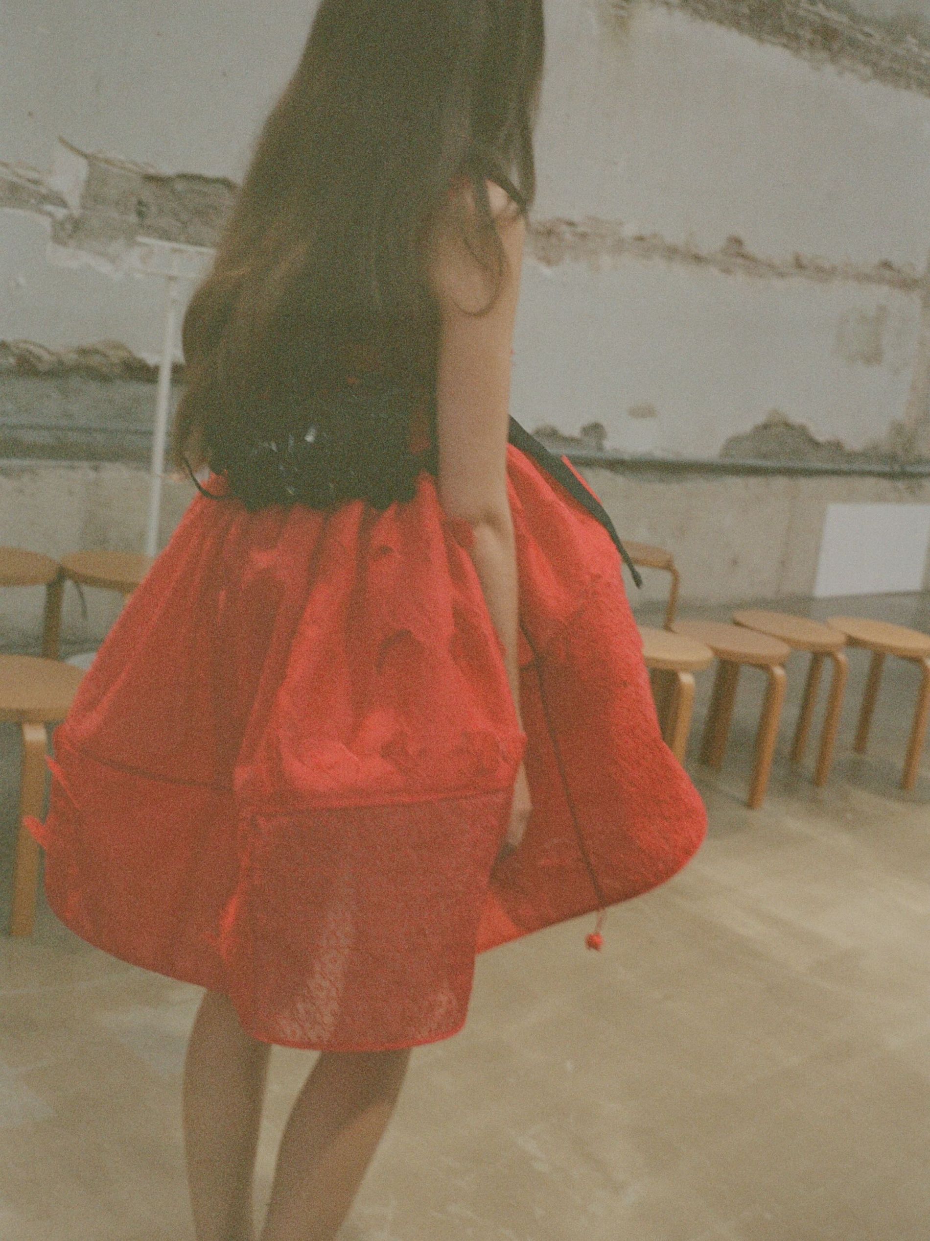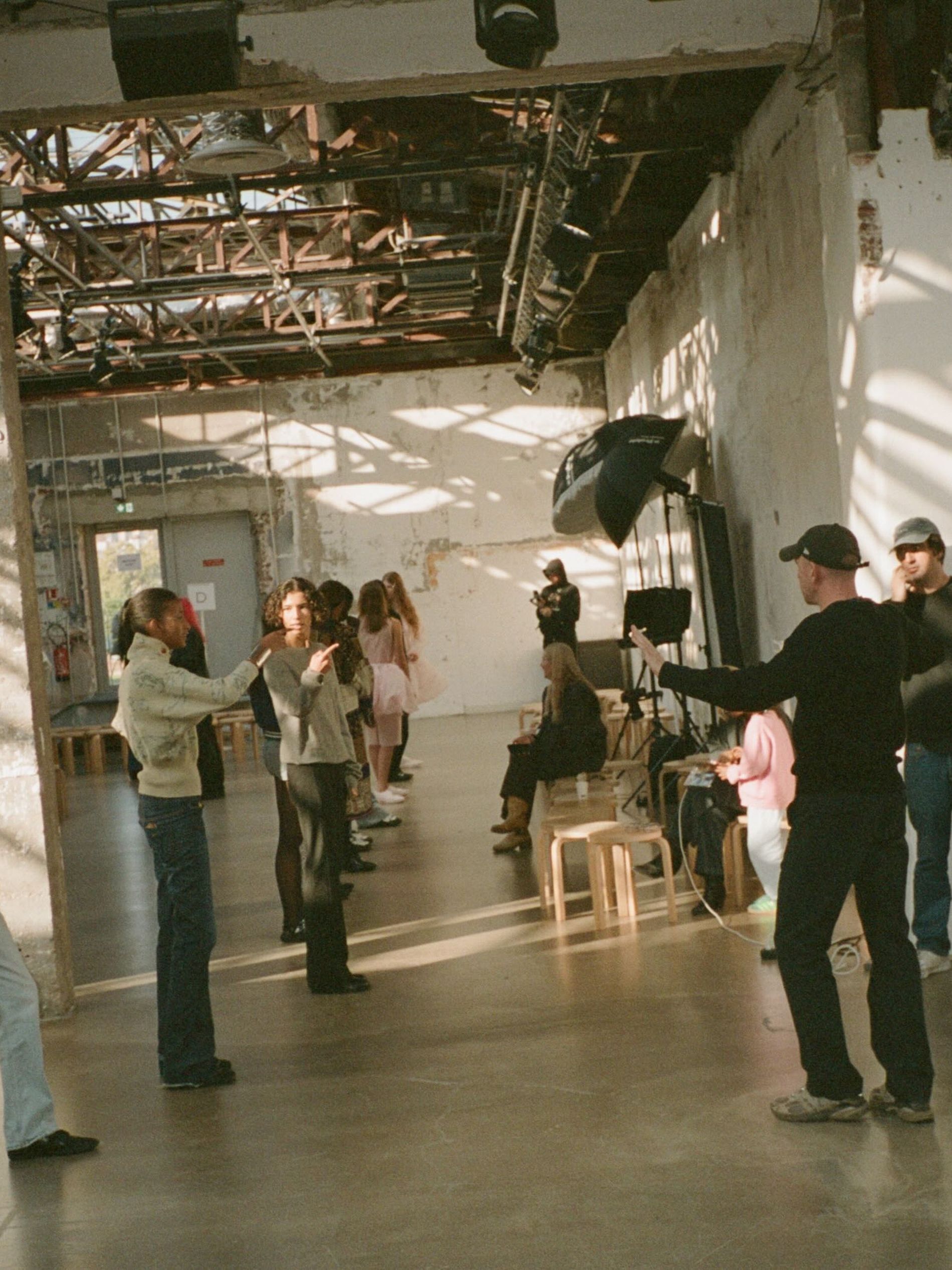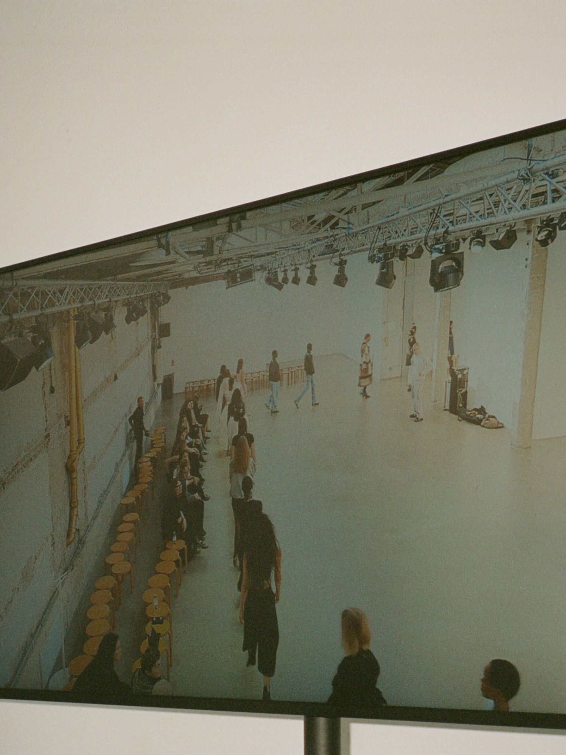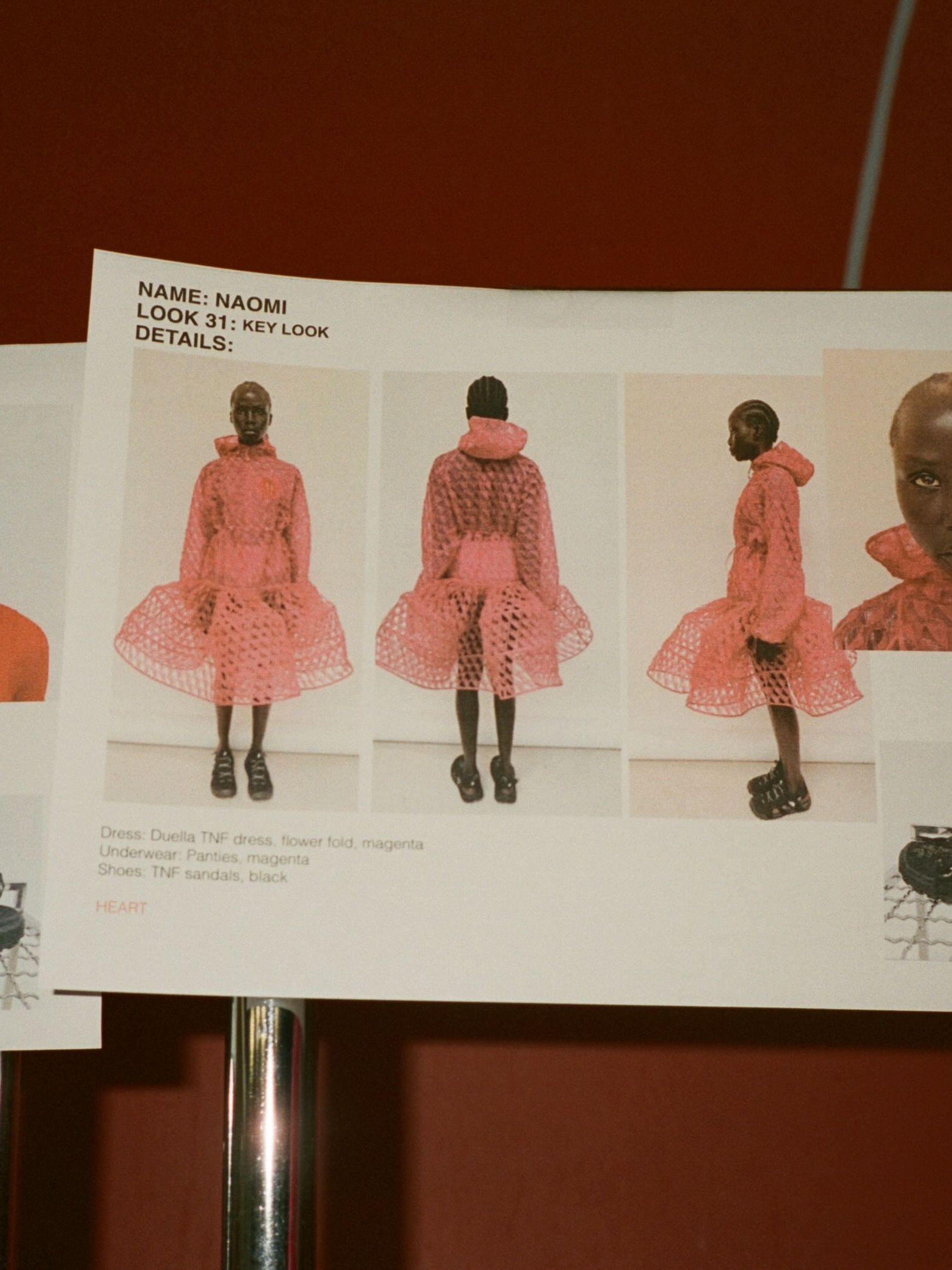 Hair was prepped with Oribe products to build a base of subtle hold and shine, then refined using the Dyson Supersonic R. “It’s like a Swiss army knife of hair tools,” Mahony noted. The result? Soft ponytails, airy volume, and flyaways left to catch the light filtering through the fractured glass ceiling above the Palais de Tokyo. For makeup, artist Mel Arter crafted one distinct, unusually striking detail: tiny LED lights beneath the eyes with the battery pack tucked into the hair. The futuristic effect was a visual echo of the hearts beating beneath Bahnsen’s fabrics on the runway.