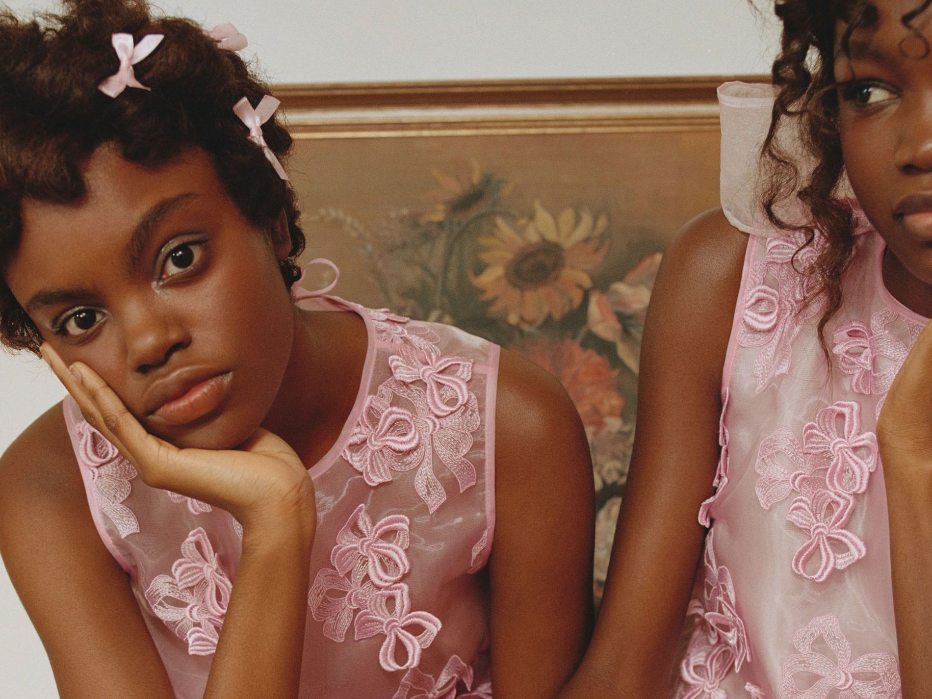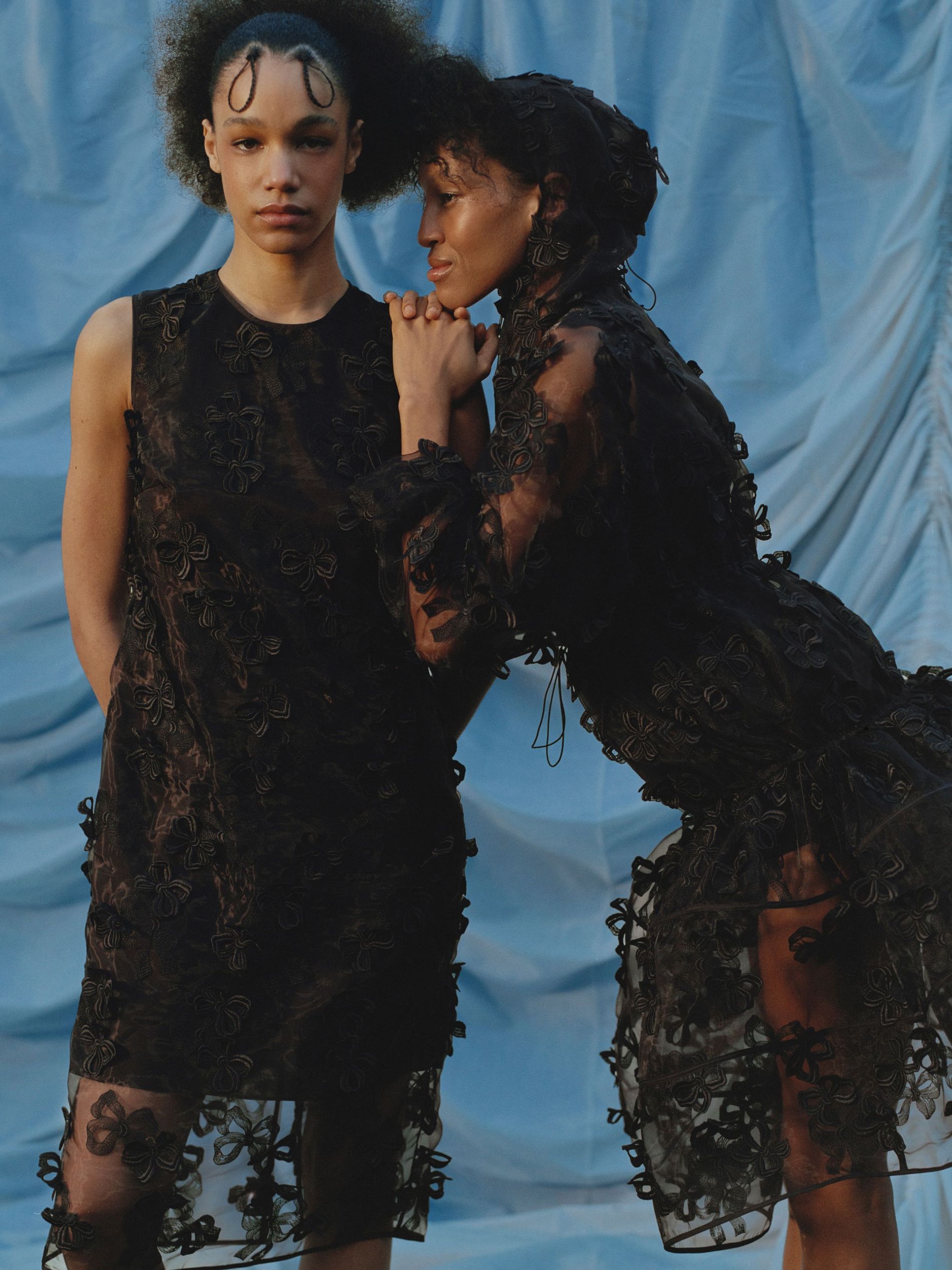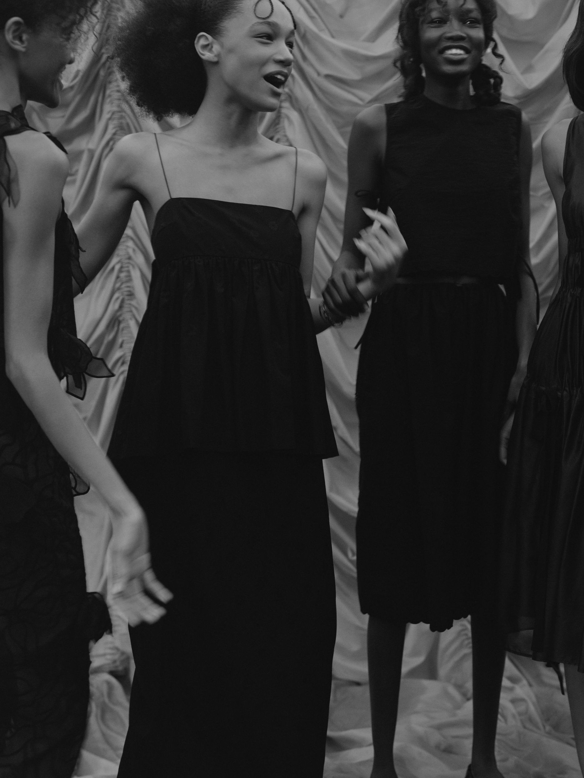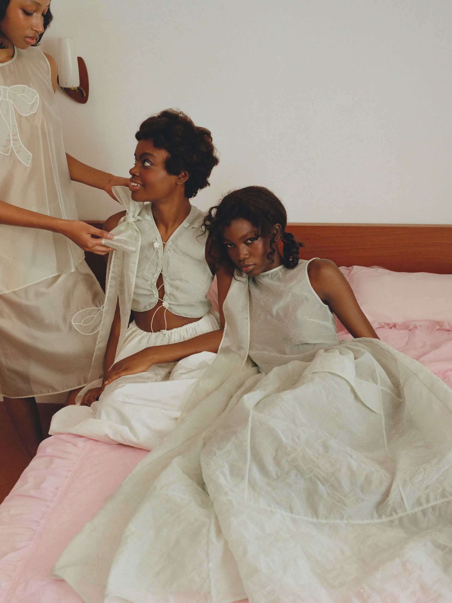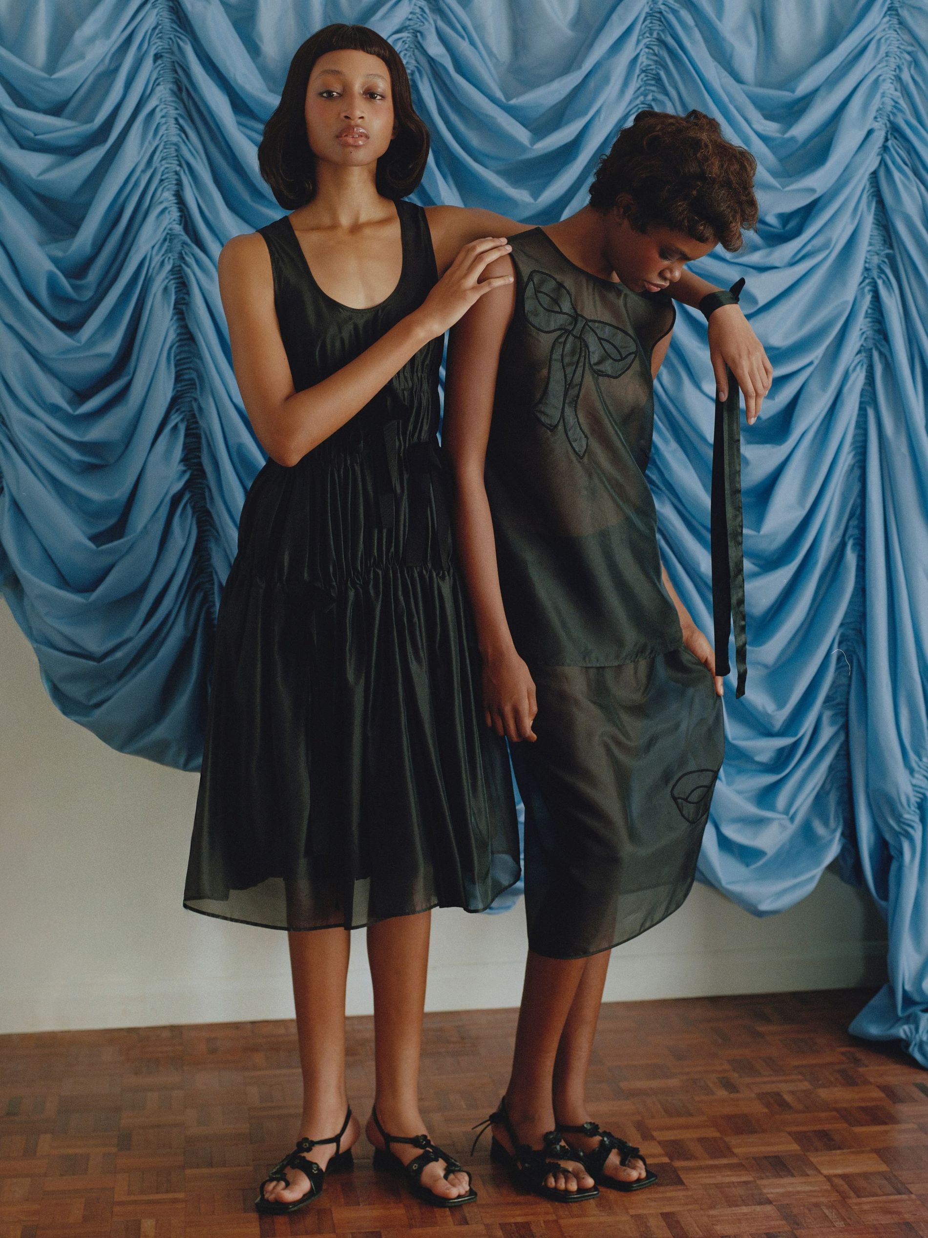Bows, forever objects of affection for Cecilie Bahnsen, were a topic in the issue of A Magazine she curated last year. “I don’t know if you’d call it a romantic pause, but [for pre-fall I] was looking at some of the things that I didn’t feel like I was finished talking about when we did [the magazine],” the designer said. “The bow story was really special to me and I wanted to kind of try and create a whole collection just around the bow.” Having done that, the collection became a collaboration with Nadine Ijewere, who photographed the lookbook around a romantic narrative of sisterhood and dressing up.