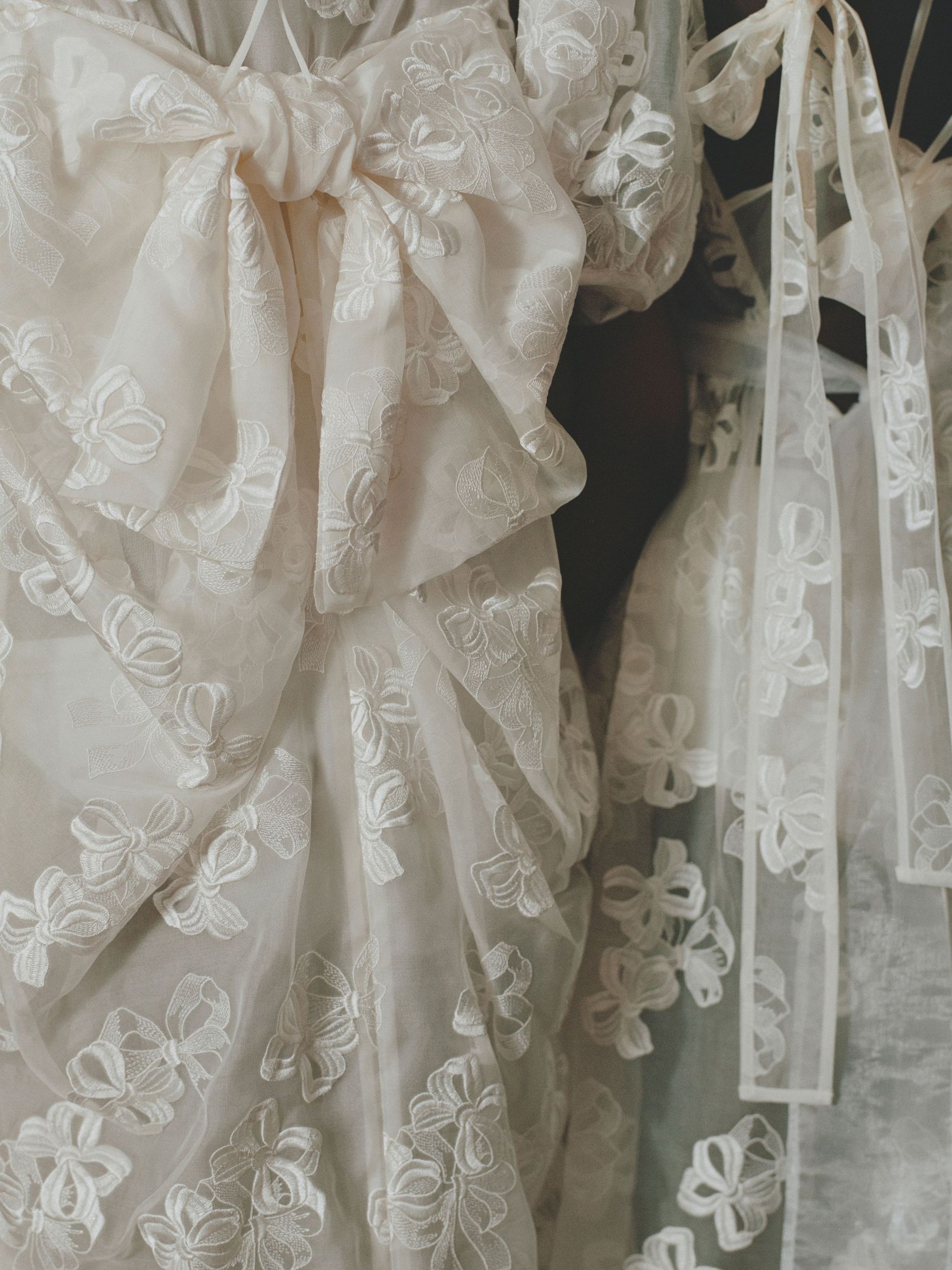 Bahnsen found many, many ways to tie a bow in this offering. They were woven, embroidered in different varieties, used as closures, sized big or super small and used in multiples. Among the poufier silhouettes a simple slip dress stood out. The designer said she chose not to use boning to make the pieces easier to wear. At the same time she challenged herself technically by integrating bows into the patternmaking, so what looks like something attached to a dress is actually built into it—much like a sense of romance is baked into all Bahnsen does.
