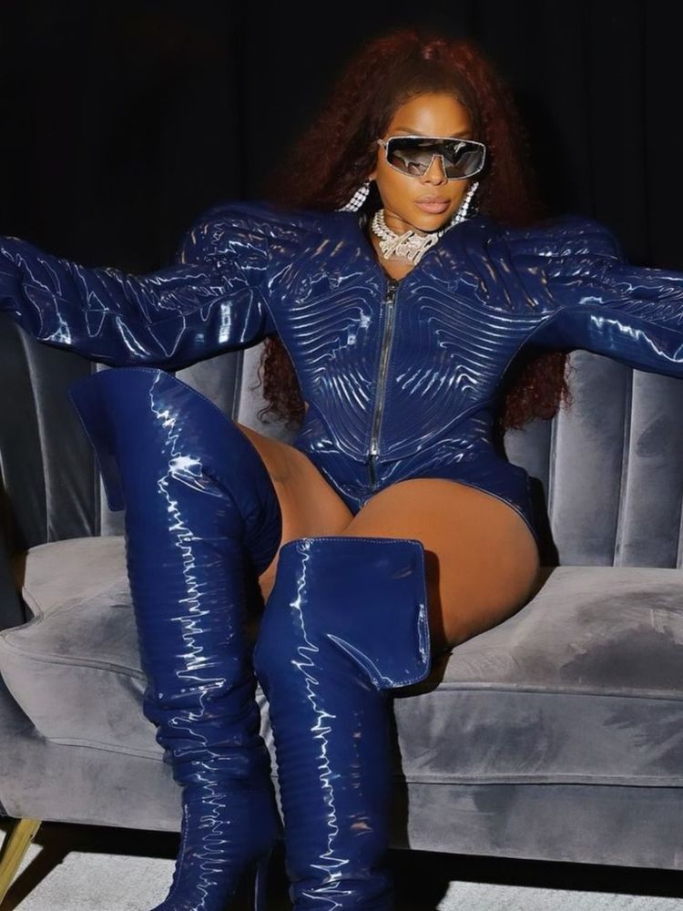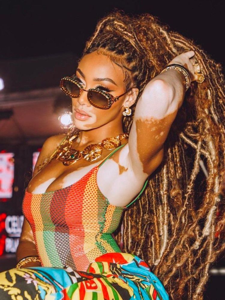 Model Winnie Harlow was spotted dancing in a pair of Anna-Karin Karlsson’s Billion $ Boo frames, their gem-encrusted finish mirroring the tones of her vibrant ensemble.