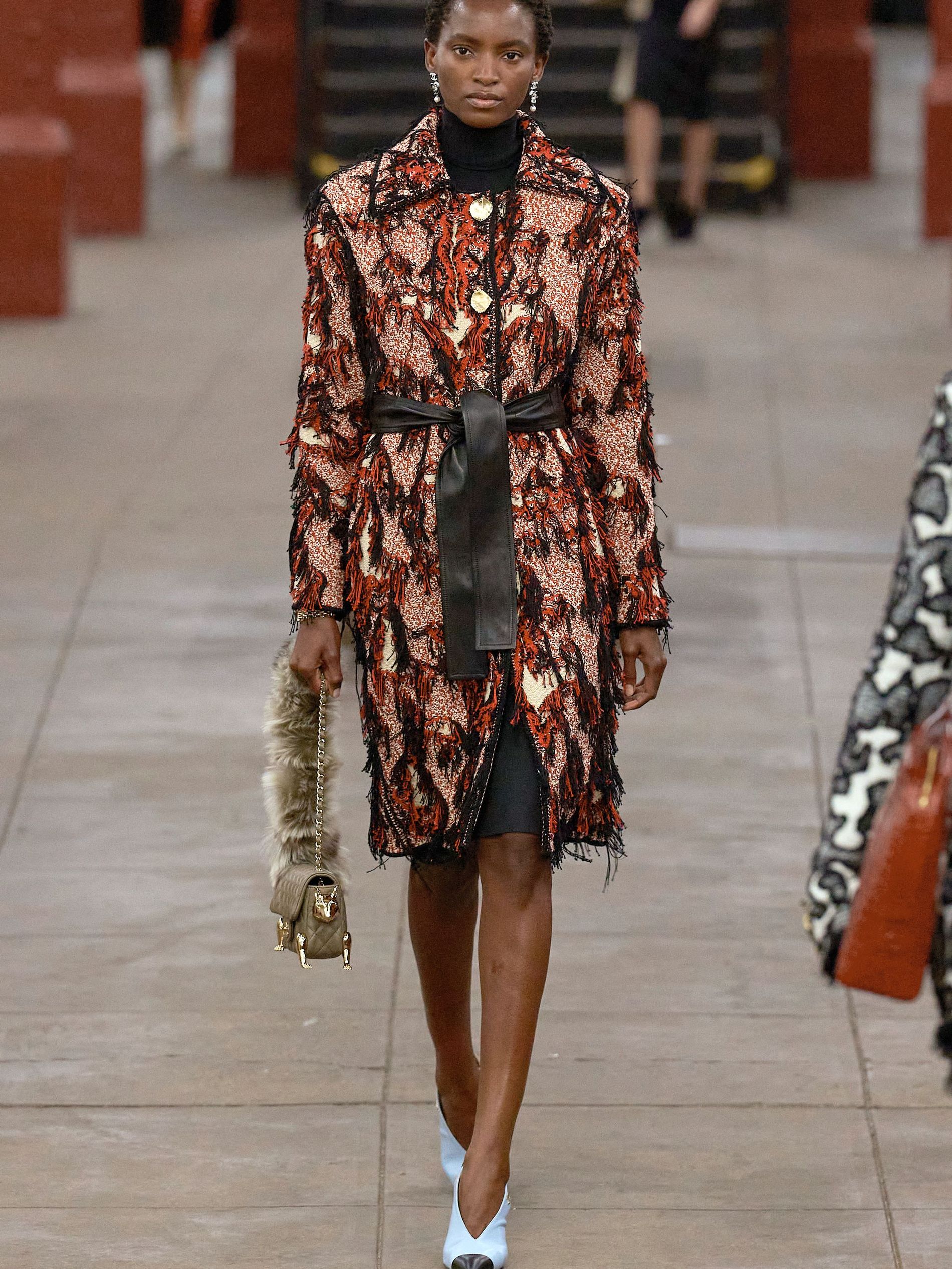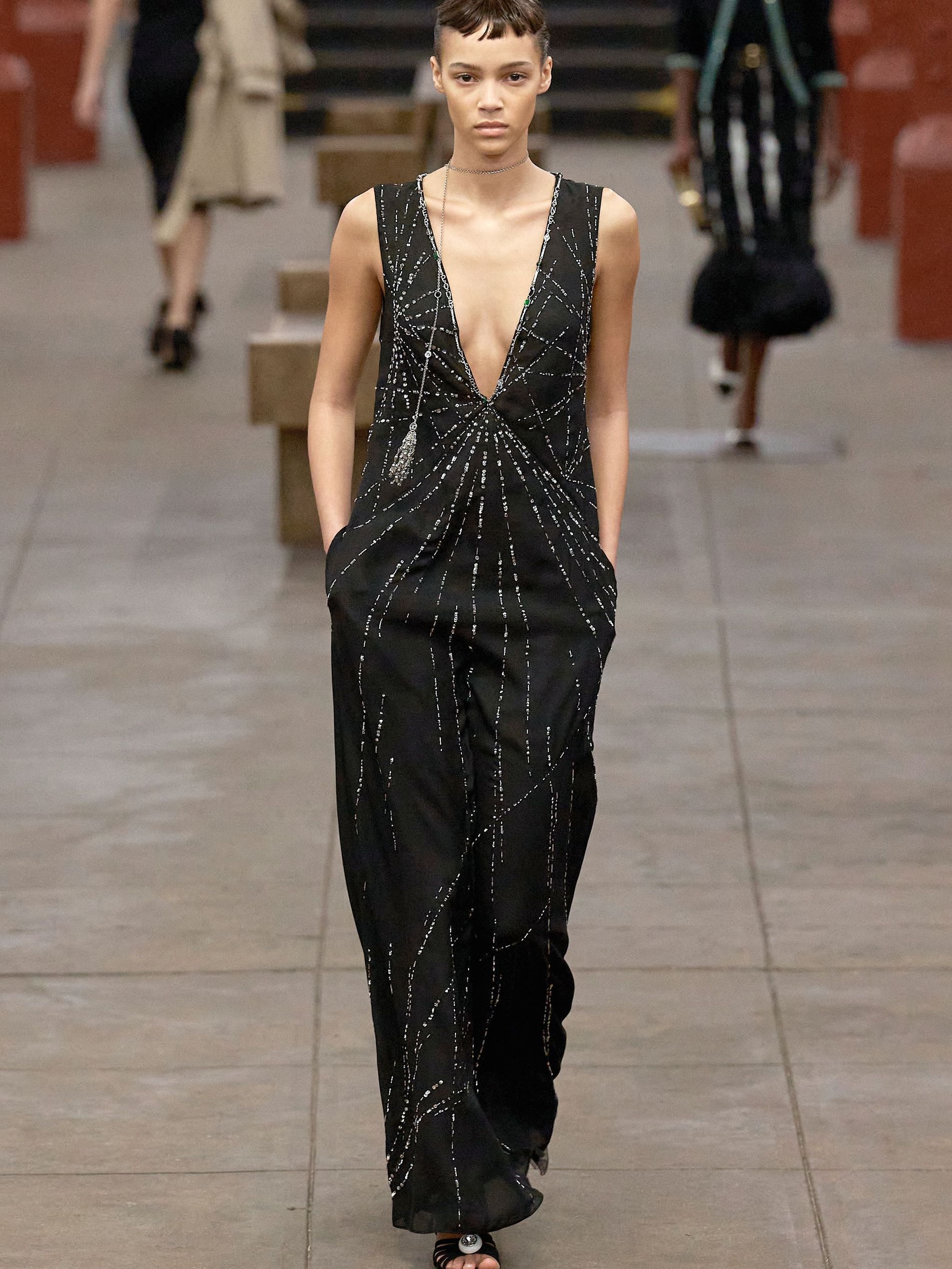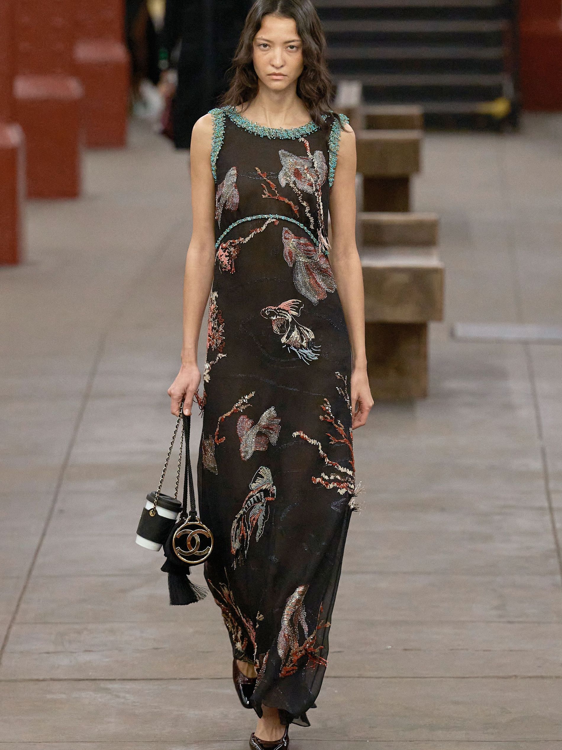 On the runway, with Blazy's steerage, this became a kind of cinematic street-casting. A student in “jeans” made of meticulously embroidered Lesage silk zipped by, followed by a ’70s journalist in a slouched coat, a power-suited ’80s executive, a new-school flapper glimmering with Lemarié feathers, and a society doyenne swathed in an opera cape. There was even something of a Coco stand-in – the woman in the bias-cut 1930s slip, embroidered by Montex with shimmering Art Deco fish. Even garment linings are meticulously decorated in honour of the Big Apple: deco birds, skyline silhouettes, Coco walking her dog down a Manhattan block.