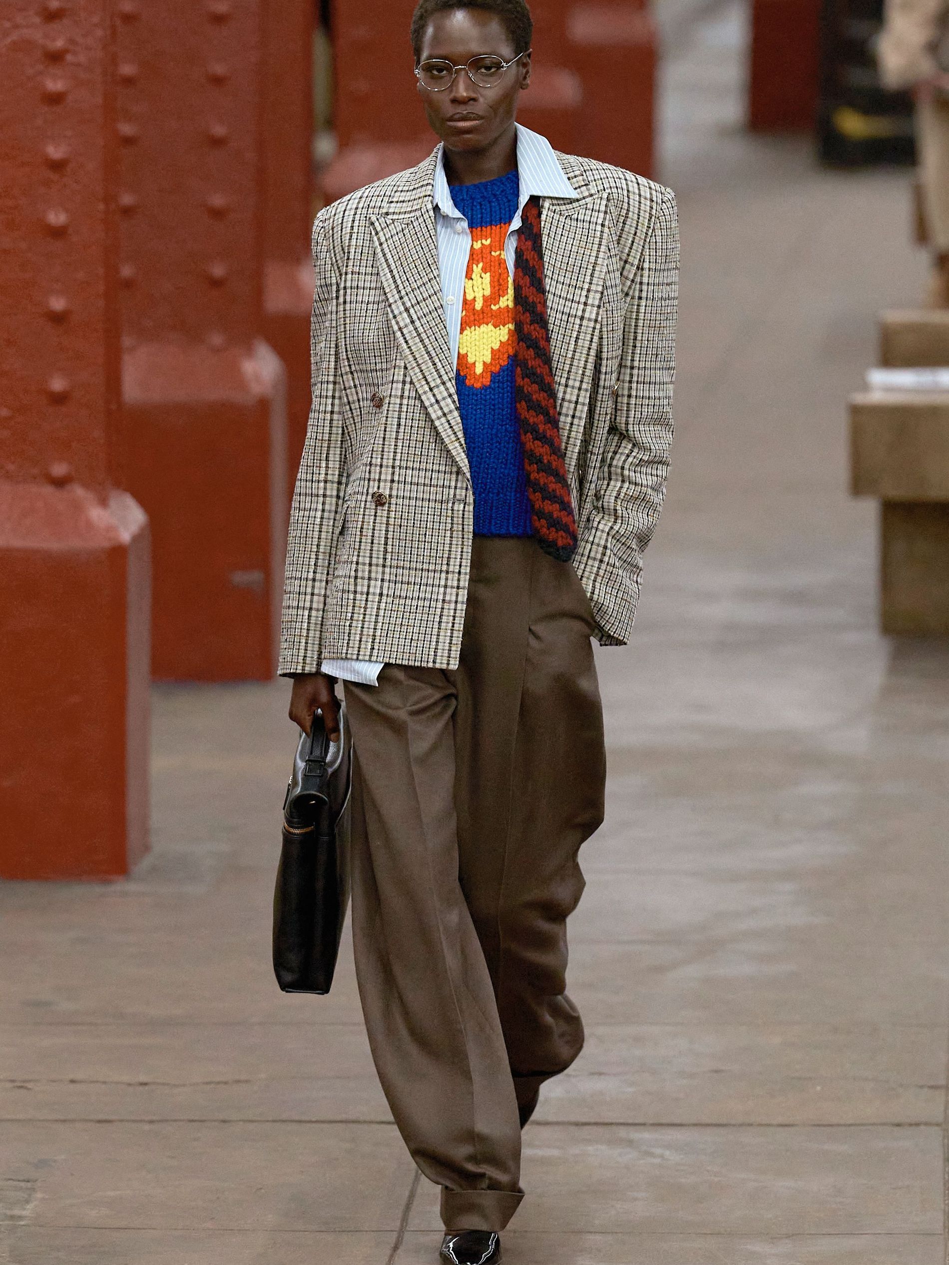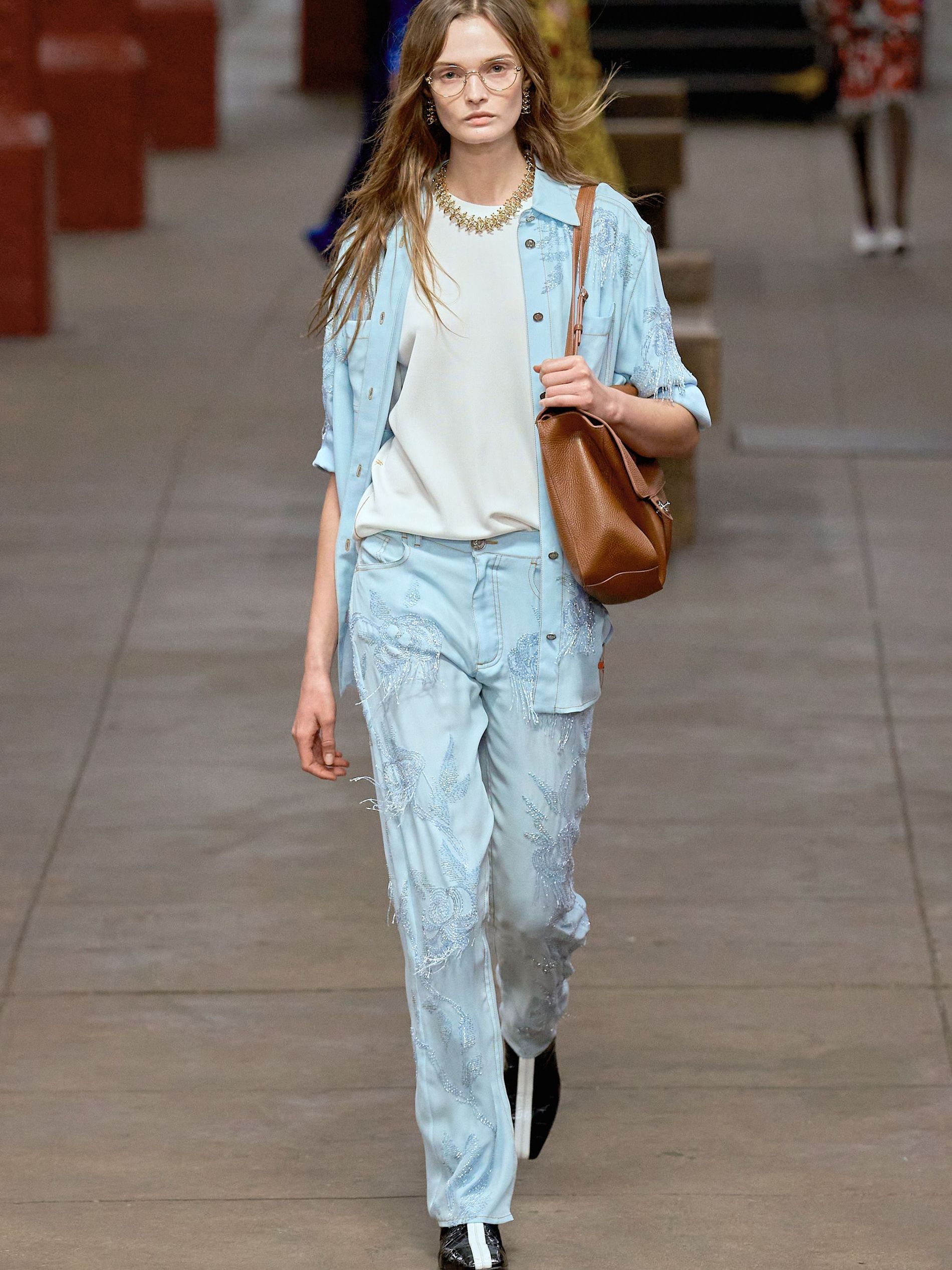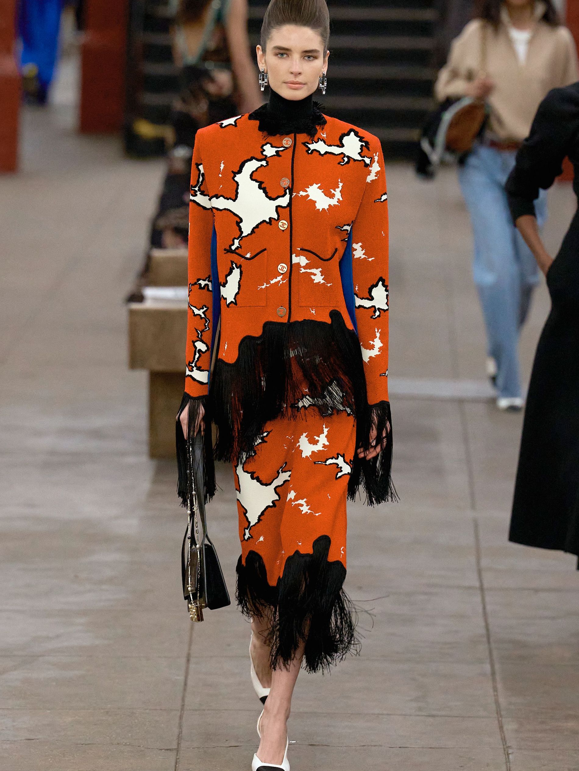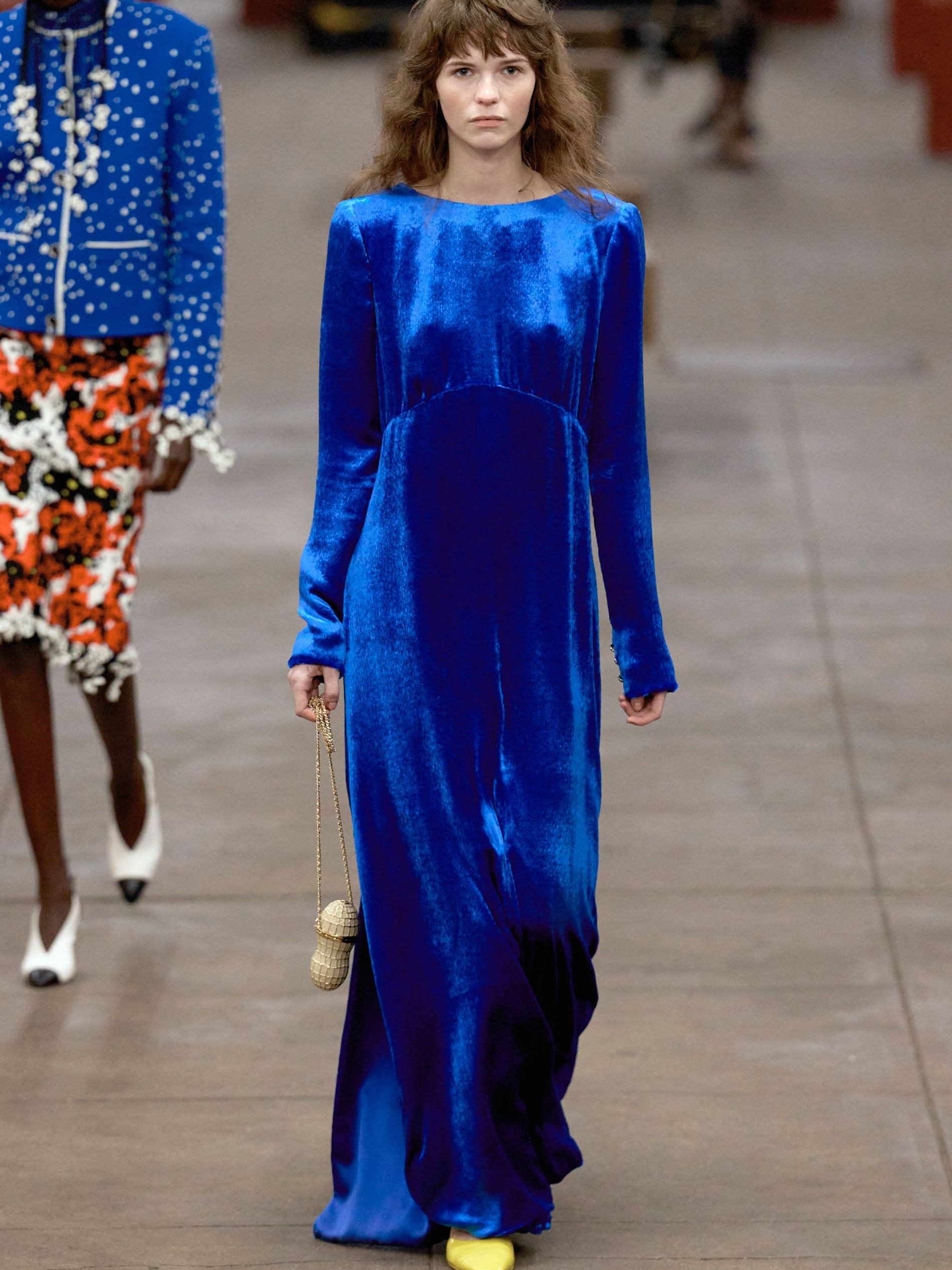 On the runway, with Blazy's steerage, this became a kind of cinematic street-casting. A student in “jeans” made of meticulously embroidered Lesage silk zipped by, followed by a ’70s journalist in a slouched coat, a power-suited ’80s executive, a new-school flapper glimmering with Lemarié feathers, and a society doyenne swathed in an opera cape. There was even something of a Coco stand-in – the woman in the bias-cut 1930s slip, embroidered by Montex with shimmering Art Deco fish. Even garment linings are meticulously decorated in honour of the Big Apple: deco birds, skyline silhouettes, Coco walking her dog down a Manhattan block.