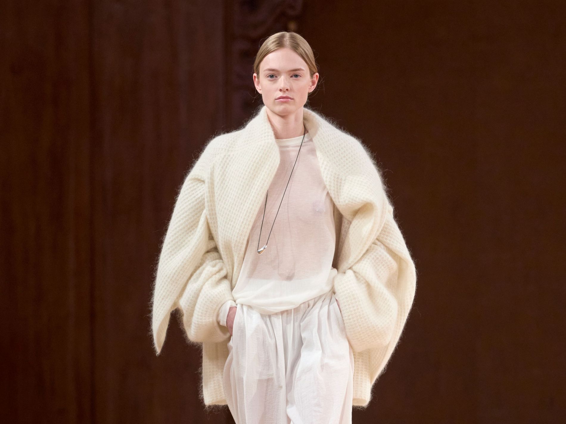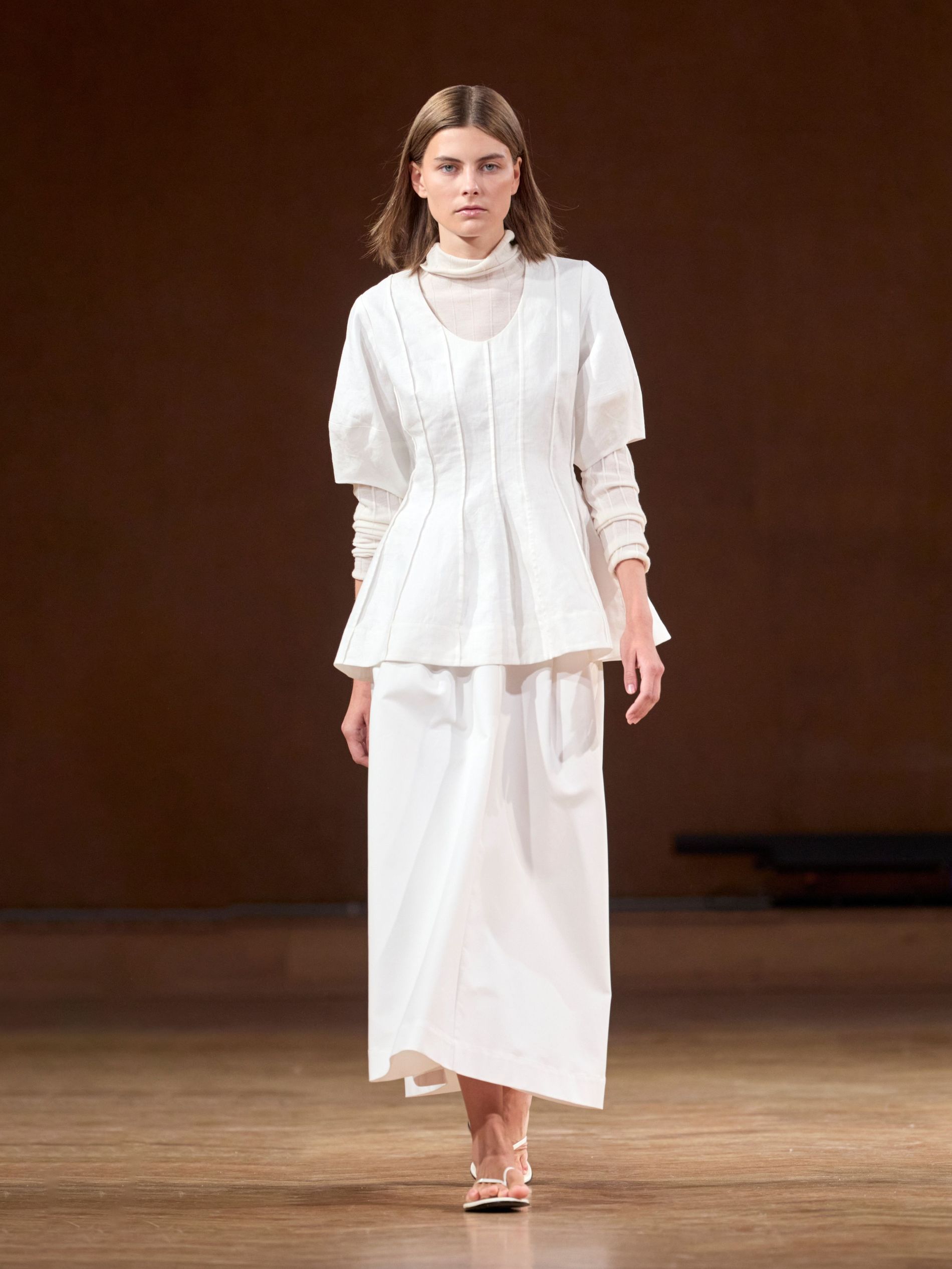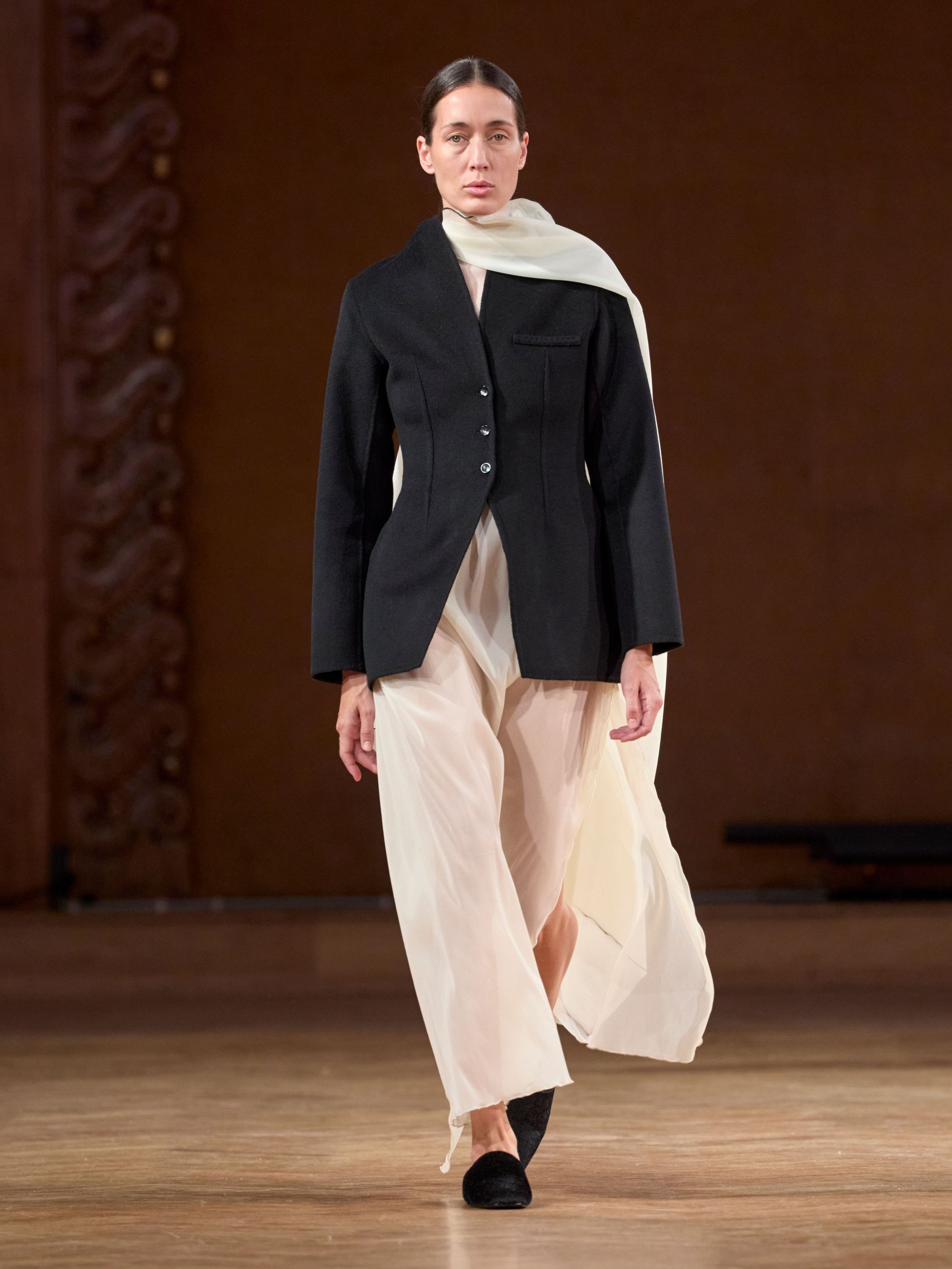 These delicate pieces are juxtaposed against sturdier silhouettes. “We continue to explore the delicate tension between softness and structure, stillness and motion,” says Aks. “The shell, with its silent resilience, layered shimmer, and organic geometry, became a central metaphor.” A stiff black blazer, for instance, with a lovely fluid waist is met with a sheer ankle-grazing white skirt and a light-as-air scarf wrapped around the neck. As a final touch, many of the delicate knit and organza pieces feature a wave-like finish. The looks are completed with jewellery crafted in collaboration with local brand Studio Bille: gleaming pendants and shells one might find washed up on the beach.