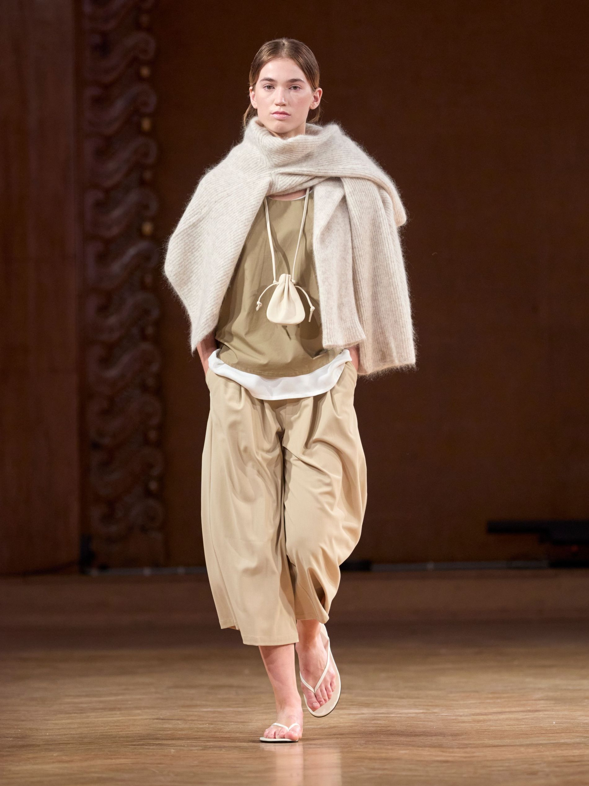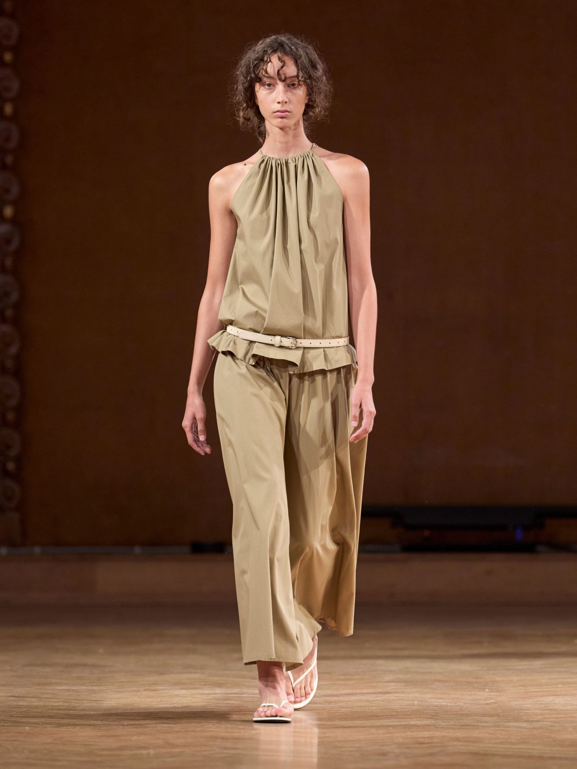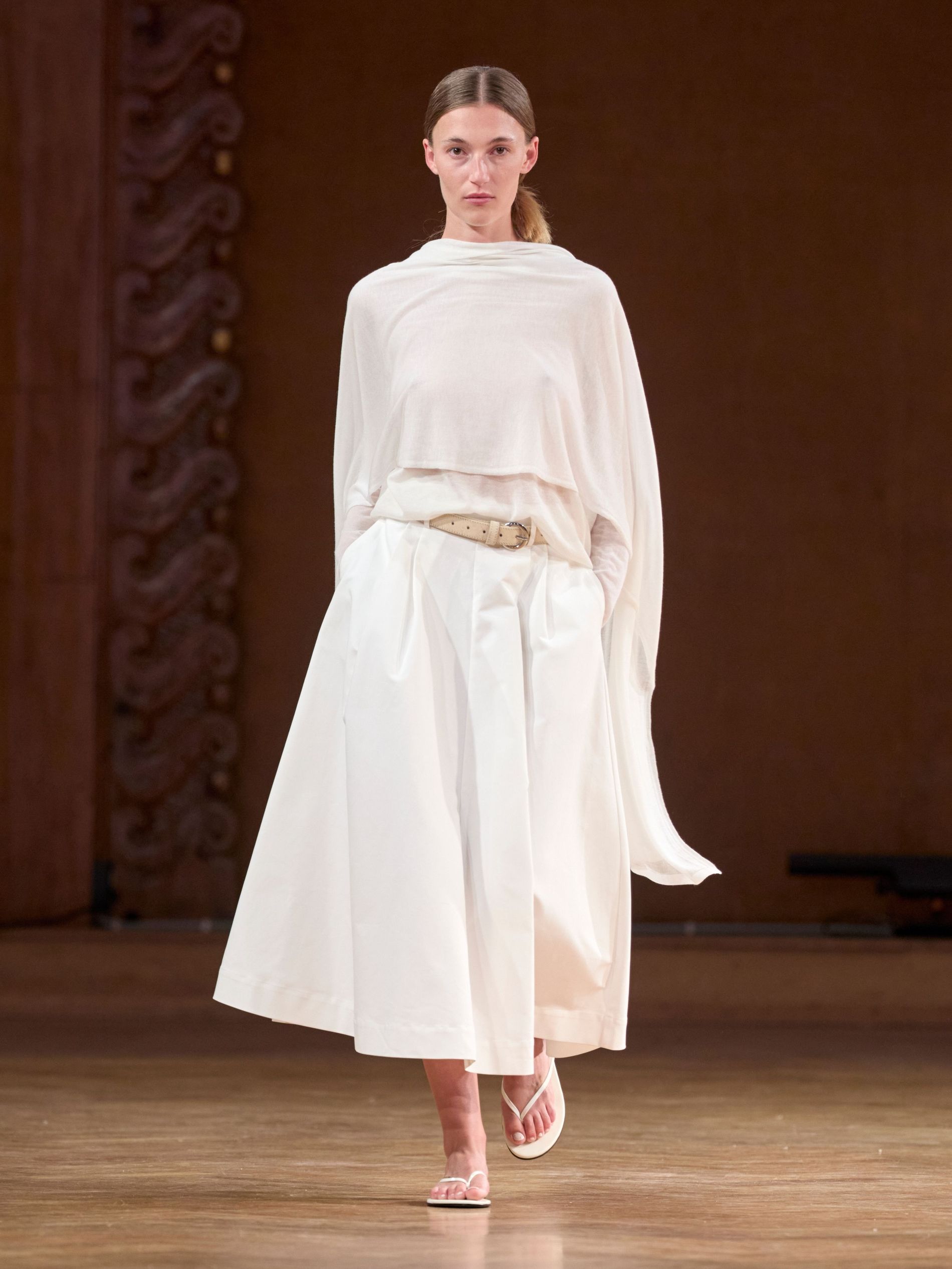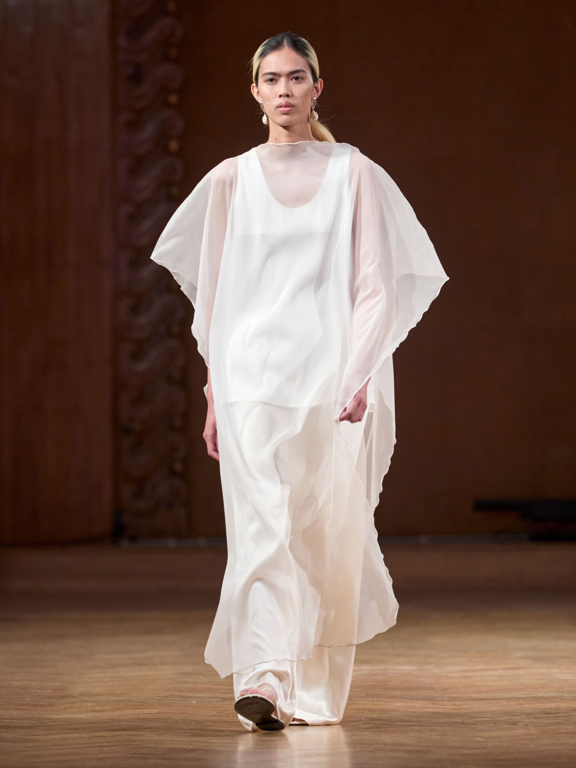 Aks, however, didn’t stage his show against the backdrop of the sea (perhaps that would have been a bit on the nose). Instead, he showed the collection, dubbed ‘TIDES’, in a more imposing space: a majestic hall dating back to the late 1800s with stunning fresco paintings along its walls. “We wanted a venue that carried a sense of history and grandeur, to act as a counterpoint to the light, floating, almost ephemeral quality of the clothes,” says Aks. “The contrast between the monumental space and the delicate garments emphasised the quiet force of the collection.”