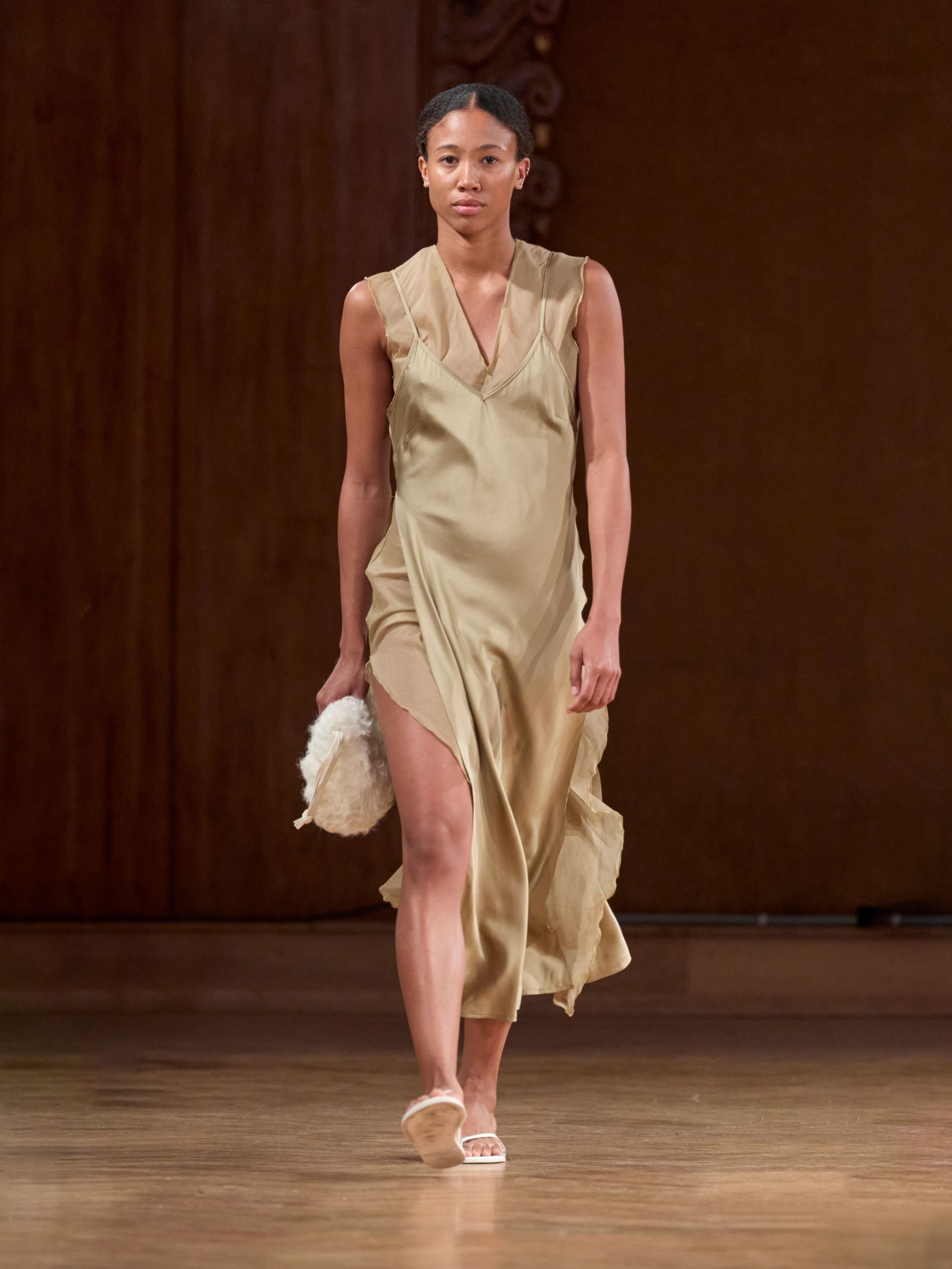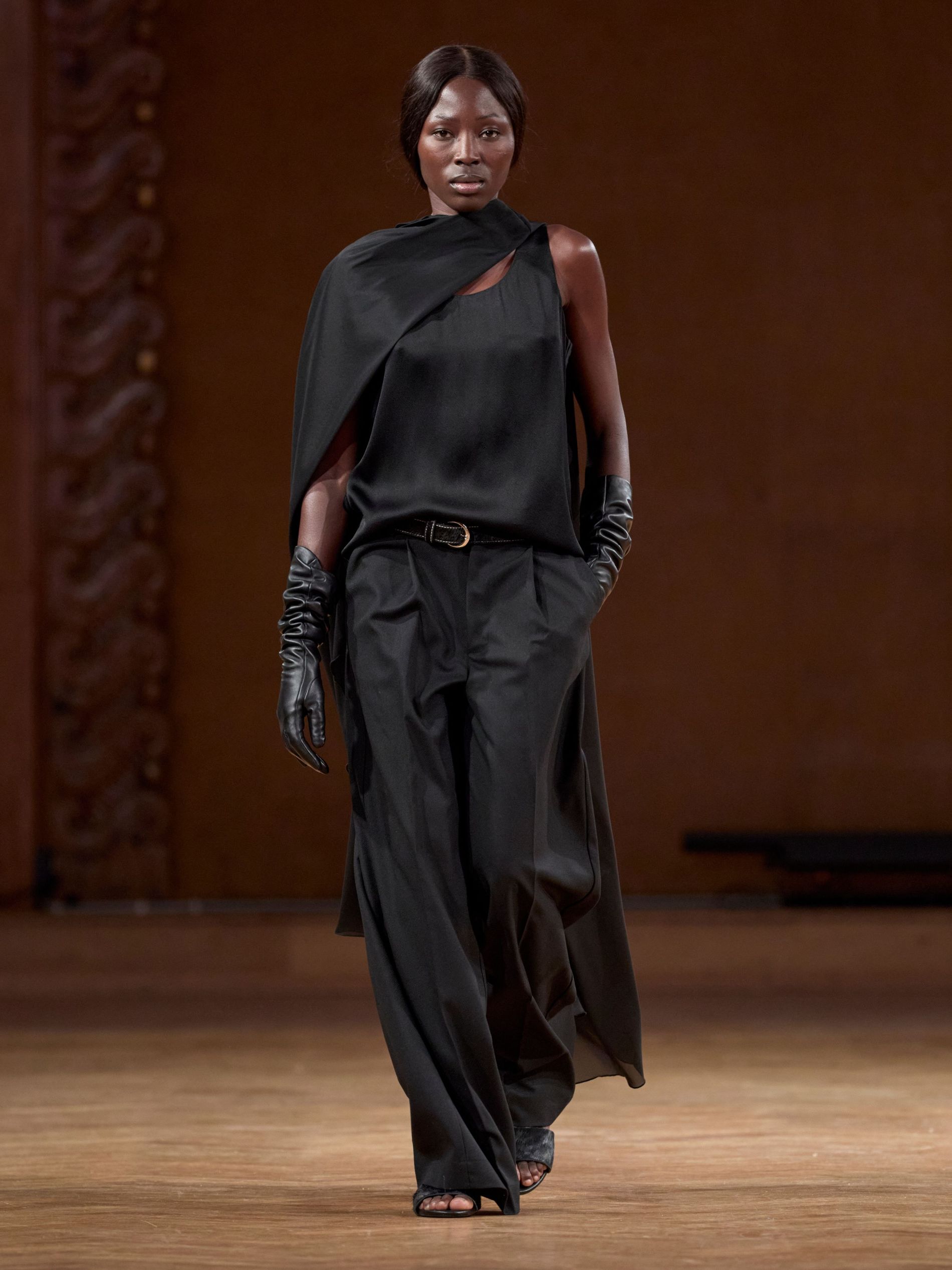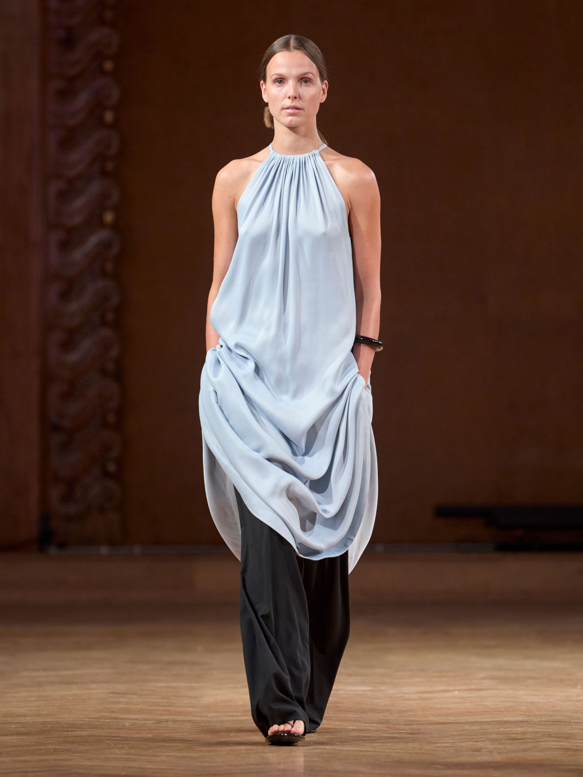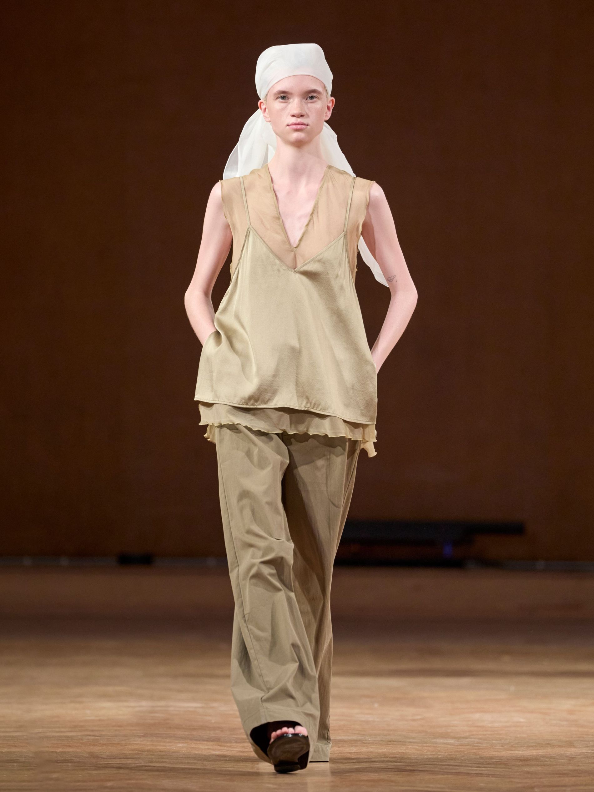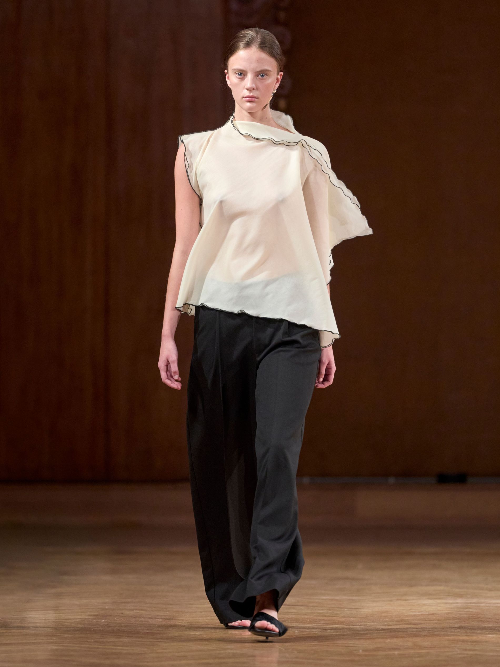 Aks, however, didn’t stage his show against the backdrop of the sea (perhaps that would have been a bit on the nose). Instead, he showed the collection, dubbed ‘TIDES’, in a more imposing space: a majestic hall dating back to the late 1800s with stunning fresco paintings along its walls. “We wanted a venue that carried a sense of history and grandeur, to act as a counterpoint to the light, floating, almost ephemeral quality of the clothes,” says Aks. “The contrast between the monumental space and the delicate garments emphasised the quiet force of the collection.”