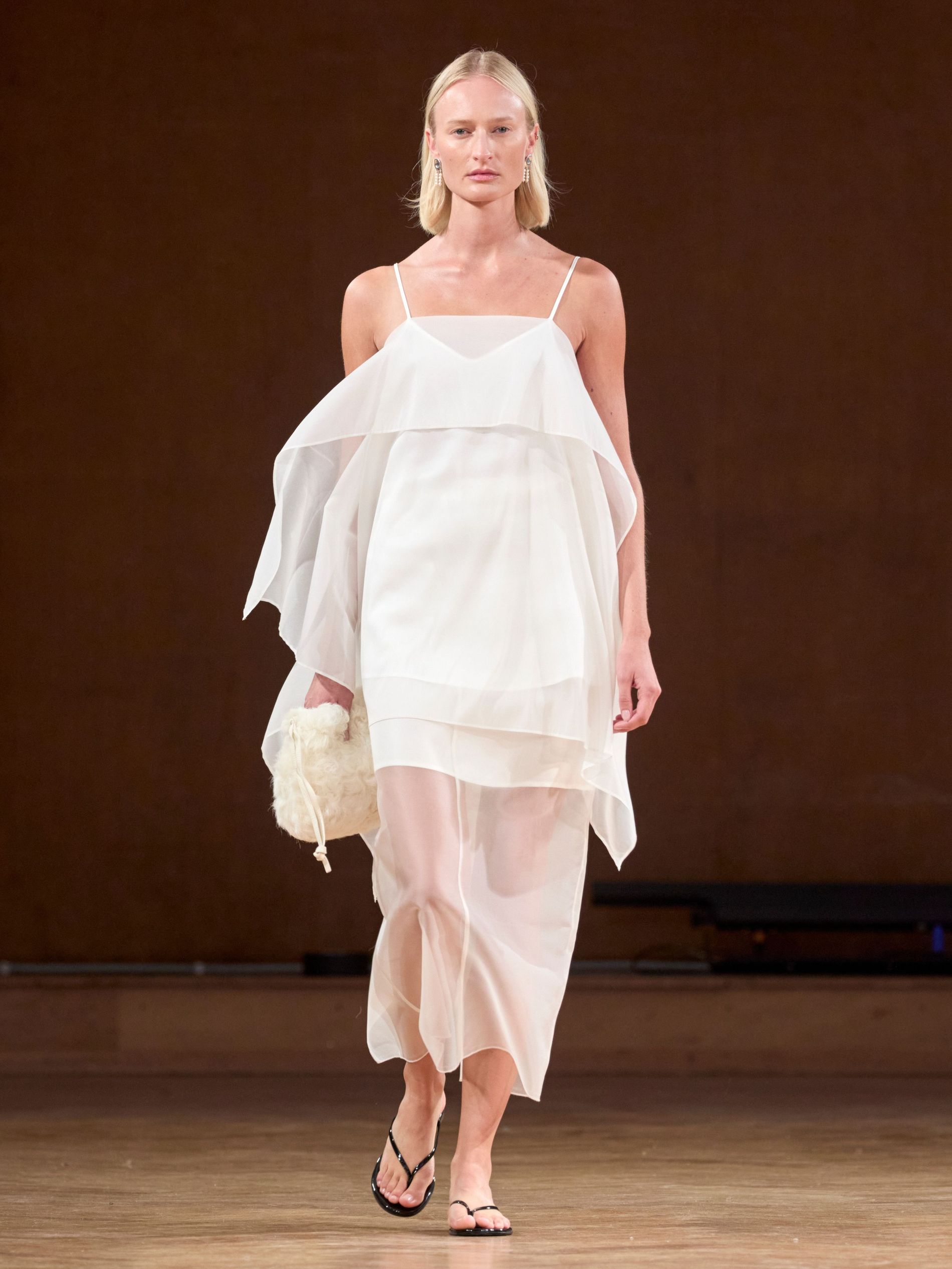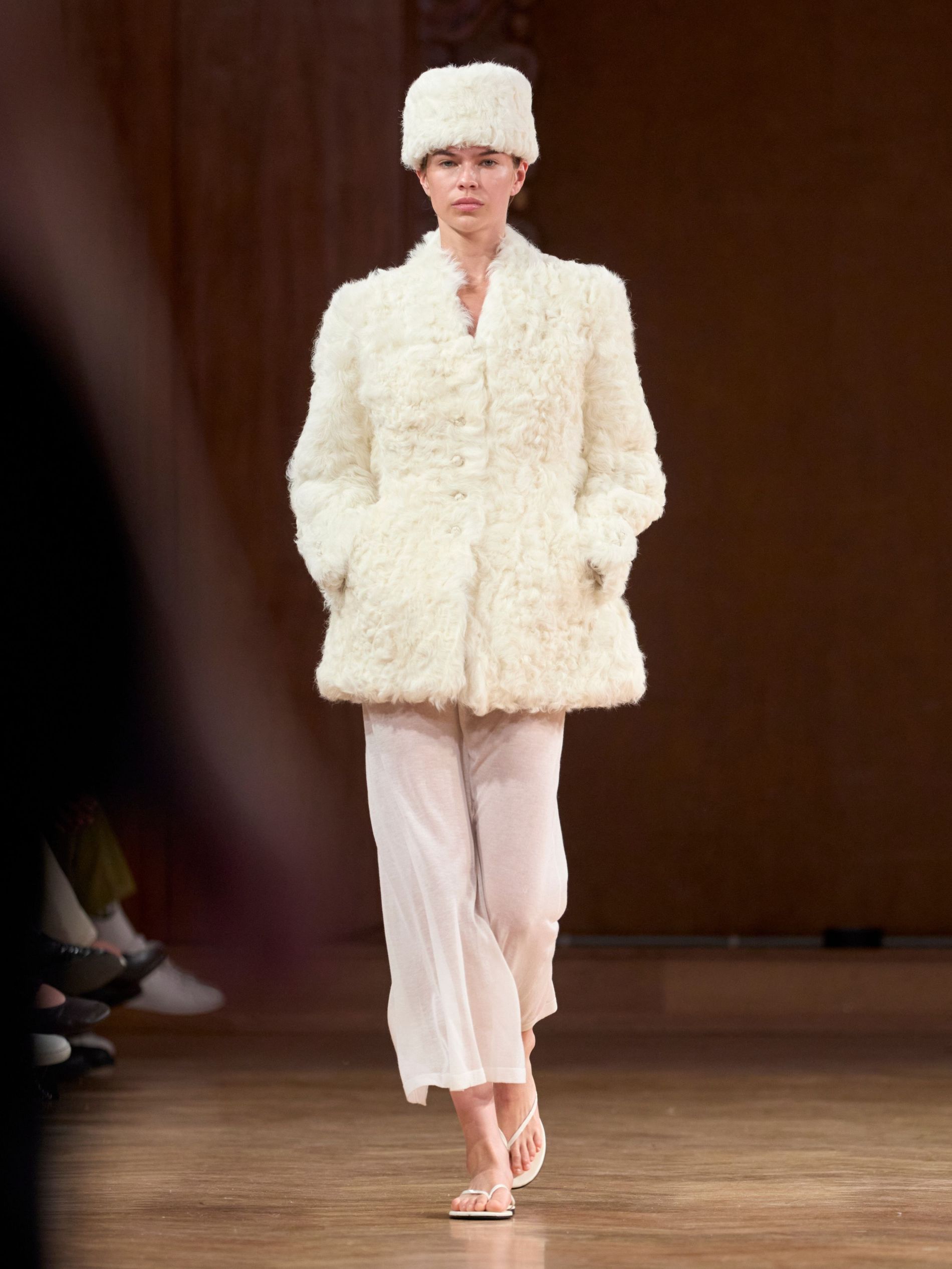 "Light, floating, ephemeral”: they are just the words to describe these garments. Creamy organza frocks reflect the sense of floating on the rolling waves. The material, sometimes wrapped gently around the shoulders, is so light, as models make their way down the runway it gives the illusion of wind hitting them on a gusty beach. Elsewhere, a fluffy white shearling jacket, nipped at the waist, with a matching pillbox hat evokes the notion of foam gathering on the shoreline.
