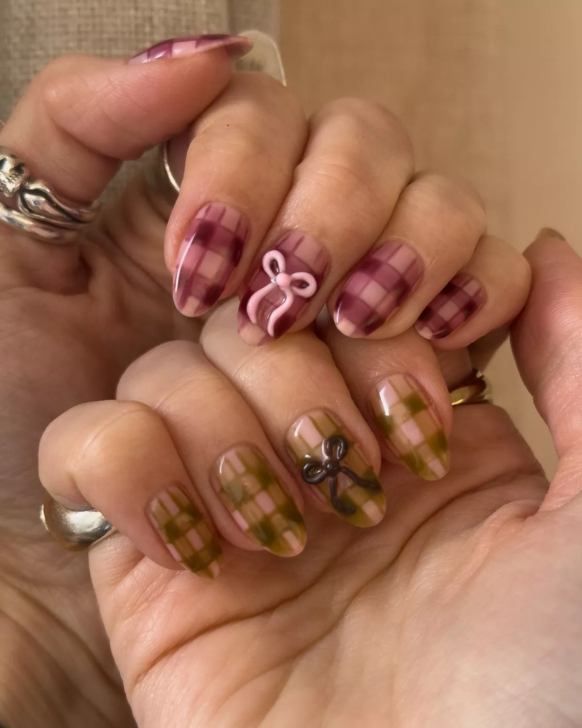 Coordinate your Christmas PJs with tartan tips and checkered nails – already tapped as a must-try trend for 2026 by Hailey Bieber’s nail artist. This sophisticated, plaid mani features subtly festive tones, perfectly finished with a preppy bow for all of the season's celebrations.
