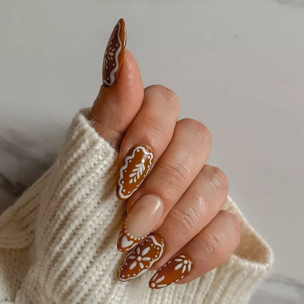 Sugar, spice, and everything nice: this festive manicure is a delicious invitation to evoke the cosy charm of a classic gingerbread house. Unfortunately, it won’t come with that freshly baked smell we all love and adore.