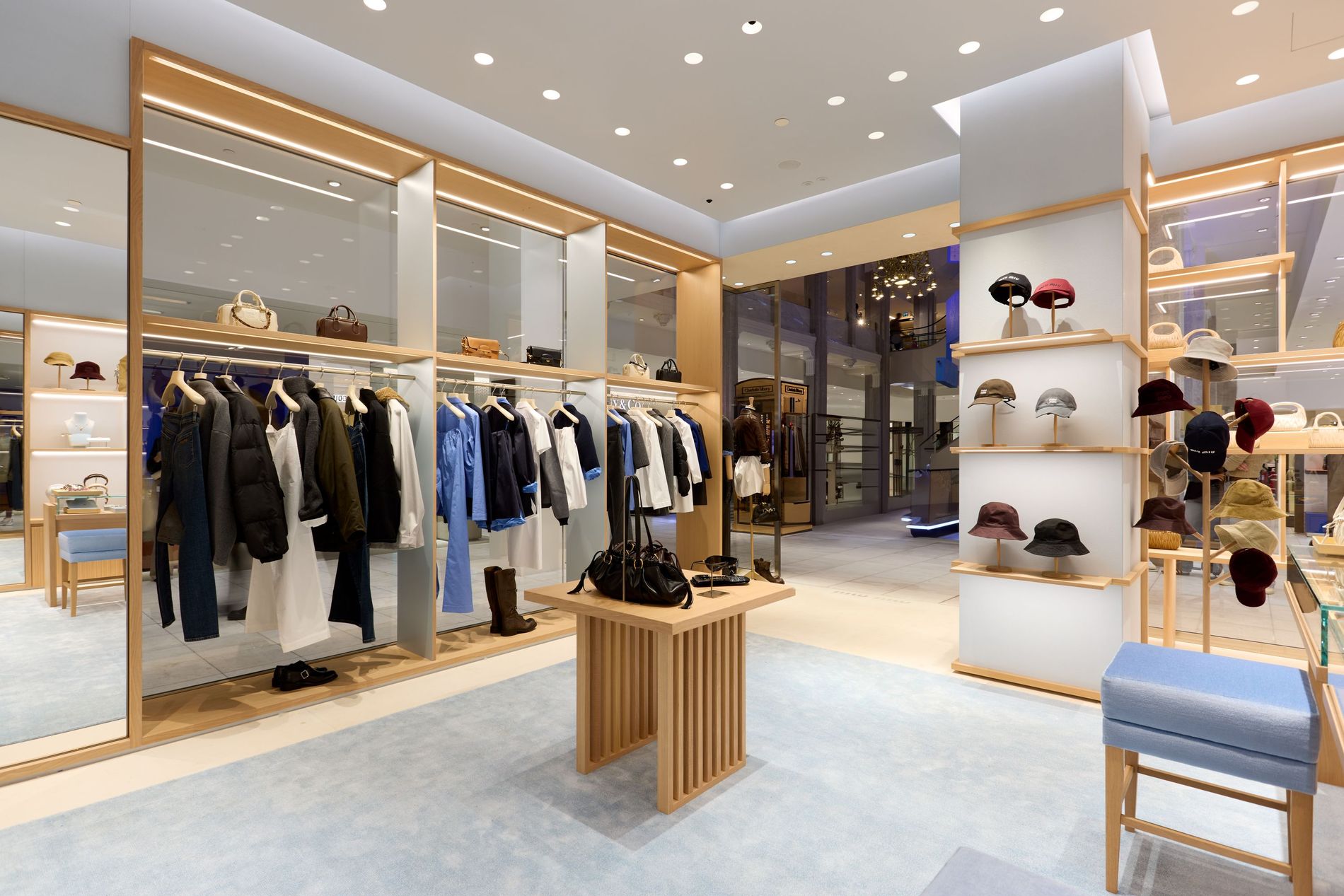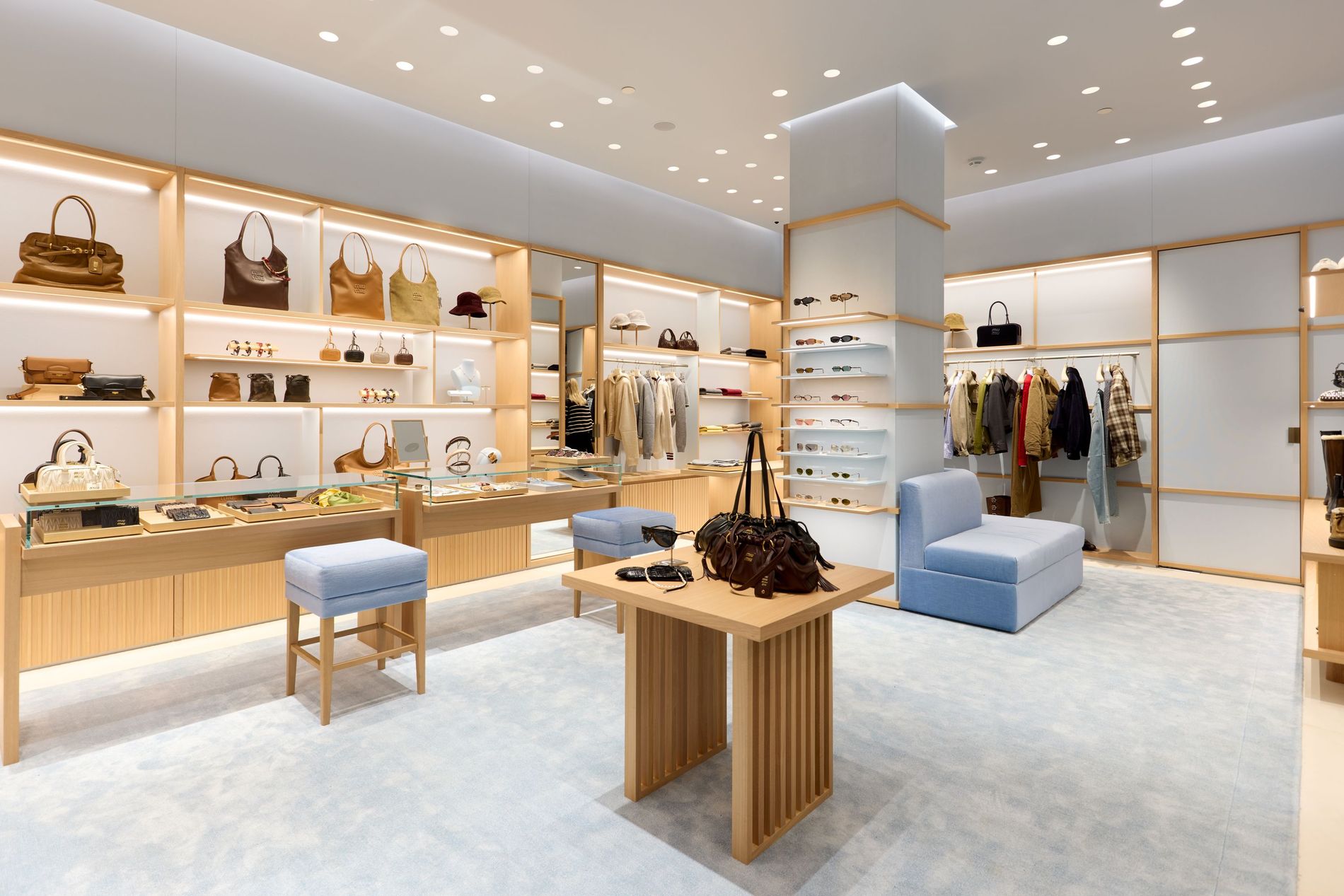 Visitors to the store are enveloped in soft blue surrounds, offset by wooden furnishings, limestone flooring and glass finishes to harmonious effect. The calming scene is enhanced all the more by sleek stools and sofas, rendered in a coordinating sky-blue hue. These cosy additions create an enticing ambience, where shoppers can sit, relax and peruse the already available array of ready-to-wear pieces, handbags, and footwear – just in time for an autumnal wardrobe revamp.