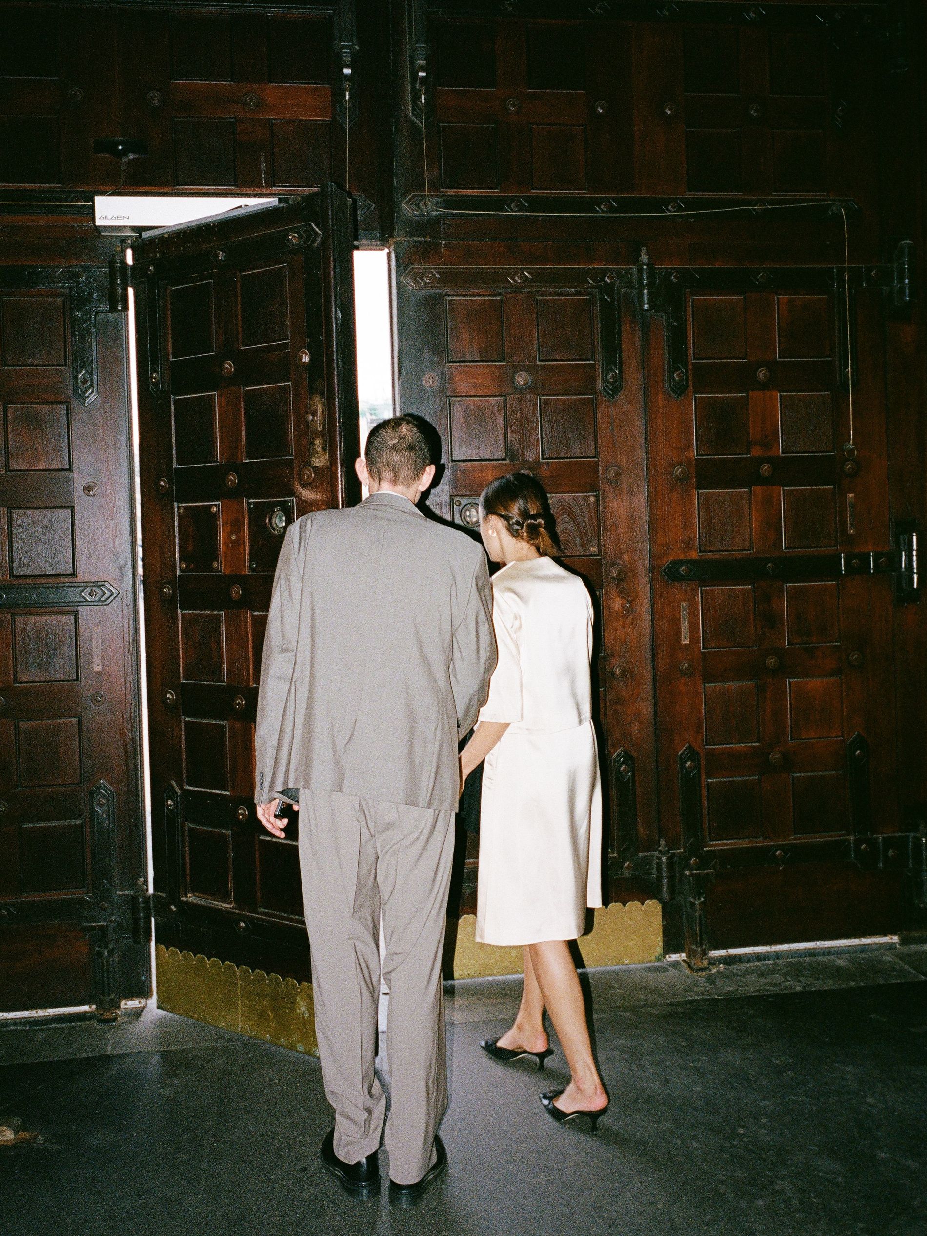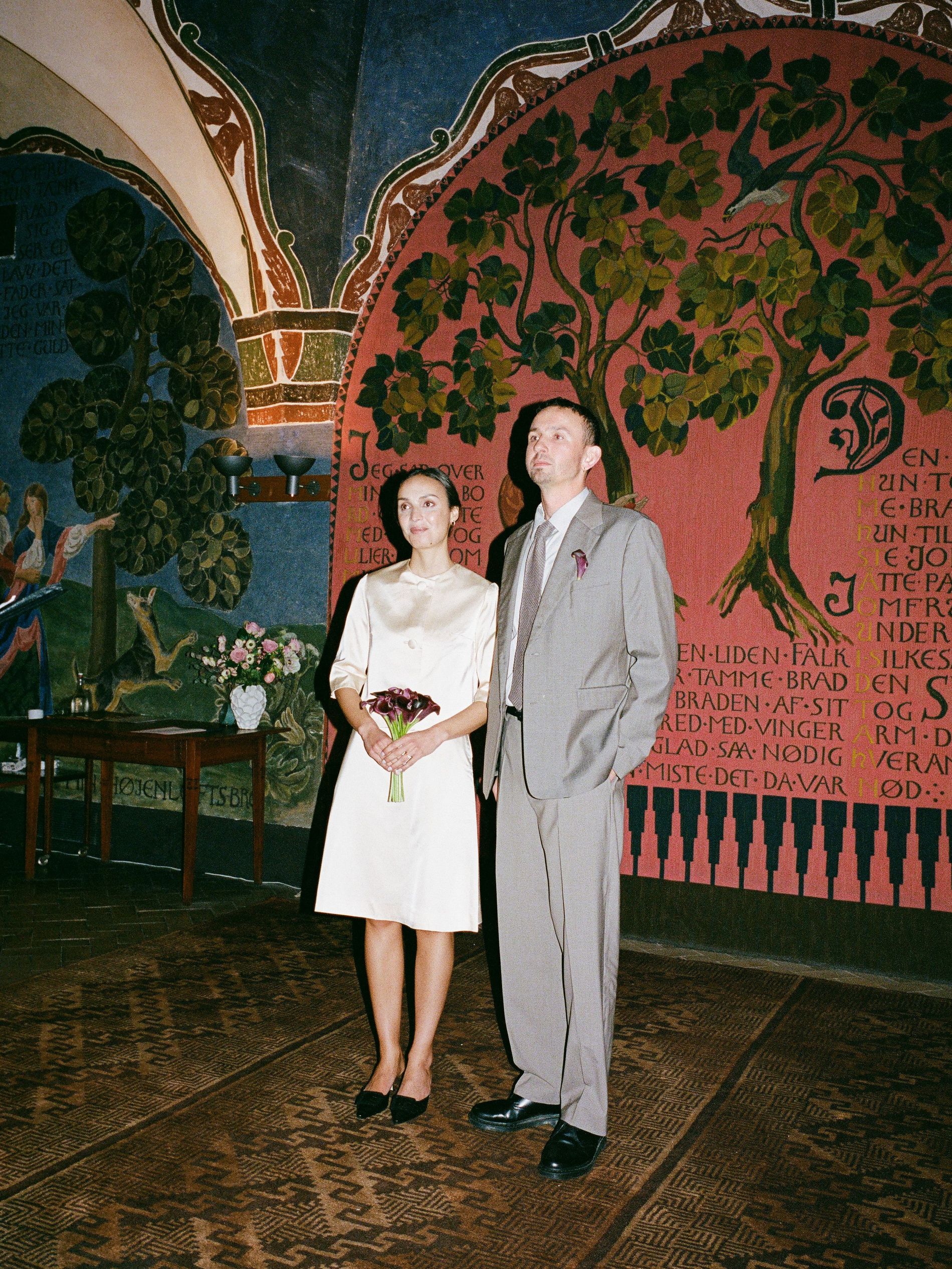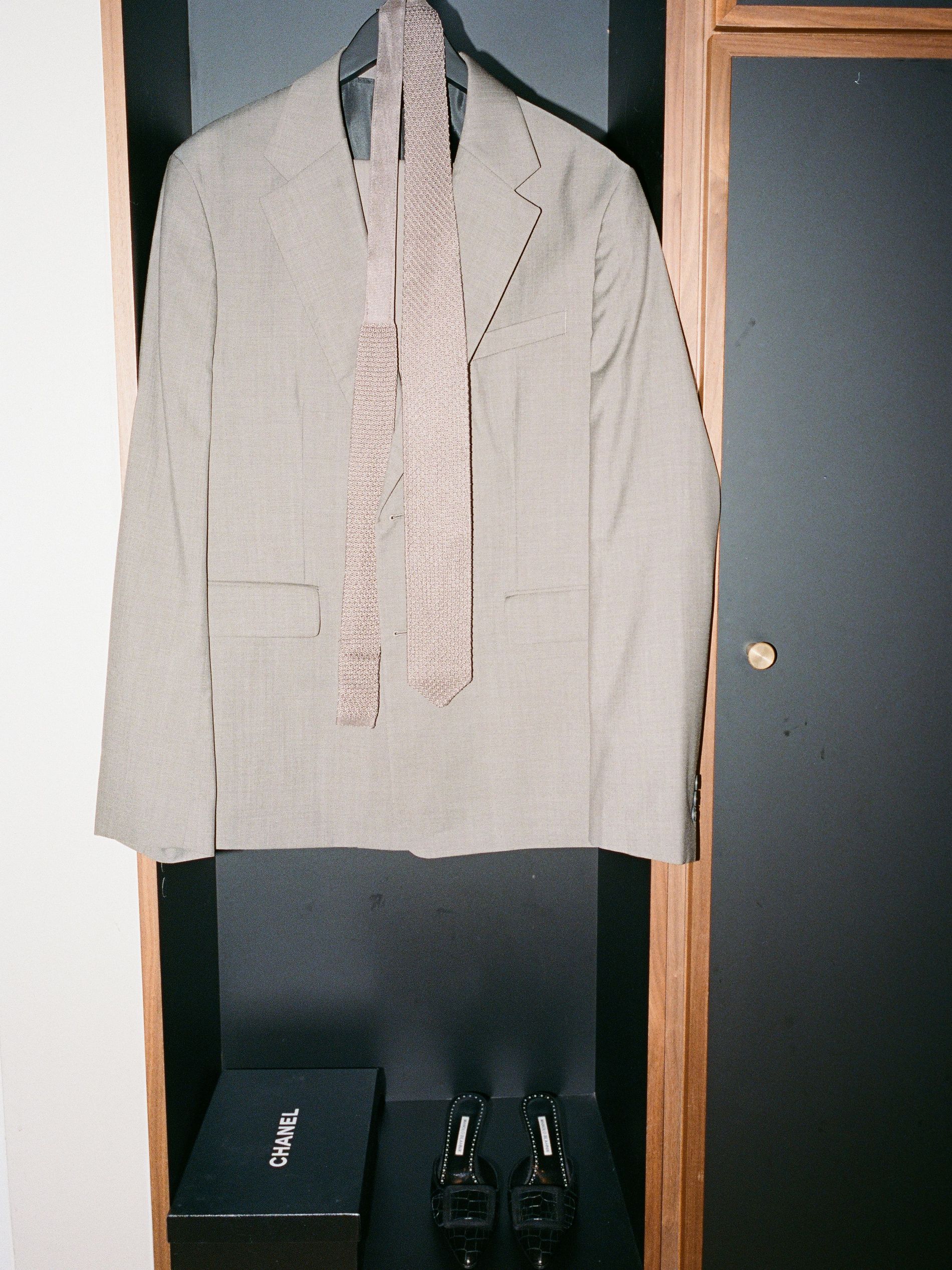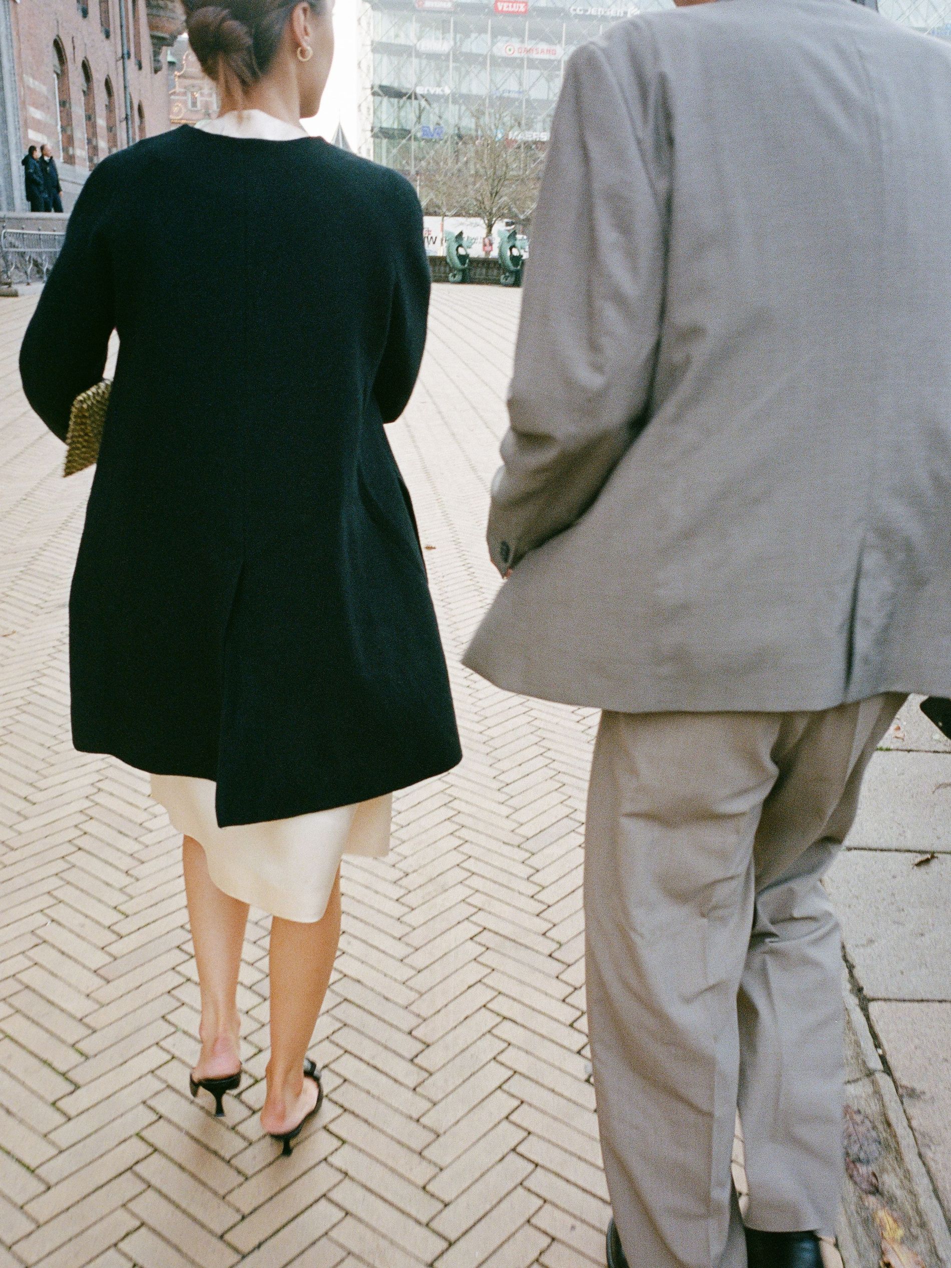For the wedding, Lasse’s look was decided quickly: a grey-olive suit from Mfpen, a brand already in his wardrobe. “He’s very decisive,” Sarah says. “Once he knows, he knows.” Her own outfit took more work – and more urgency. With a clear idea of something tailored and ’60s-leaning, she spent the days after work visiting vintage shops across Copenhagen. “I was popping in everywhere,” she says. “On the way to the supermarket, after a run, on walks. The salespeople were stressed on my behalf.”
