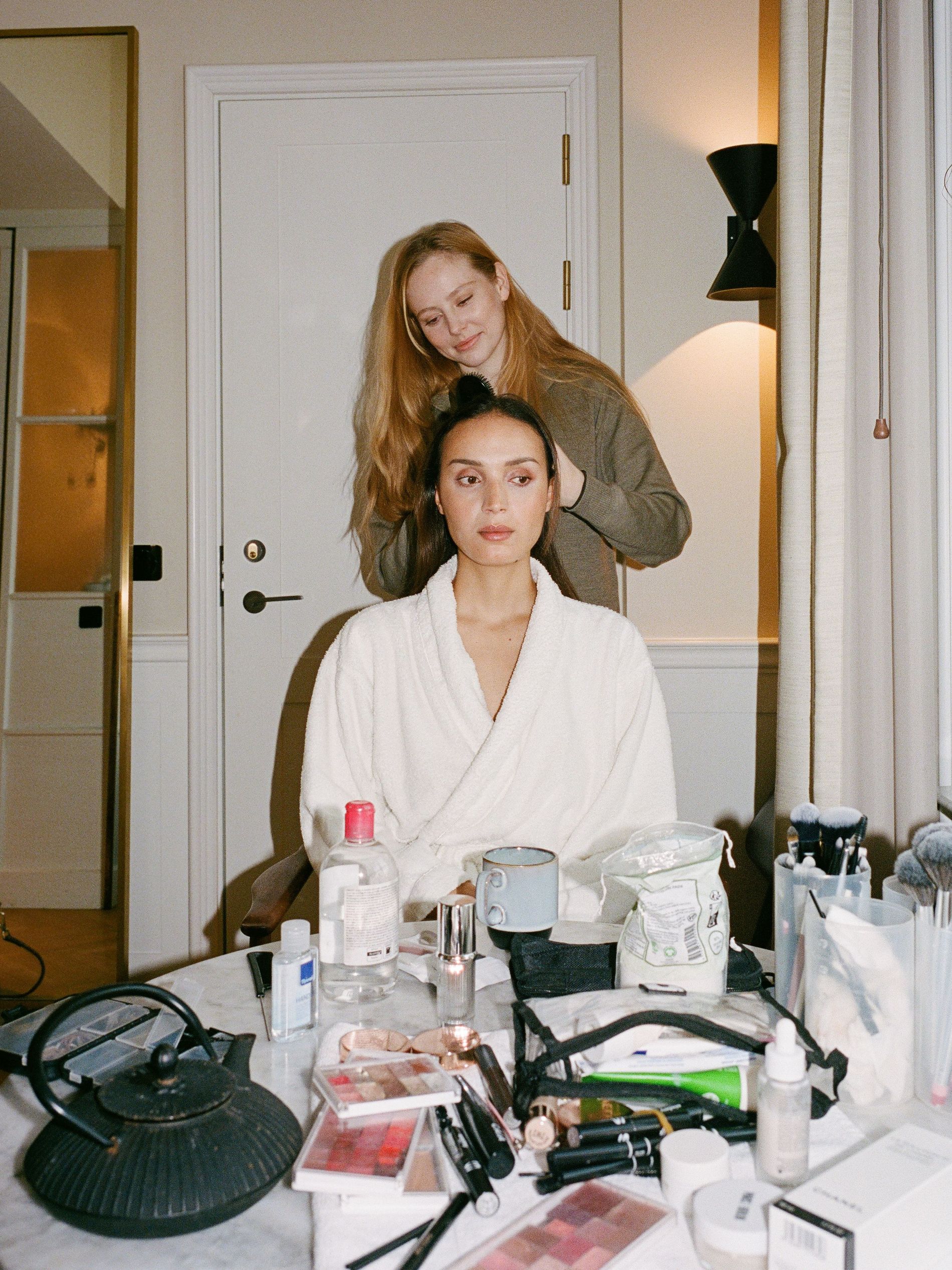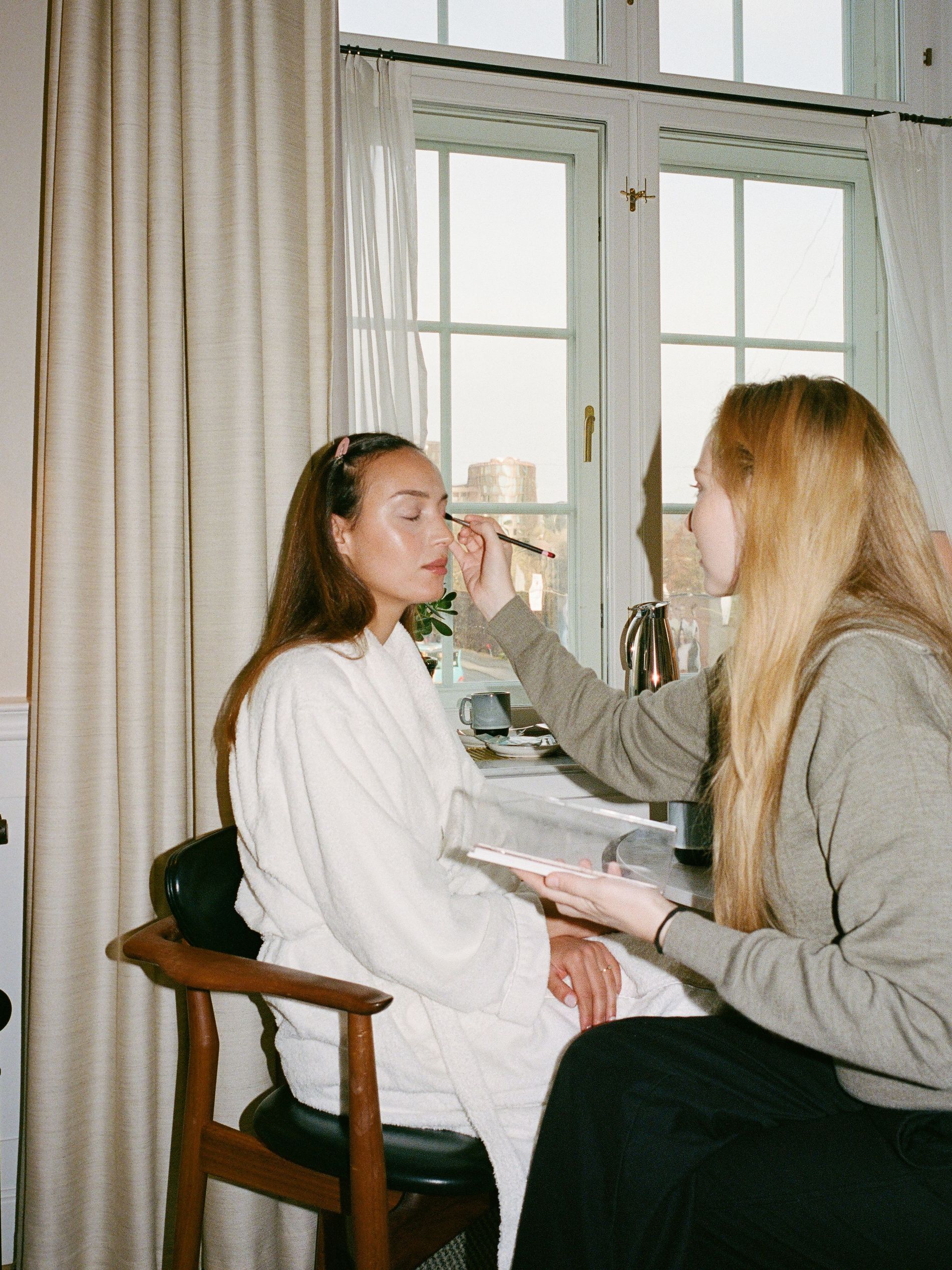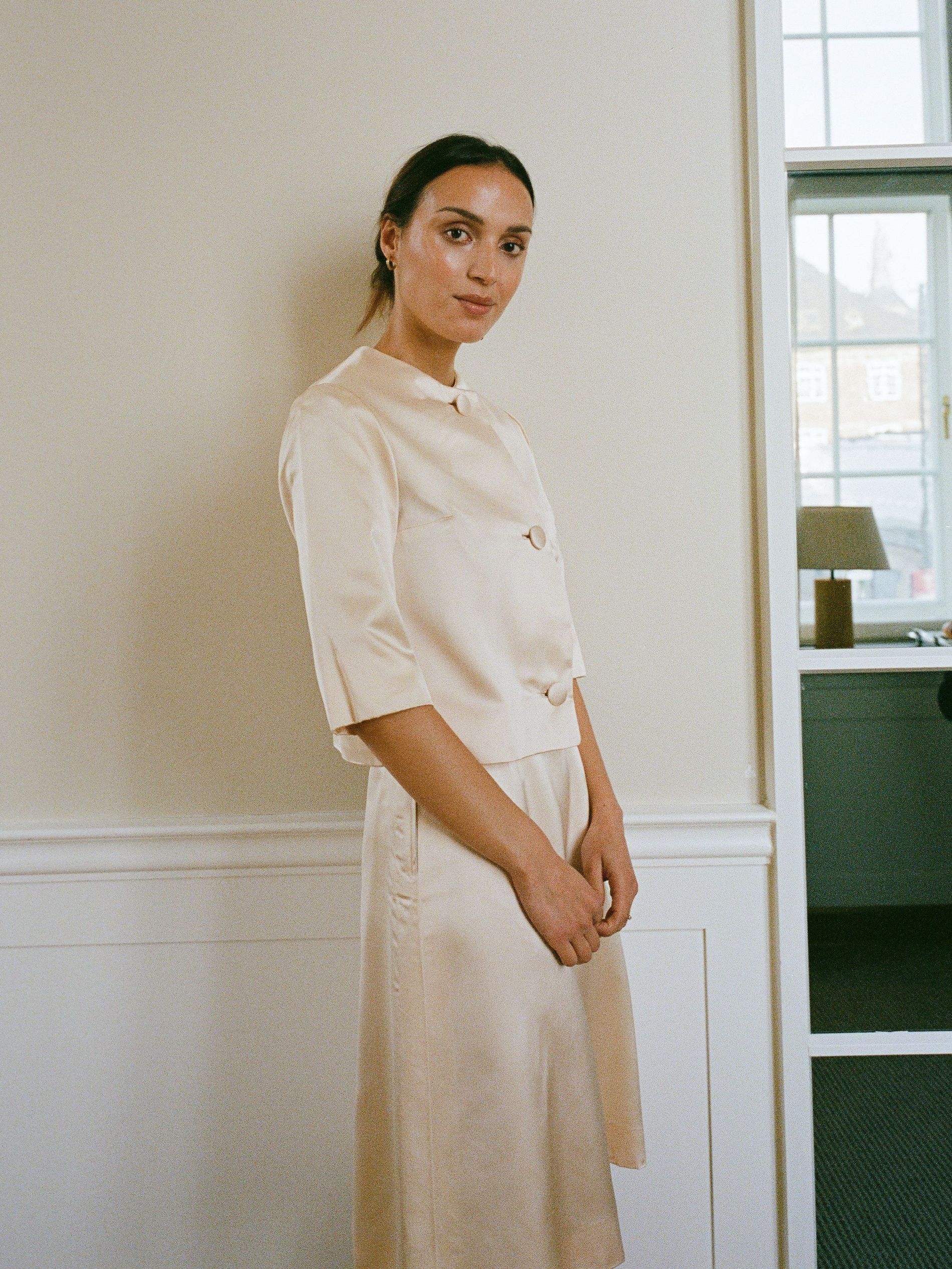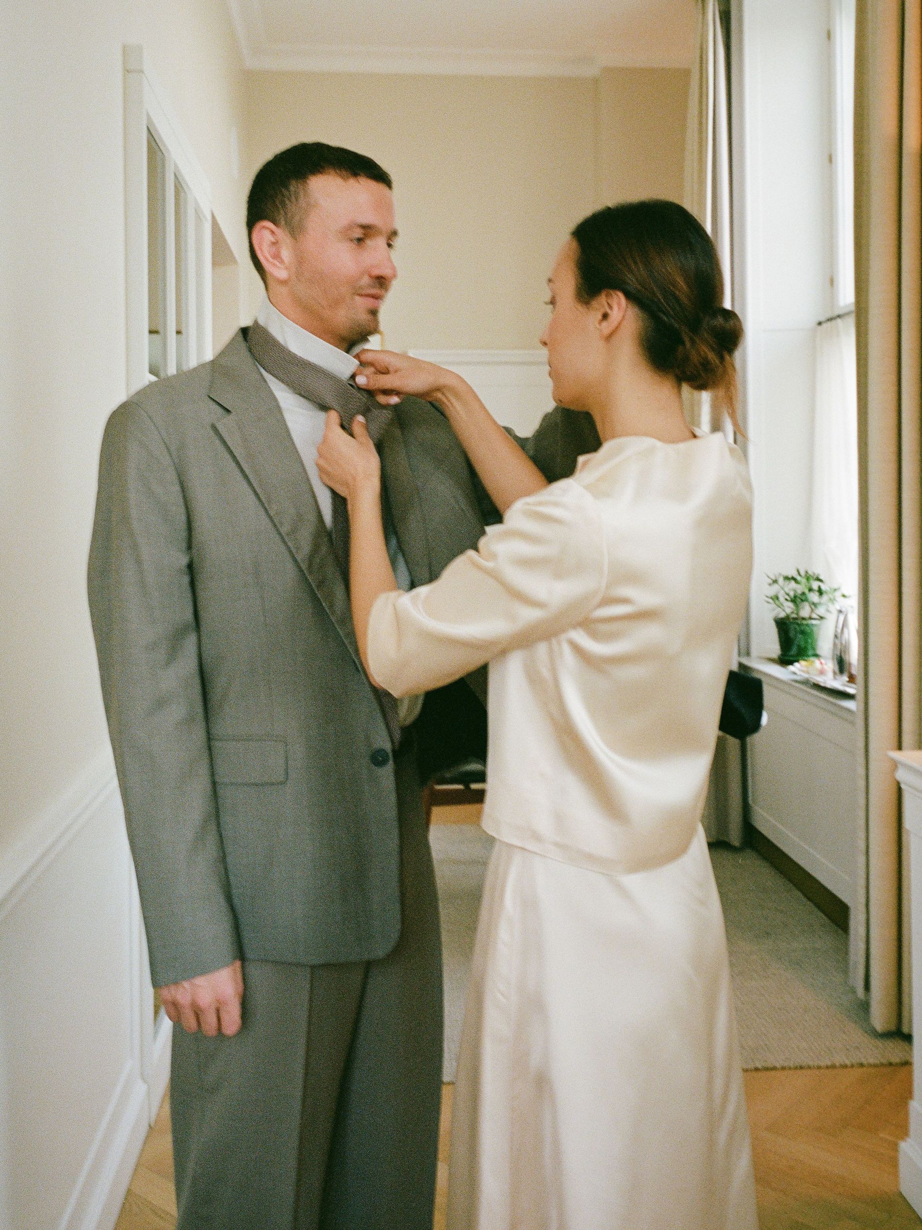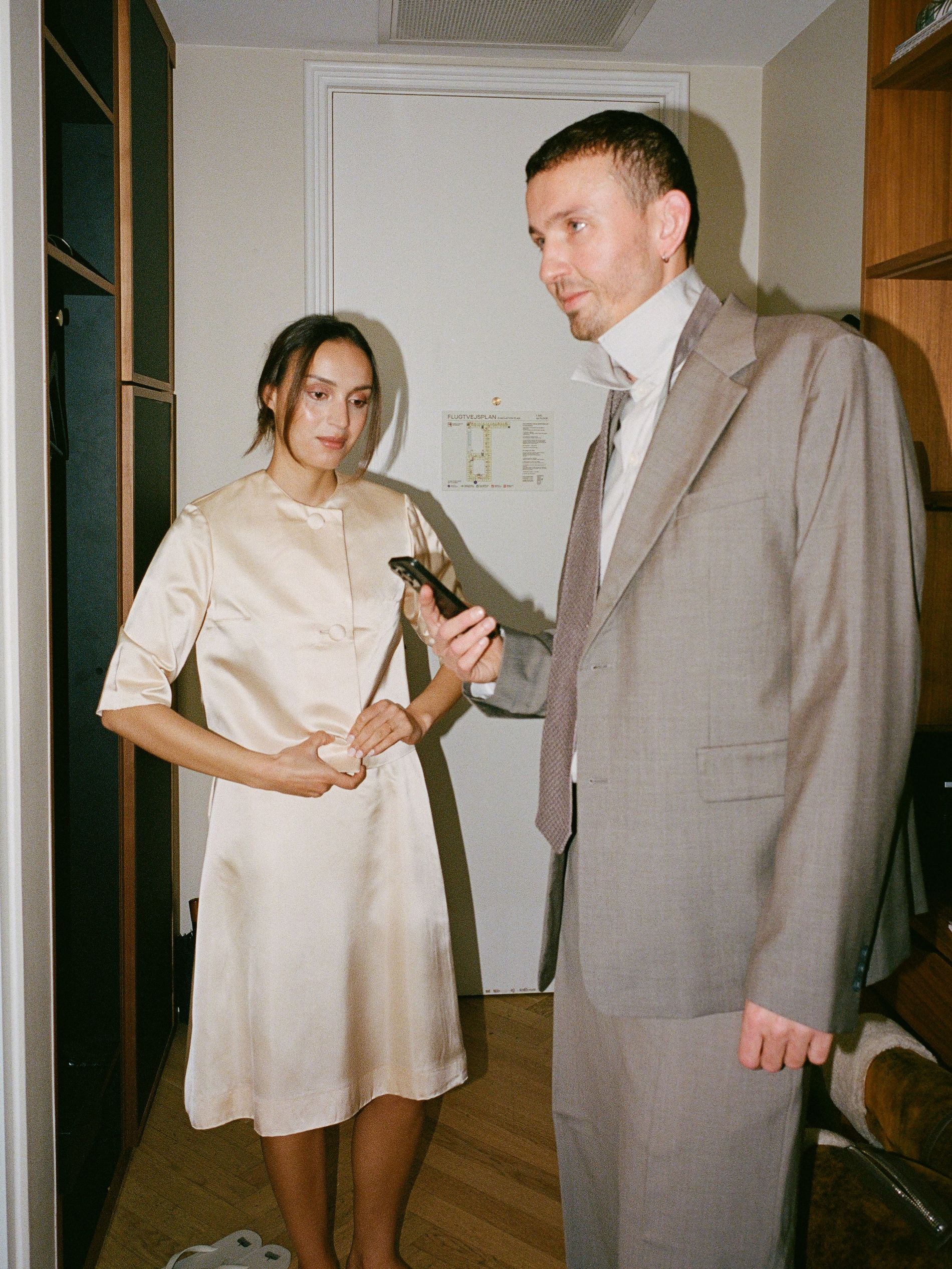 For the wedding, Lasse’s look was decided quickly: a grey-olive suit from Mfpen, a brand already in his wardrobe. “He’s very decisive,” Sarah says. “Once he knows, he knows.” Her own outfit took more work – and more urgency. With a clear idea of something tailored and ’60s-leaning, she spent the days after work visiting vintage shops across Copenhagen. “I was popping in everywhere,” she says. “On the way to the supermarket, after a run, on walks. The salespeople were stressed on my behalf.”