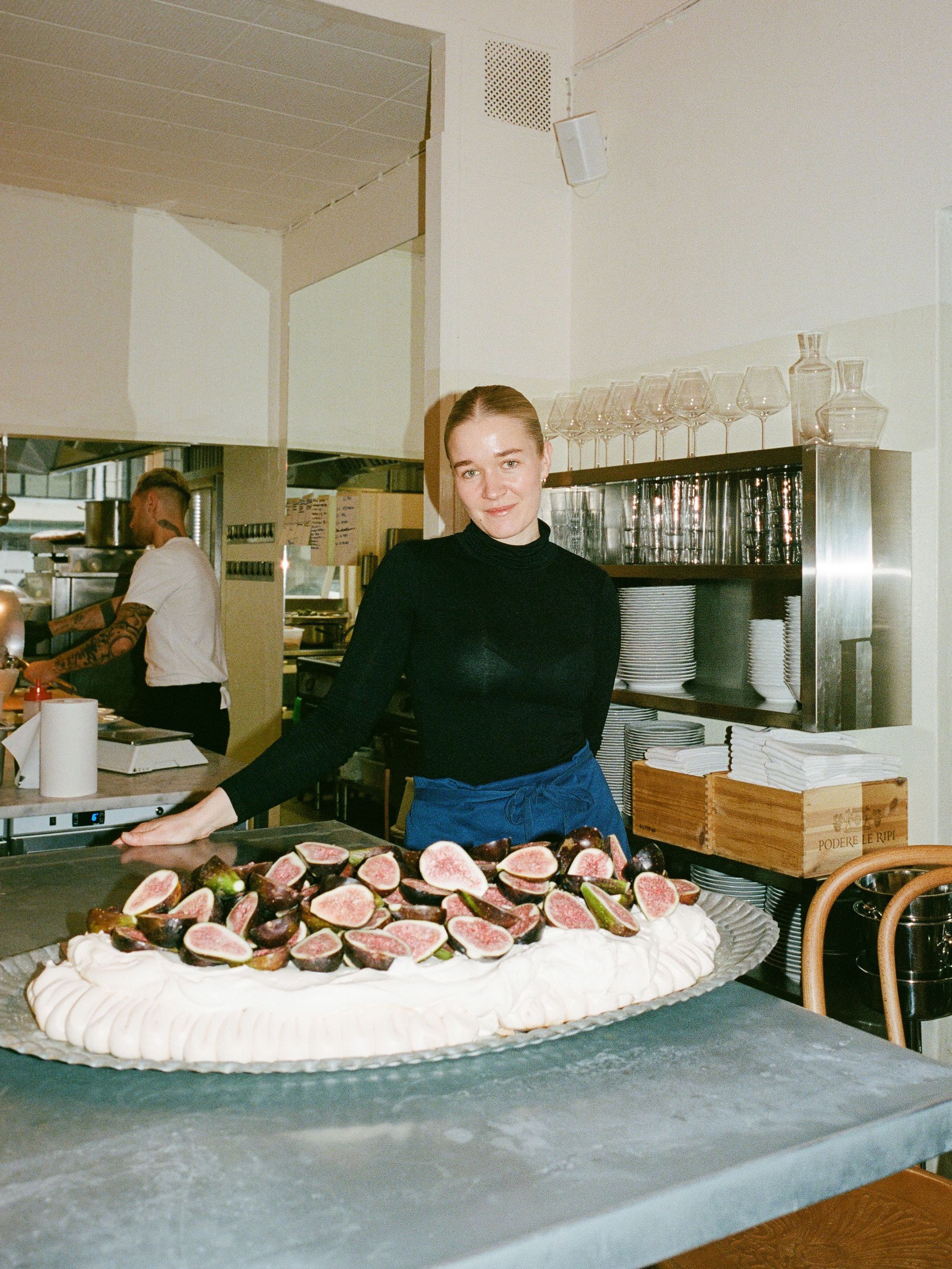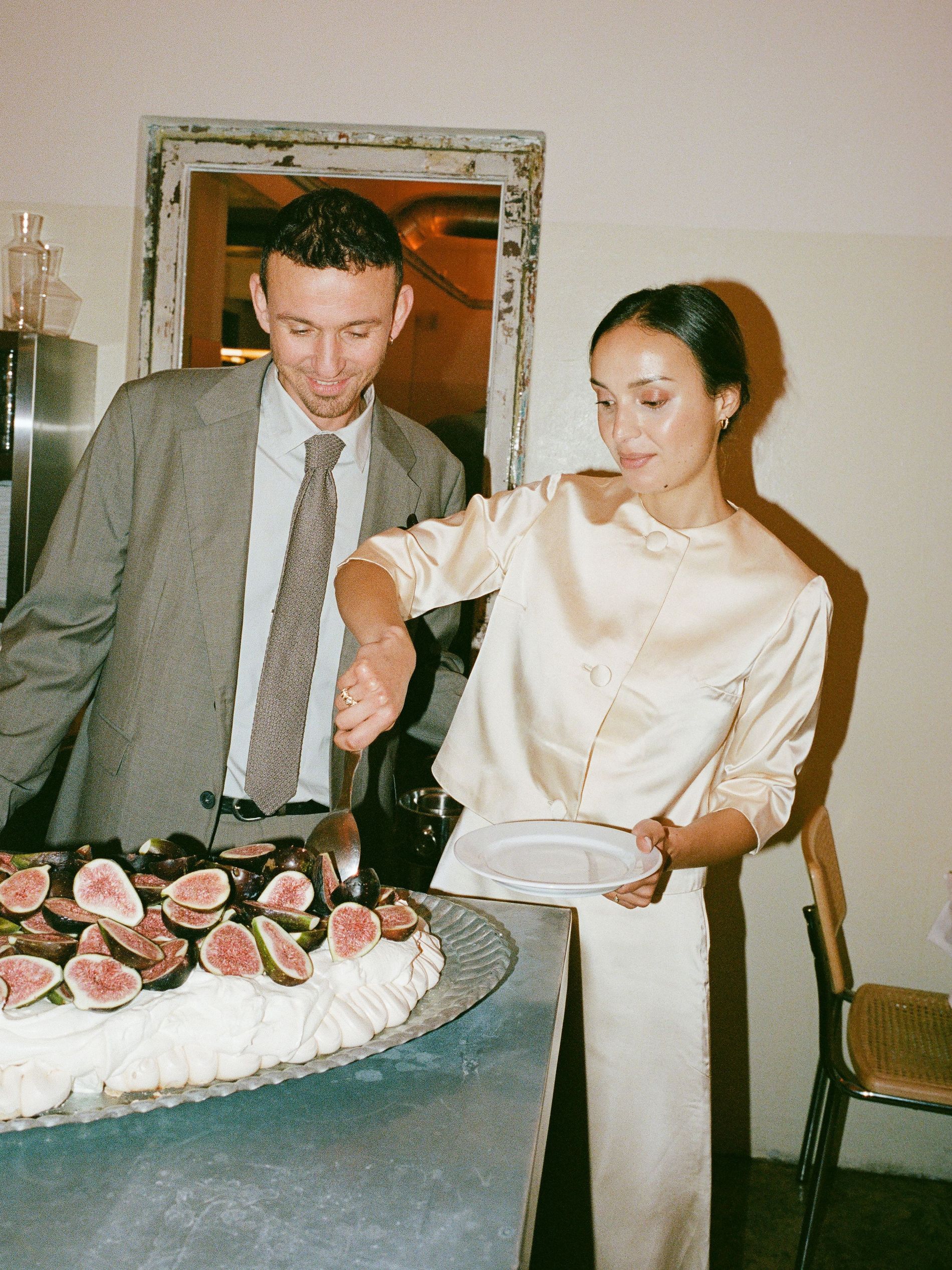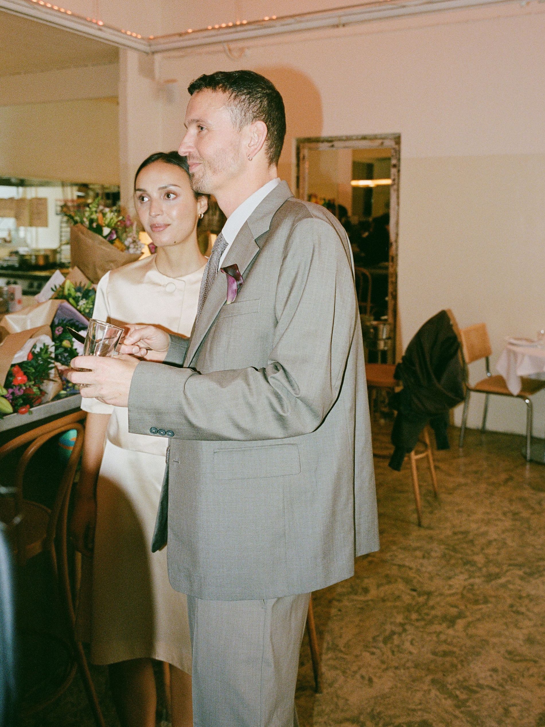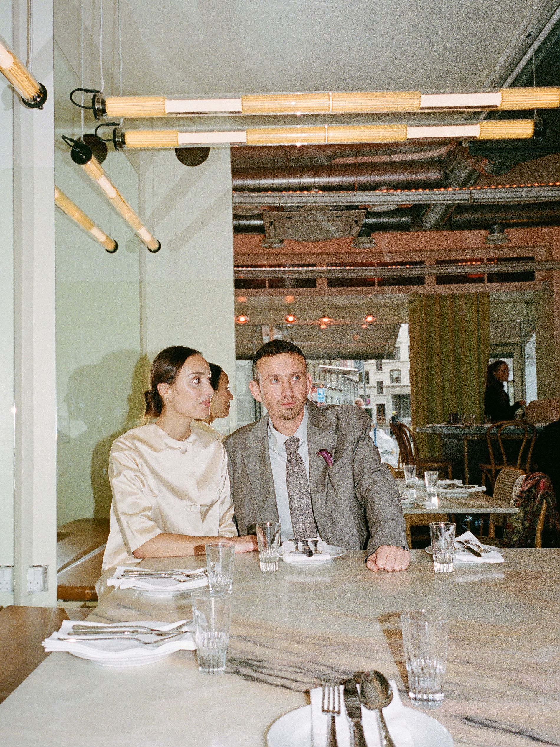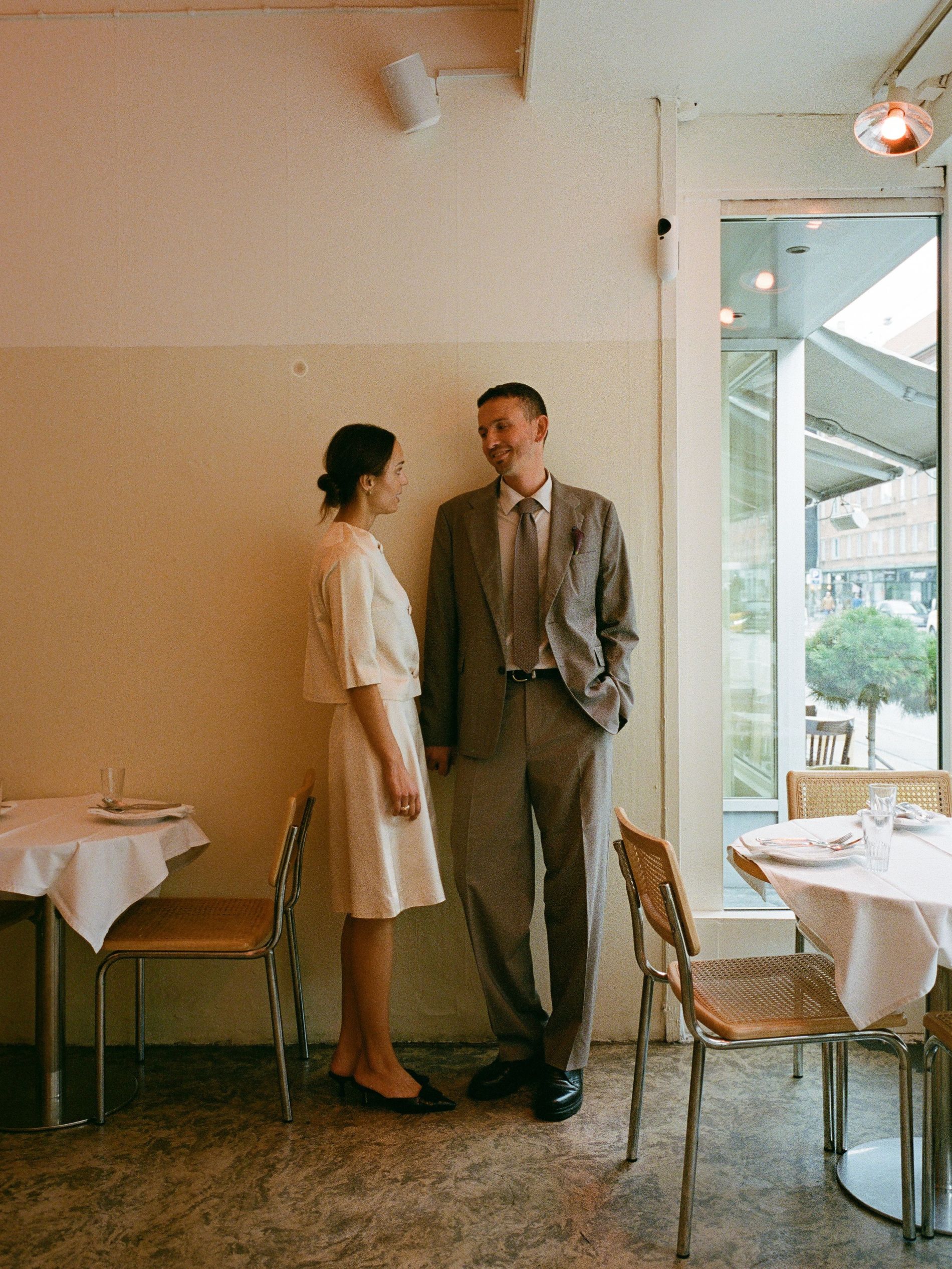 Lunch at Bar Amore began at 12:30, with guests arriving by bike and taxi. "We wanted to celebrate our love in an untraditional way by having a daytime wedding and enjoying what little daylight there is at that time of year – and for it to be convenient for people picking up their kids afterwards," Sarah says. The menu was served sharing-style: focaccia, zucchini flan with parmigiano sauce, octopus carpaccio, followed by tagliatelle with butter and parmigiano. "Celebrating in the big open space at Bar Amore – where people bike by and can look in – felt joyful," the bride reflects. "Everyone who passed by seemed happy to see a wedding happening in the middle of the day." Dessert was a fig pavlova assembled live at the bar by Klara Marie of Klaras Table. (“I like that it wasn’t perfect,” Sarah notes. “I don’t like things that look too controlled.”) The couple cut the first slice together, then served each guest themselves – a small moment that ended up being one of Sarah’s favourites.