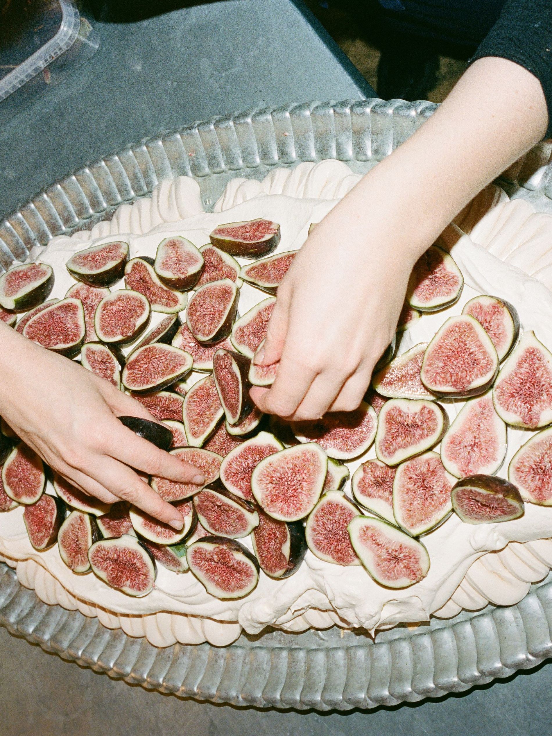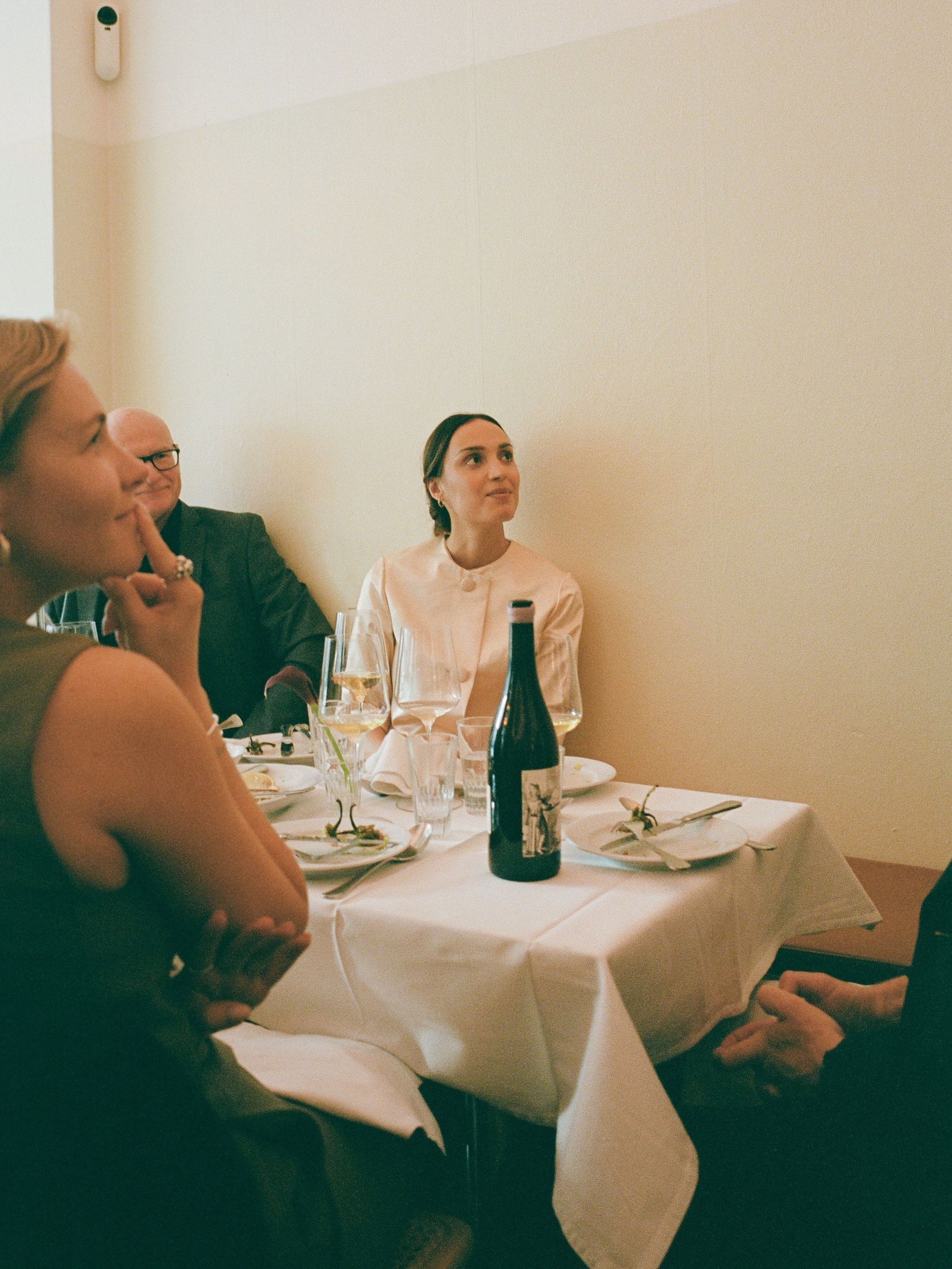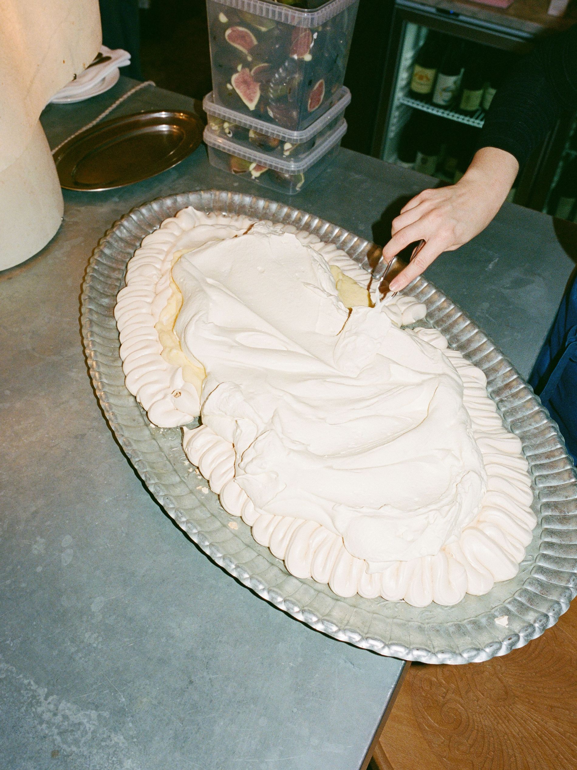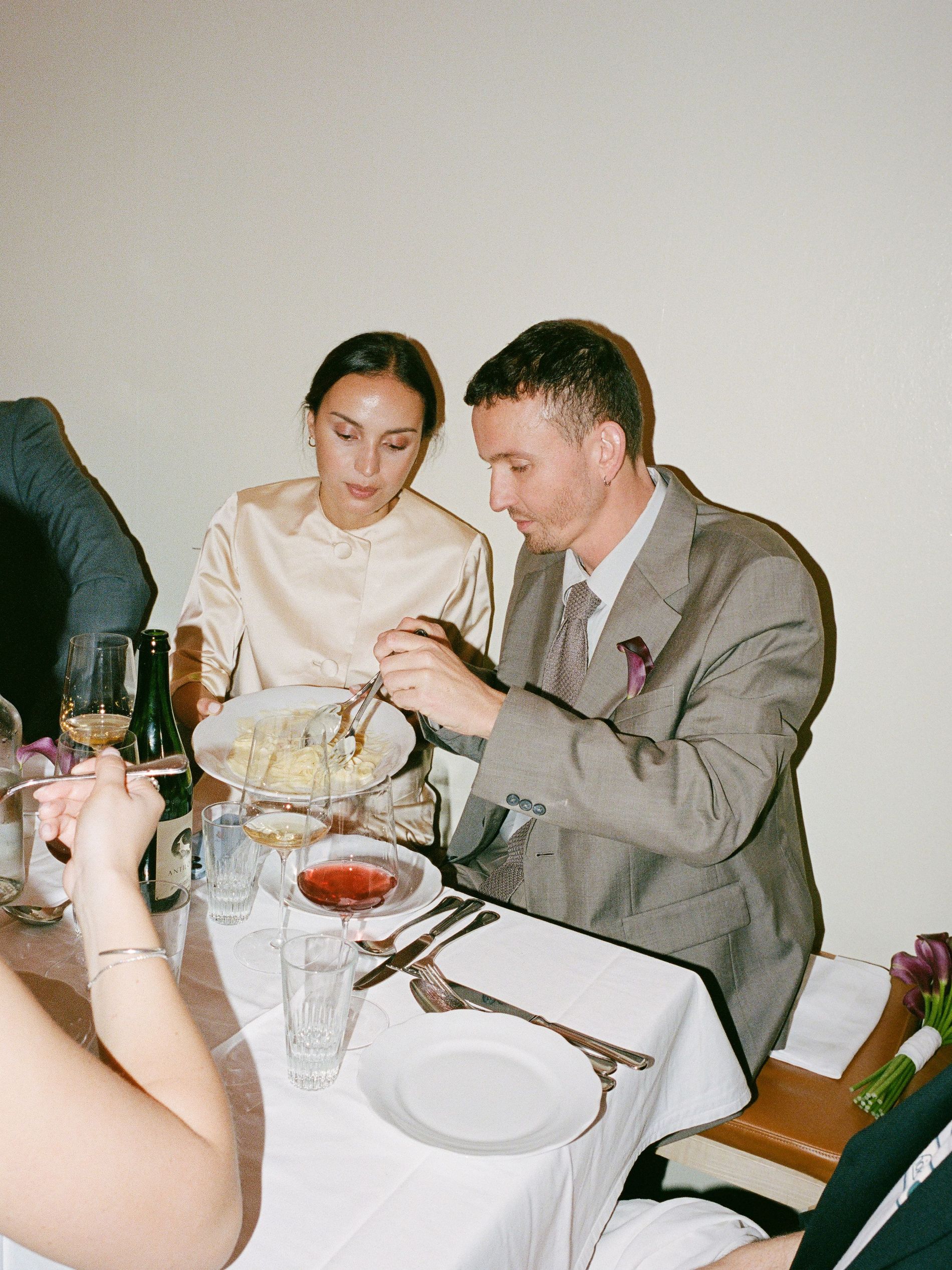 Lunch at Bar Amore began at 12:30, with guests arriving by bike and taxi. "We wanted to celebrate our love in an untraditional way by having a daytime wedding and enjoying what little daylight there is at that time of year – and for it to be convenient for people picking up their kids afterwards," Sarah says. The menu was served sharing-style: focaccia, zucchini flan with parmigiano sauce, octopus carpaccio, followed by tagliatelle with butter and parmigiano. "Celebrating in the big open space at Bar Amore – where people bike by and can look in – felt joyful," the bride reflects. "Everyone who passed by seemed happy to see a wedding happening in the middle of the day." Dessert was a fig pavlova assembled live at the bar by Klara Marie of Klaras Table. (“I like that it wasn’t perfect,” Sarah notes. “I don’t like things that look too controlled.”) The couple cut the first slice together, then served each guest themselves – a small moment that ended up being one of Sarah’s favourites.
