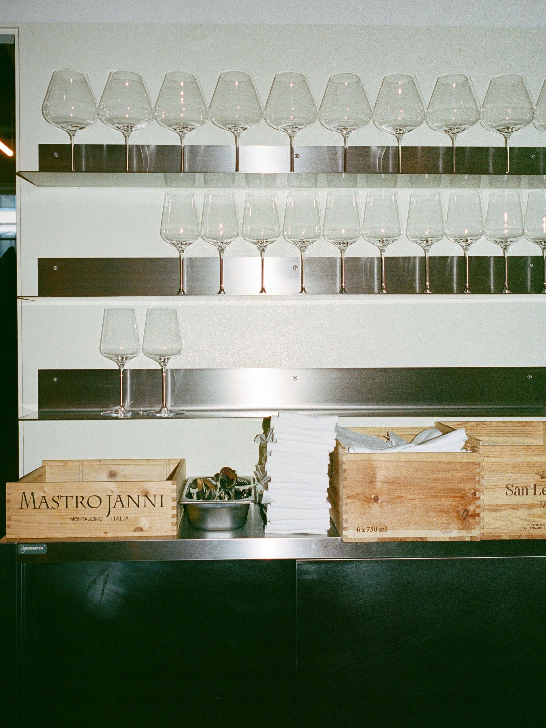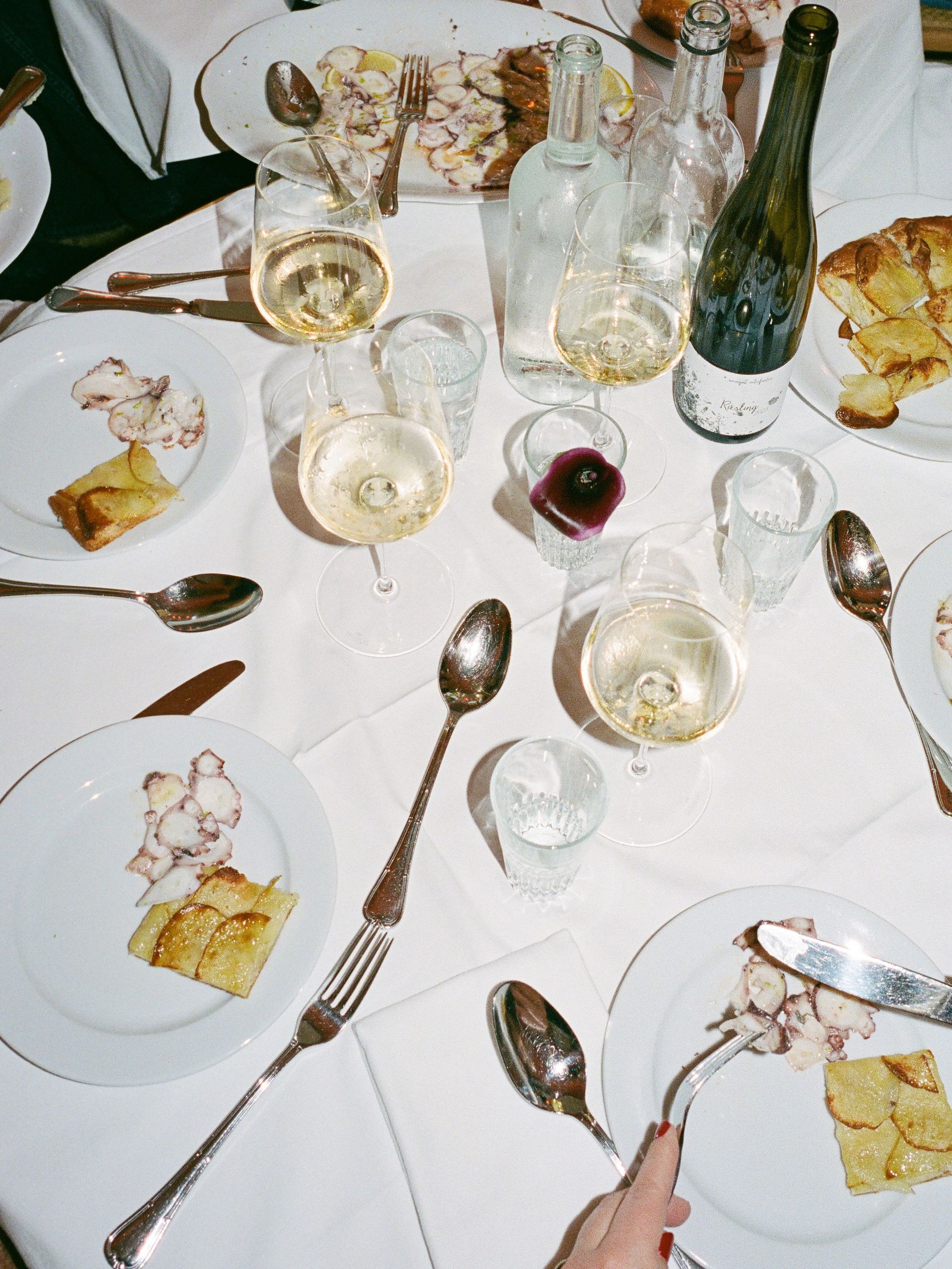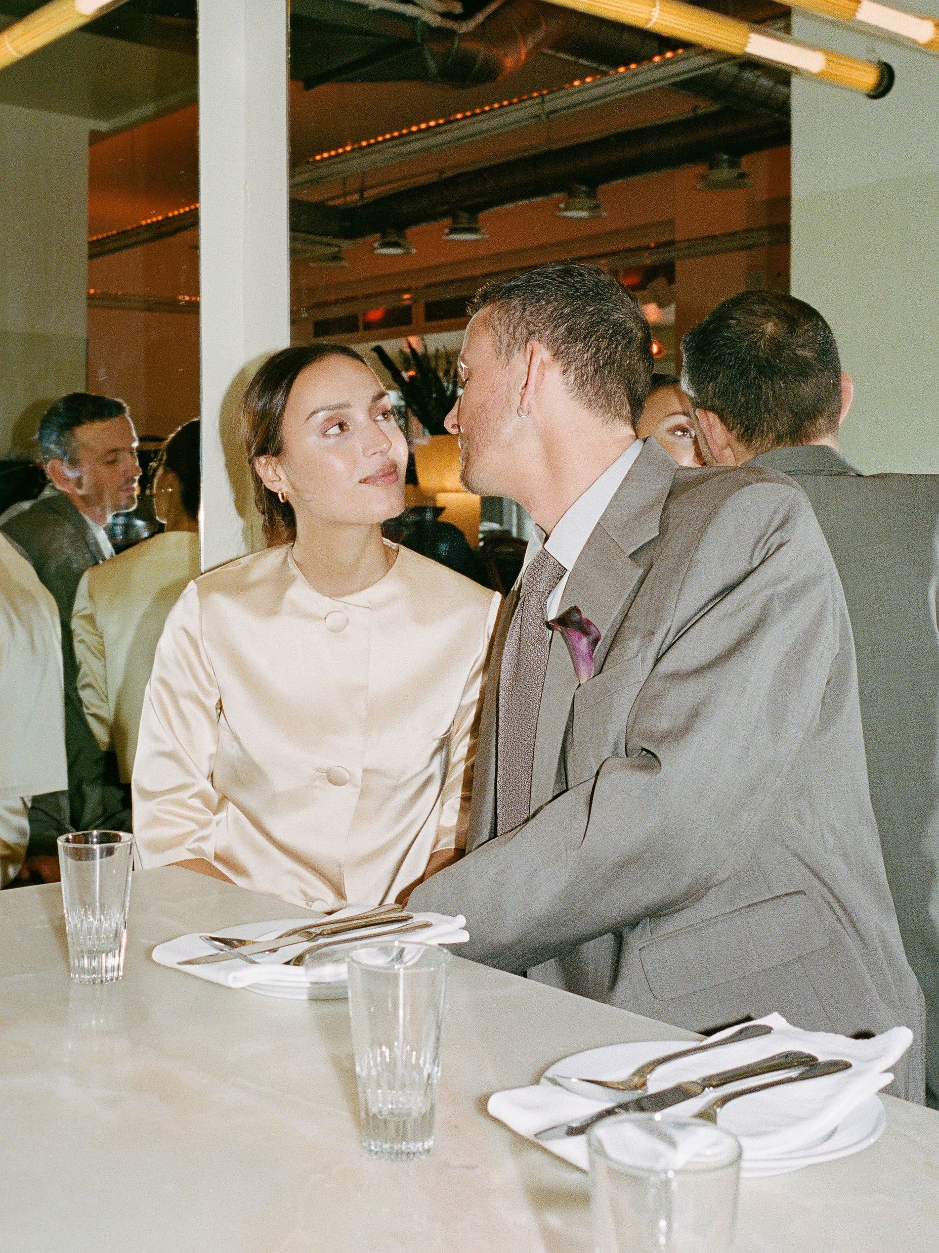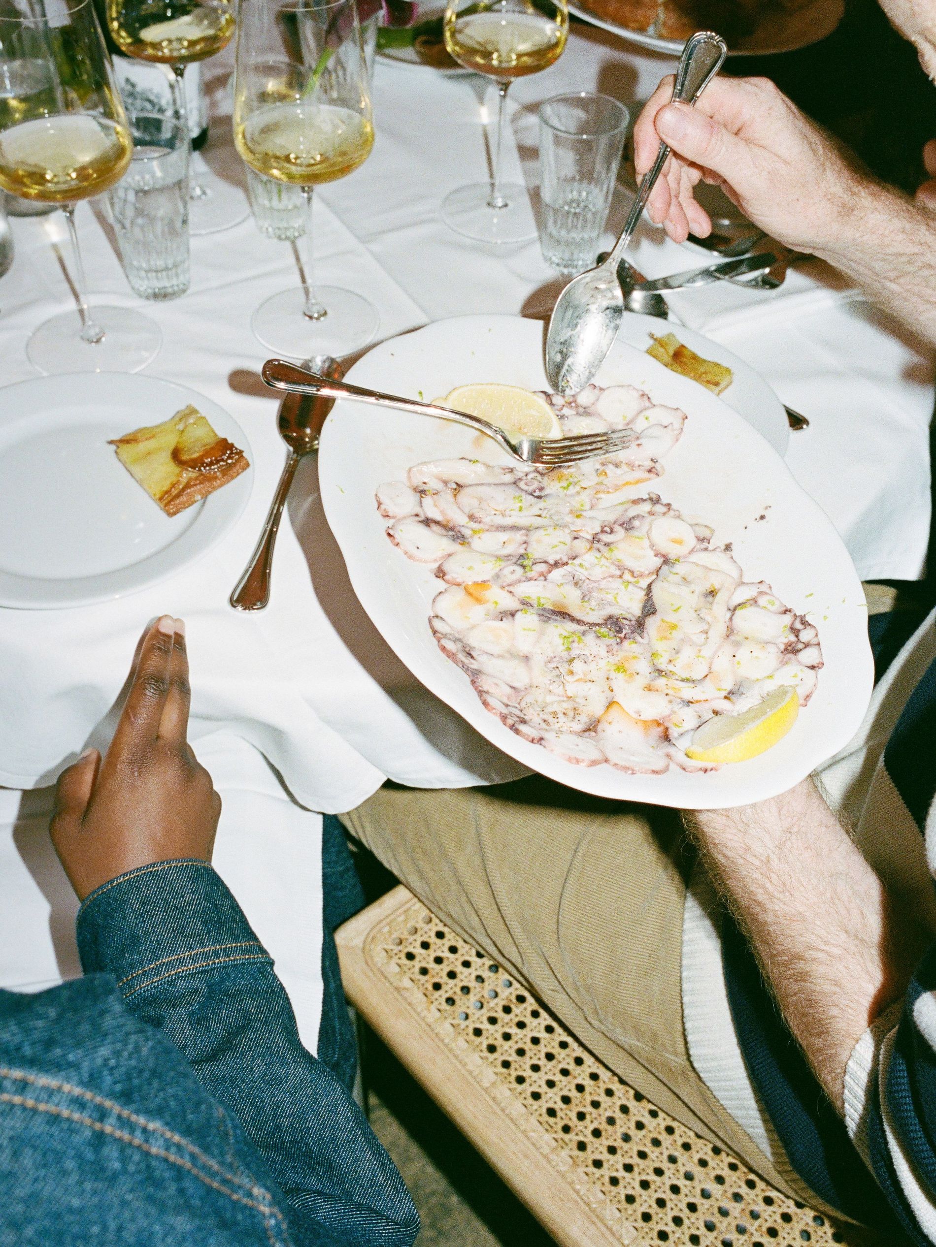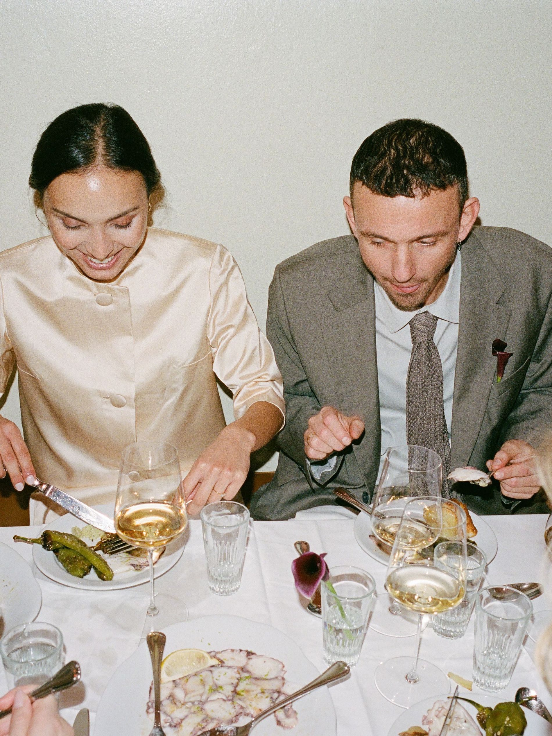 Lunch at Bar Amore began at 12:30, with guests arriving by bike and taxi. "We wanted to celebrate our love in an untraditional way by having a daytime wedding and enjoying what little daylight there is at that time of year – and for it to be convenient for people picking up their kids afterwards," Sarah says. The menu was served sharing-style: focaccia, zucchini flan with parmigiano sauce, octopus carpaccio, followed by tagliatelle with butter and parmigiano. "Celebrating in the big open space at Bar Amore – where people bike by and can look in – felt joyful," the bride reflects. "Everyone who passed by seemed happy to see a wedding happening in the middle of the day." Dessert was a fig pavlova assembled live at the bar by Klara Marie of Klaras Table. (“I like that it wasn’t perfect,” Sarah notes. “I don’t like things that look too controlled.”) The couple cut the first slice together, then served each guest themselves – a small moment that ended up being one of Sarah’s favourites.